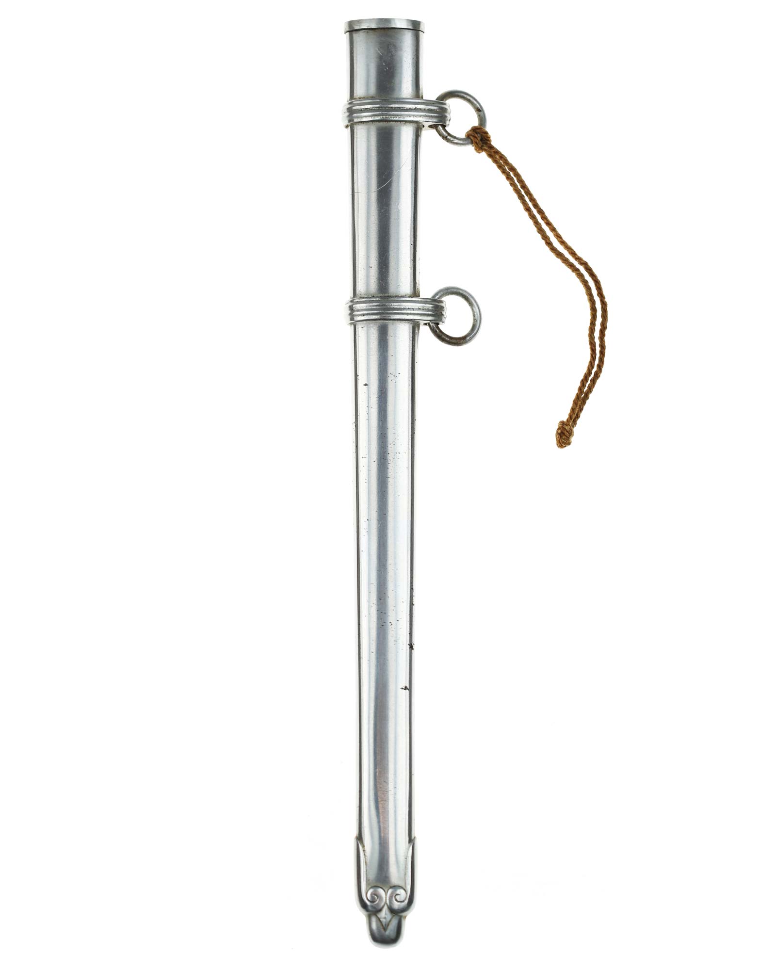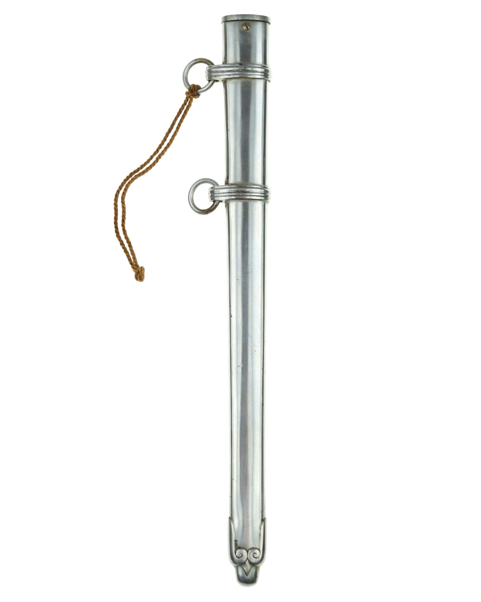 Ножны: Ножны металлические, конец ножен округлый. Прибор ножен состоит из устья и двух массивных накладных гаек с рельефными бороздками, на которых крепятся подвижные кольца для ремней портупеи.