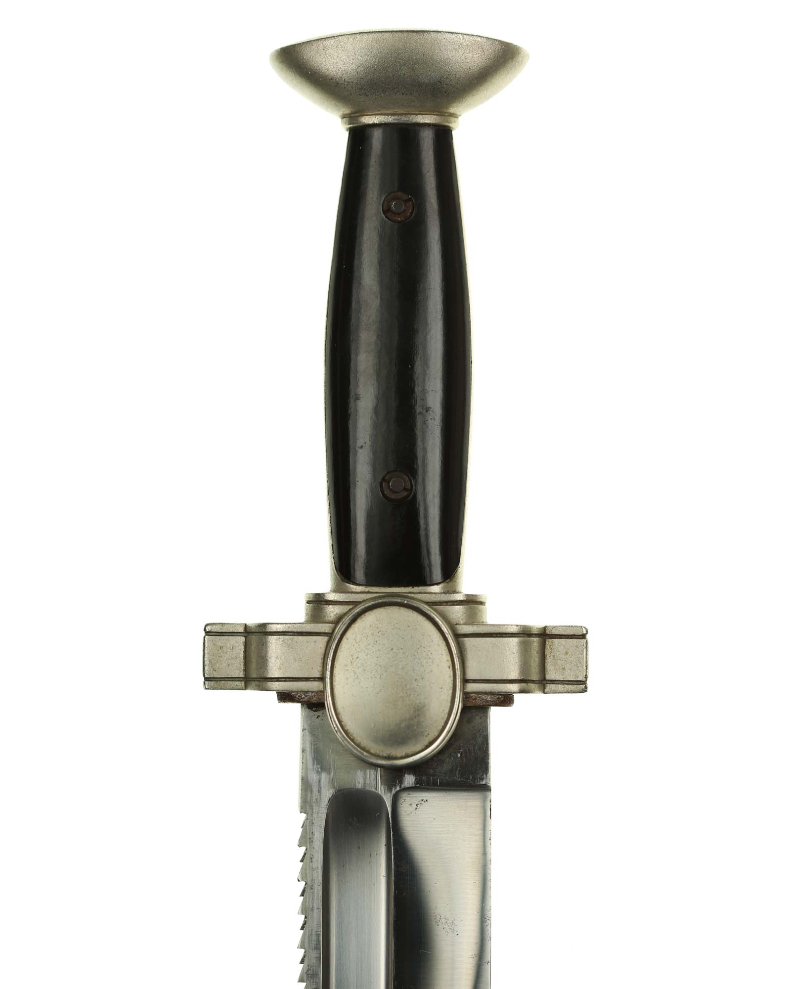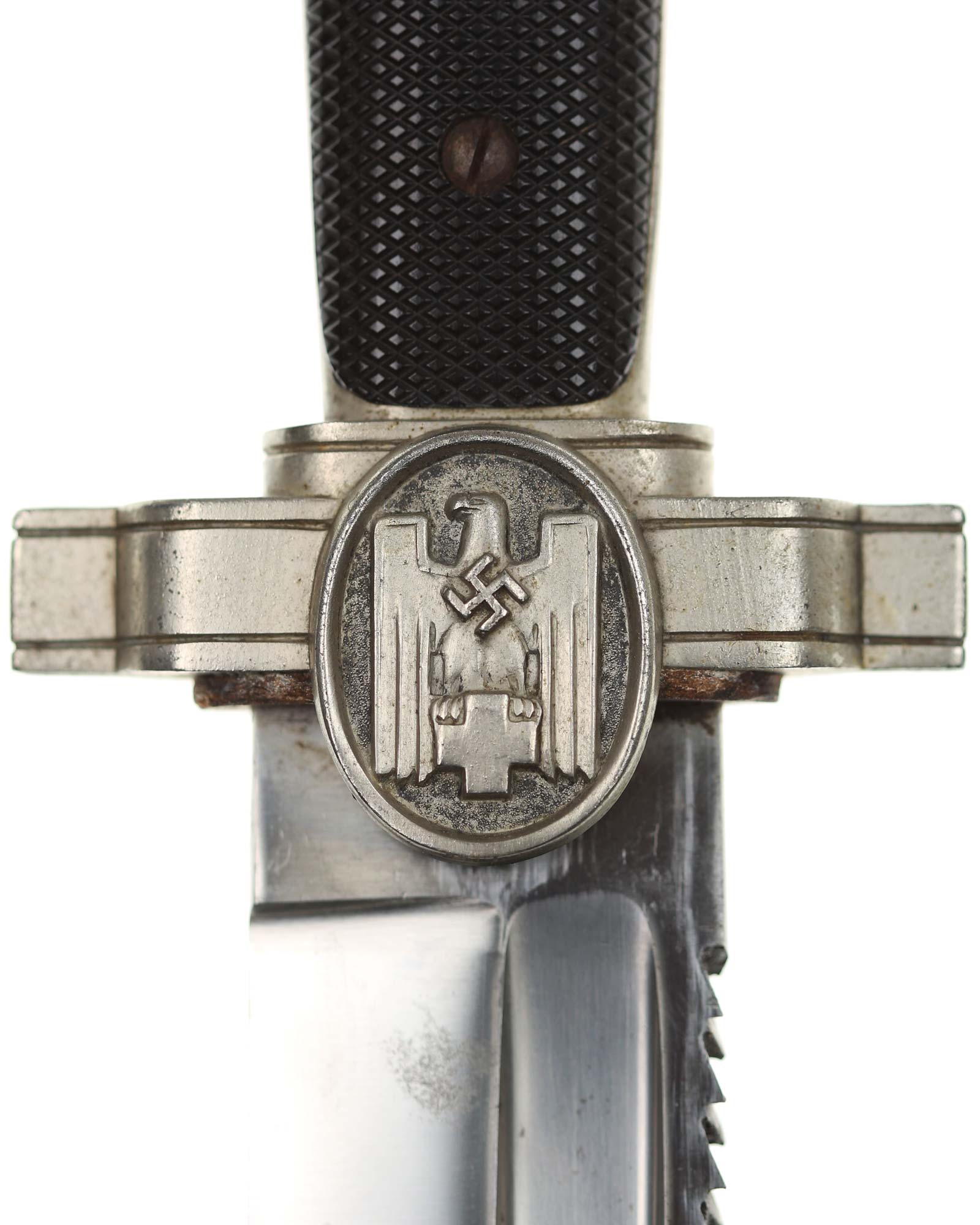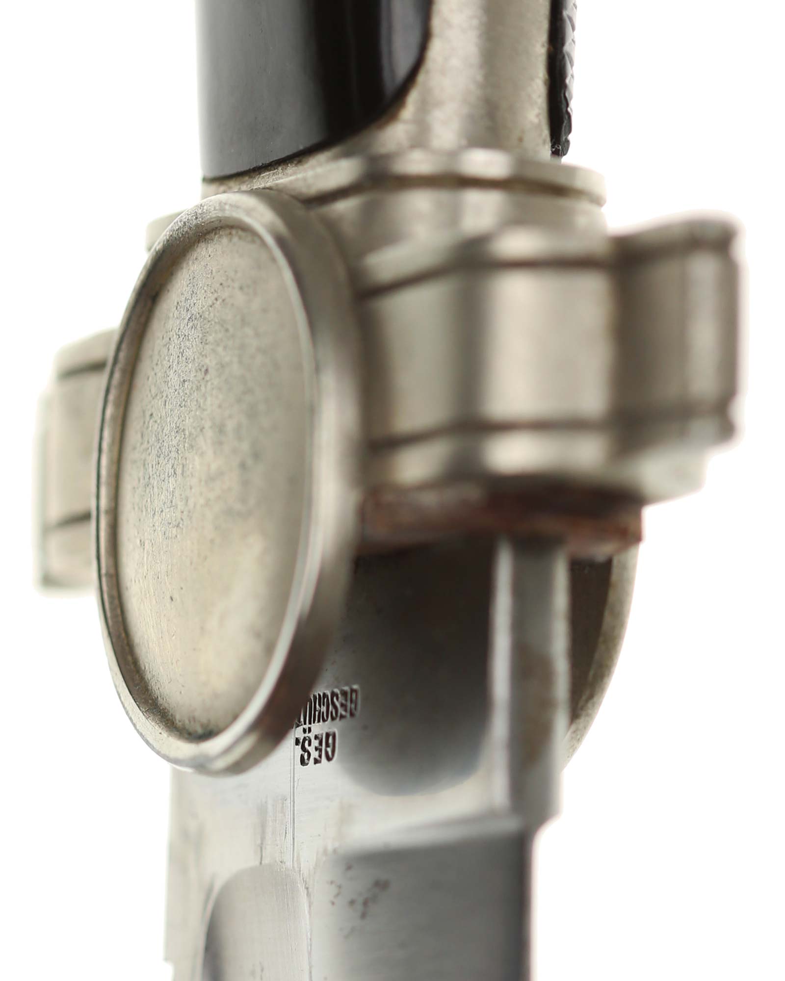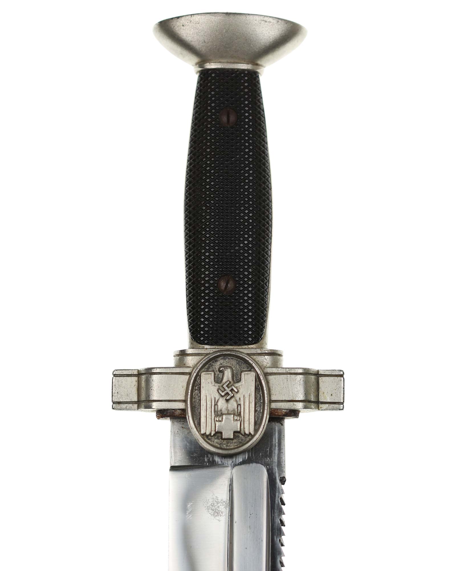 Рукоять: Рукоять металлическая, с двумя накладными пластиковыми щечками, одна из которых покрыта перекрестными насечками, другая – гладкая. Щечки закреплены при помощи двух винтов. Навершие рукояти выполнено в форме трапеции. Крестовина рукояти металлическая, прямая, с декоративными щитиками, на одном из которых отлито рельефное изображение эмблемы германского Красного Креста в виде орла со свастикой в когтях и свастикой на груди.