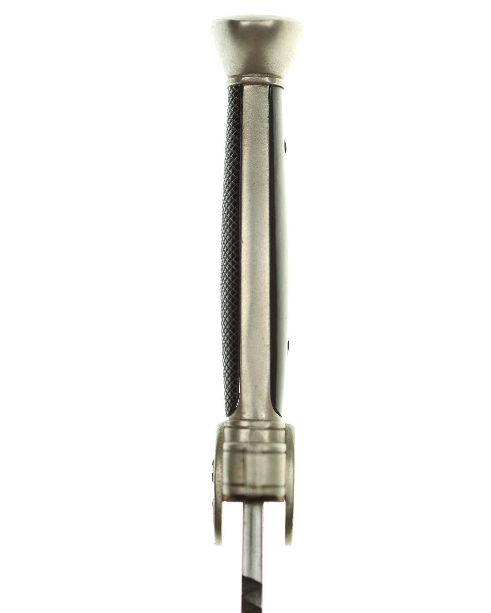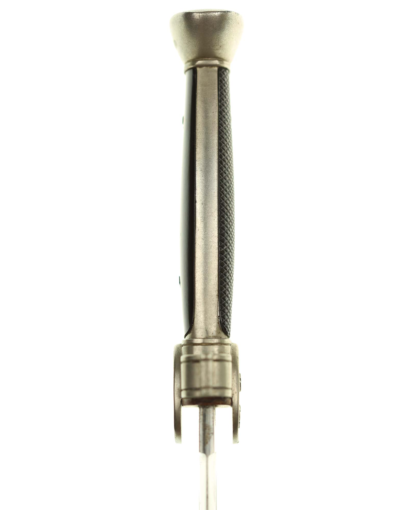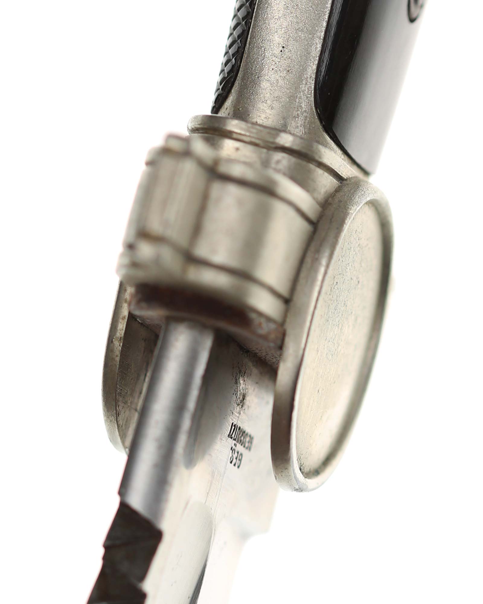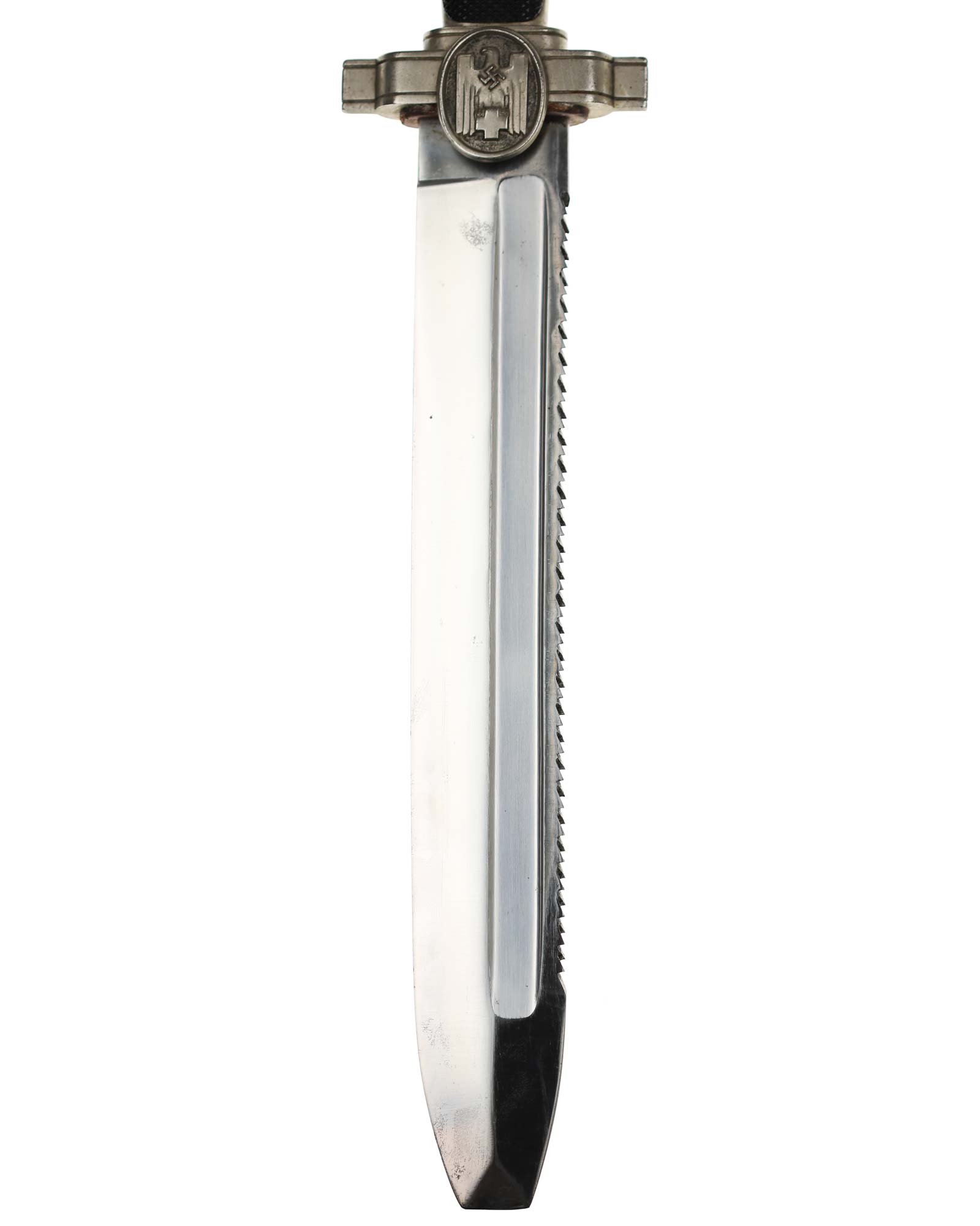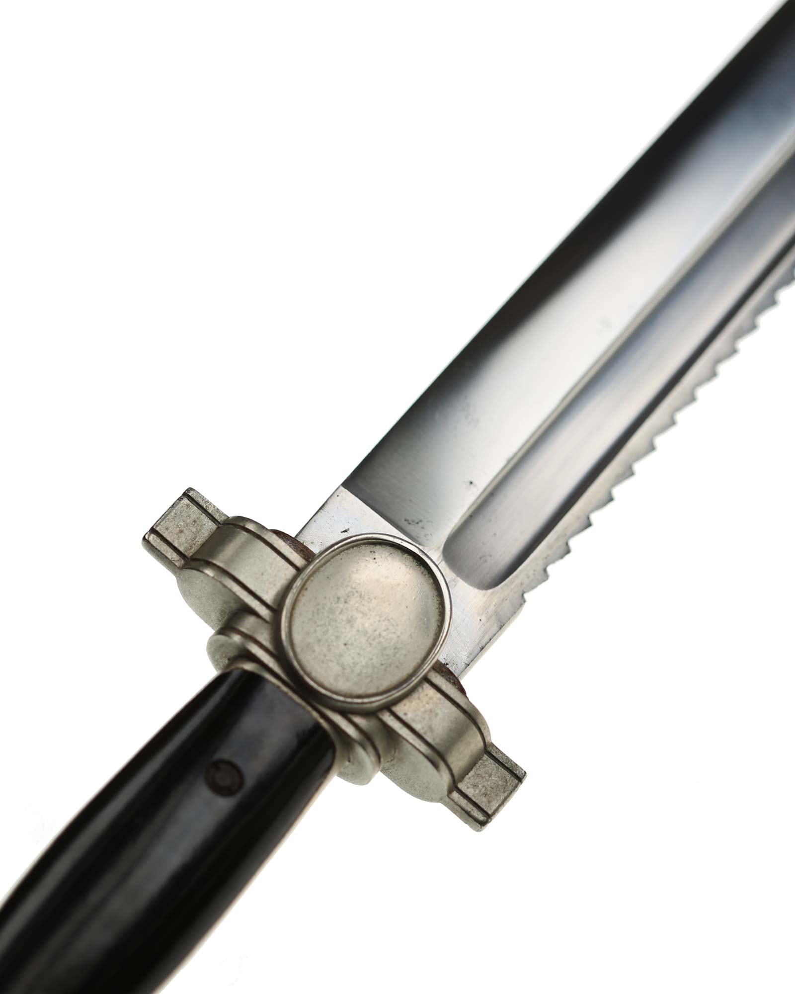 Рукоять: Рукоять металлическая, с двумя накладными пластиковыми щечками, одна из которых покрыта перекрестными насечками, другая – гладкая. Щечки закреплены при помощи двух винтов. Навершие рукояти выполнено в форме трапеции. Крестовина рукояти металлическая, прямая, с декоративными щитиками, на одном из которых отлито рельефное изображение эмблемы германского Красного Креста в виде орла со свастикой в когтях и свастикой на груди.