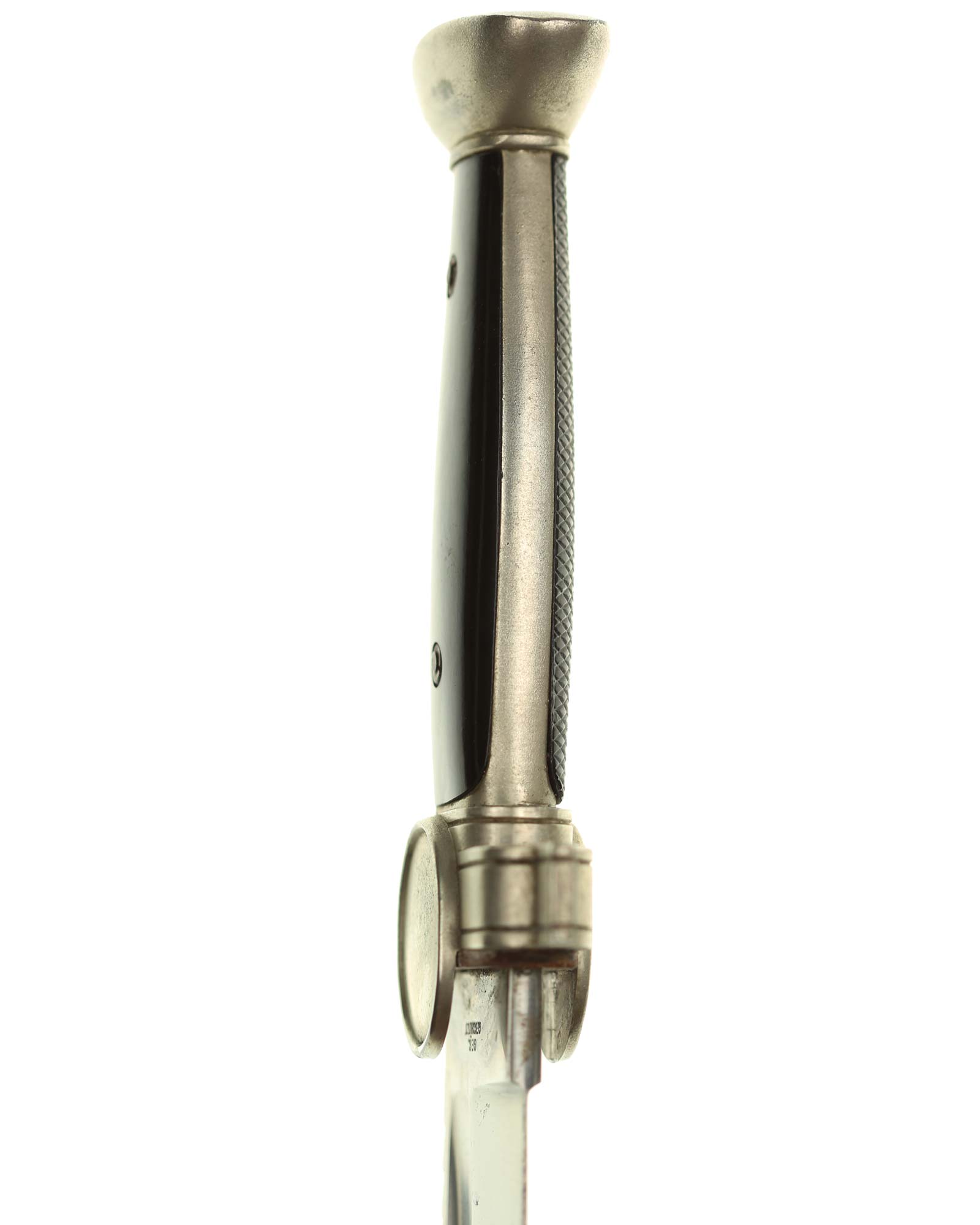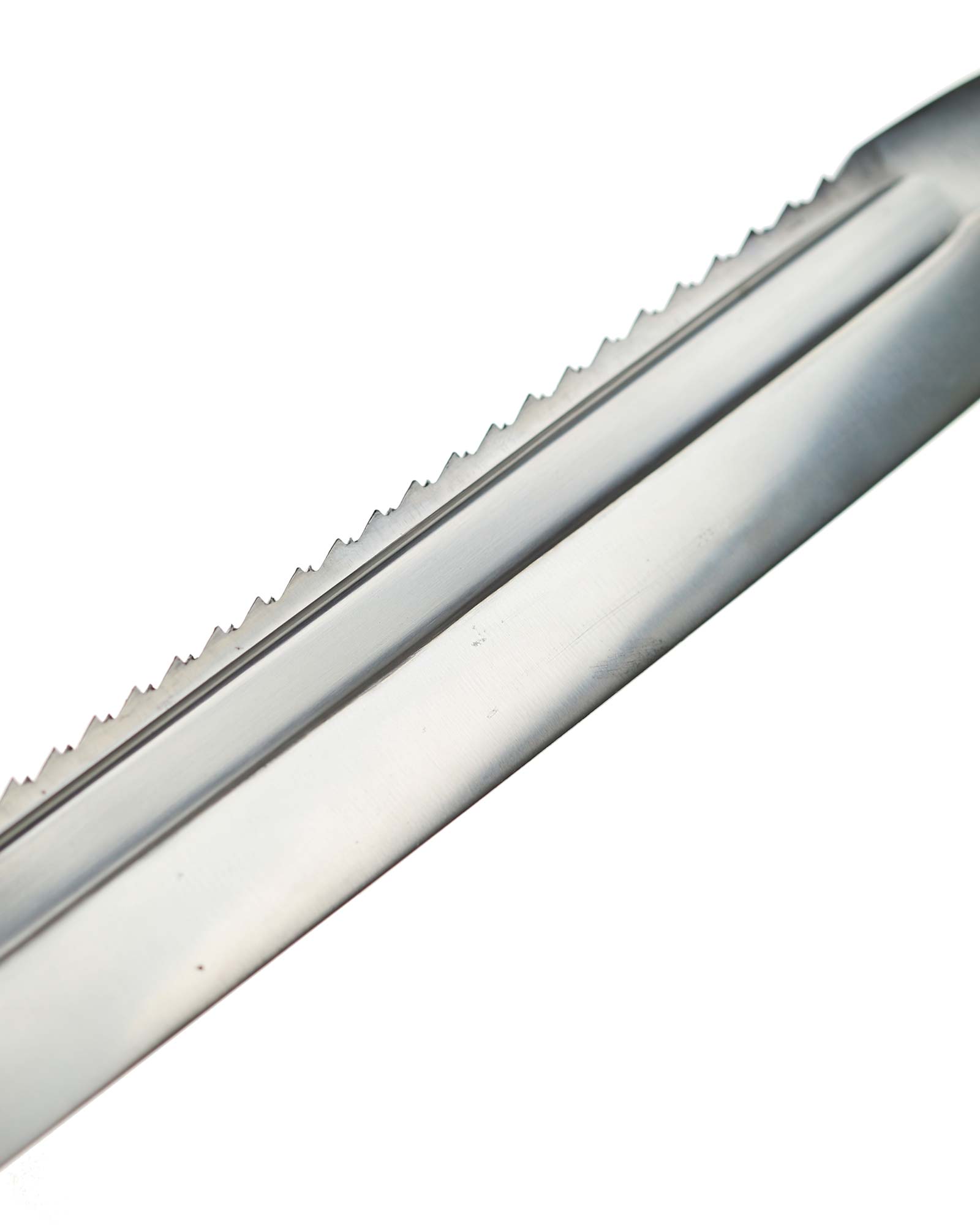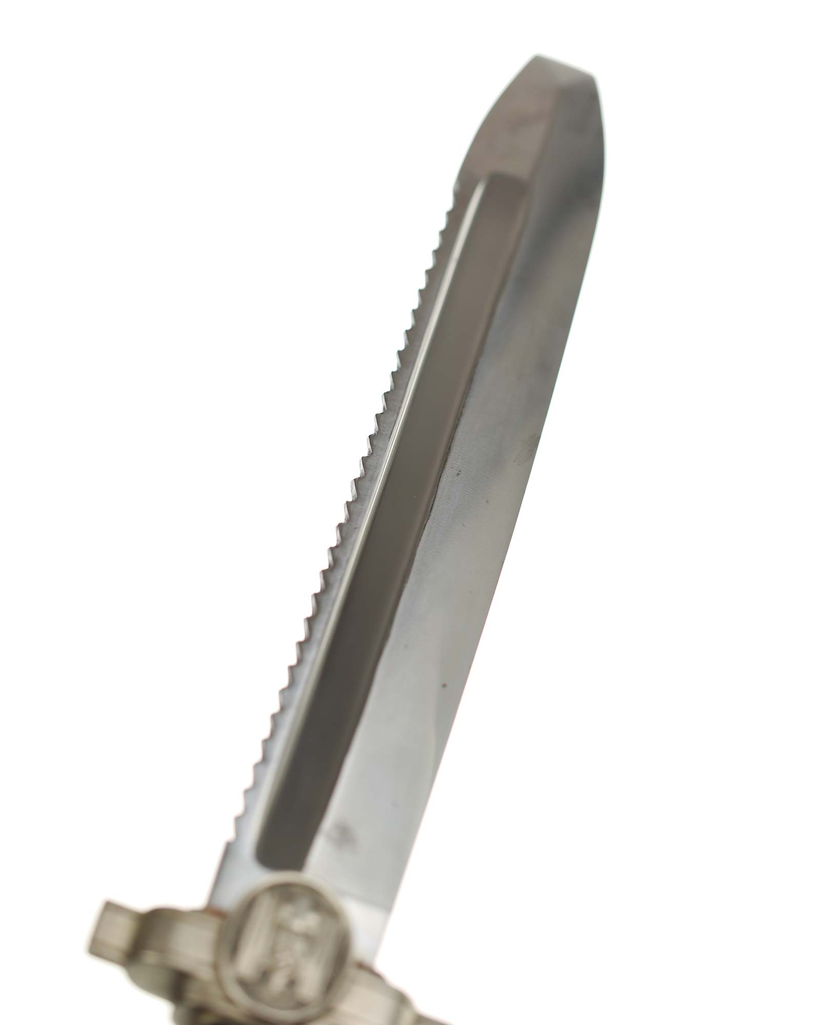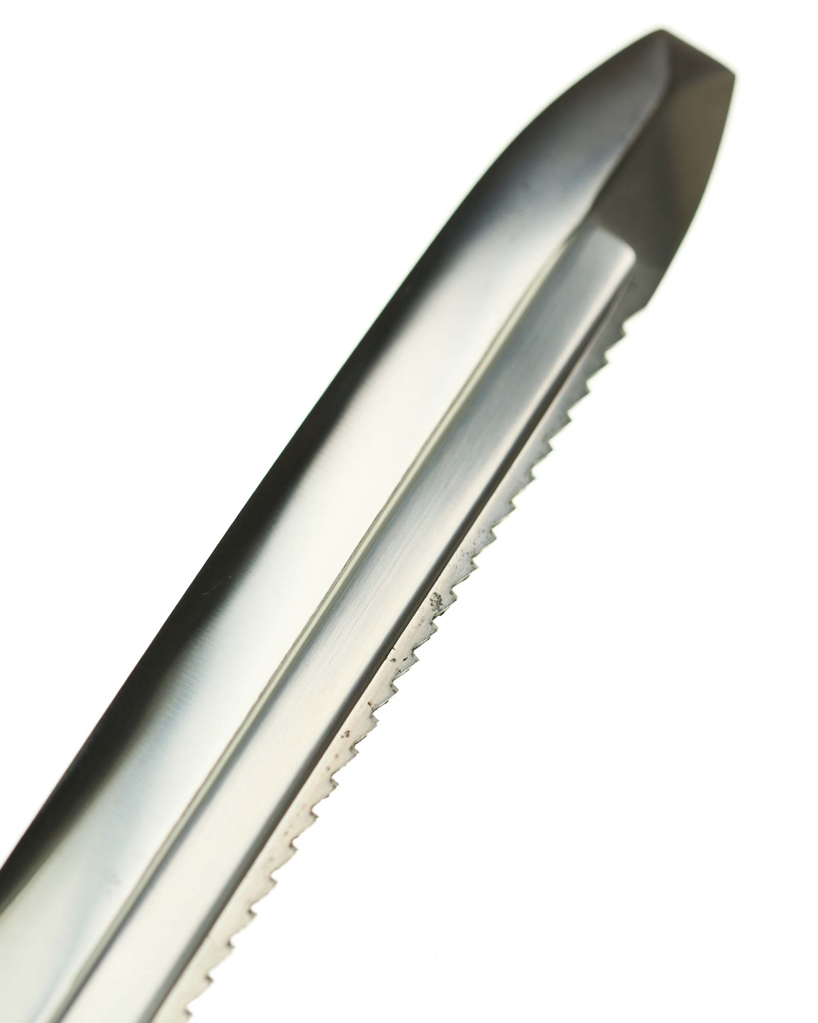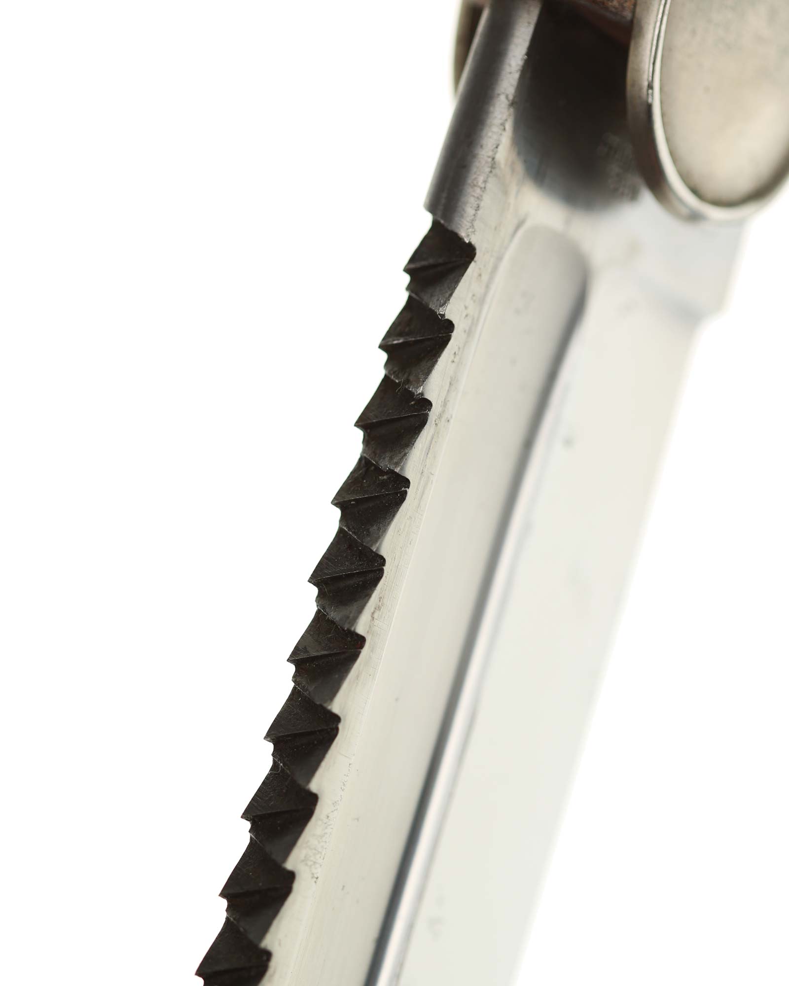 Клинок: Клинок прямой, стальной, однолезвийный, с одним долом и пилой на обухе. Боевой конец срезан.