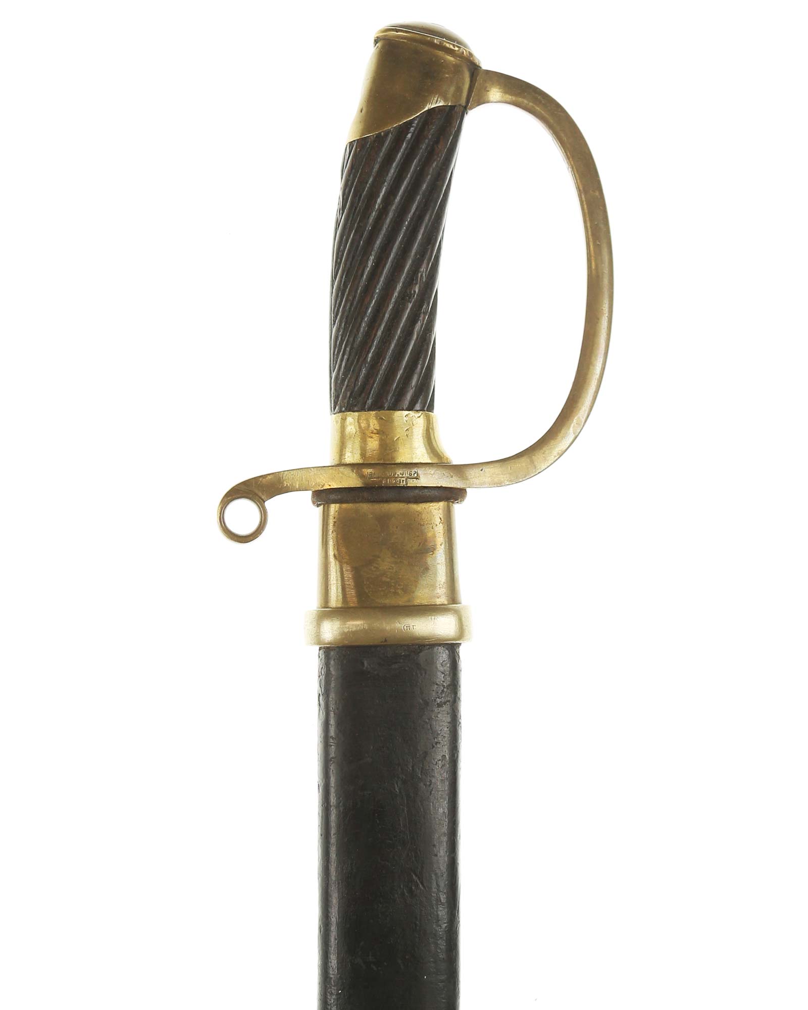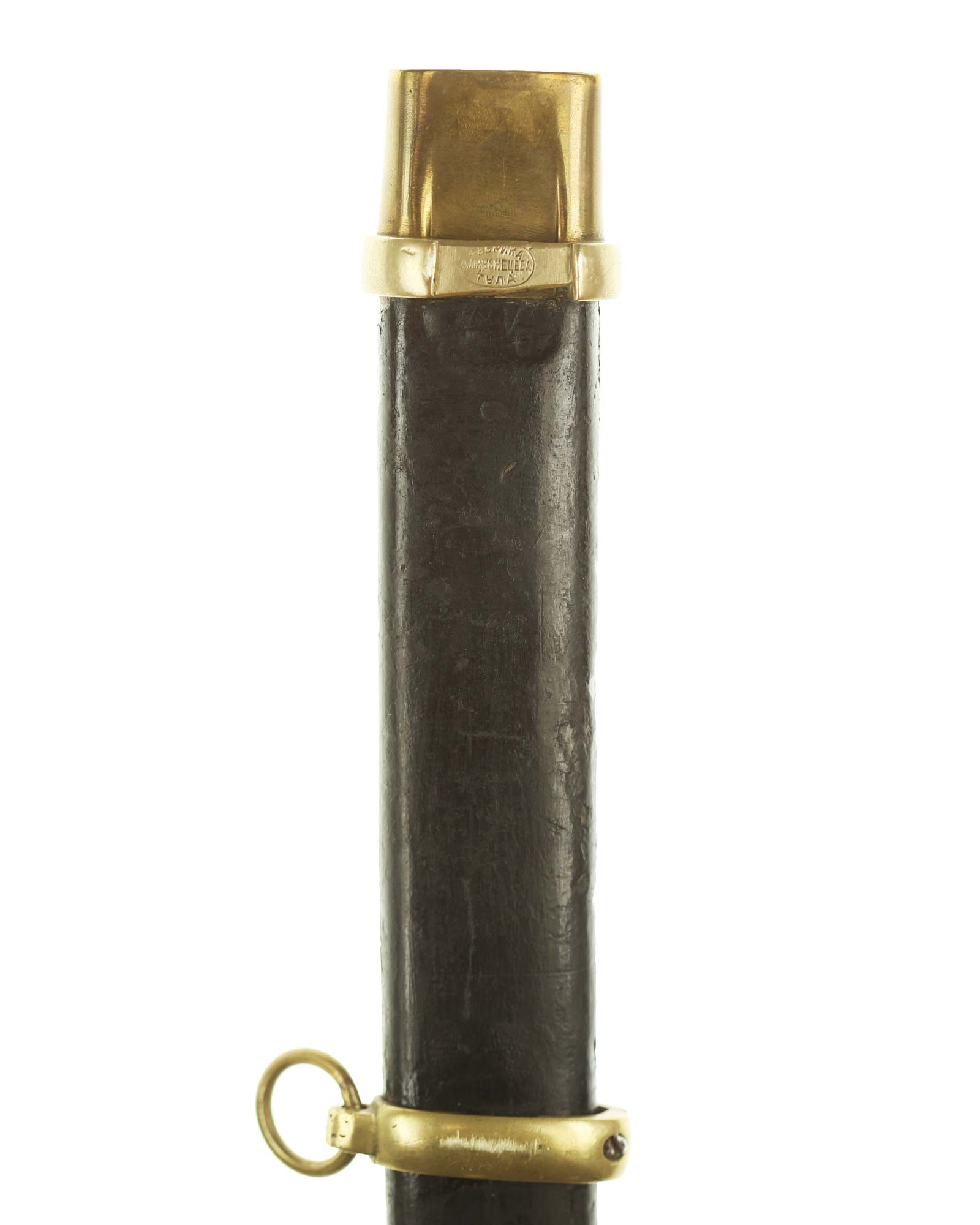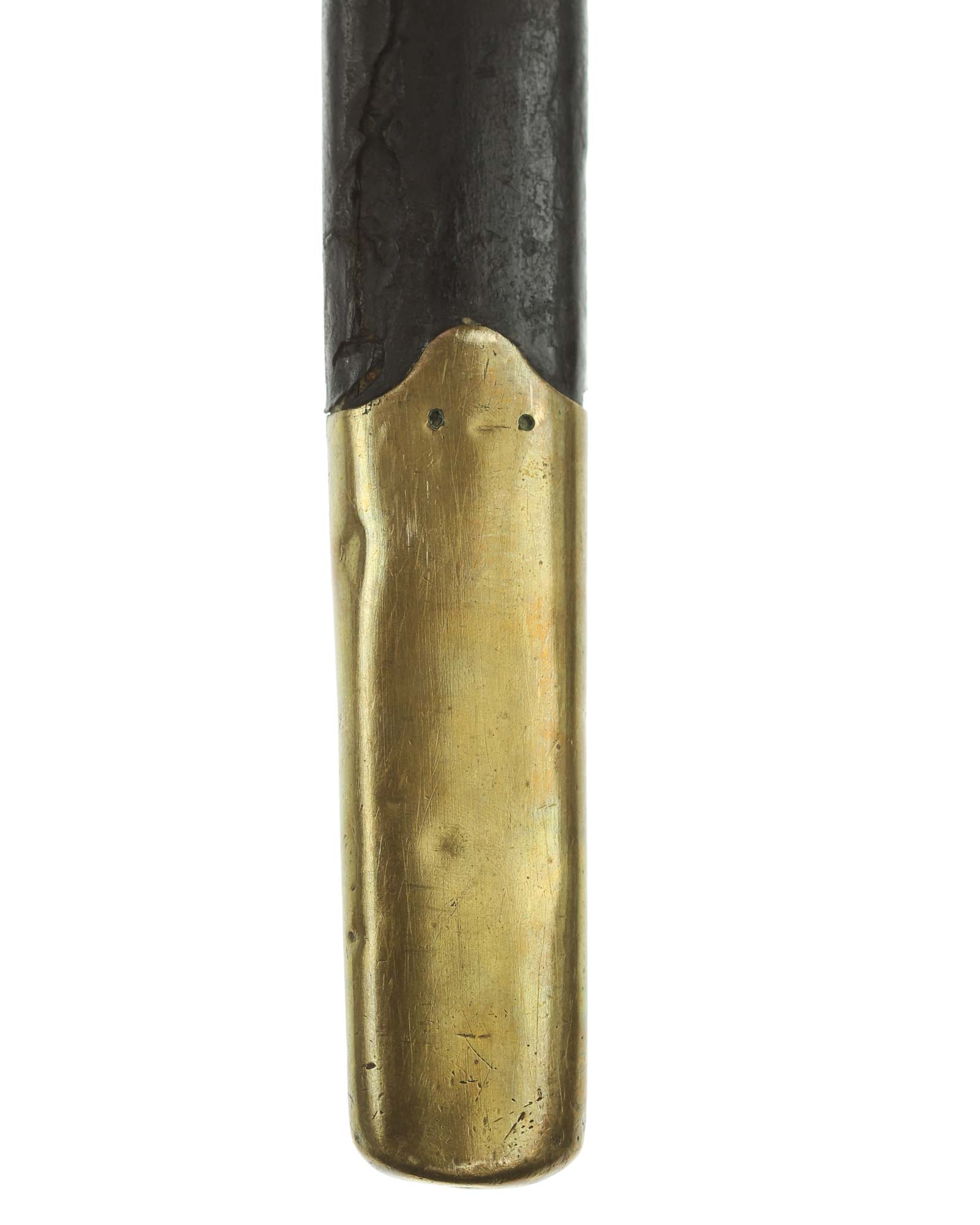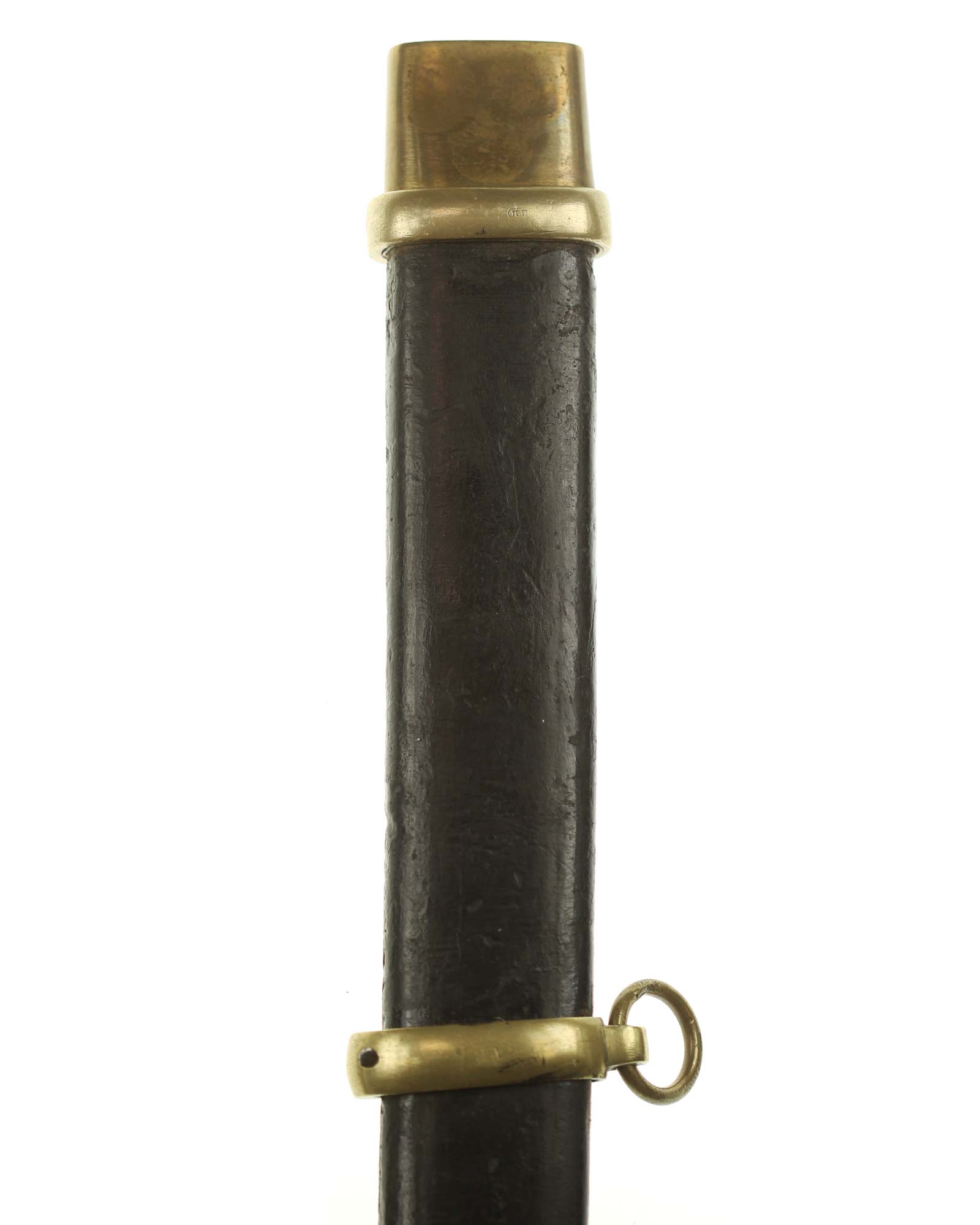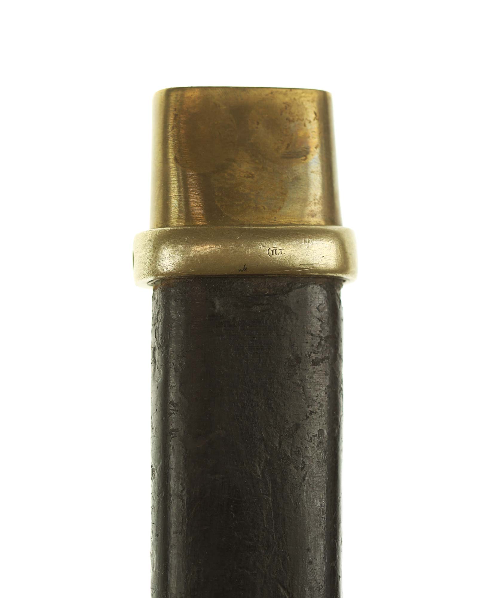 Ножны: Ножны деревянные, обтянутые кожей, тонированной в черный цвет; прибор ножен латунный, состоит из устья со скобой, обоймицы с подвижно закрепленным кольцом и наконечника в виде удлиненного стаканчика.