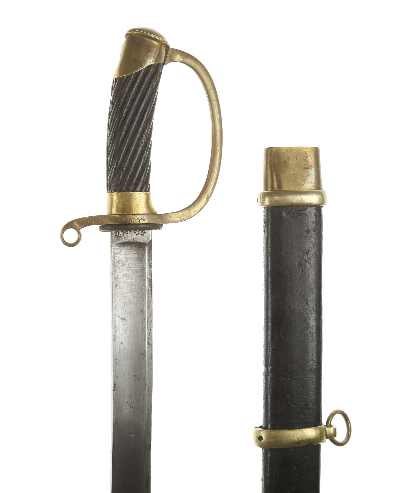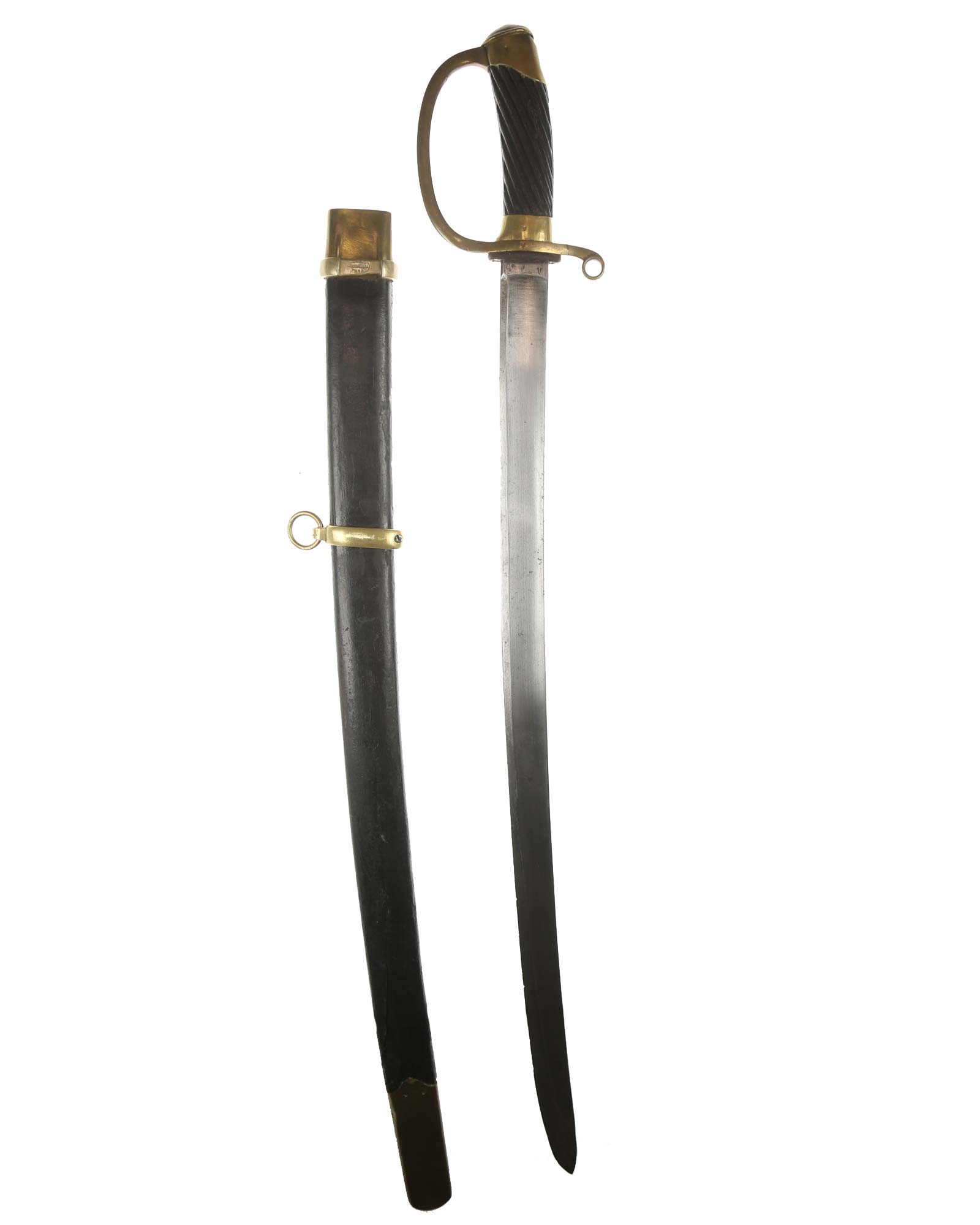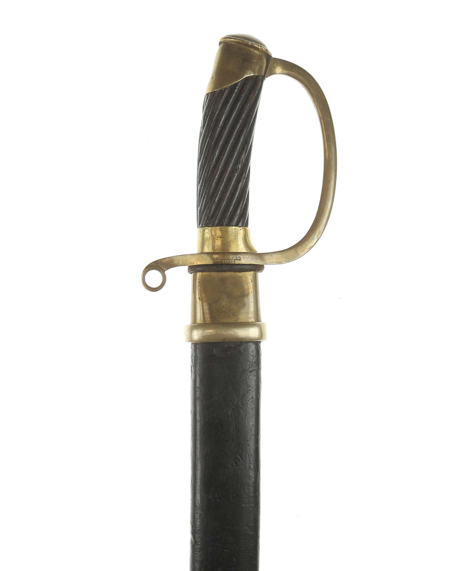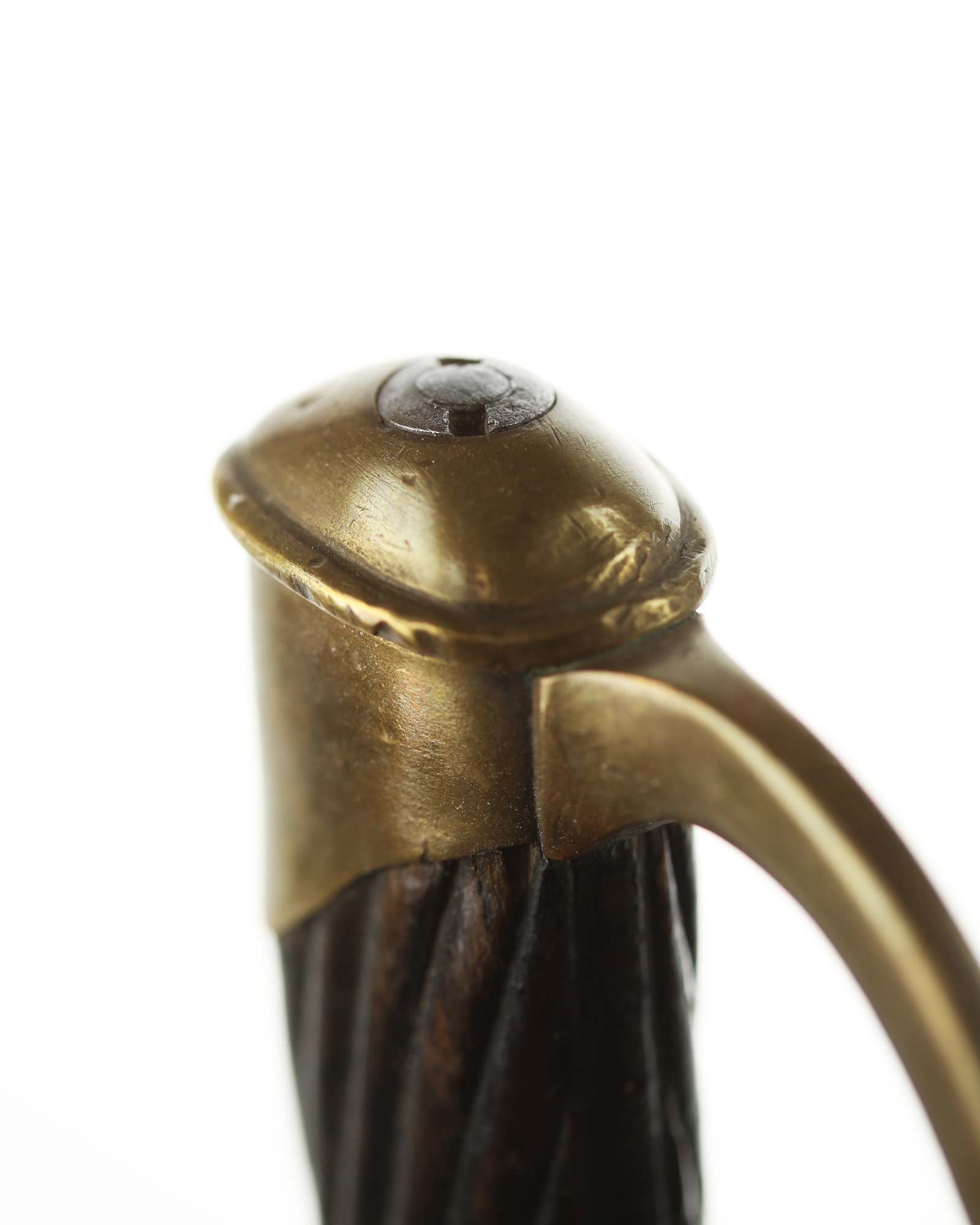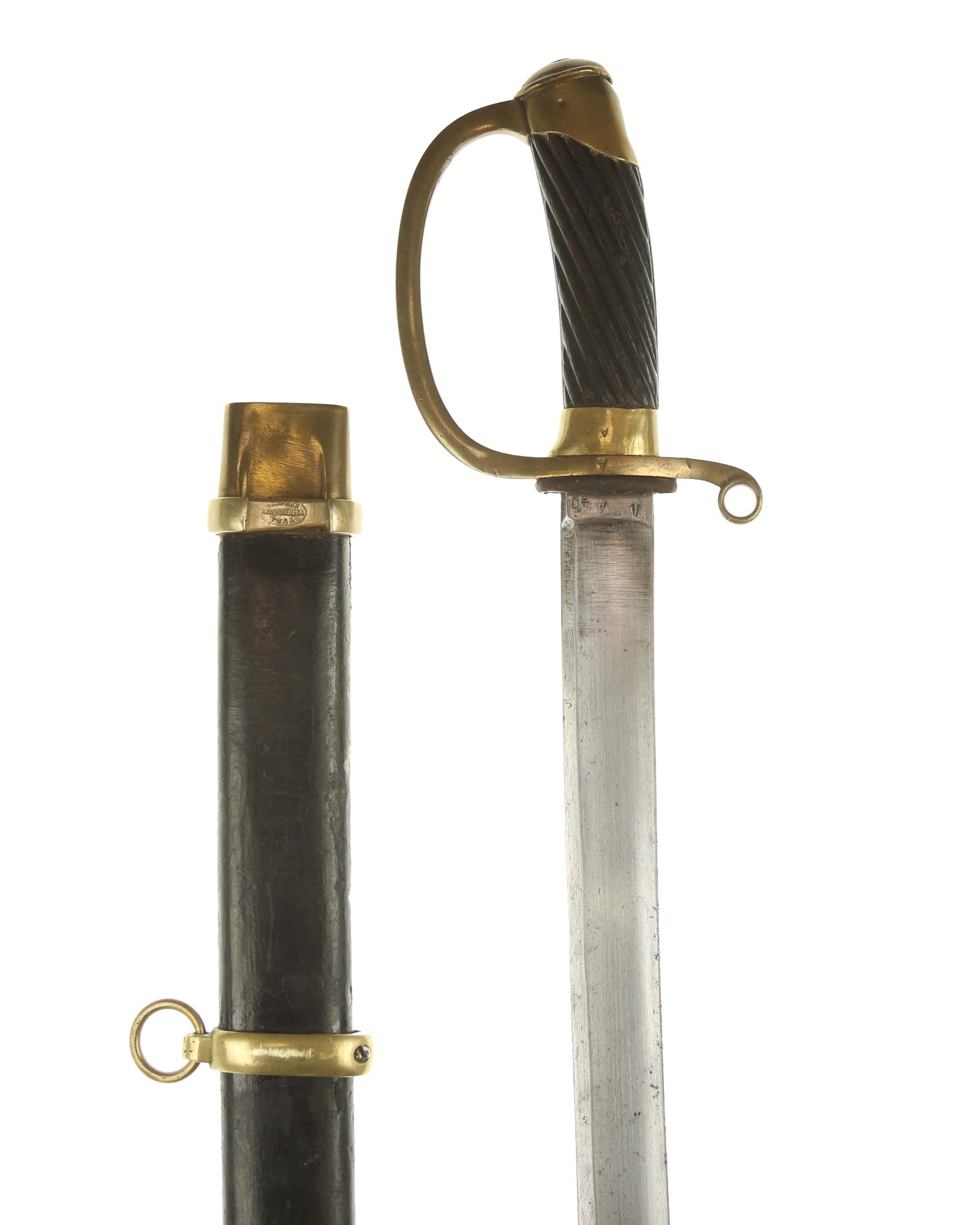 Ножны: Ножны деревянные, обтянутые кожей, тонированной в черный цвет; прибор ножен латунный, состоит из устья со скобой, обоймицы с подвижно закрепленным кольцом и наконечника в виде удлиненного стаканчика.