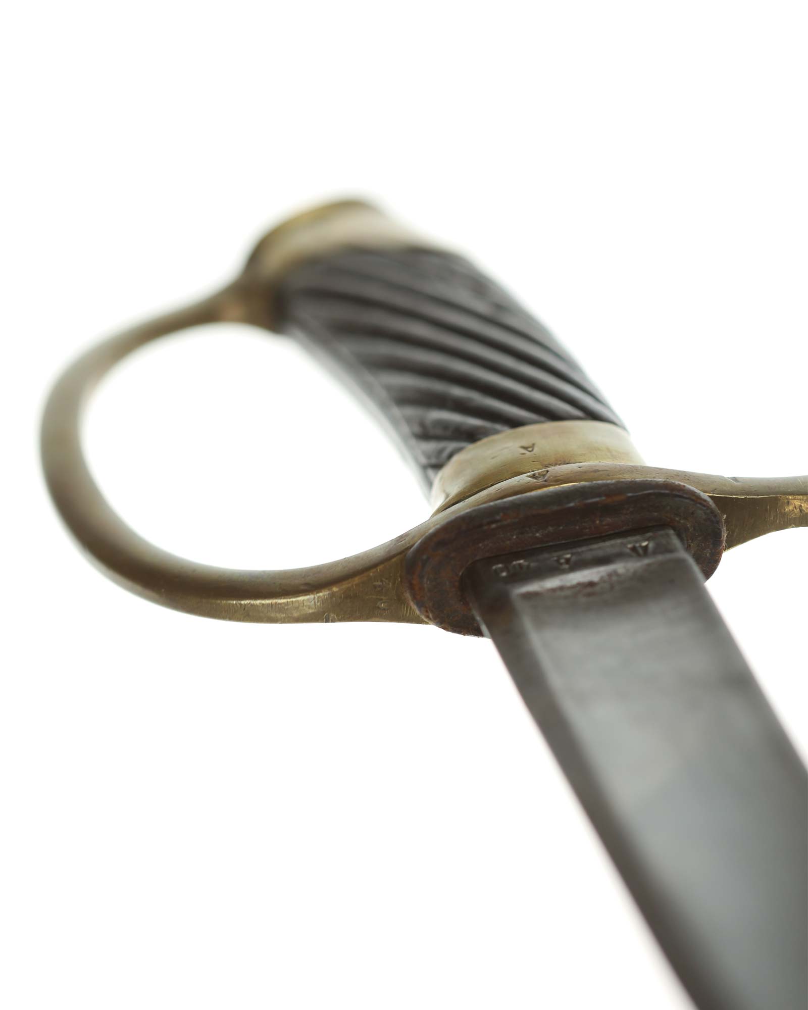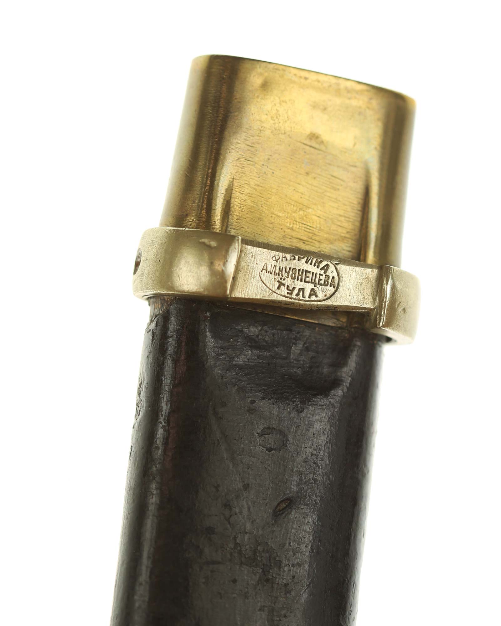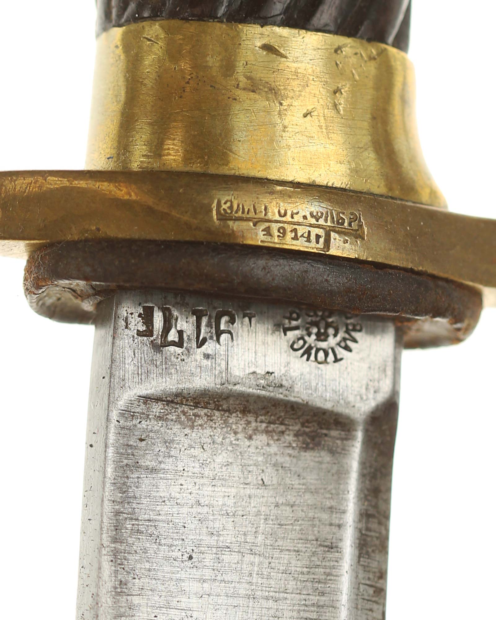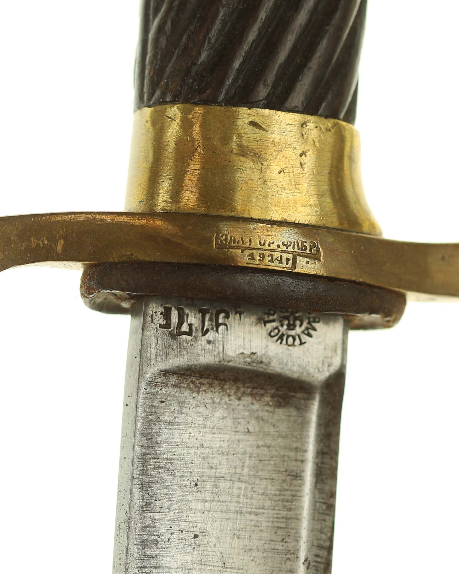 Рукоять: Эфес состоит из рукояти и латунной гарды. Рукоять бакелитовая, овального сечения, с глубокими поперечными желобками, с небольшим расширением в средней части; верхняя часть черена отогнута в сторону клинка. Внизу на рукояти расположена гладкая фигурная латунная втулка. Навершие рукояти латунное, стаканчиком, с оттянутым вдоль спинки язычком и овальным выпуклым завершением в виде навинчивающейся на хвостовик крышечки. Навершие декорировано литой низкорельефной композицией, включающей в себя: в центральной части – овальный медальон со вписанной монограммой «Н II» под короной на псевдоканфаренном фоне (вензель императора России Николая II); вдоль верхнего края – узкий поясок растительно-геометрического орнамента; вдоль нижнего края – изображение цветка с исходящими от него в обе стороны (влево и вправо) лавровыми ветвями. Гарда образована одной передней дужкой, исходящей от навершия и, плавно изгибаясь, переходящей в узкую крестовину, конец которой загнут в сторону клинка и имеет круглое сквозное отверстие для крепления темляка.