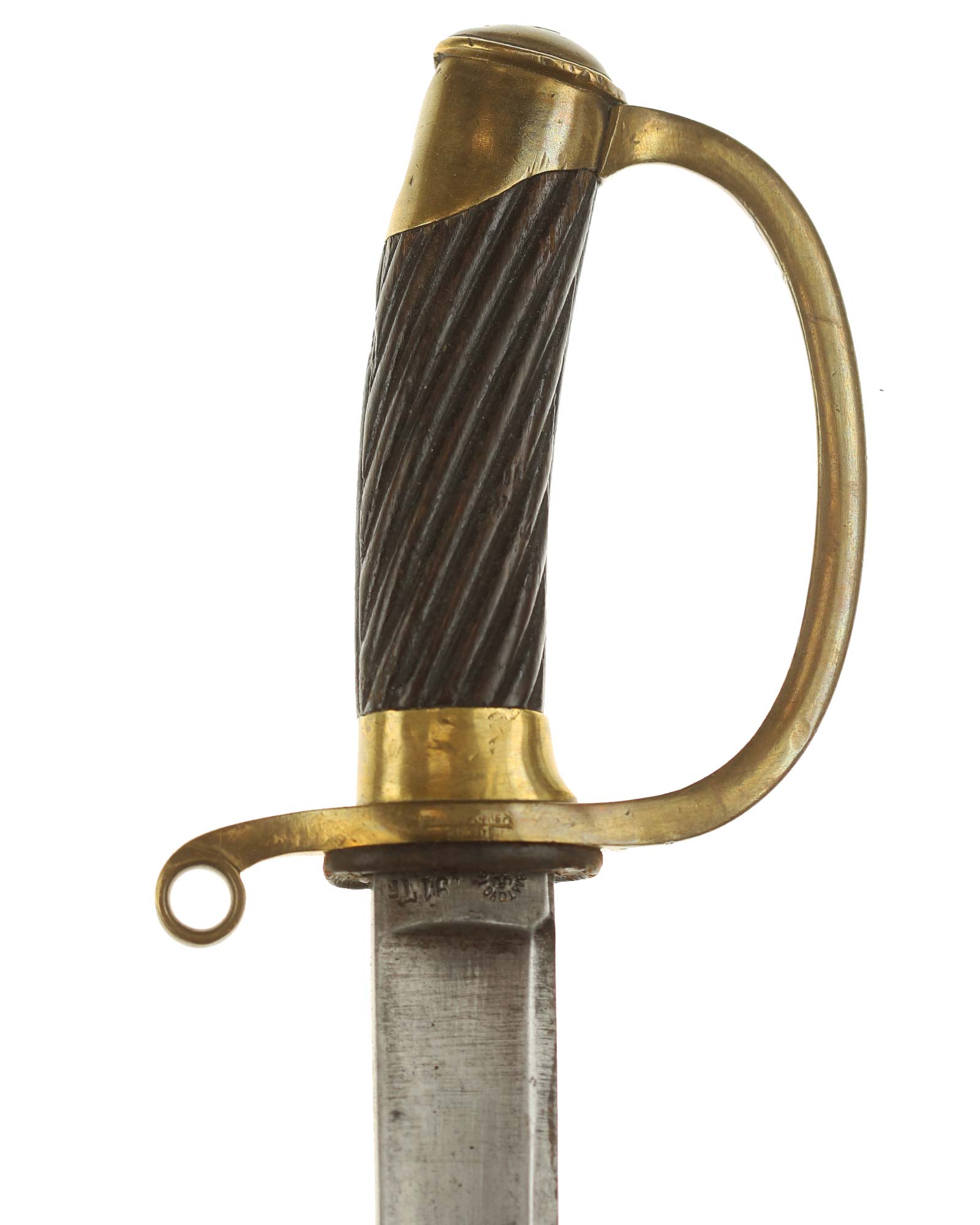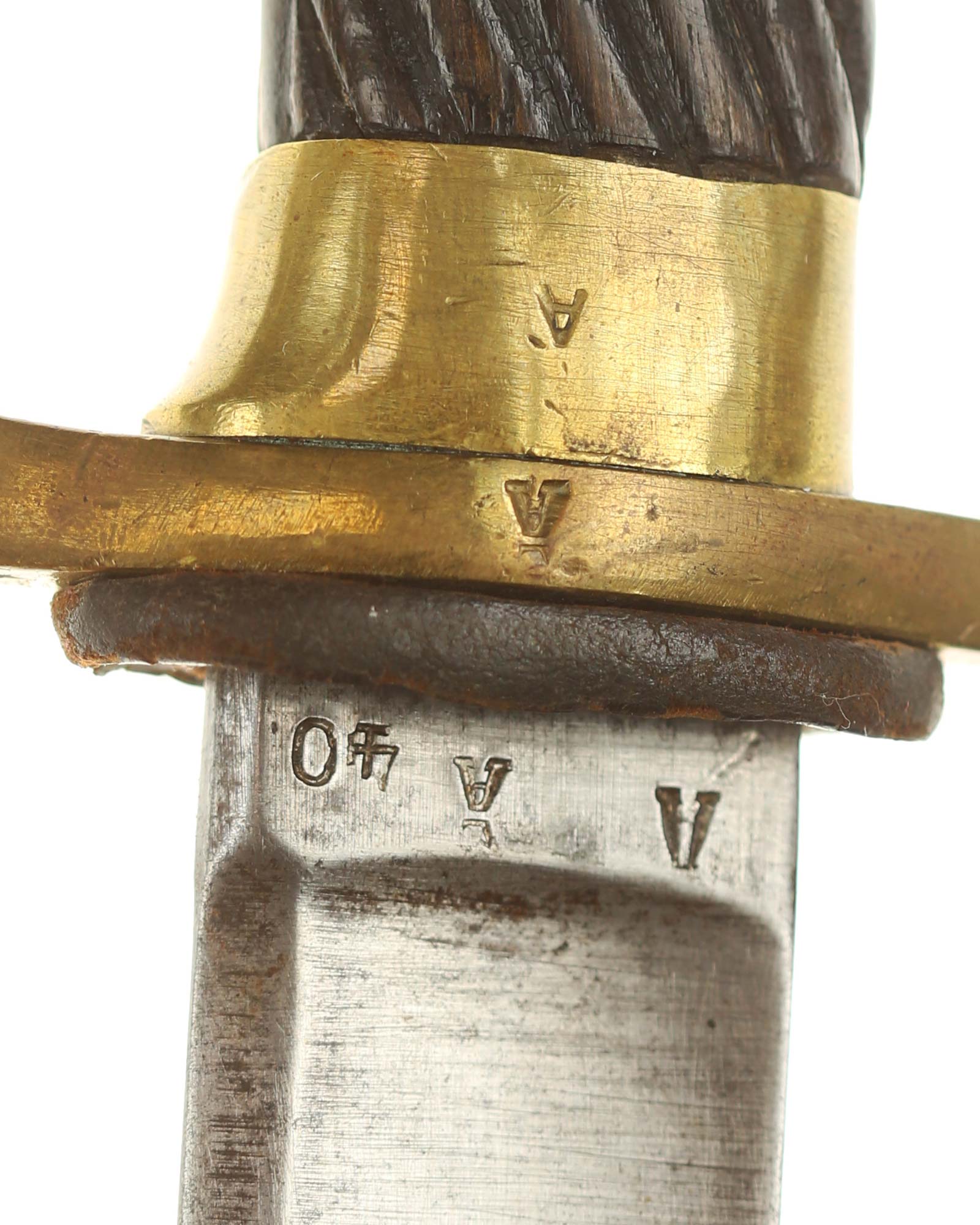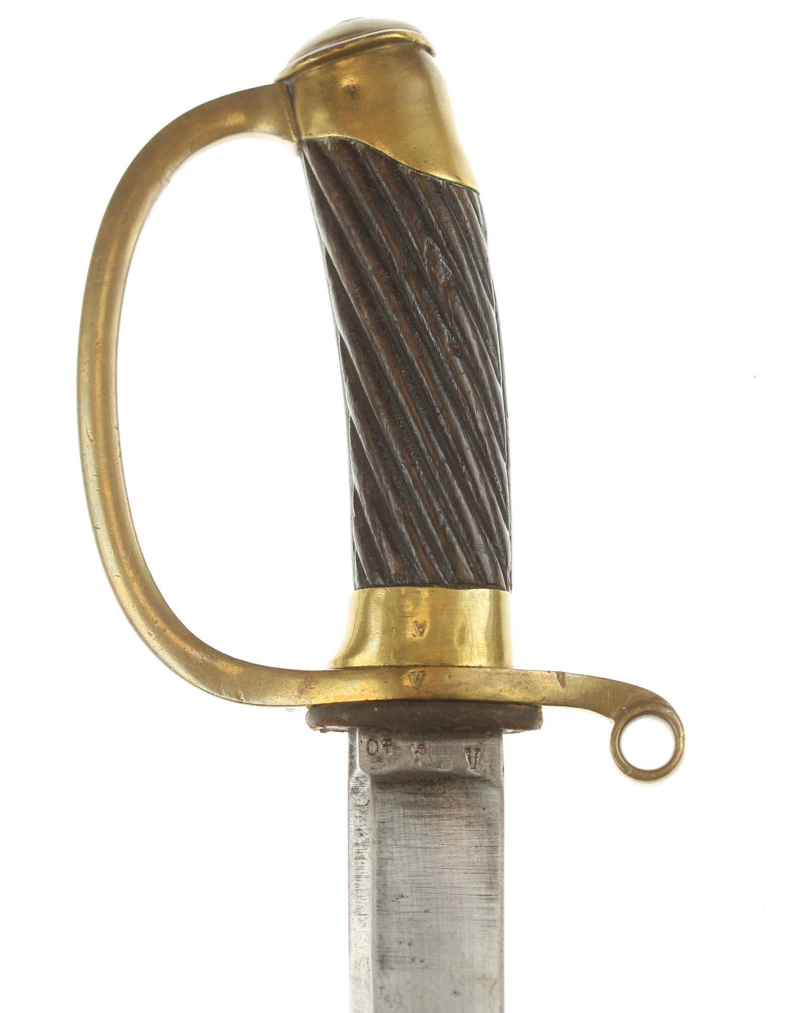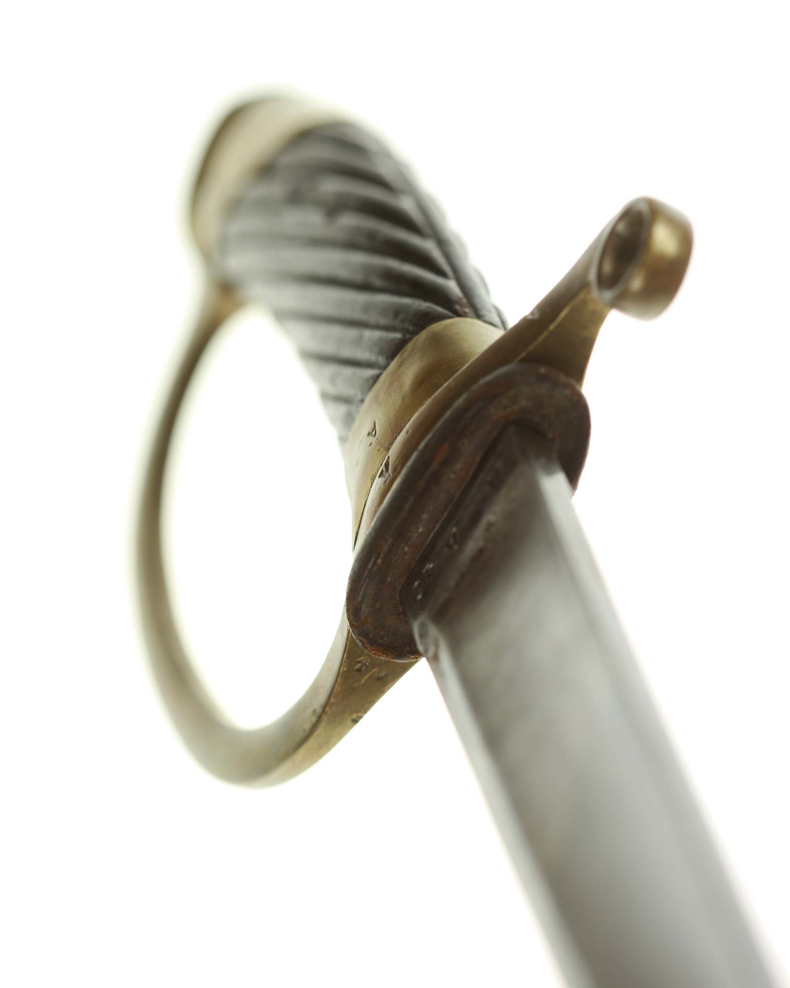 Рукоять: Эфес состоит из рукояти и латунной гарды. Рукоять бакелитовая, овального сечения, с глубокими поперечными желобками, с небольшим расширением в средней части; верхняя часть черена отогнута в сторону клинка. Внизу на рукояти расположена гладкая фигурная латунная втулка. Навершие рукояти латунное, стаканчиком, с оттянутым вдоль спинки язычком и овальным выпуклым завершением в виде навинчивающейся на хвостовик крышечки. Навершие декорировано литой низкорельефной композицией, включающей в себя: в центральной части – овальный медальон со вписанной монограммой «Н II» под короной на псевдоканфаренном фоне (вензель императора России Николая II); вдоль верхнего края – узкий поясок растительно-геометрического орнамента; вдоль нижнего края – изображение цветка с исходящими от него в обе стороны (влево и вправо) лавровыми ветвями. Гарда образована одной передней дужкой, исходящей от навершия и, плавно изгибаясь, переходящей в узкую крестовину, конец которой загнут в сторону клинка и имеет круглое сквозное отверстие для крепления темляка.