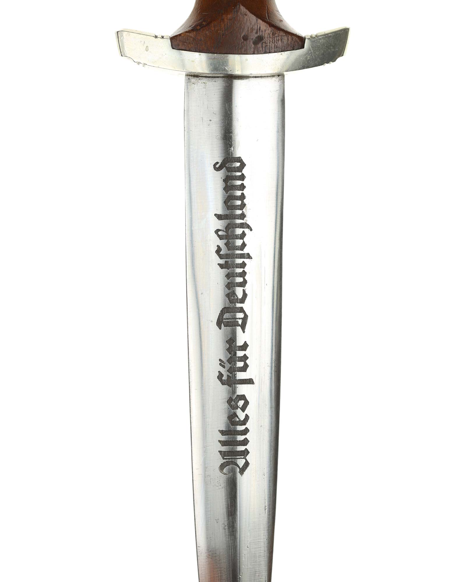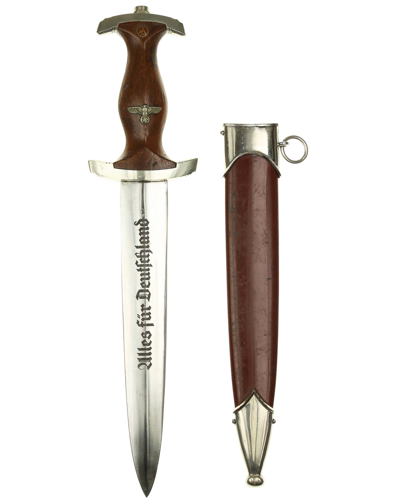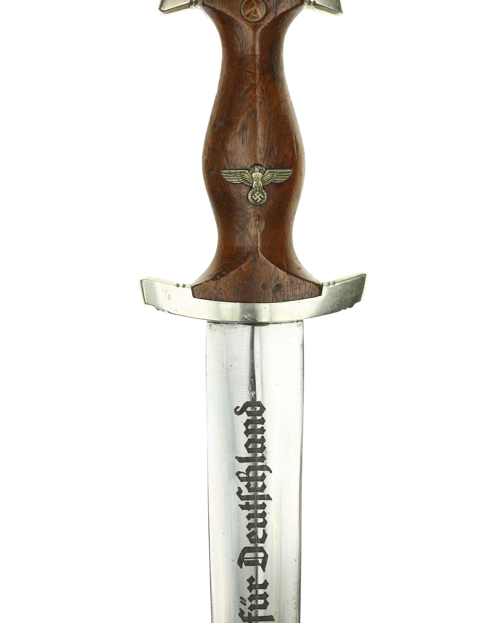 Клинок: Клинок кинжала прямой, стальной, двулезвийный, кинжального типа, с выраженным центральным ребром. На одной стороне клинка методом травления нанесен девиз СА «Всё для Германии» (Alles für Deutchland). Клинок на оборотной стороне у основания стоит клеймо производителя Адольф Фёлькер Шмалькальден (Adolf Völker Schmalkalden).
