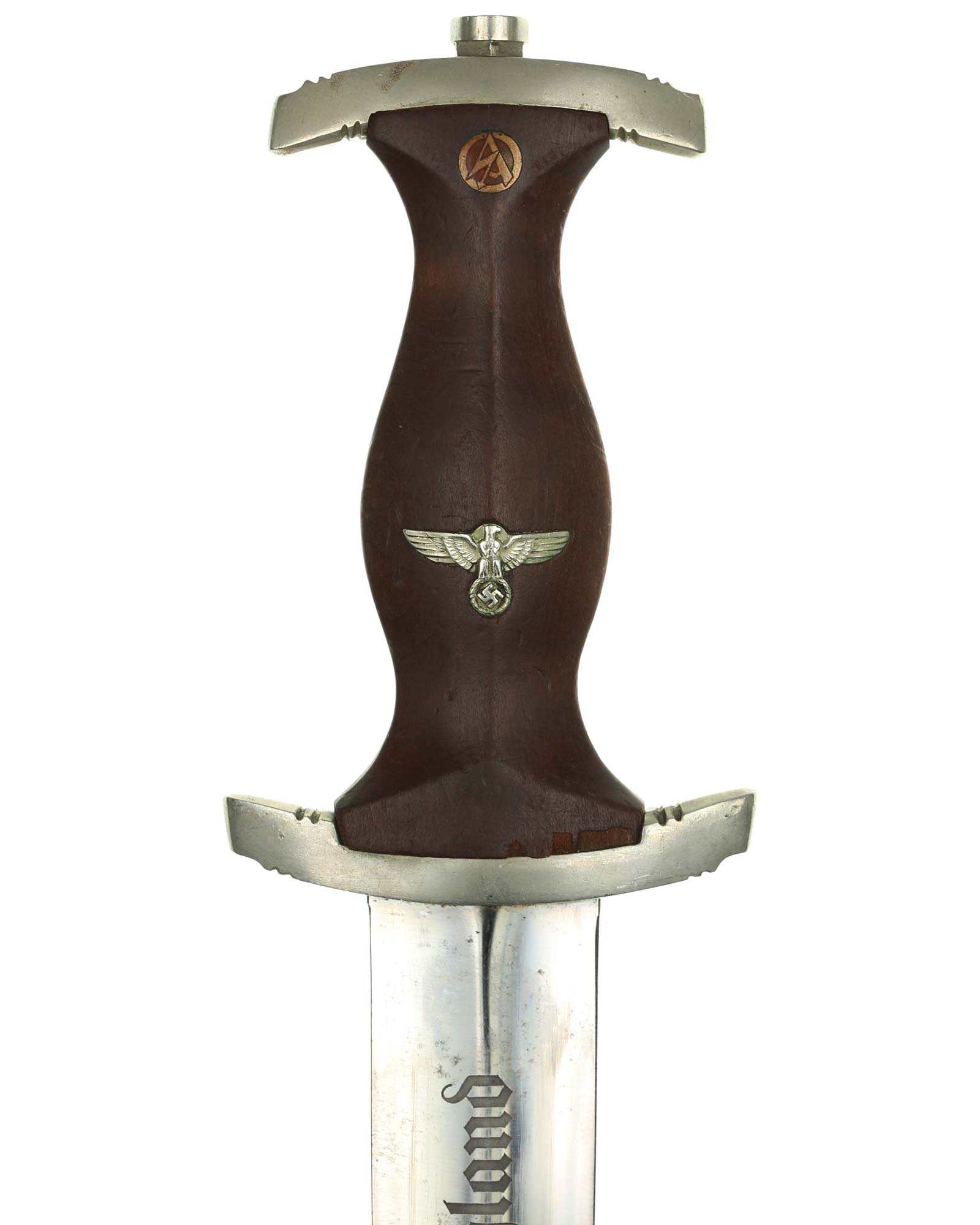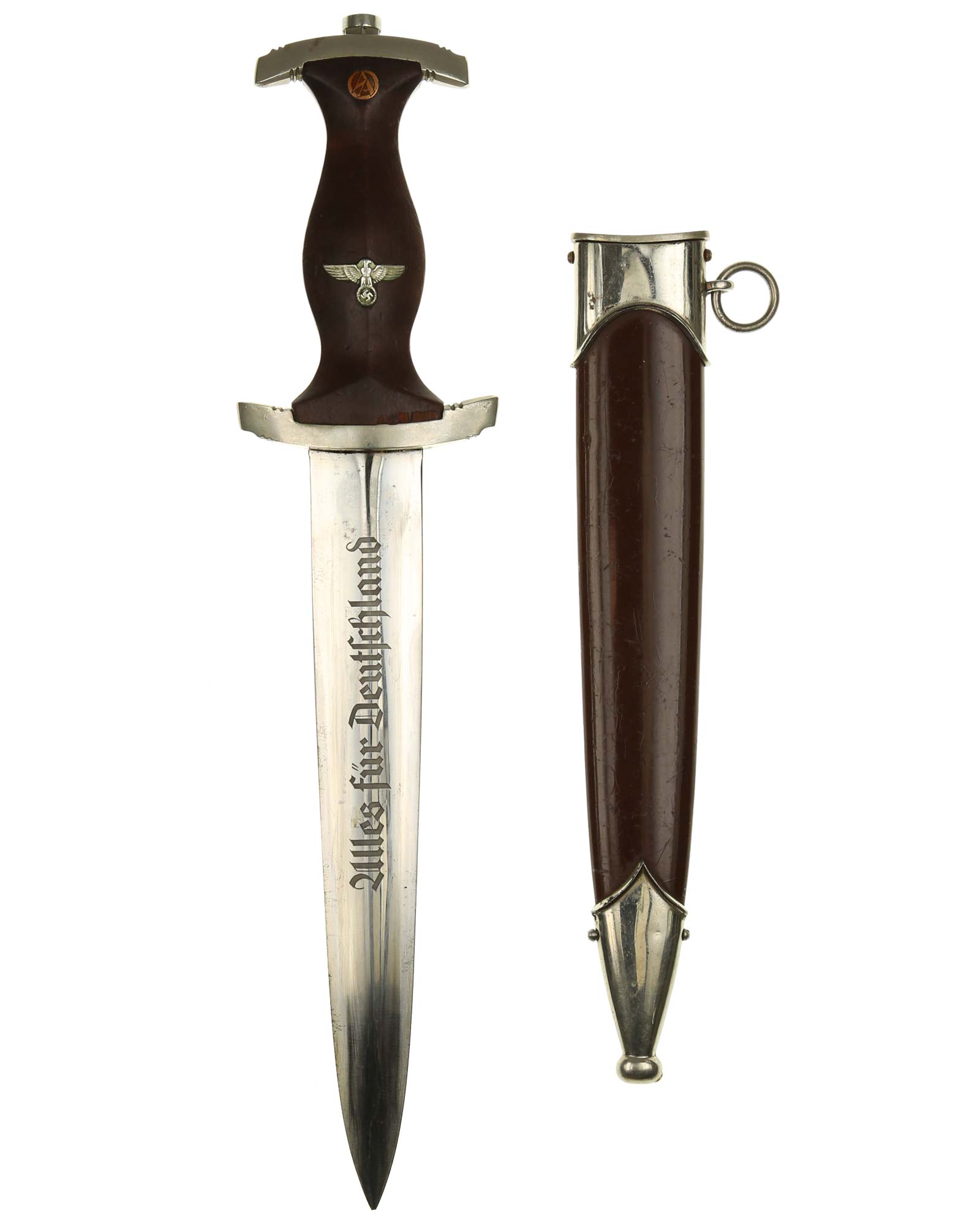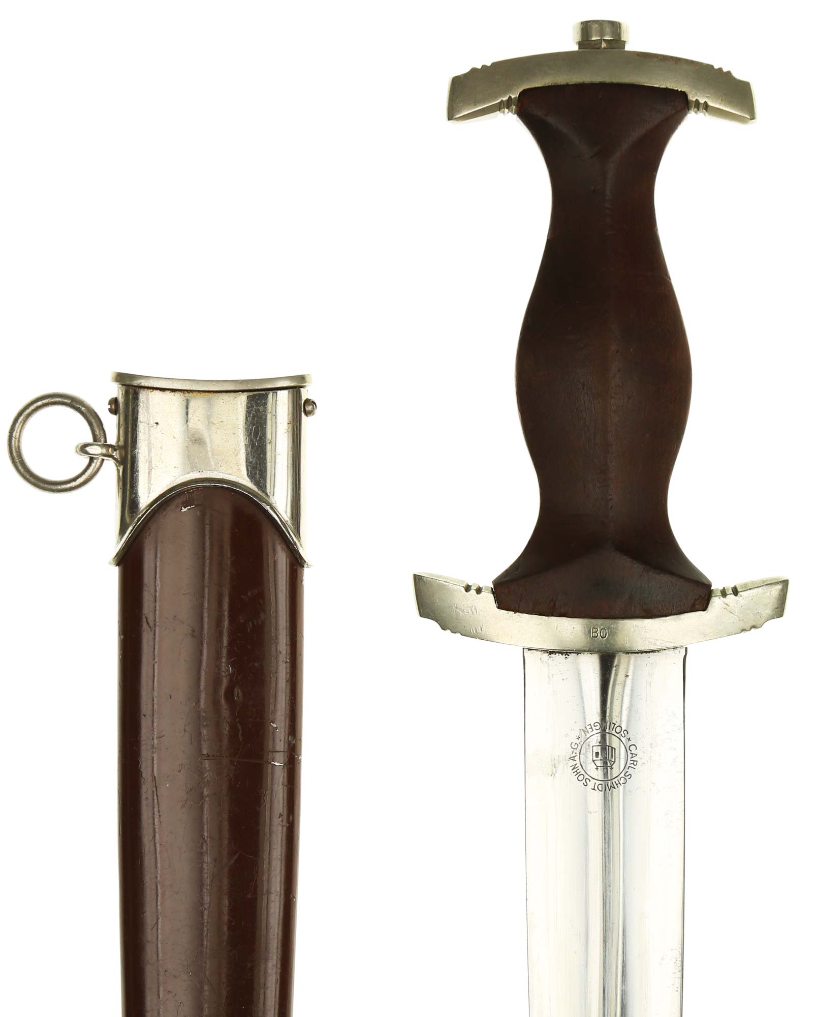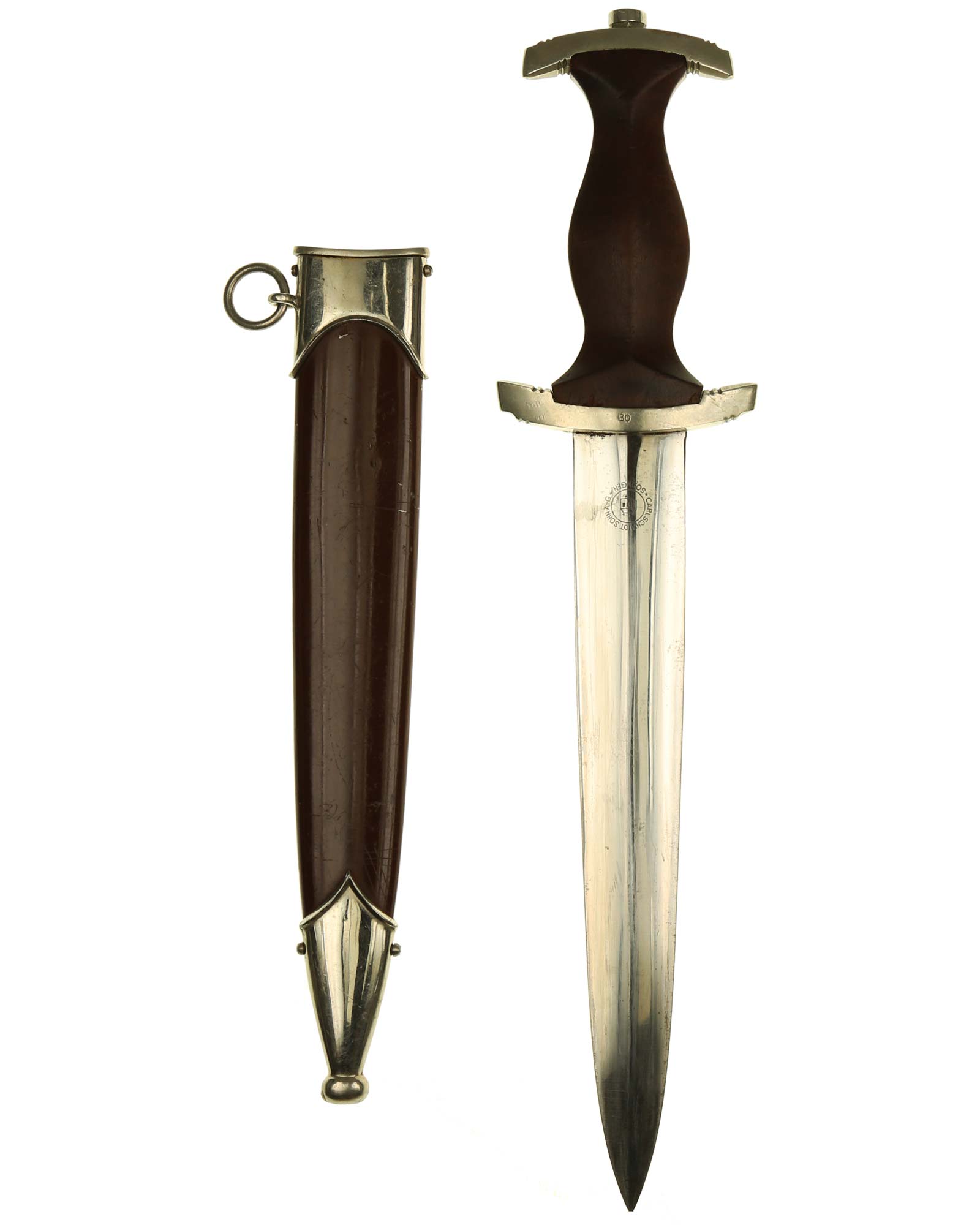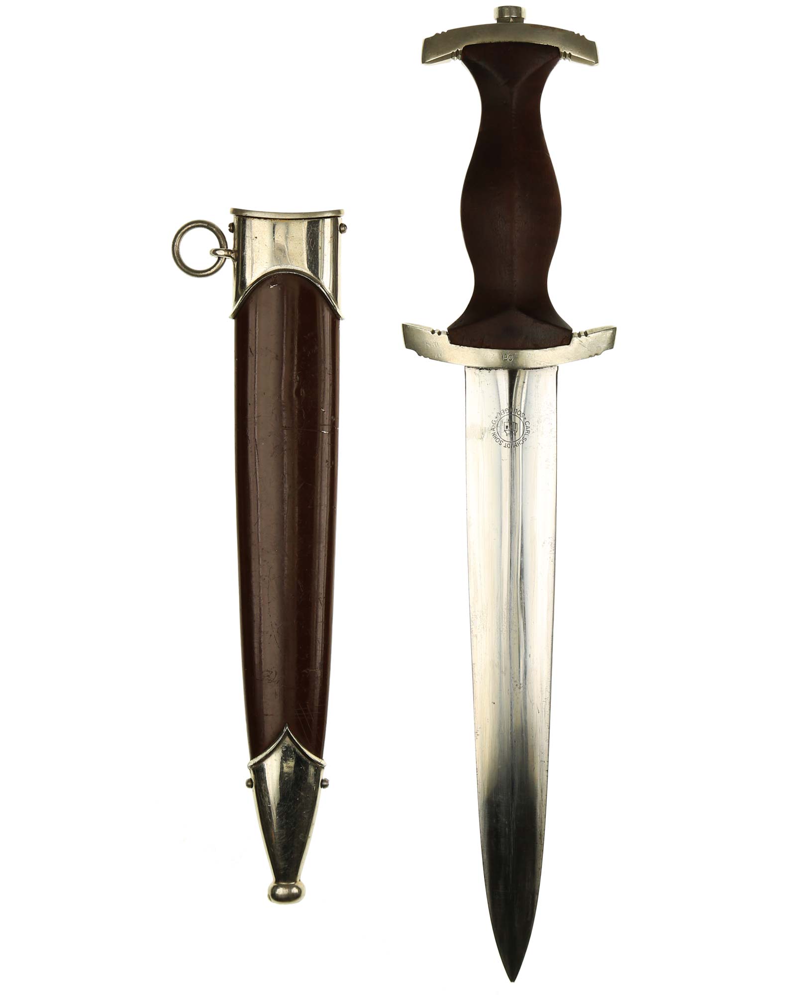 Клинок: Клинок кинжала прямой, стальной, двулезвийный, кинжального типа, с выраженным центральным ребром. На одной стороне клинка методом травления нанесен девиз СА «Всё для Германии» (Alles für Deutchland). Клинок на оборотной стороне у основания стоит клеймо производителя Carl Schmidt & Sohn Solingen (Карл Шмидт & сын, Золинген).