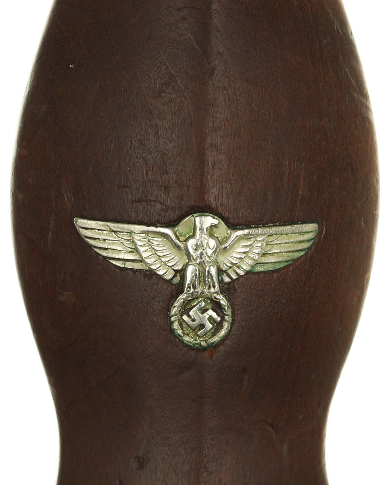 Рукоять: Рукоять из мореного в коричневый цвет дерева. Рукоять в верхней части имеет вставку в виде эмалевого глазка, в средней части – вставка в виде орла. Металлические элементы гарды изготовлены из мельхиора. Хвостовик клинка укреплен на верхней крестовине при помощи винта.