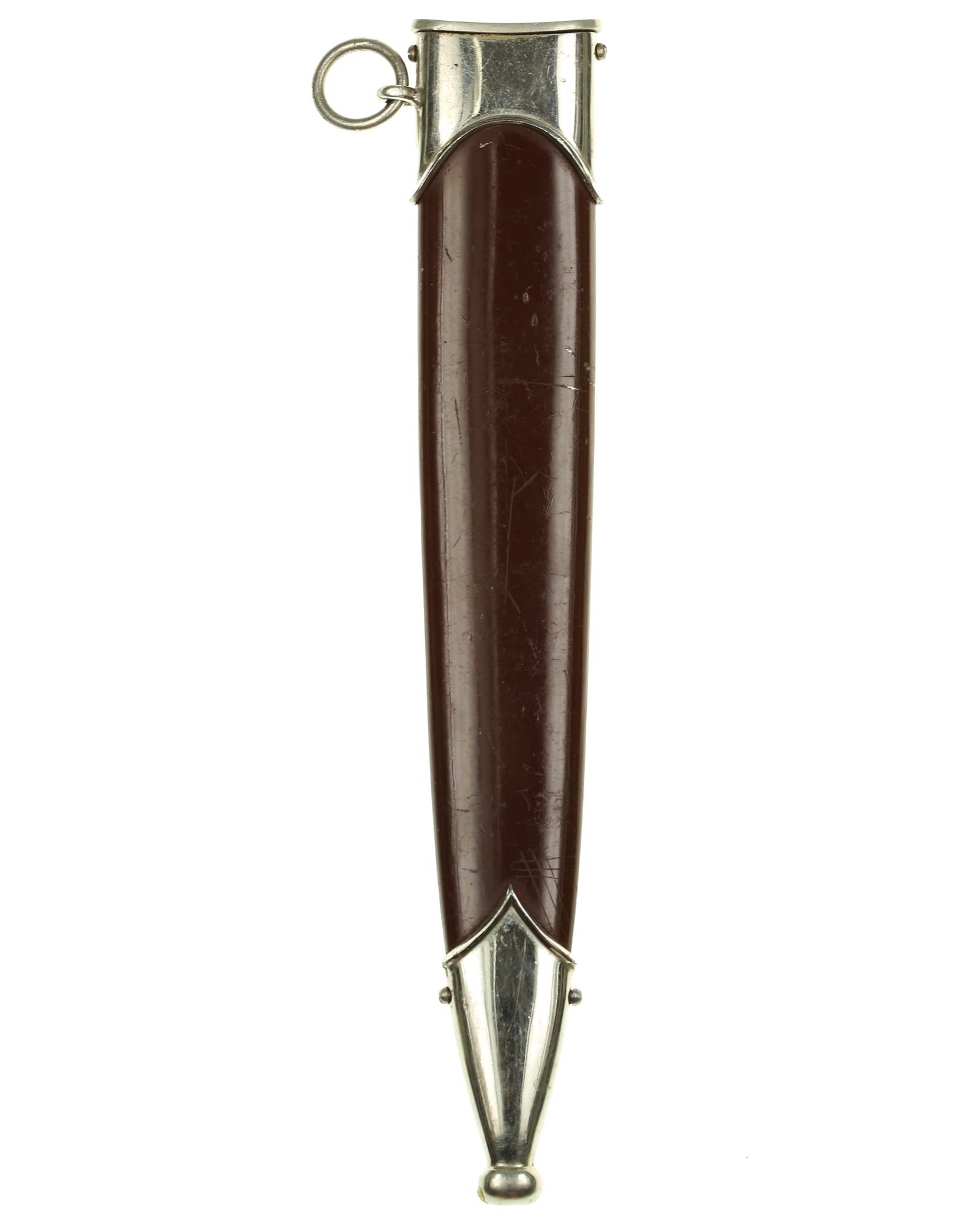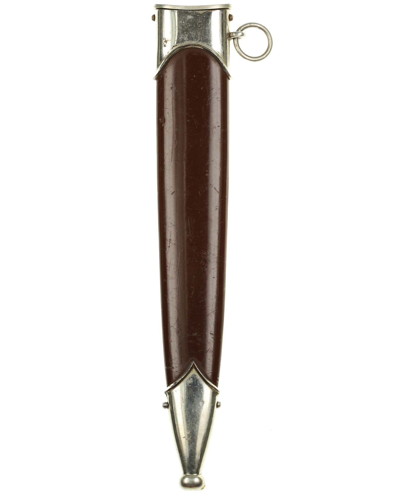 Ножны: Ножны металлические в оригинальном коричневом оксидировании, с накладными наконечником и устьем с кольцом. Наконечник и устье ножен крепятся при помощи двух винтов.
