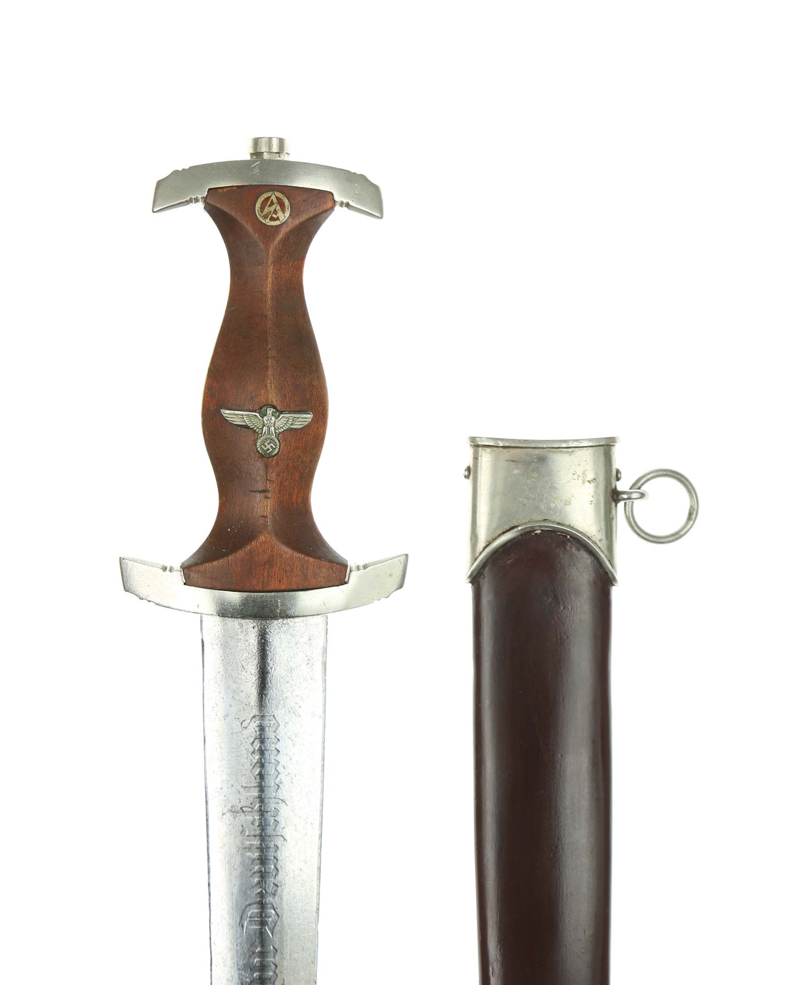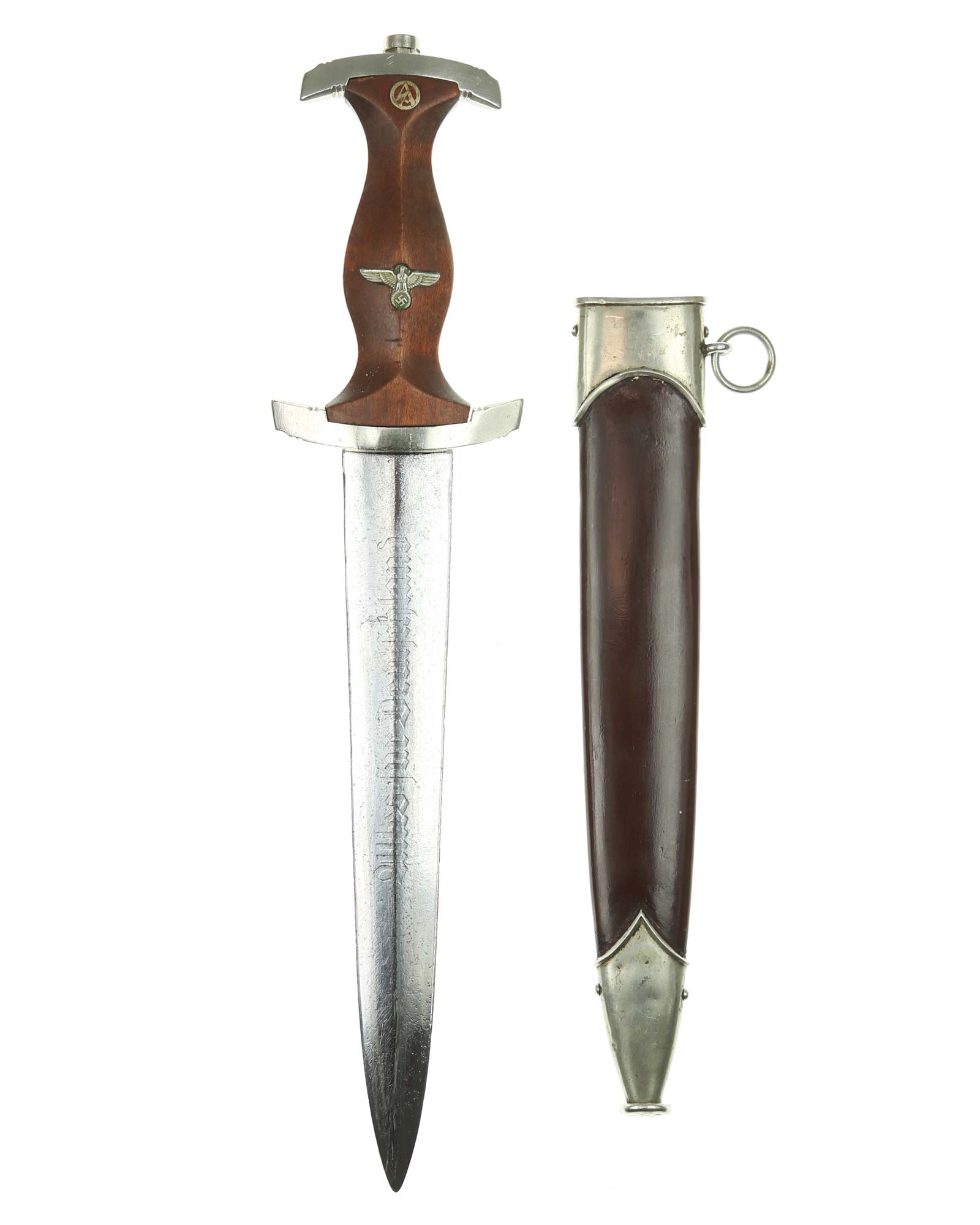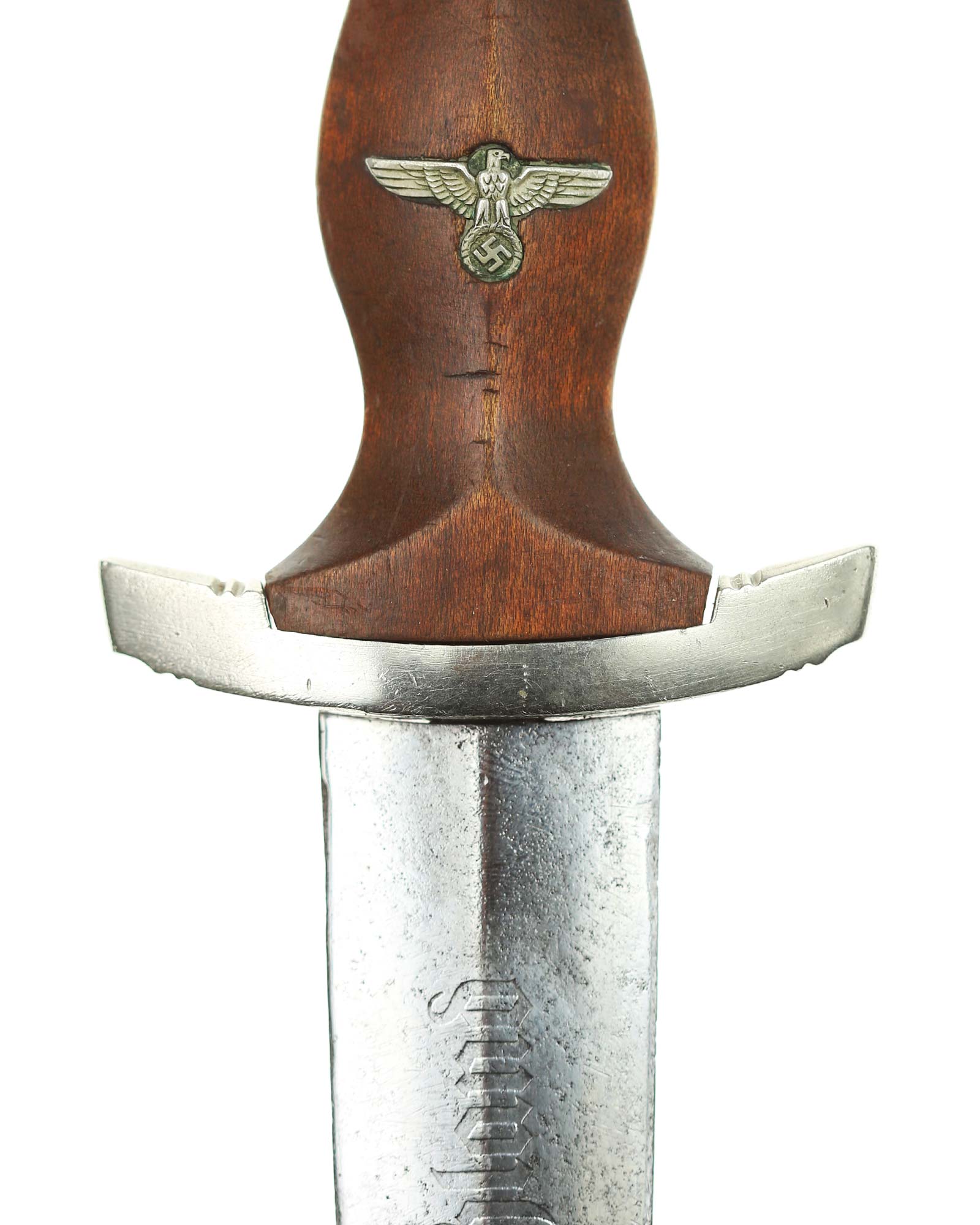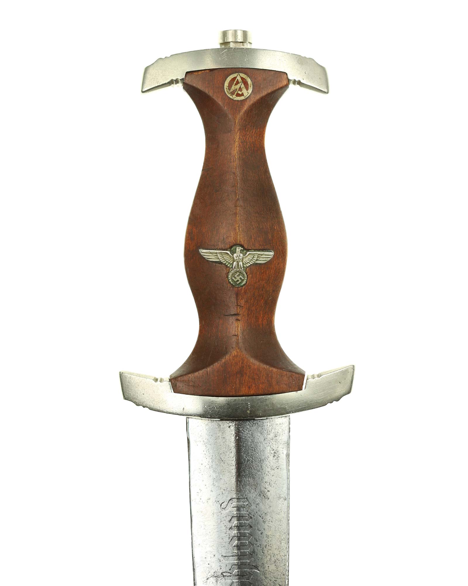 Клинок: Клинок кинжала прямой, стальной, двулезвийный, кинжального типа, с выраженным центральным ребром. На одной стороне клинка методом травления нанесен девиз СА «Всё для Германии» (Alles für Deutchland). Клинок на оборотной стороне у основания стоит клеймо производителя Альберт Мебус Золинген (Albert Mebus Solingen).