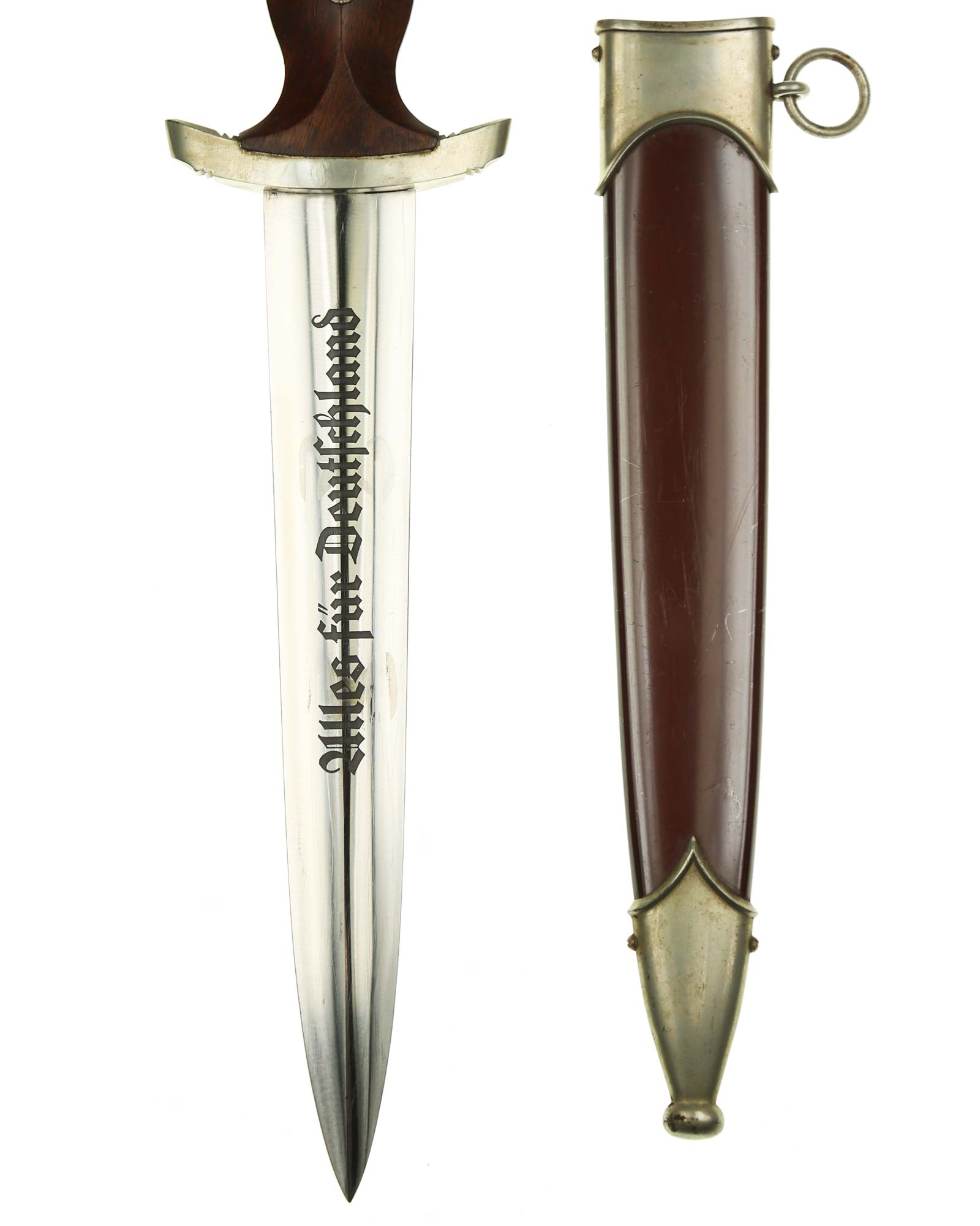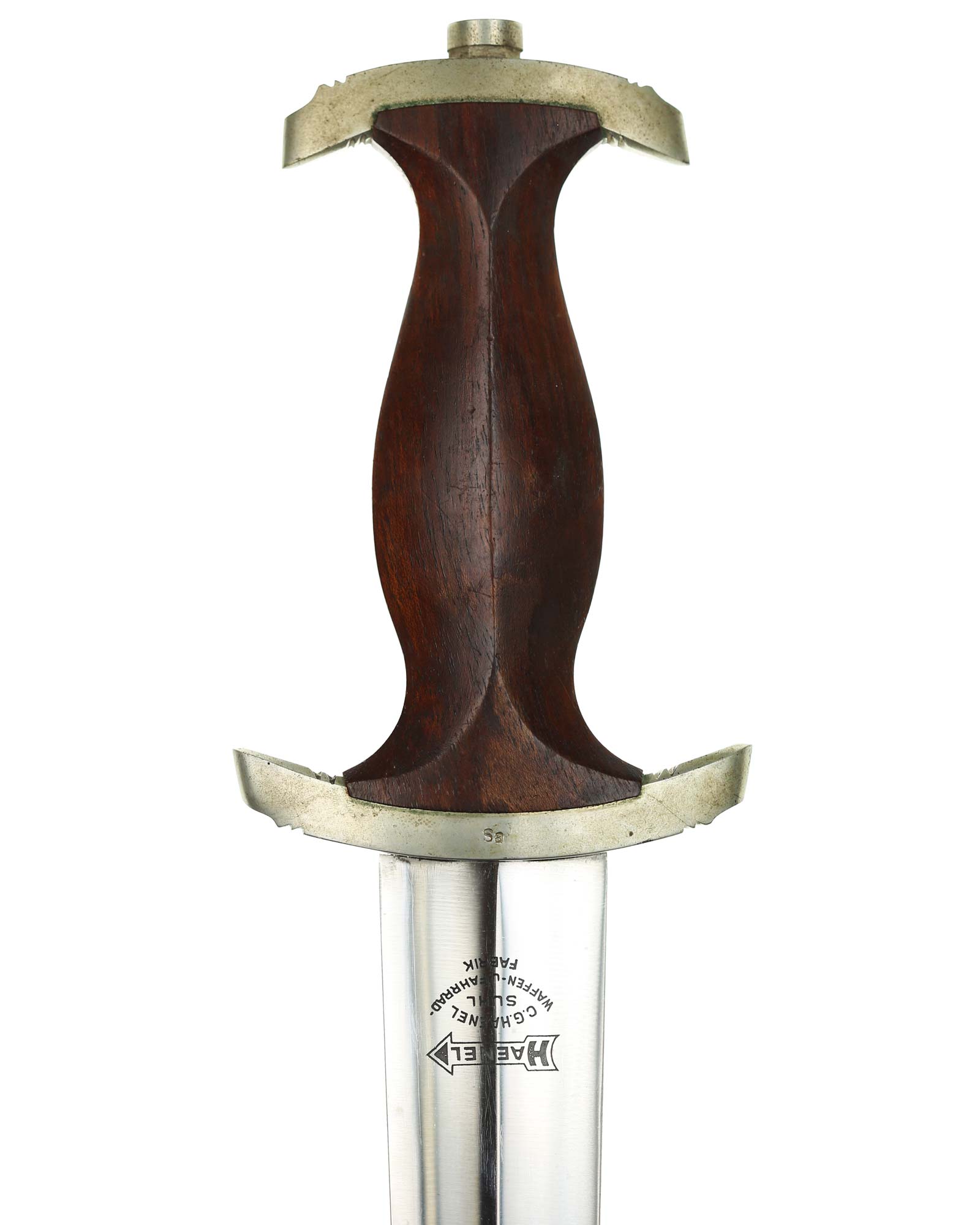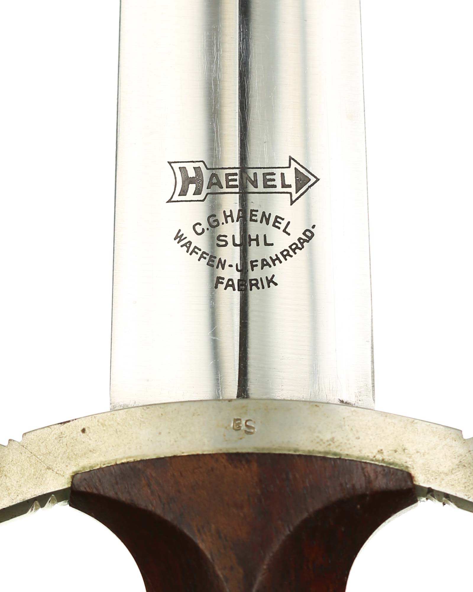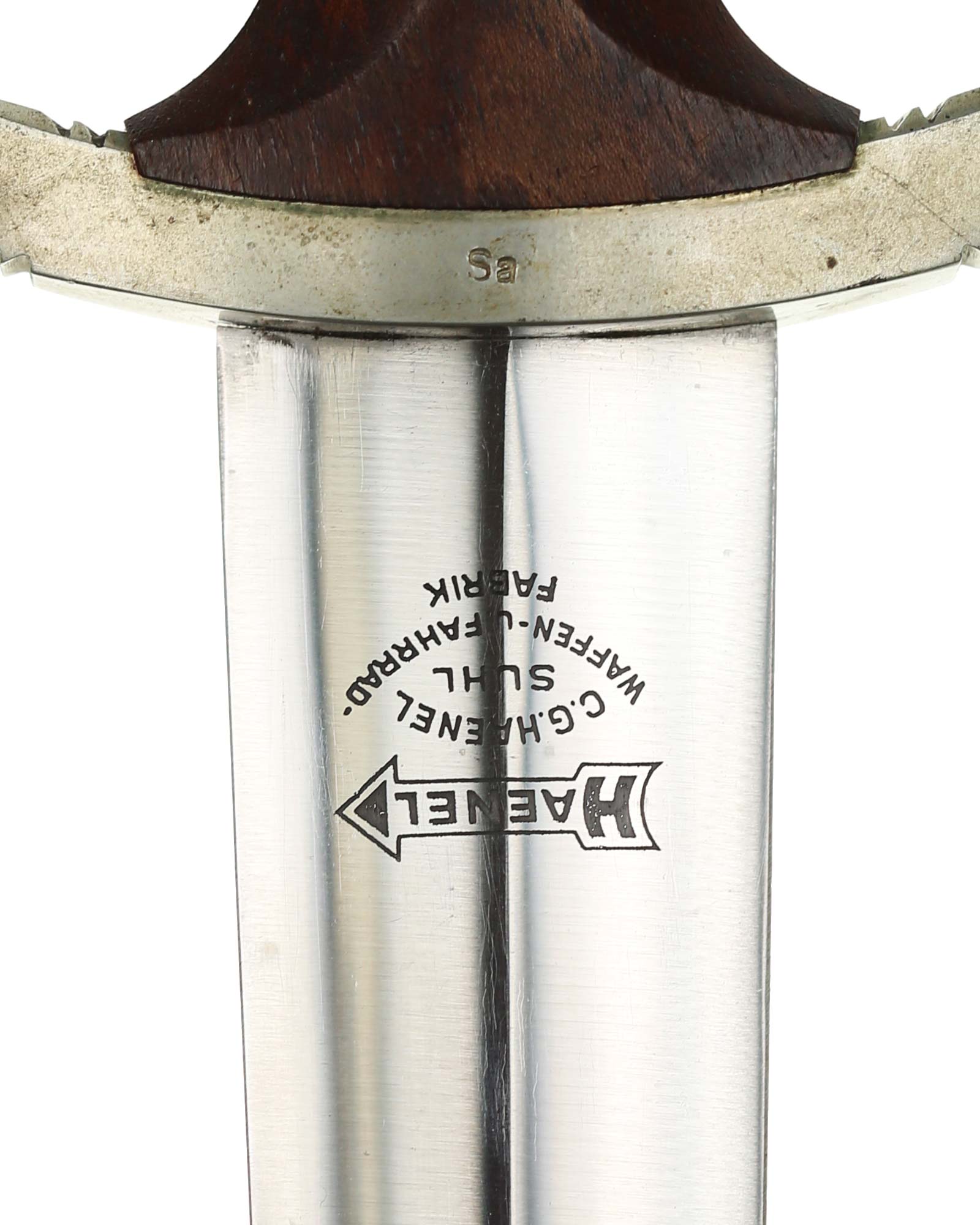 Клинок: Клинок кинжала прямой, стальной, двулезвийный, кинжального типа, с выраженным центральным ребром. На одной стороне клинка методом травления нанесен девиз СА «Всё для Германии» (Alles für Deutschland). Клинок на оборотной стороне у основания стоит клеймо производителя Ц. Г. Хенель Зуль (C. G. Haenel Suhl).