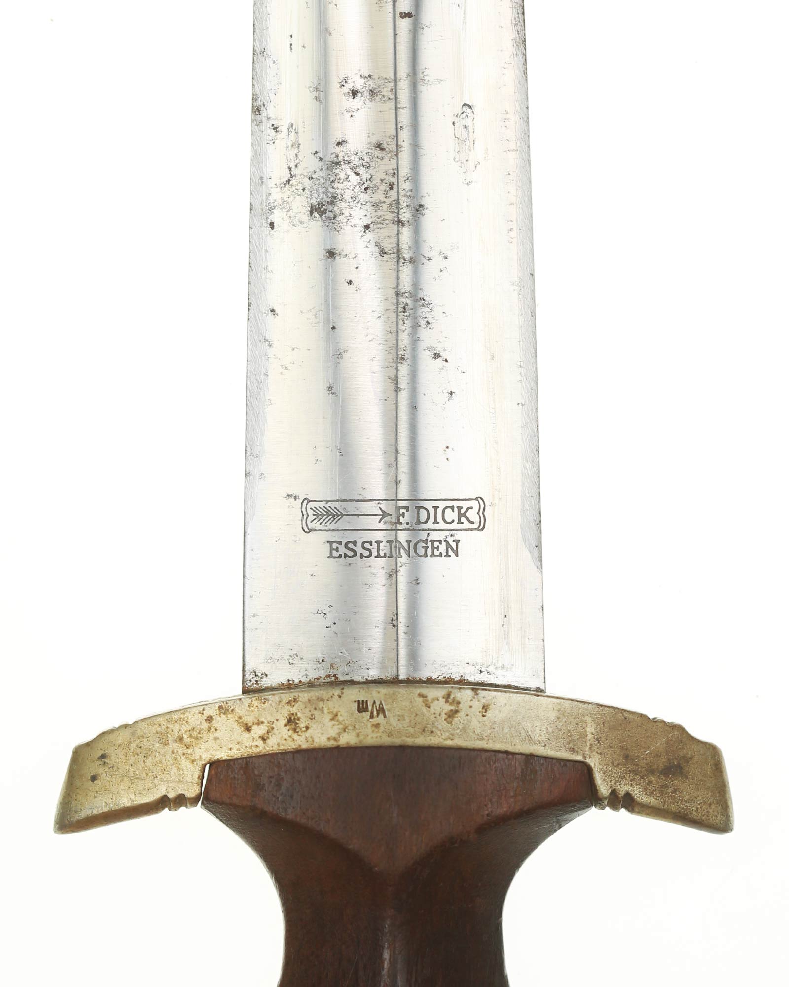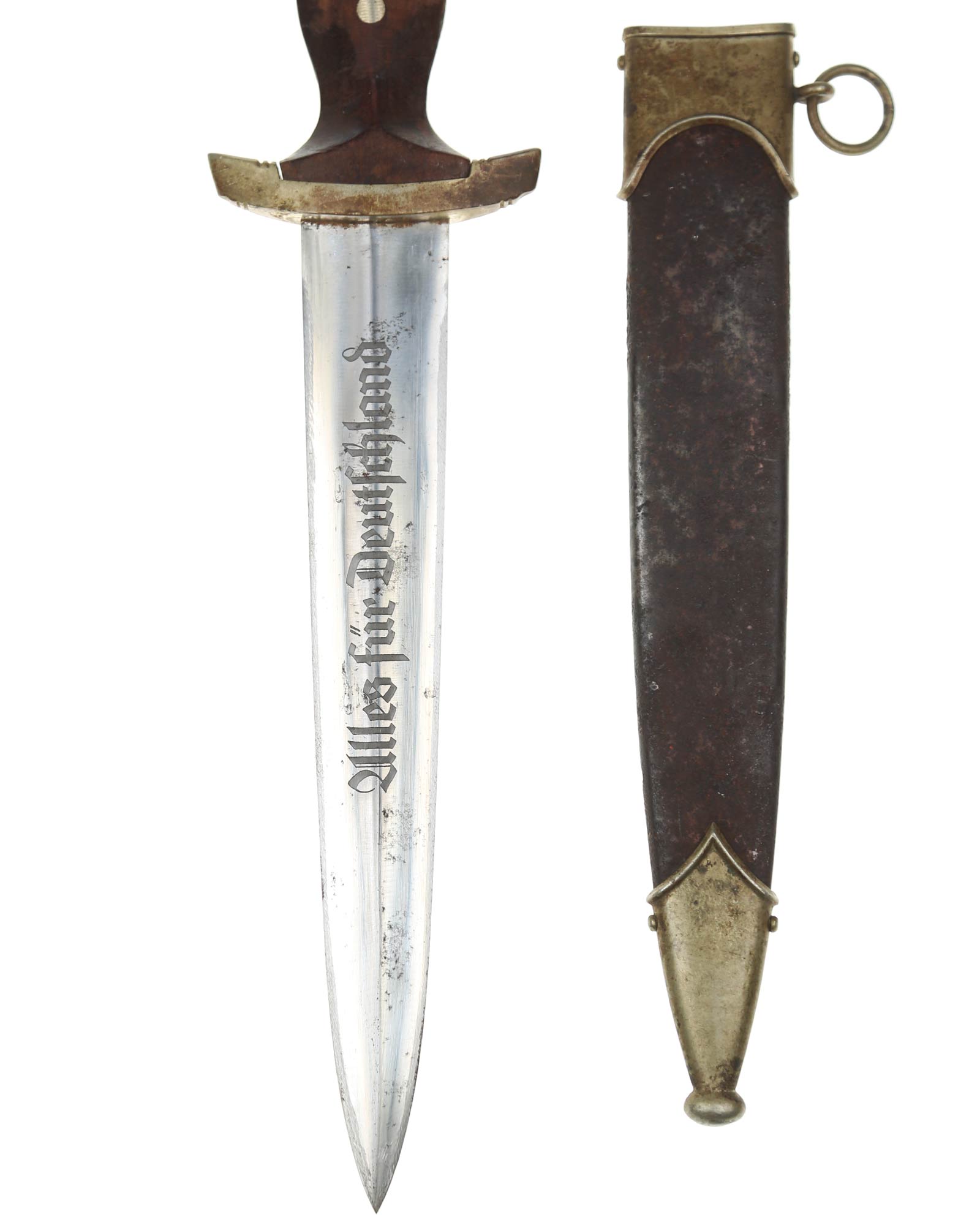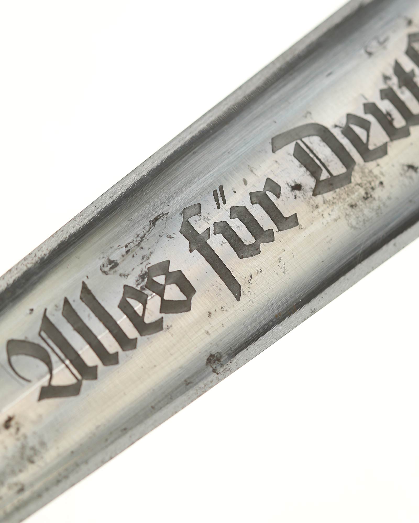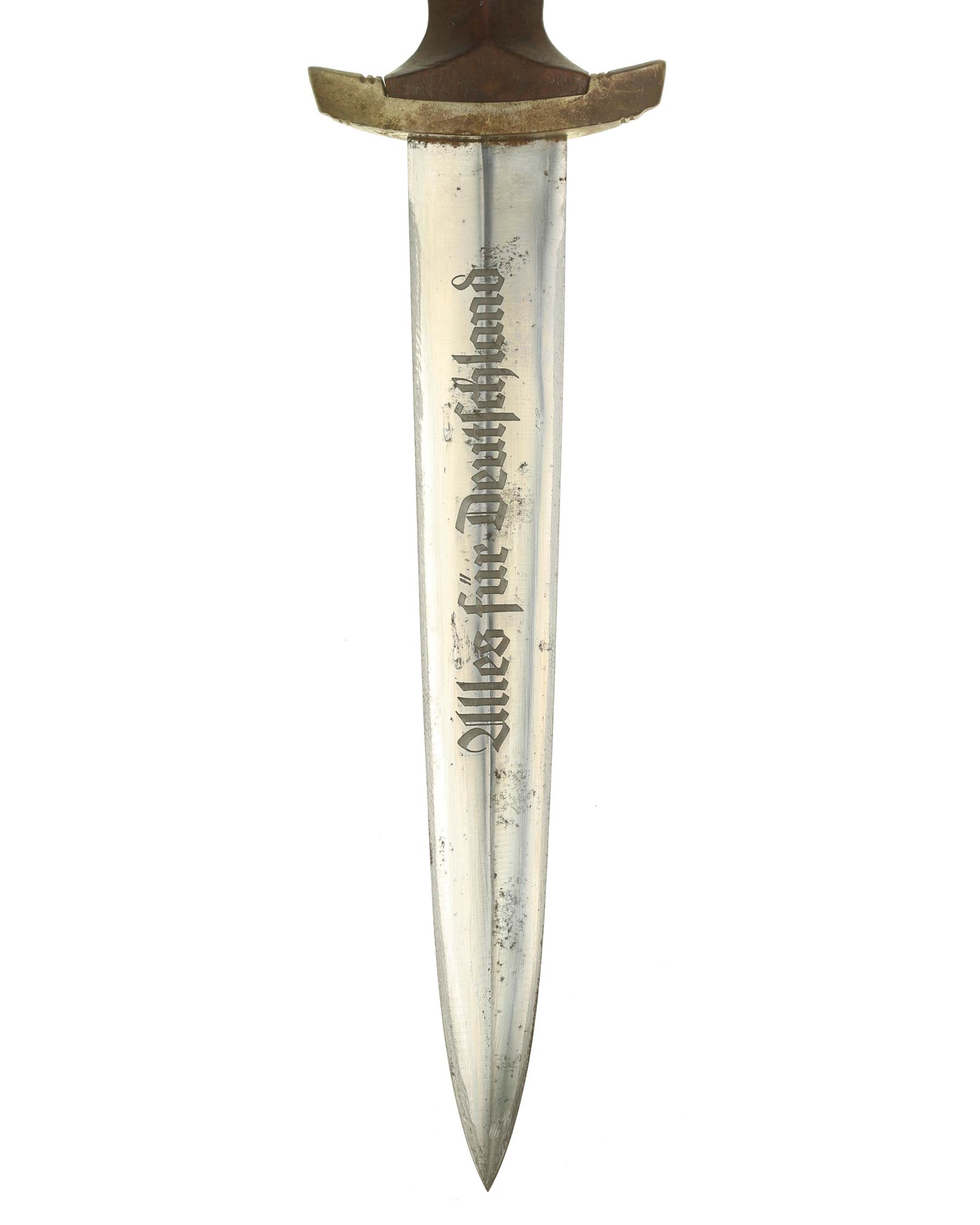 Клинок: Клинок кинжала прямой, стальной, двулезвийный, кинжального типа, с выраженным центральным ребром. На одной стороне клинка методом травления нанесен девиз СА «Всё для Германии» (Alles für Deutchland). Клинок на оборотной стороне у основания стоит клеймо производителя Friedrich Dick Esslingen (Дик Фридрих Есслинген).