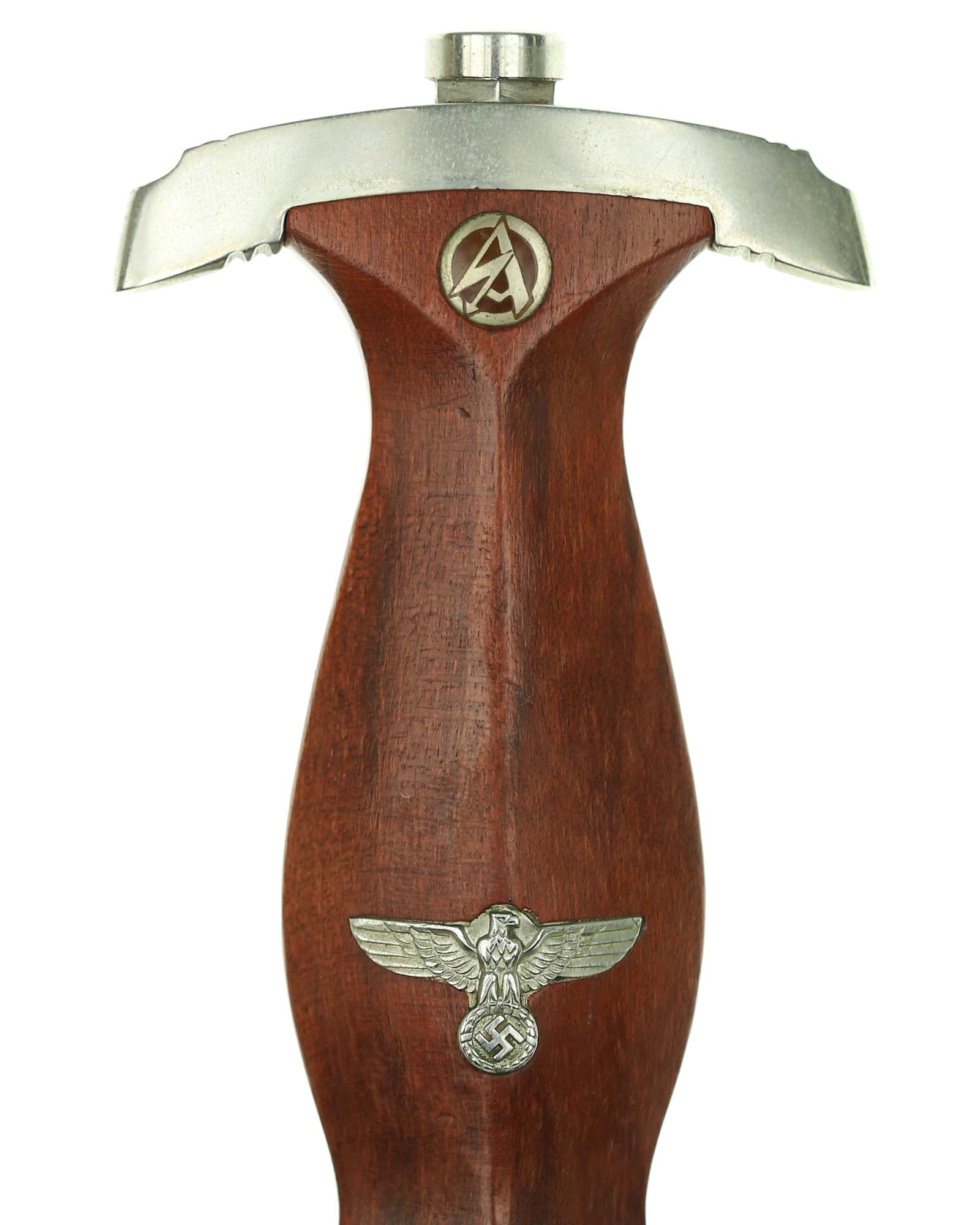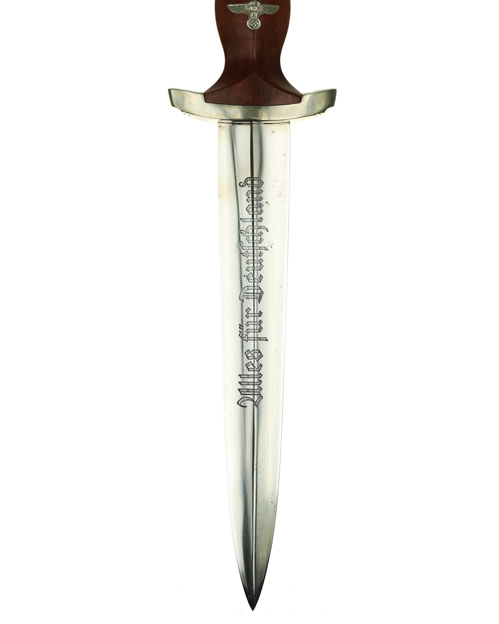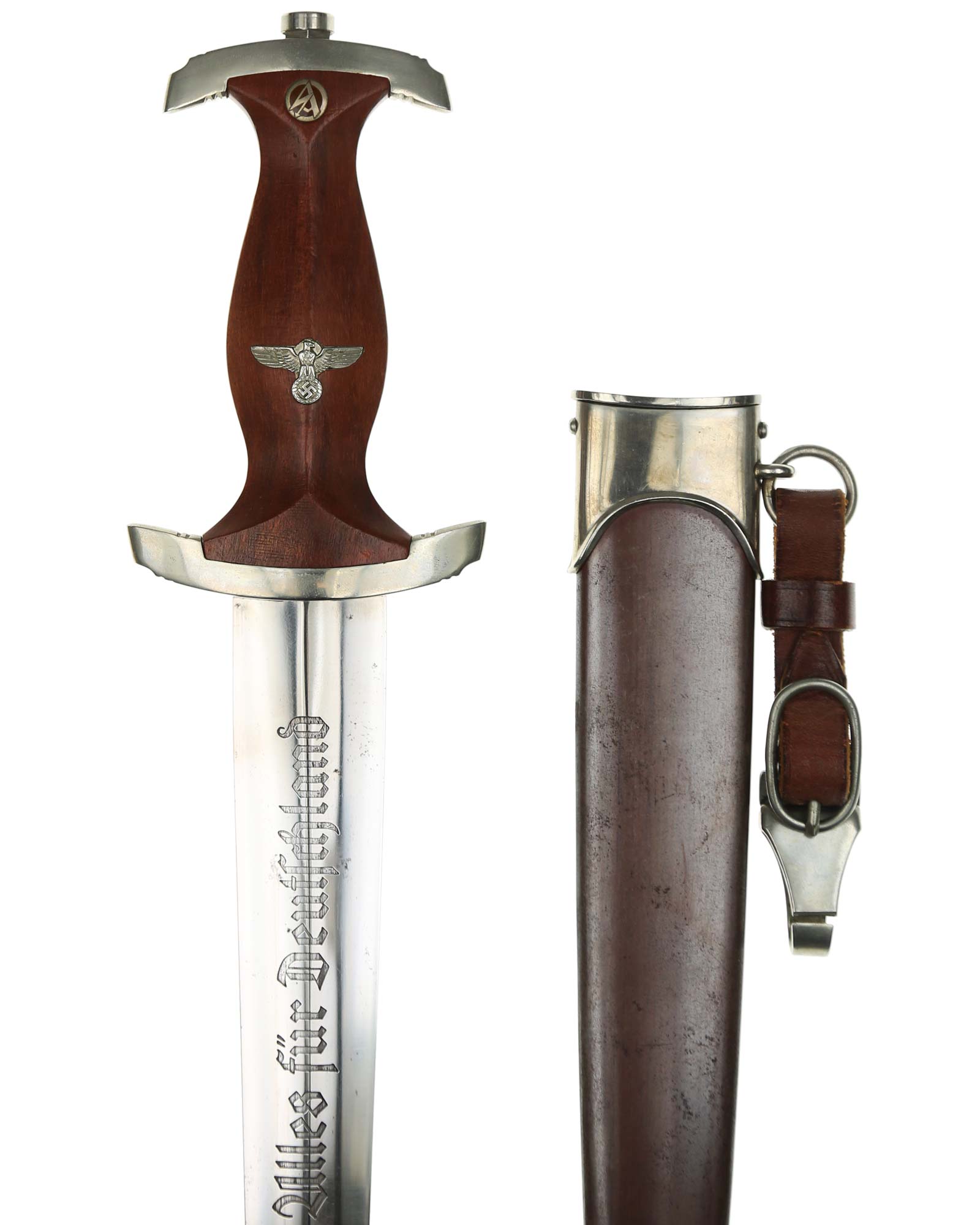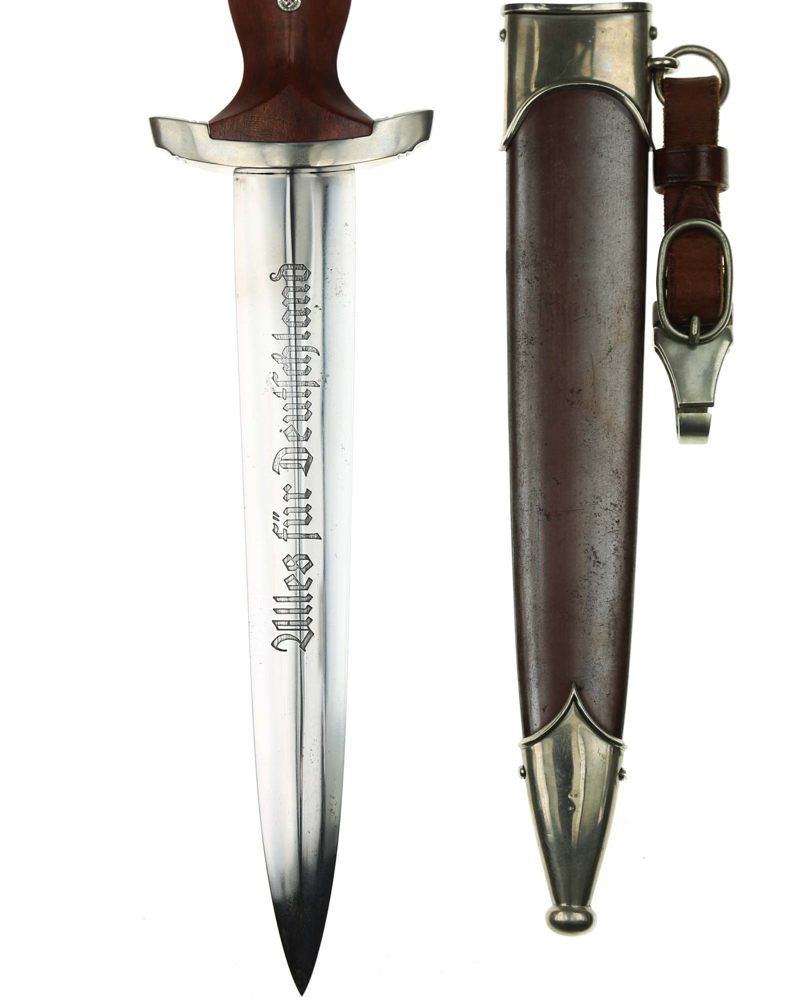 Клинок: Клинок кинжала прямой, стальной, двулезвийный, кинжального типа, с выраженным центральным ребром. На одной стороне клинка методом травления нанесен девиз СА «Всё для Германии» (Alles für Deutschland). Клинок на оборотной стороне у основания стоит клеймо производителя Братья Хеллер Шмалькальден (Geb. Heller Schmalkalden).