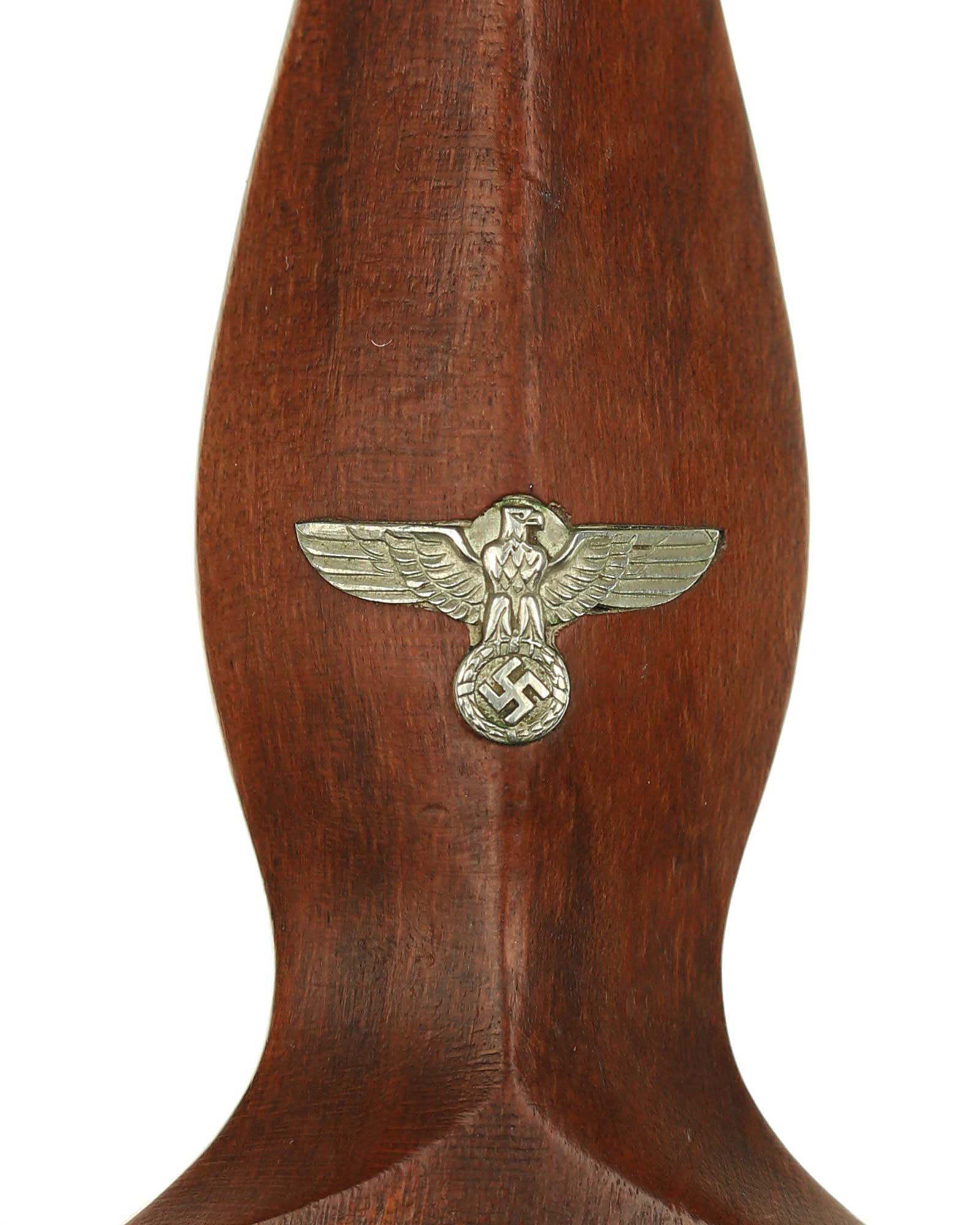 Рукоять: Рукоять из мореного в коричневый цвет дерева. Рукоять в верхней части имеет вставку в виде эмалевого глазка, в средней части – вставка в виде орла. Металлические элементы гарды изготовлены из мельхиора. Хвостовик клинка укреплен на верхней крестовине при помощи винта.