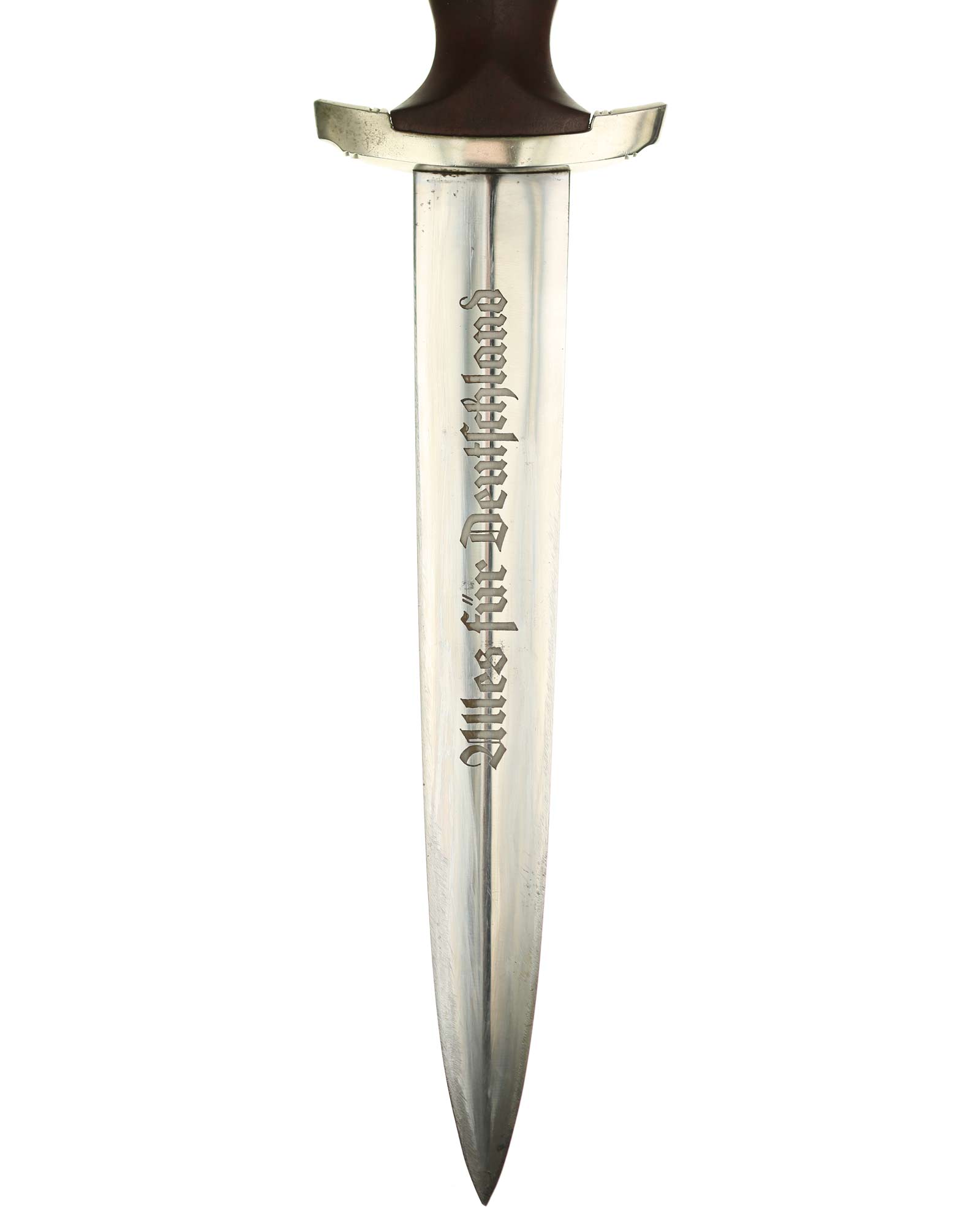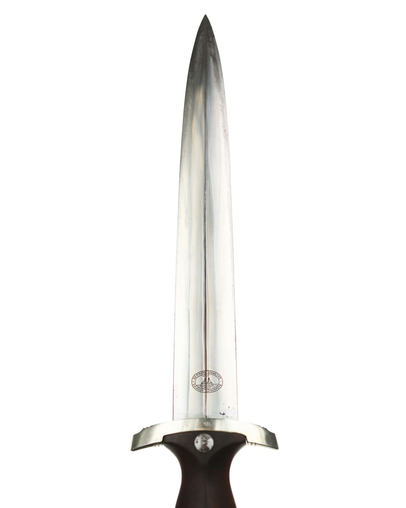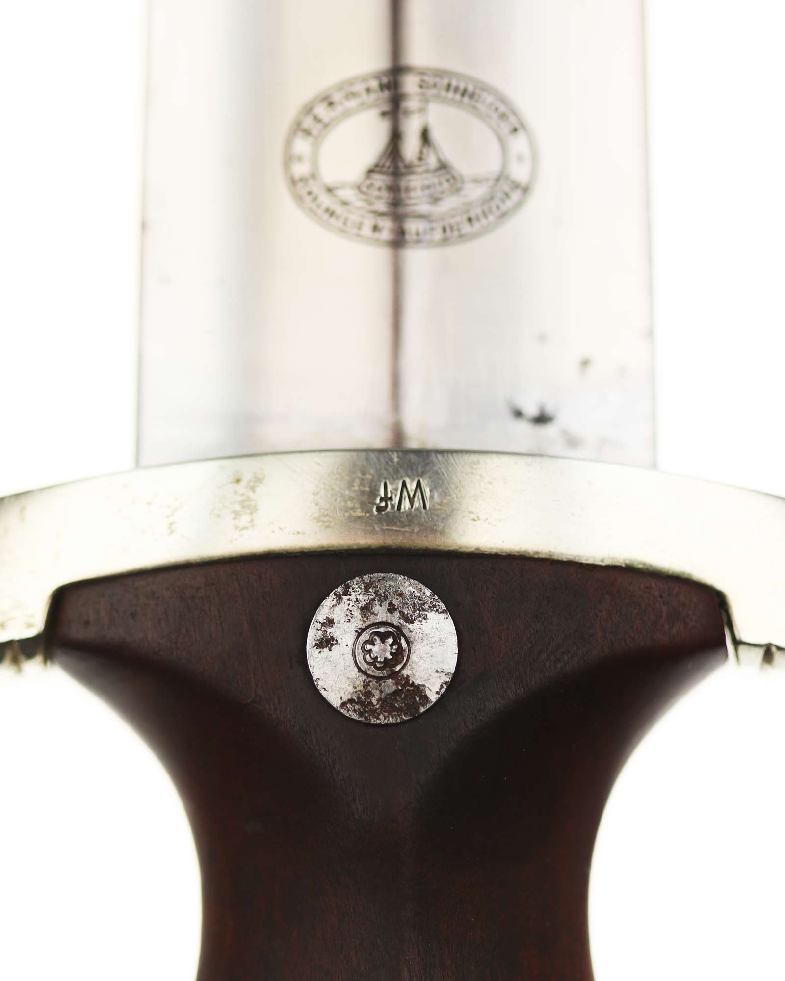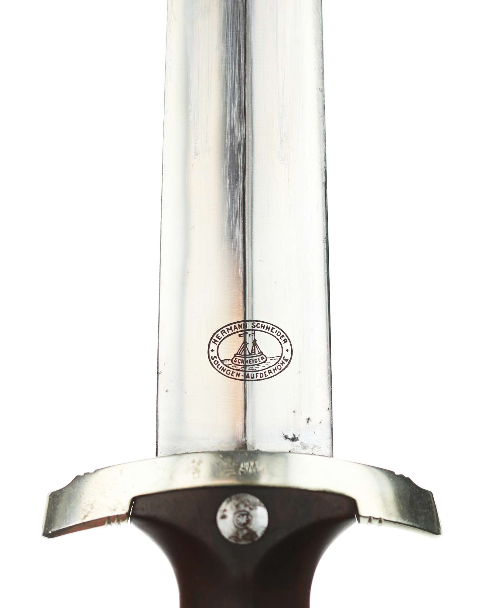 Клинок: Клинок кинжала прямой, стальной, двулезвийный, кинжального типа, с выраженным центральным ребром. На одной стороне клинка методом травления нанесен девиз СА «Всё для Германии» (Alles für Deutchland). Клинок на оборотной стороне у основания стоит клеймо производителя Герман Шнайдер Золинген (Hermann Schneider Solingen).