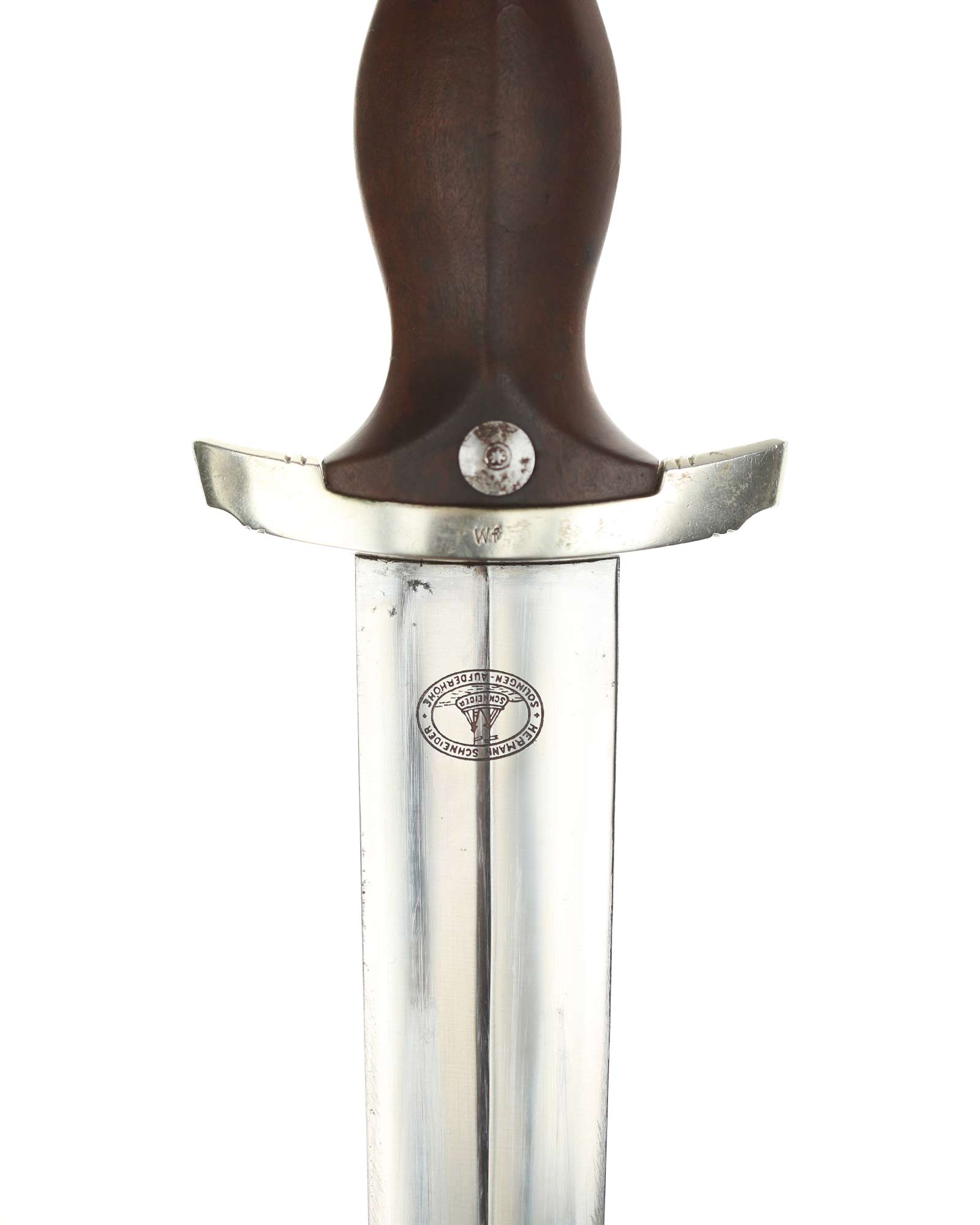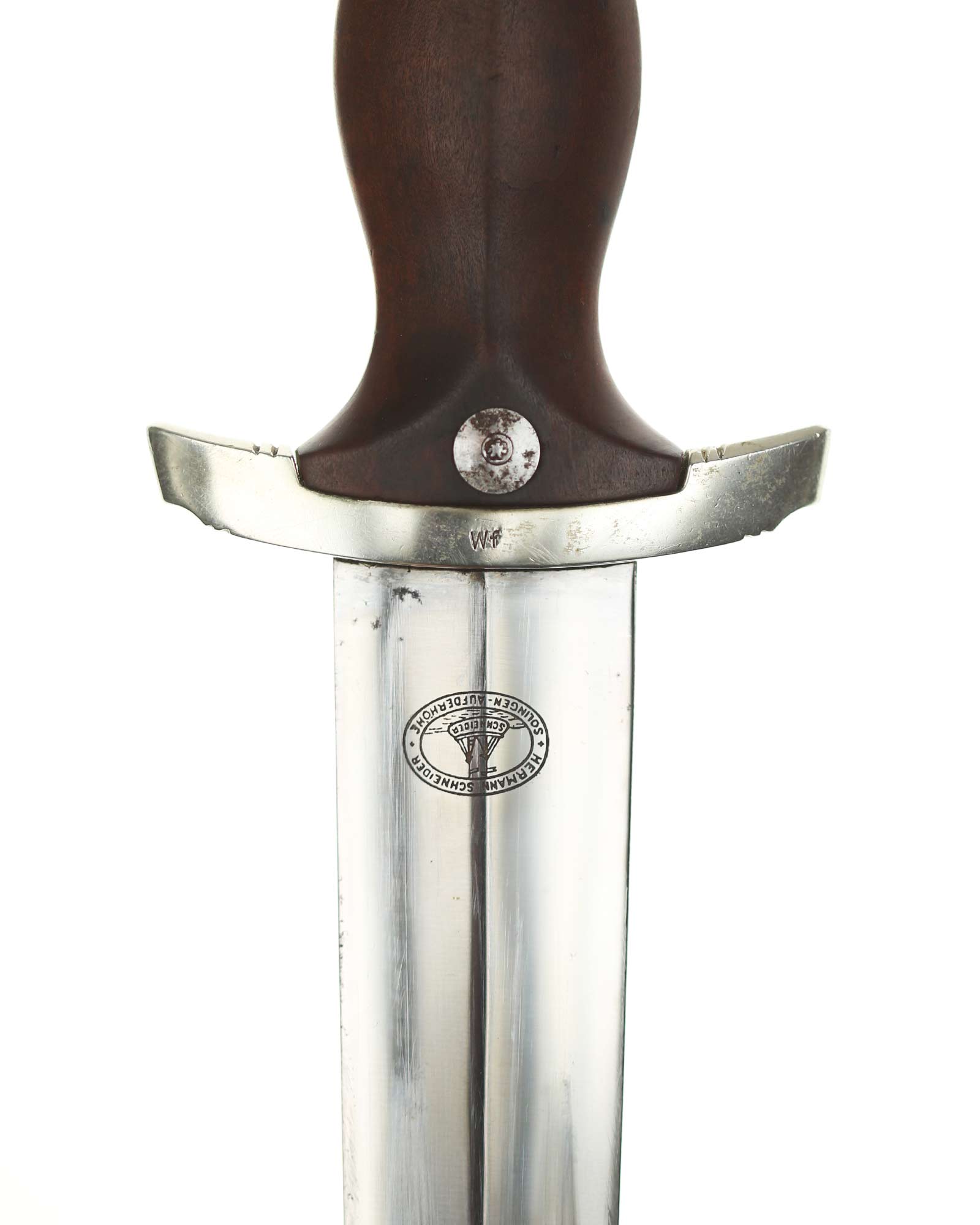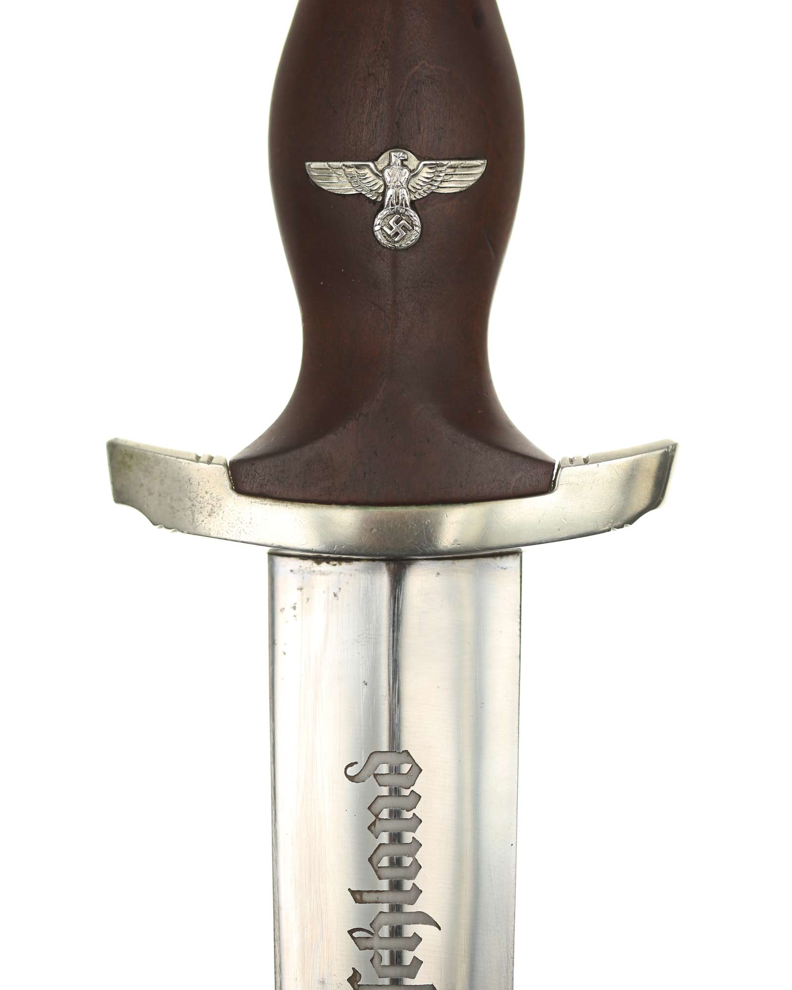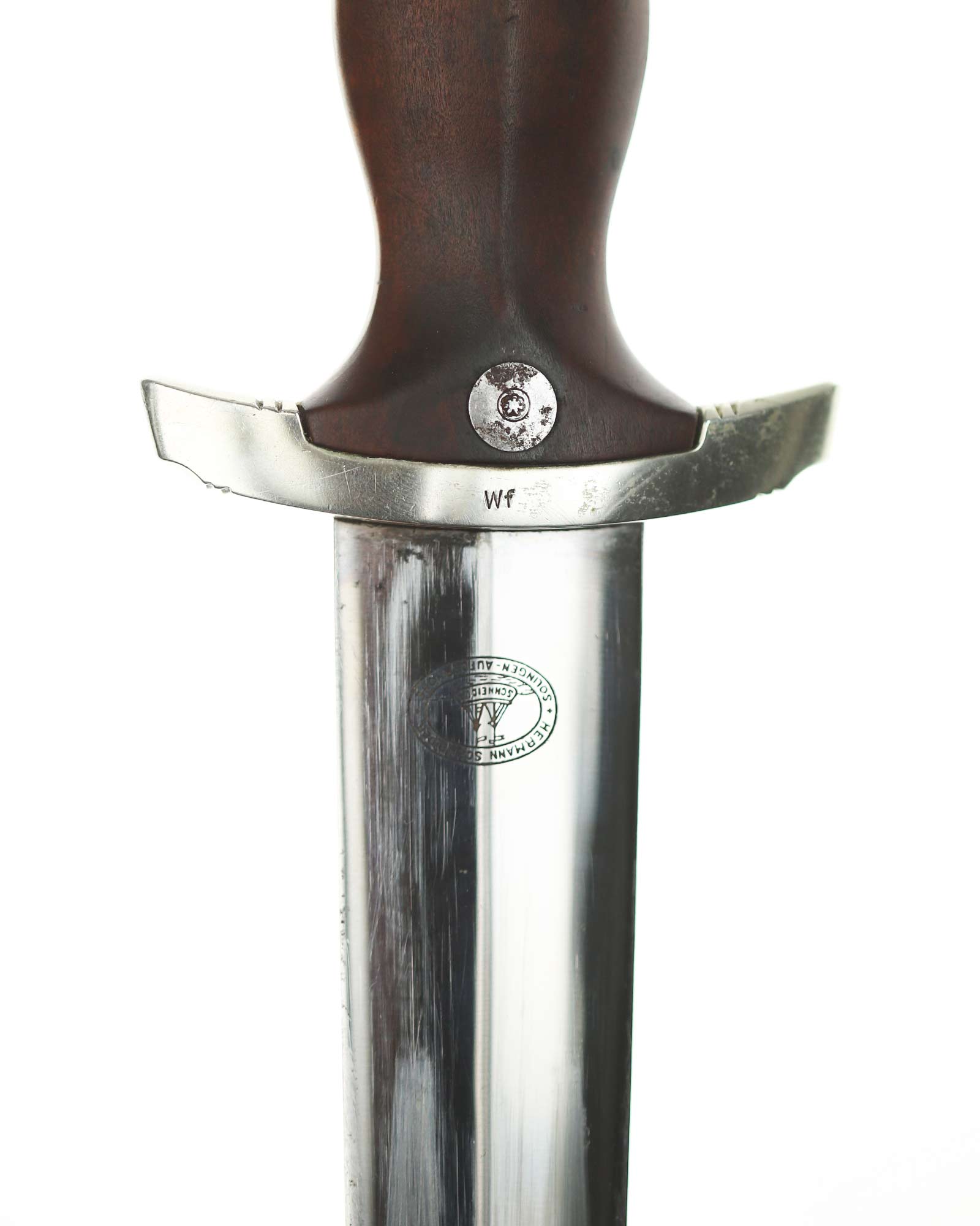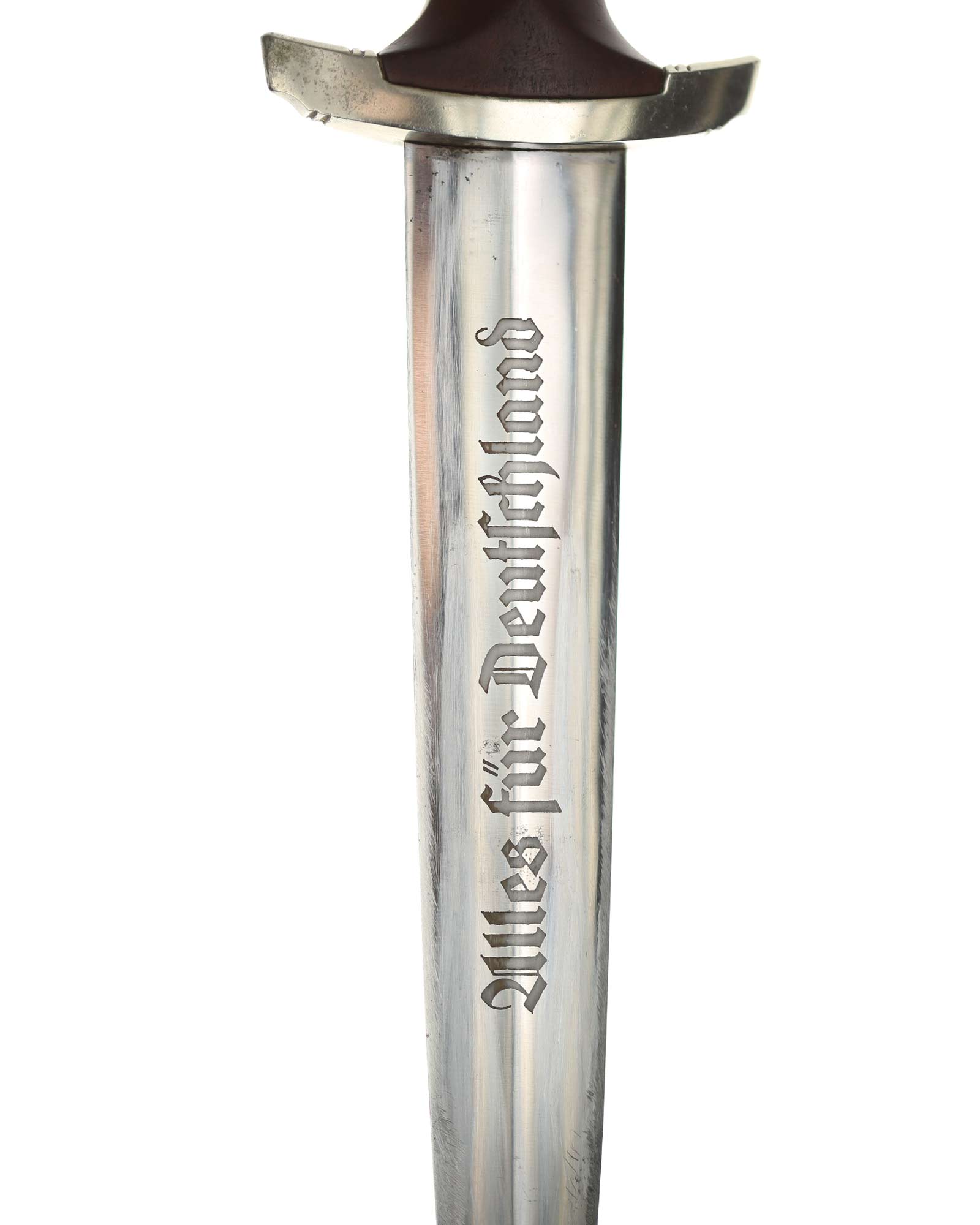 Клинок: Клинок кинжала прямой, стальной, двулезвийный, кинжального типа, с выраженным центральным ребром. На одной стороне клинка методом травления нанесен девиз СА «Всё для Германии» (Alles für Deutchland). Клинок на оборотной стороне у основания стоит клеймо производителя Герман Шнайдер Золинген (Hermann Schneider Solingen).