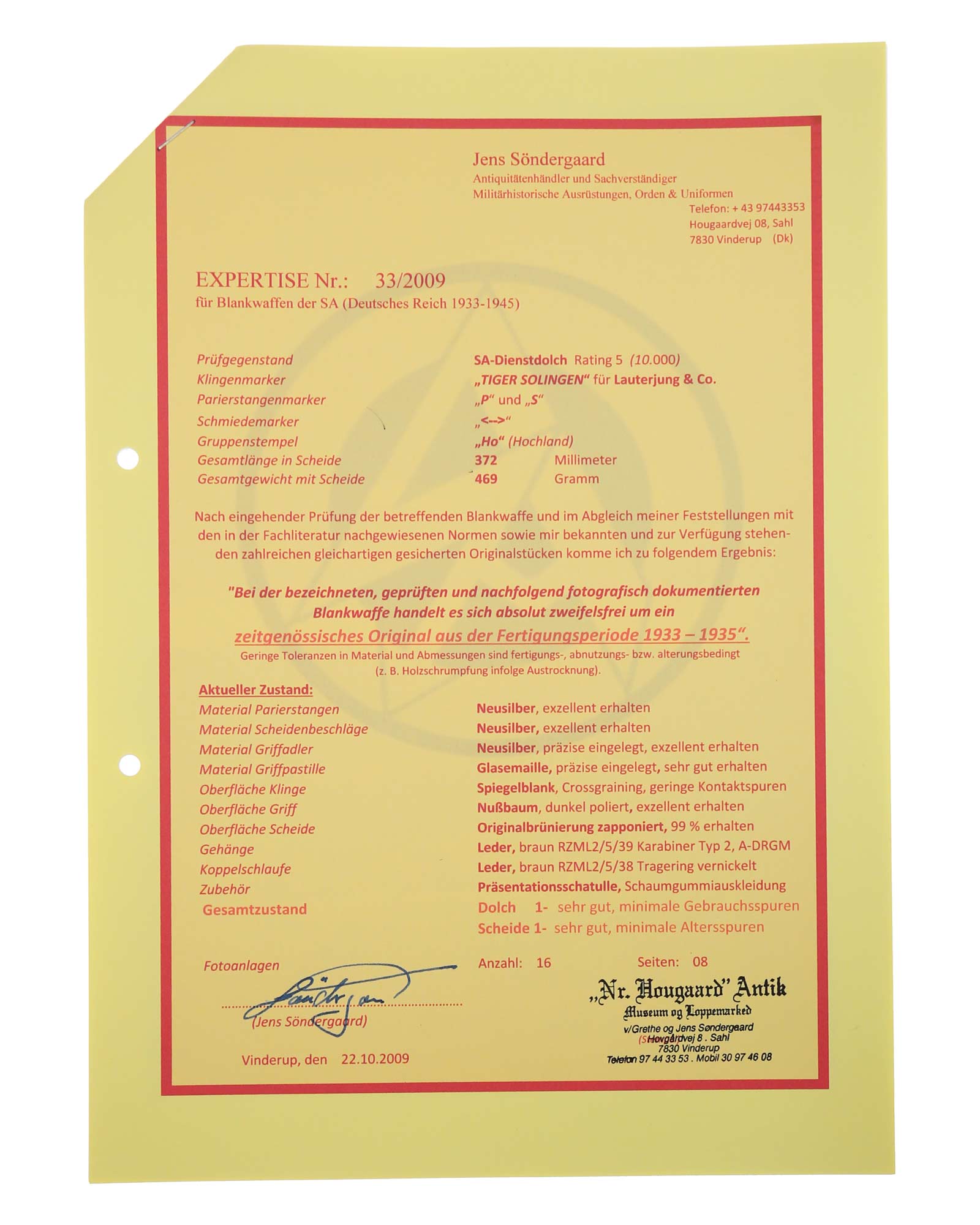 Ранний кинжал штурмовых отрядов СА образца 1933 года. Ранний период производства, 1933-1935 годы. Производитель фирма ТИГЕР Золинген. Длина в ножнах 37,2 см.