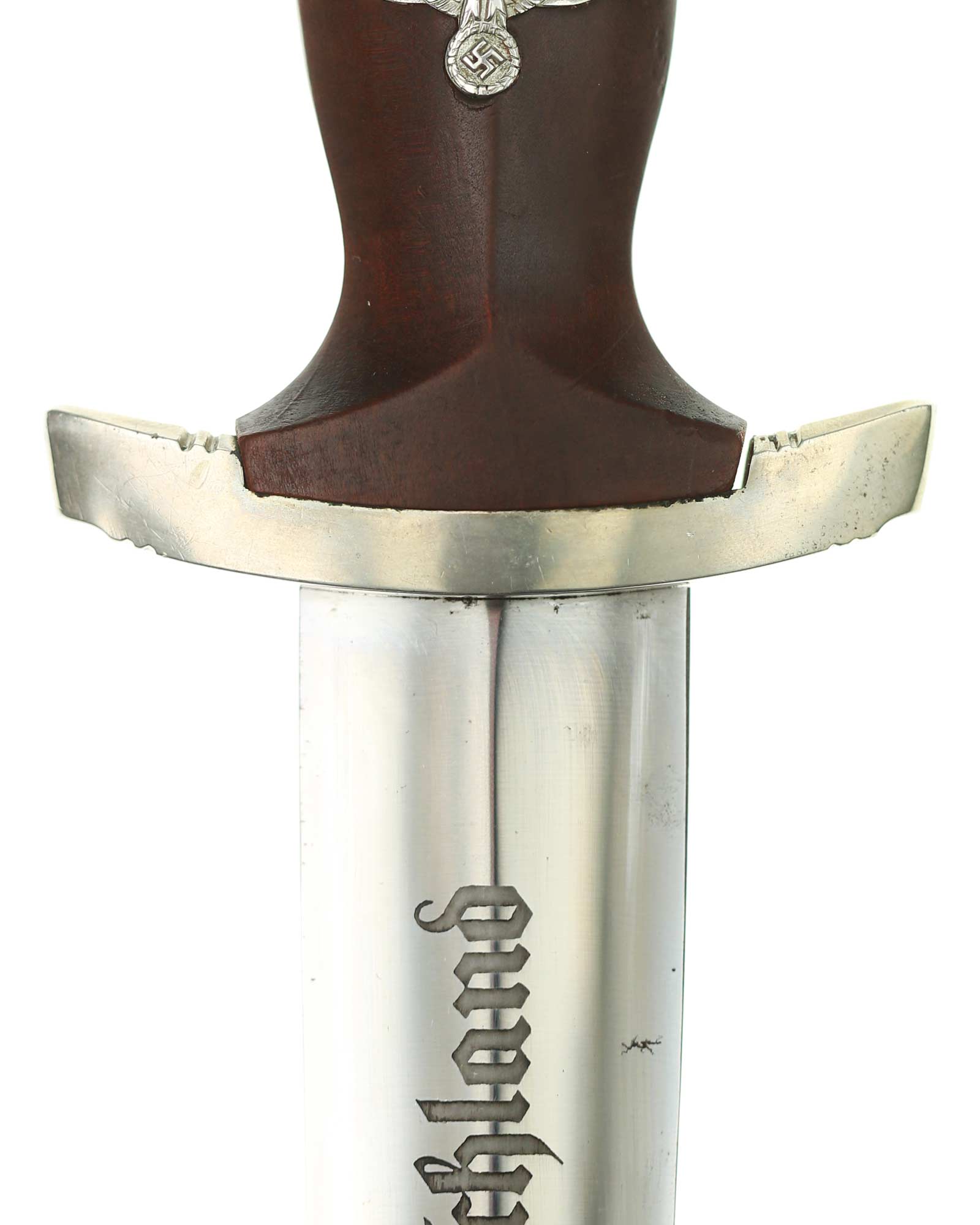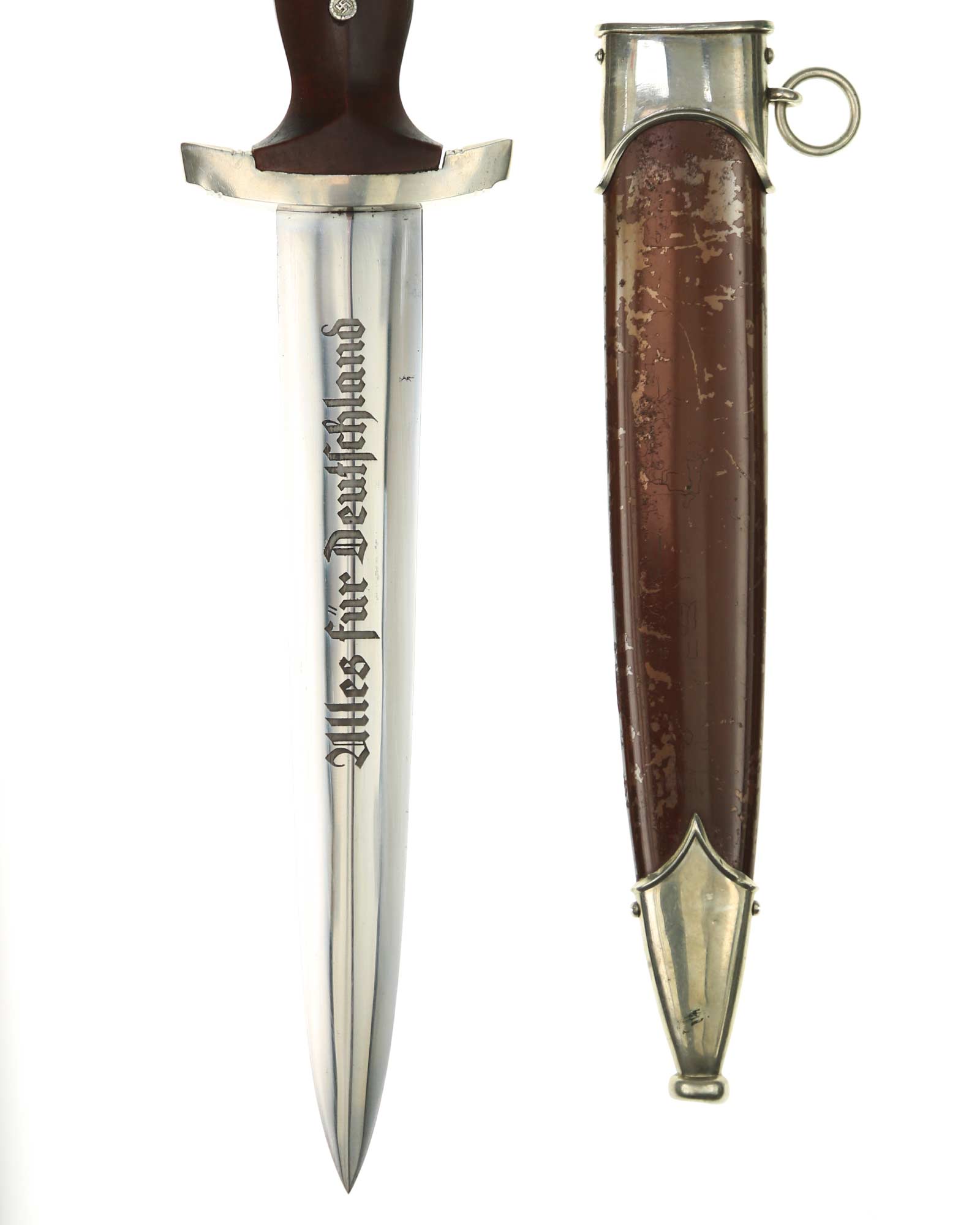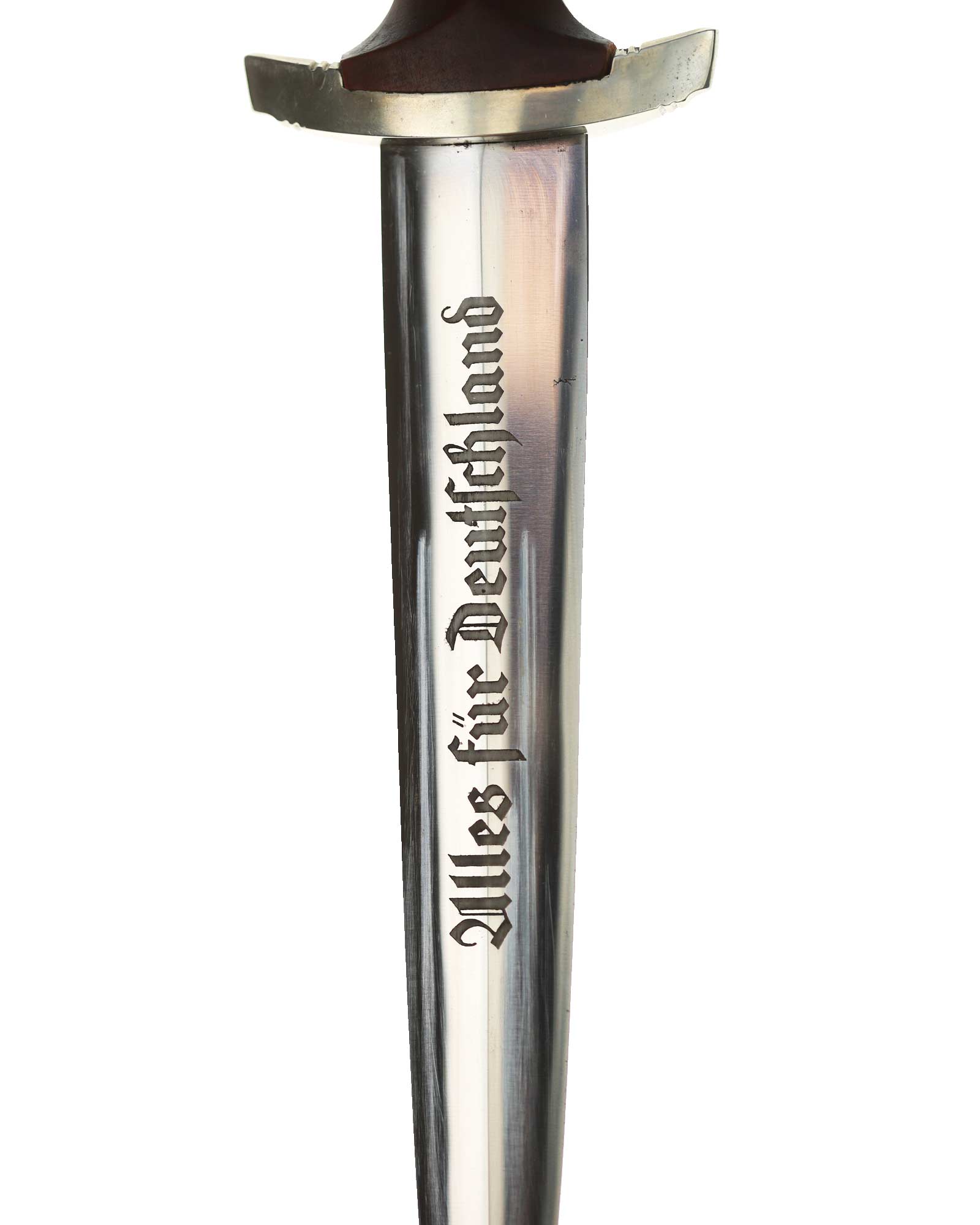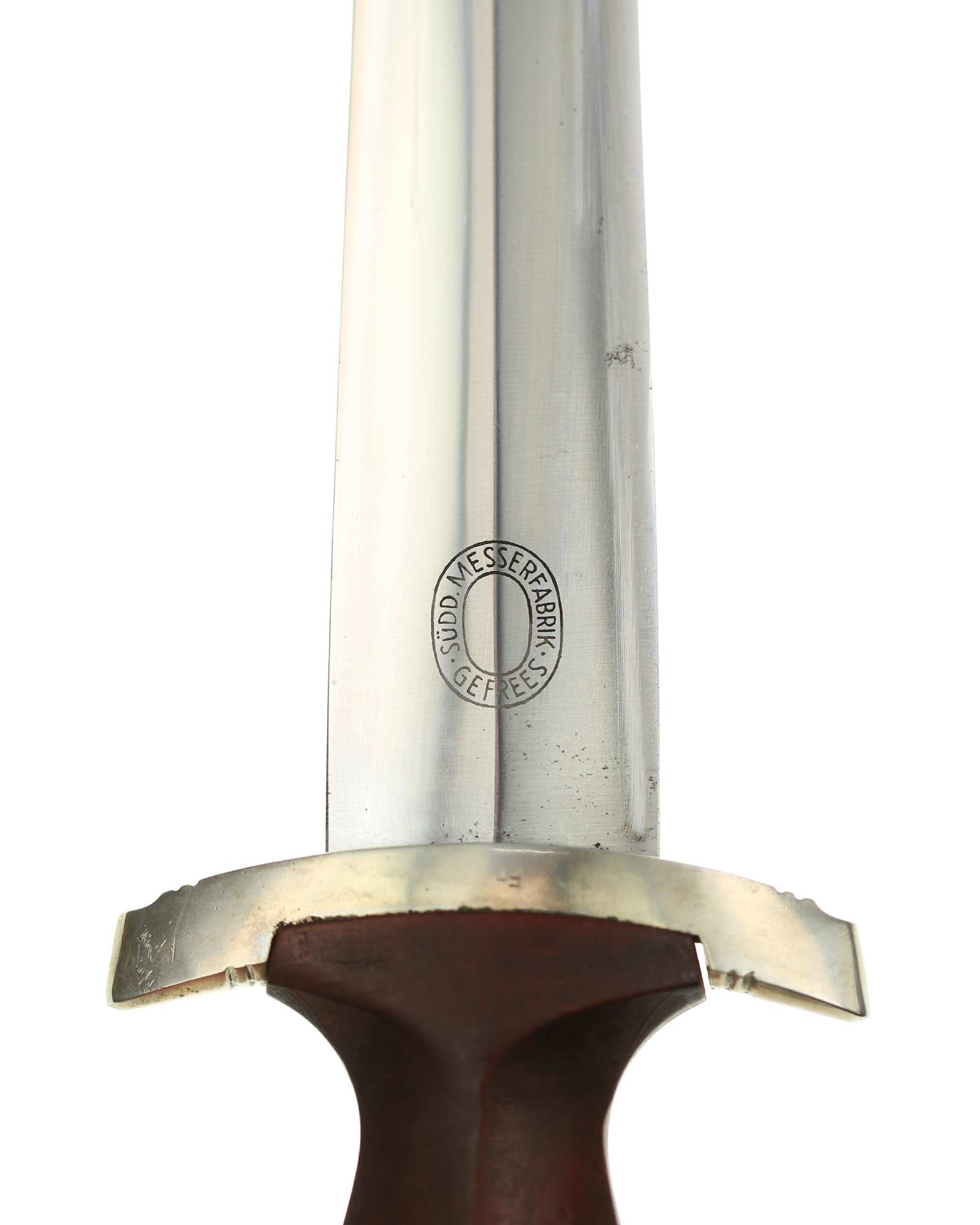 Клинок: Клинок кинжала прямой, стальной, двулезвийный, кинжального типа, с выраженным центральным ребром. На одной стороне клинка методом травления нанесен девиз СА «Всё для Германии» (Alles für Deutchland). Клинок на оборотной стороне у основания стоит клеймо производителя Южно-немецкий завод клинков Гефреес (Daniel Peres Solingen).
