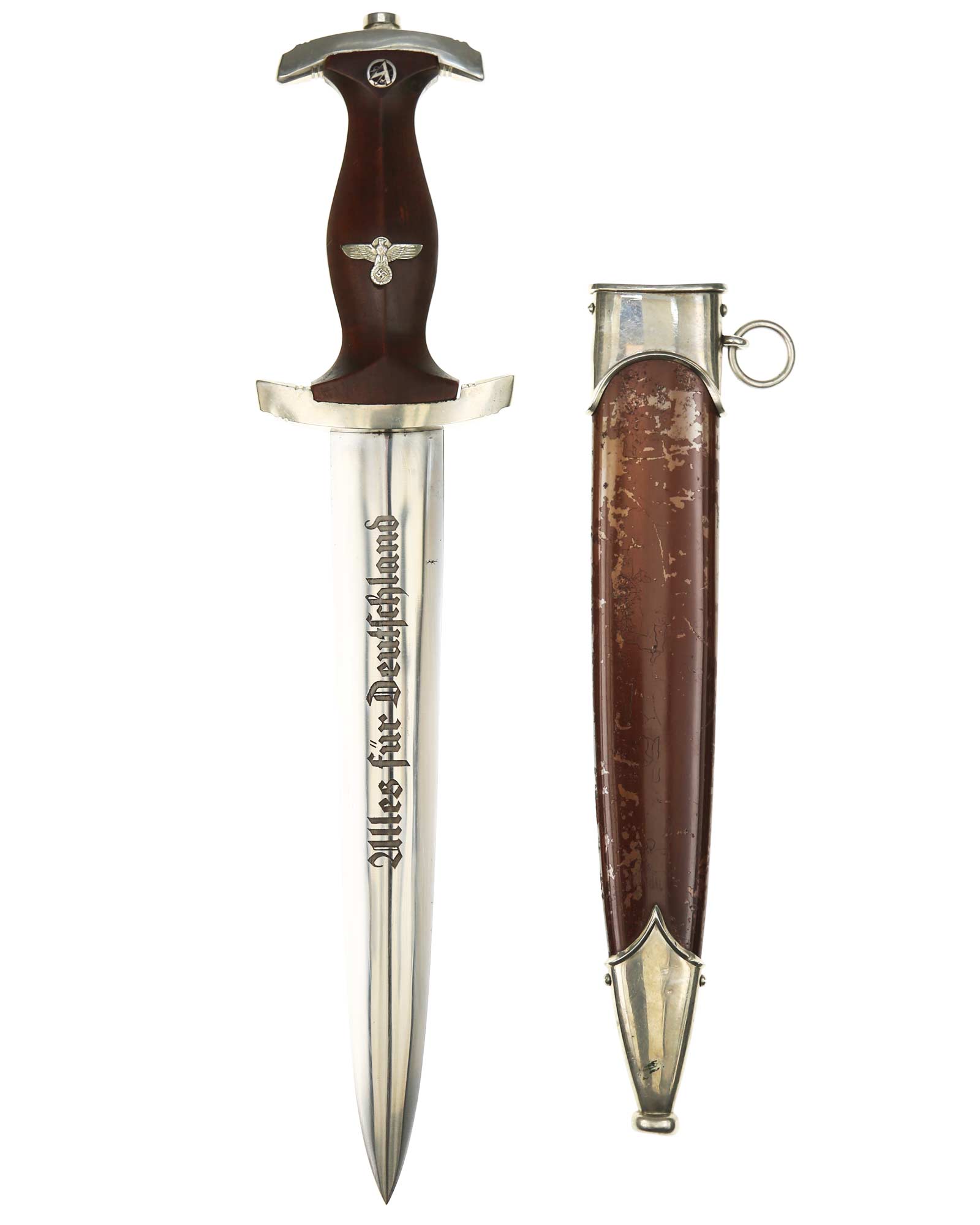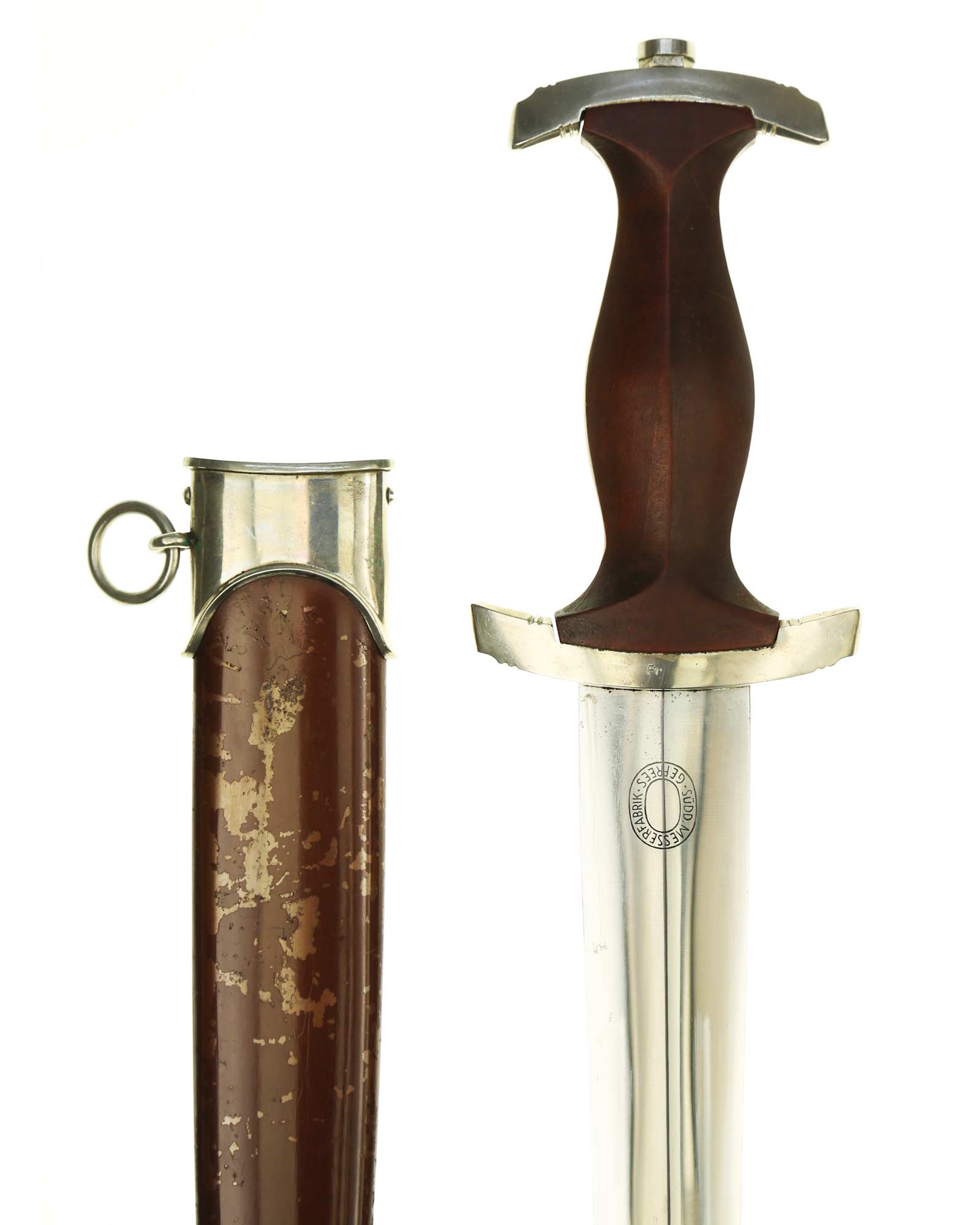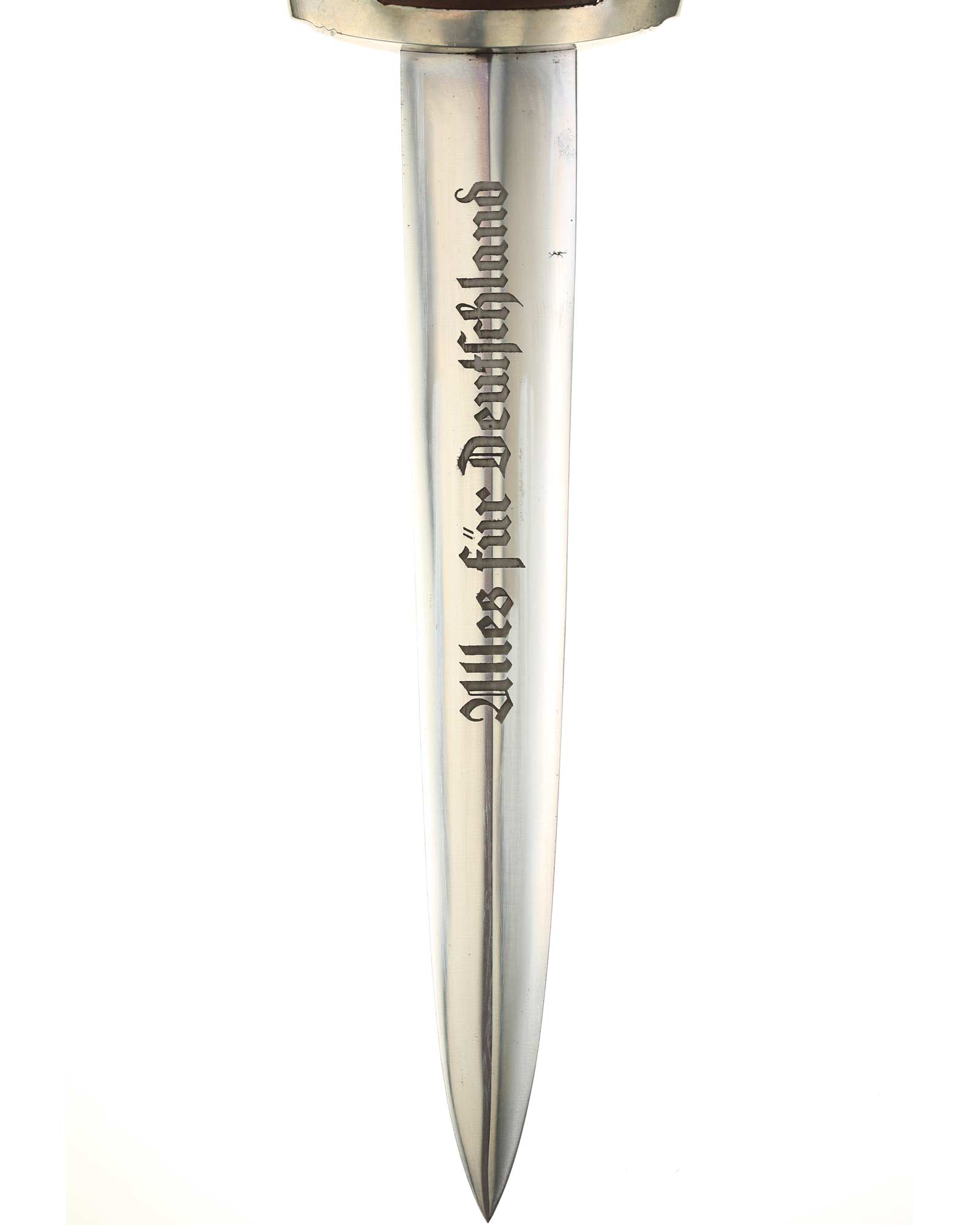 Клинок: Клинок кинжала прямой, стальной, двулезвийный, кинжального типа, с выраженным центральным ребром. На одной стороне клинка методом травления нанесен девиз СА «Всё для Германии» (Alles für Deutchland). Клинок на оборотной стороне у основания стоит клеймо производителя Южно-немецкий завод клинков Гефреес (Daniel Peres Solingen).