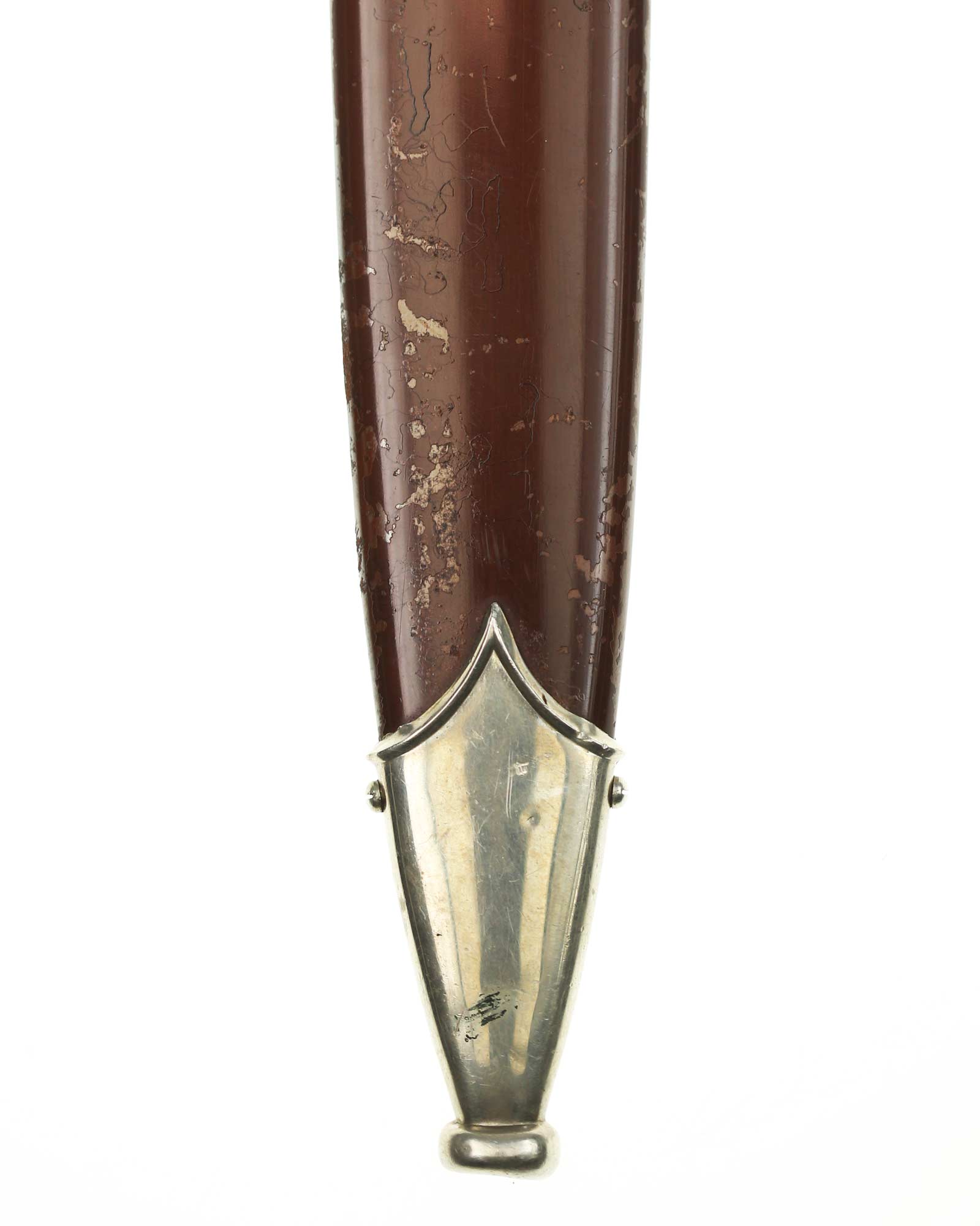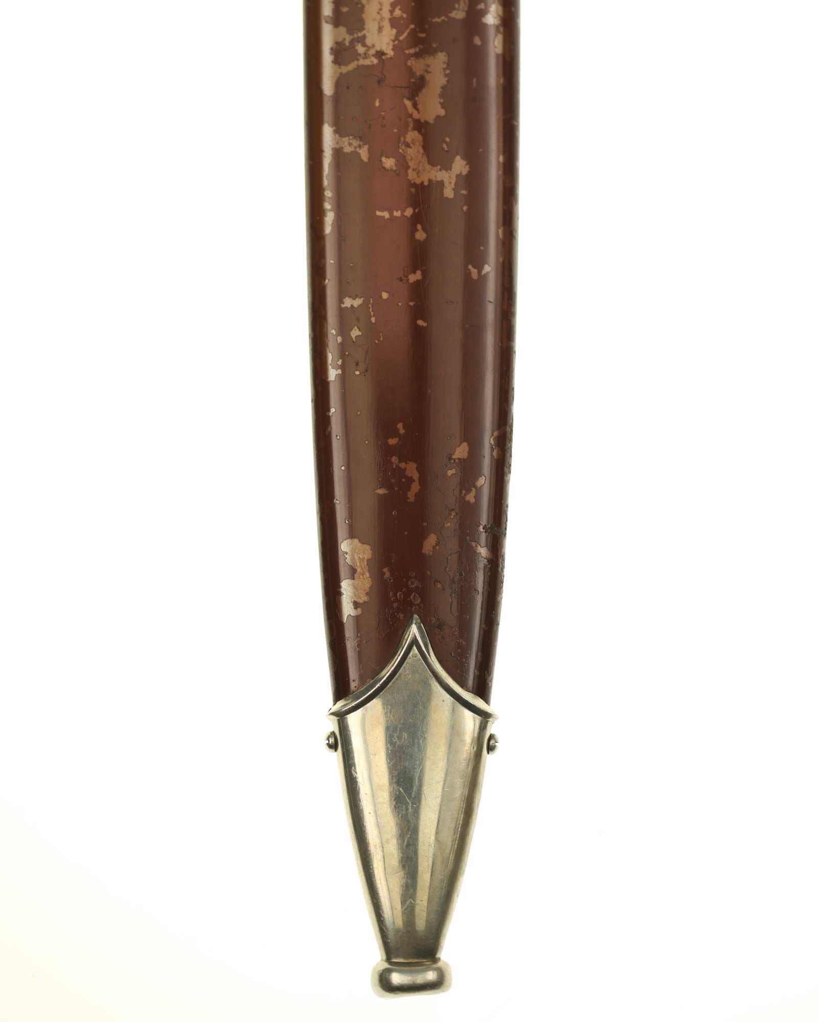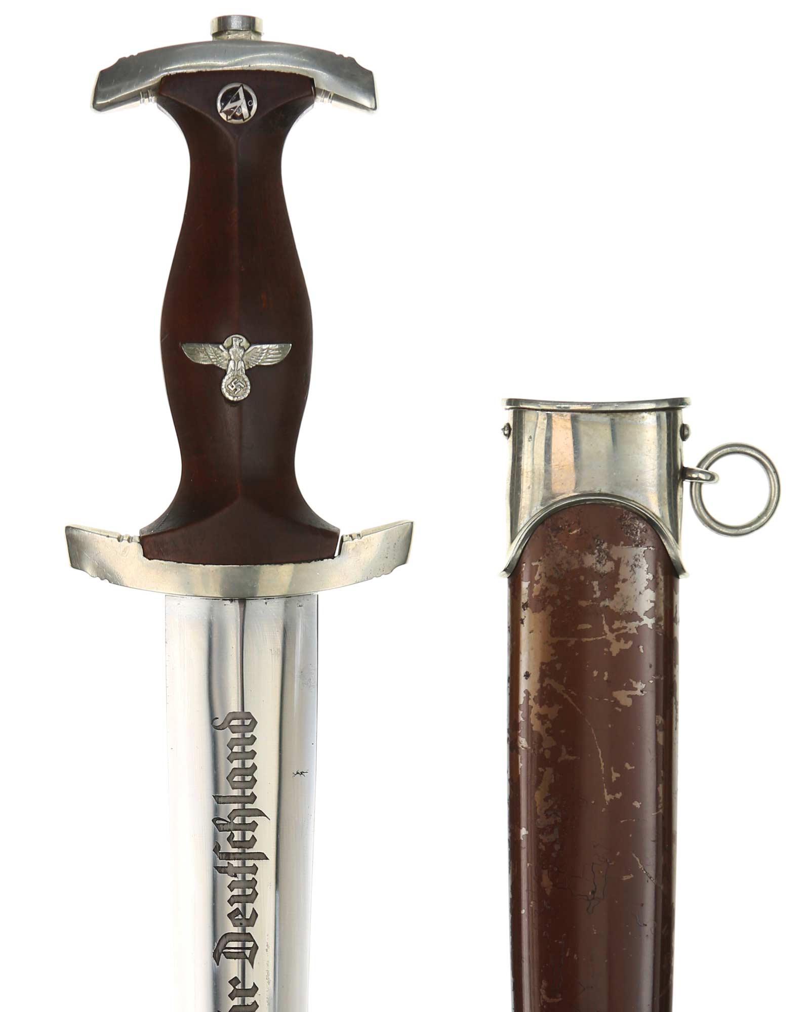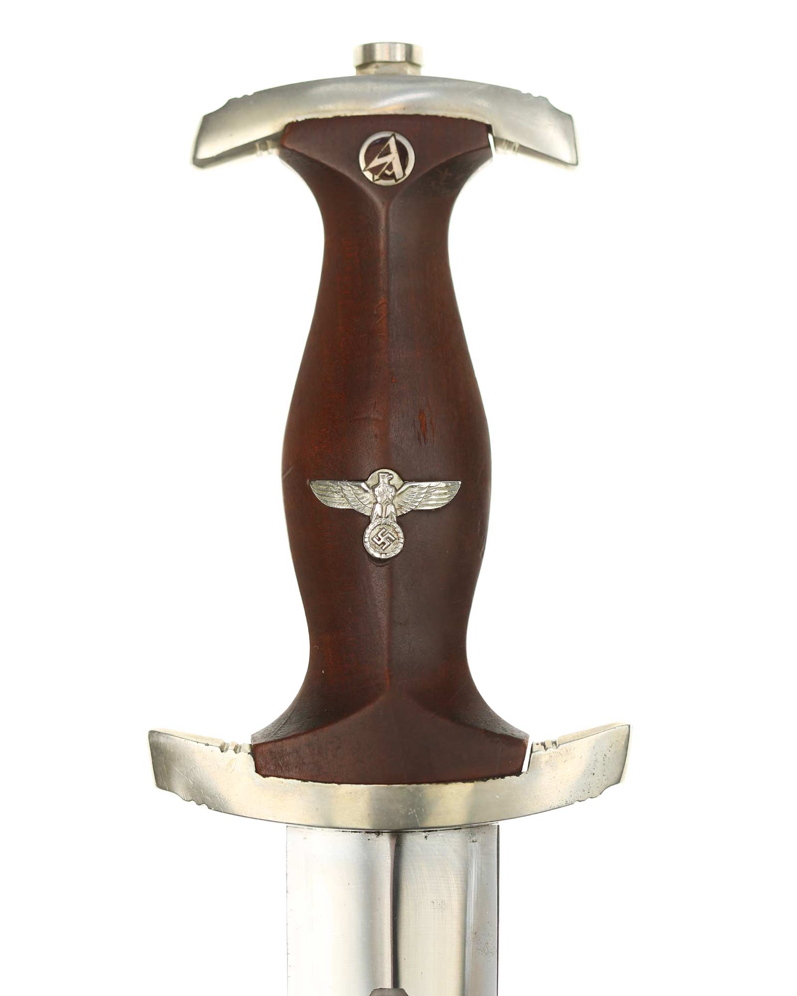 Клинок: Клинок кинжала прямой, стальной, двулезвийный, кинжального типа, с выраженным центральным ребром. На одной стороне клинка методом травления нанесен девиз СА «Всё для Германии» (Alles für Deutchland). Клинок на оборотной стороне у основания стоит клеймо производителя Южно-немецкий завод клинков Гефреес (Daniel Peres Solingen).