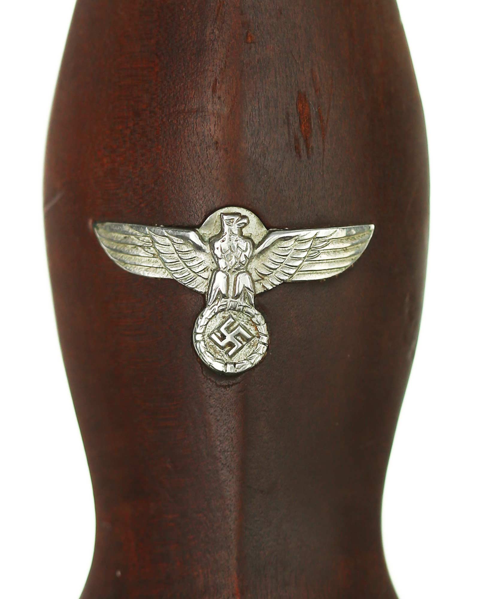 Рукоять: Рукоять из мореного в коричневый цвет дерева. Рукоять в верхней части имеет вставку в виде эмалевого глазка, в средней части – вставка в виде орла. Металлические элементы гарды изготовлены из мельхиора («Fr» Франкония). Хвостовик клинка укреплен на верхней крестовине при помощи винта.
