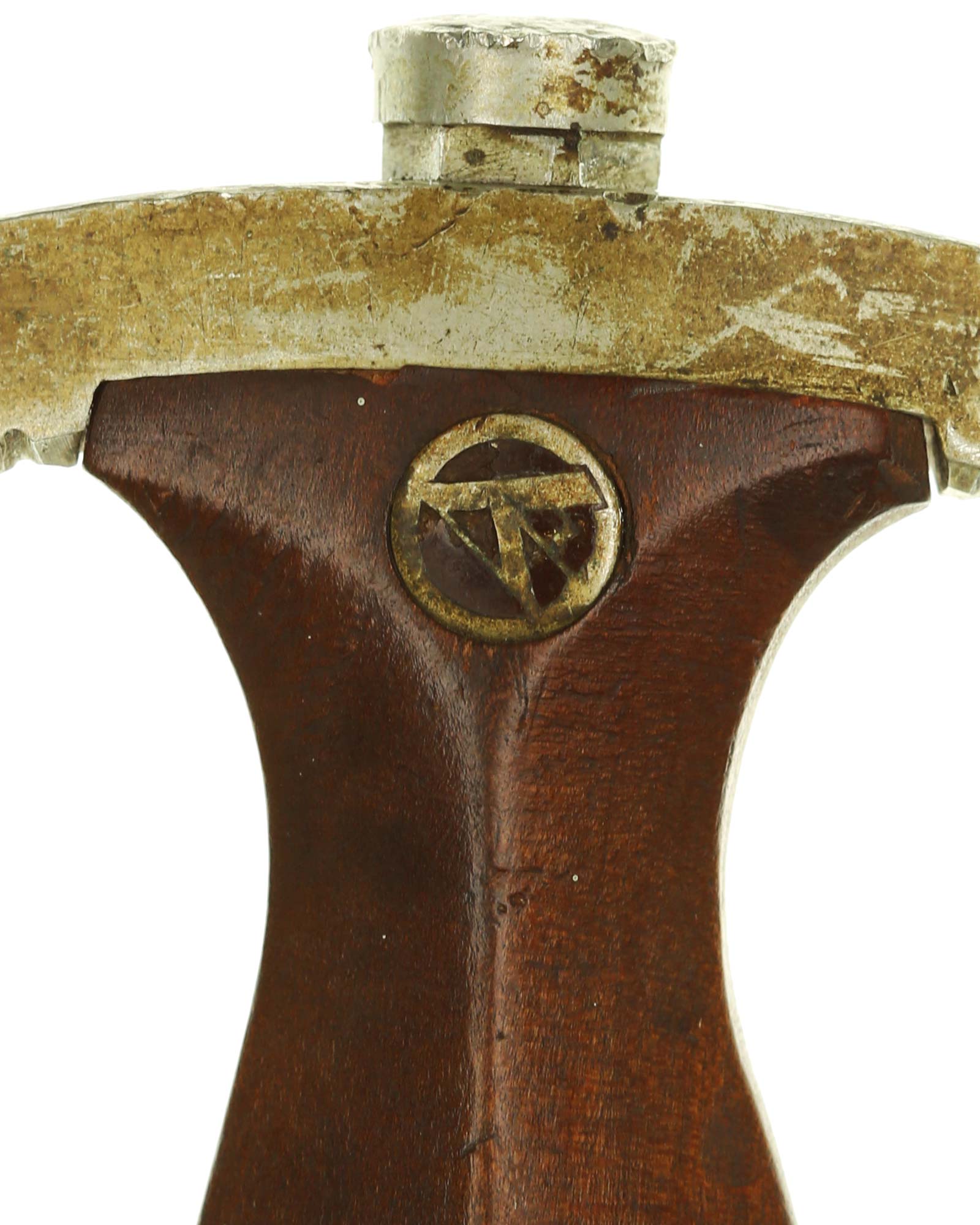 Рукоять: Рукоять из мореного в коричневый цвет дерева. Рукоять в верхней части имеет вставку в виде эмалевого глазка, в средней части – вставка в виде орла. Металлические элементы гарды изготовлены из мельхиора. Хвостовик клинка укреплен на верхней крестовине при помощи винта.