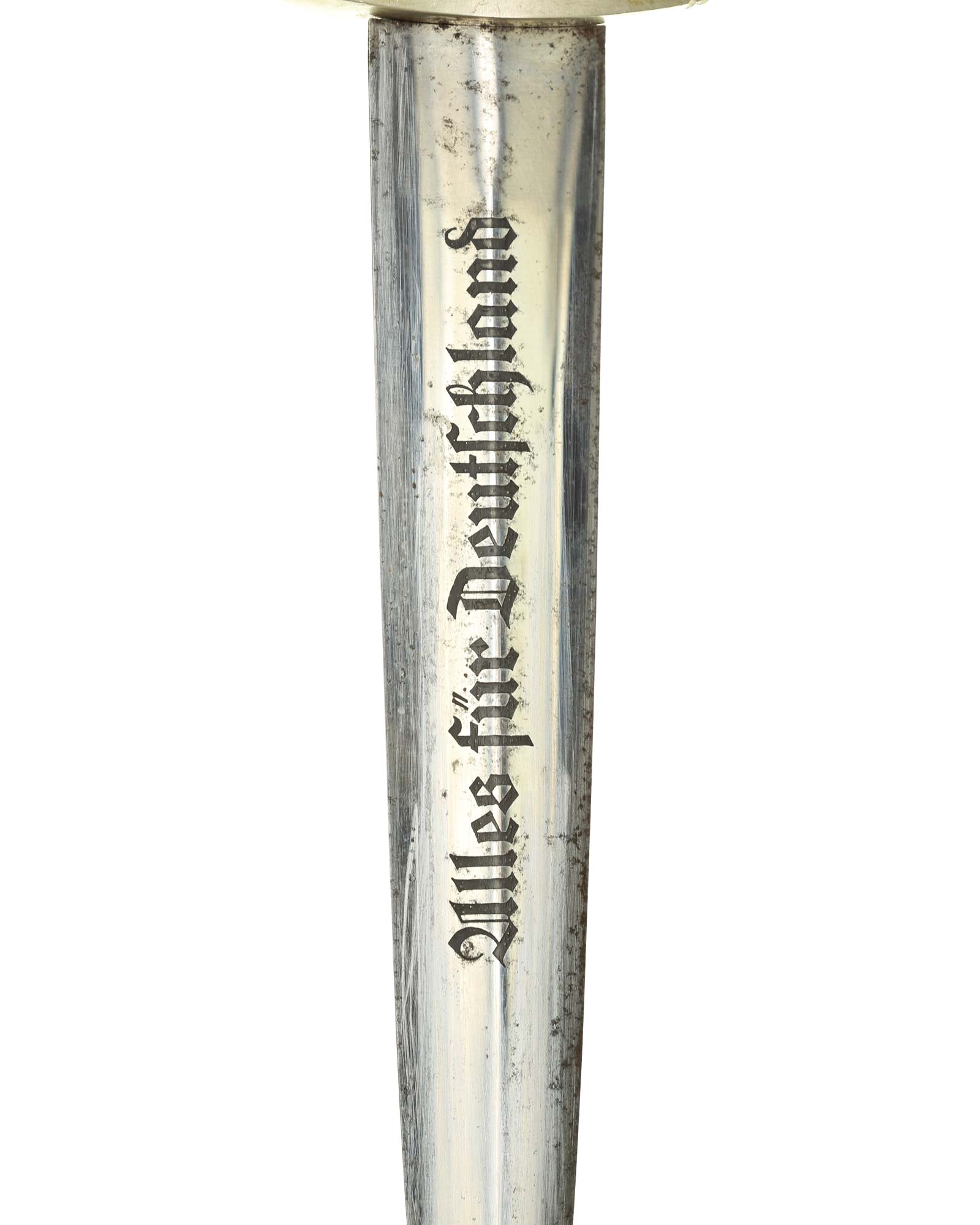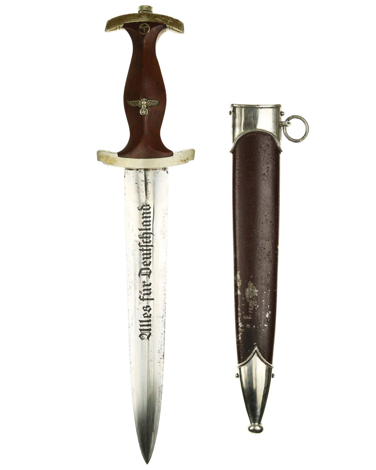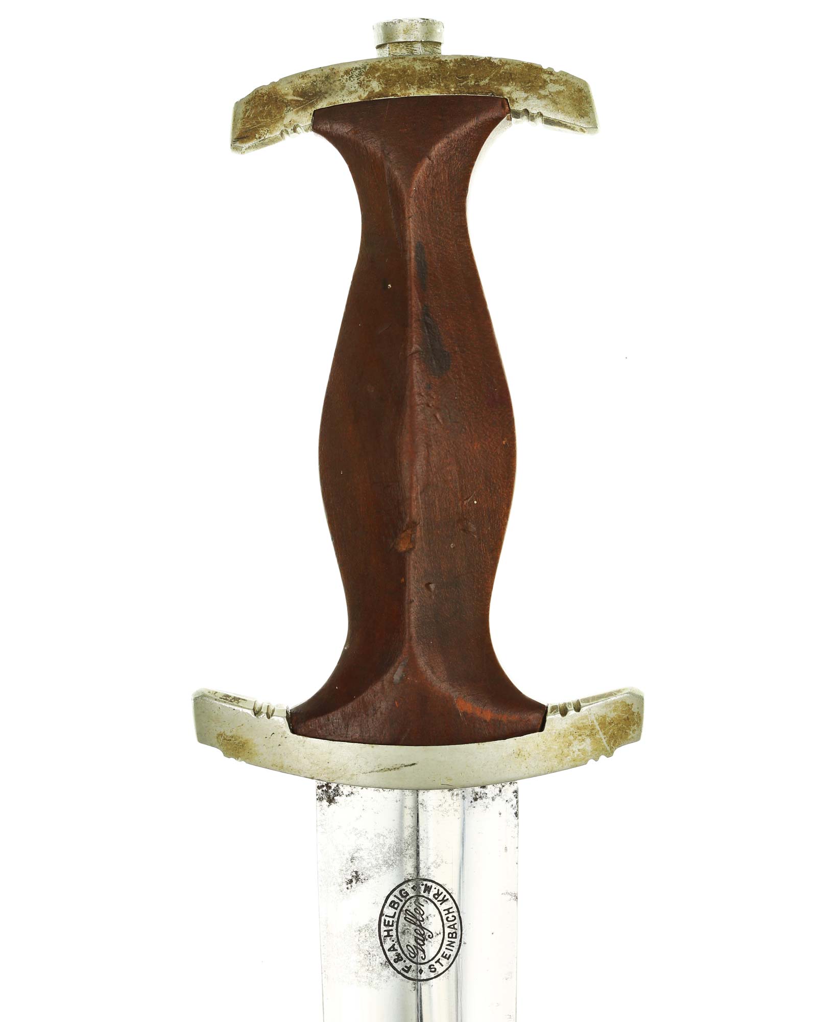 Клинок: Клинок кинжала прямой, стальной, двулезвийный, кинжального типа, с выраженным центральным ребром. На одной стороне клинка методом травления нанесен девиз СА «Всё для Германии» (Alles für Deutchland). Клинок на оборотной стороне у основания стоит клеймо производителя F.&A. Helbig GAEFLER Steinbach(Ф. и А. Хельбиг Штайнбах).