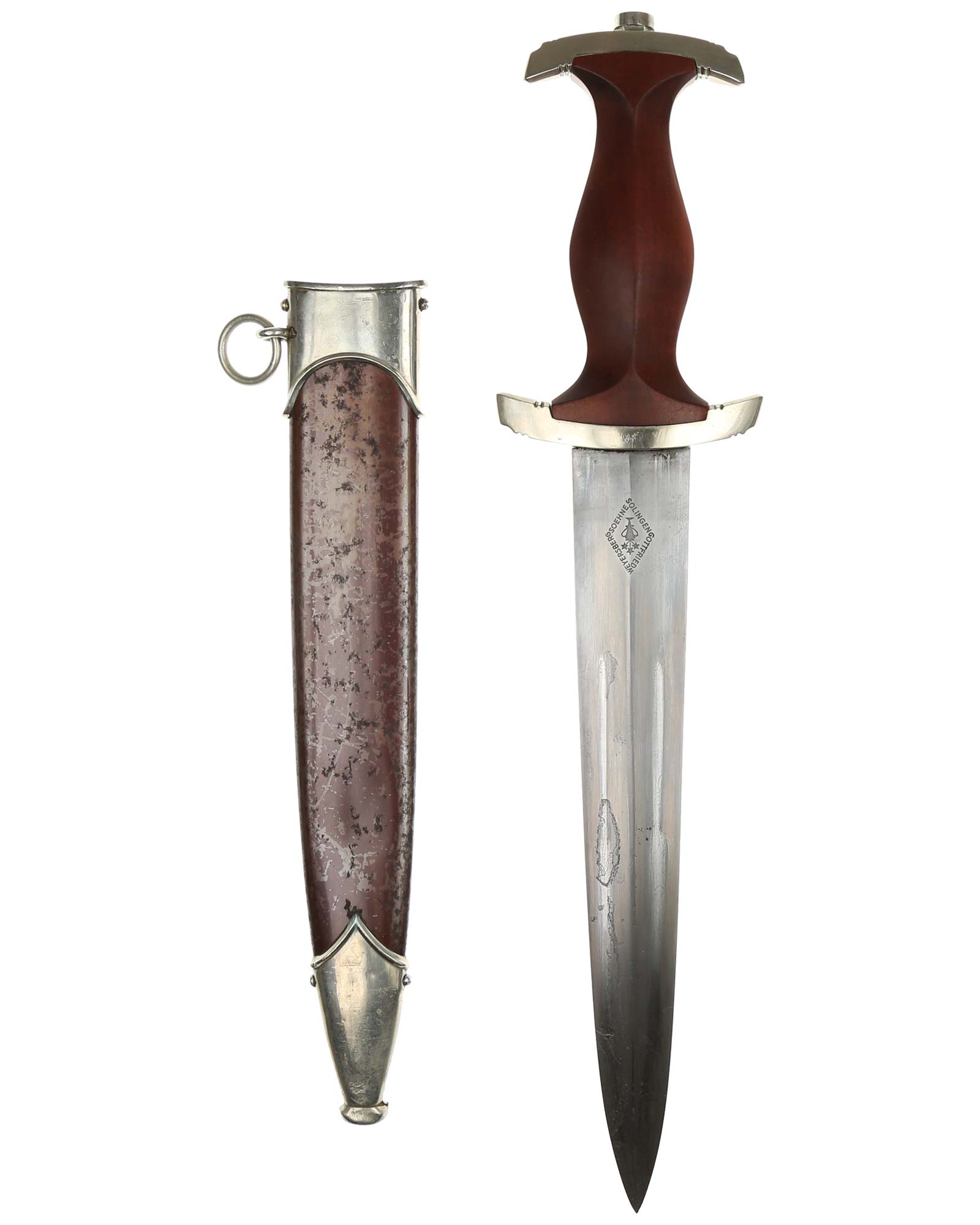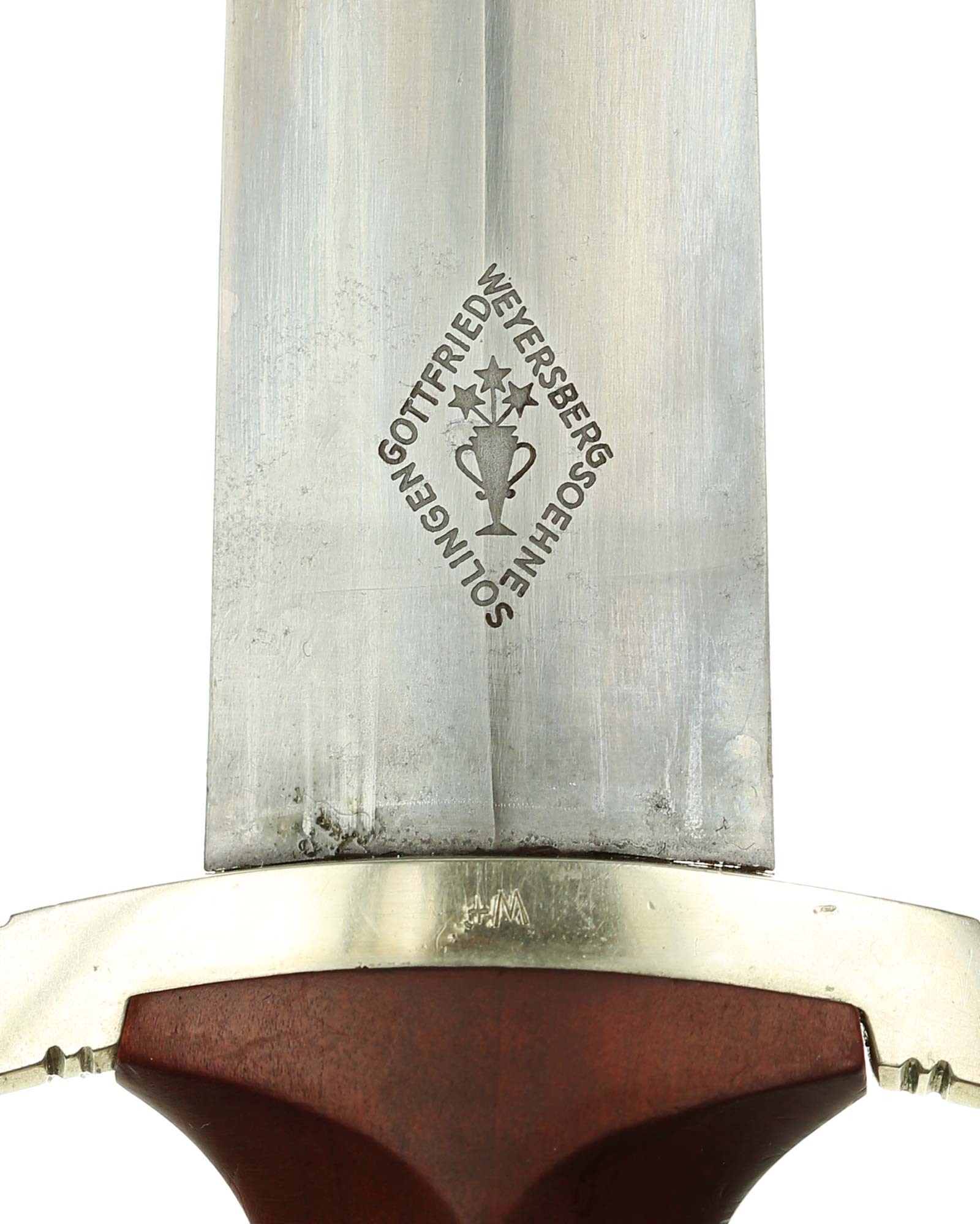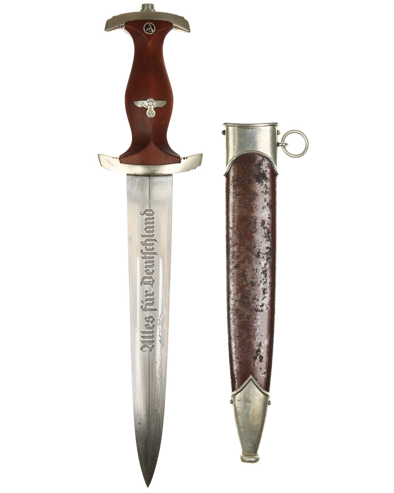 Клинок: Клинок кинжала прямой, стальной, двулезвийный, кинжального типа, с выраженным центральным ребром. На одной стороне клинка методом травления нанесен девиз СА «Всё для Германии» (Alles für Deutchland). Клинок на оборотной стороне у основания стоит клеймо производителя Готтфрид Вайерсберг Золинген (Gottfried Weyersberg & Söhne Solingen).