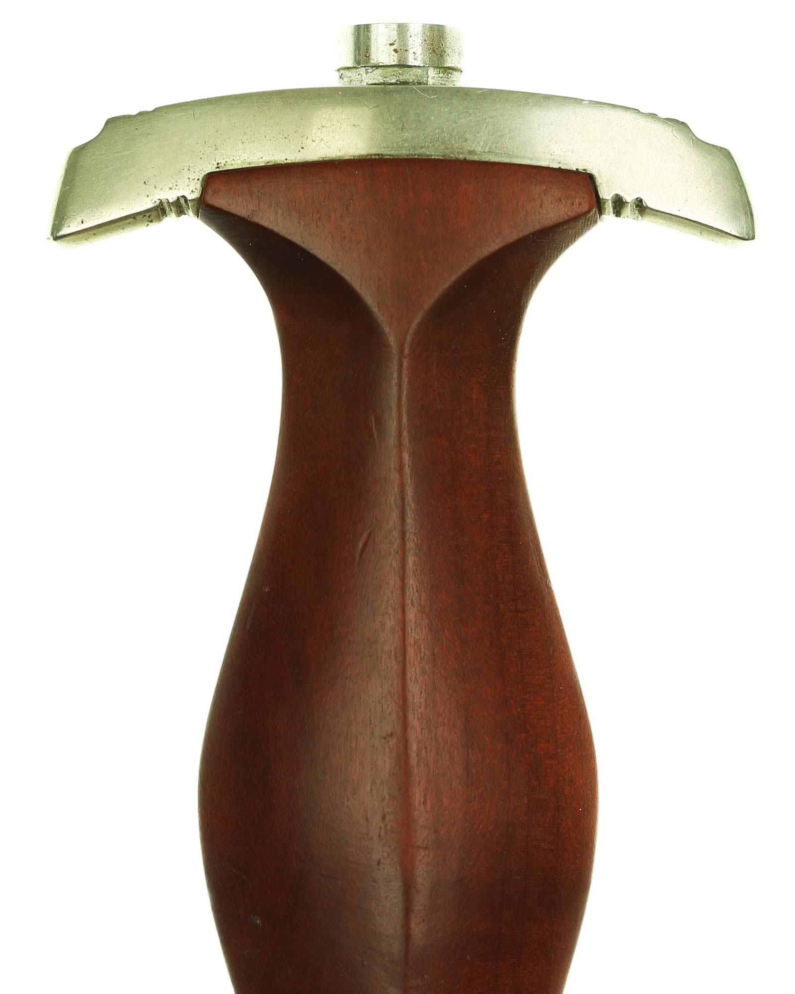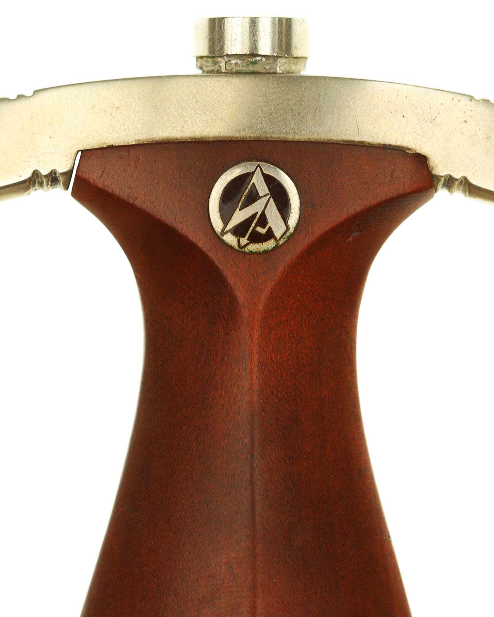 Рукоять: Рукоять из мореного в коричневый цвет дерева. Рукоять в верхней части имеет вставку в виде эмалевого глазка, в средней части – вставка в виде орла. Металлические элементы гарды изготовлены из мельхиора. Хвостовик клинка укреплен на верхней крестовине при помощи винта.