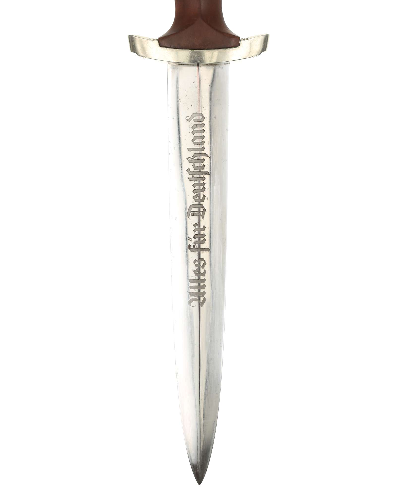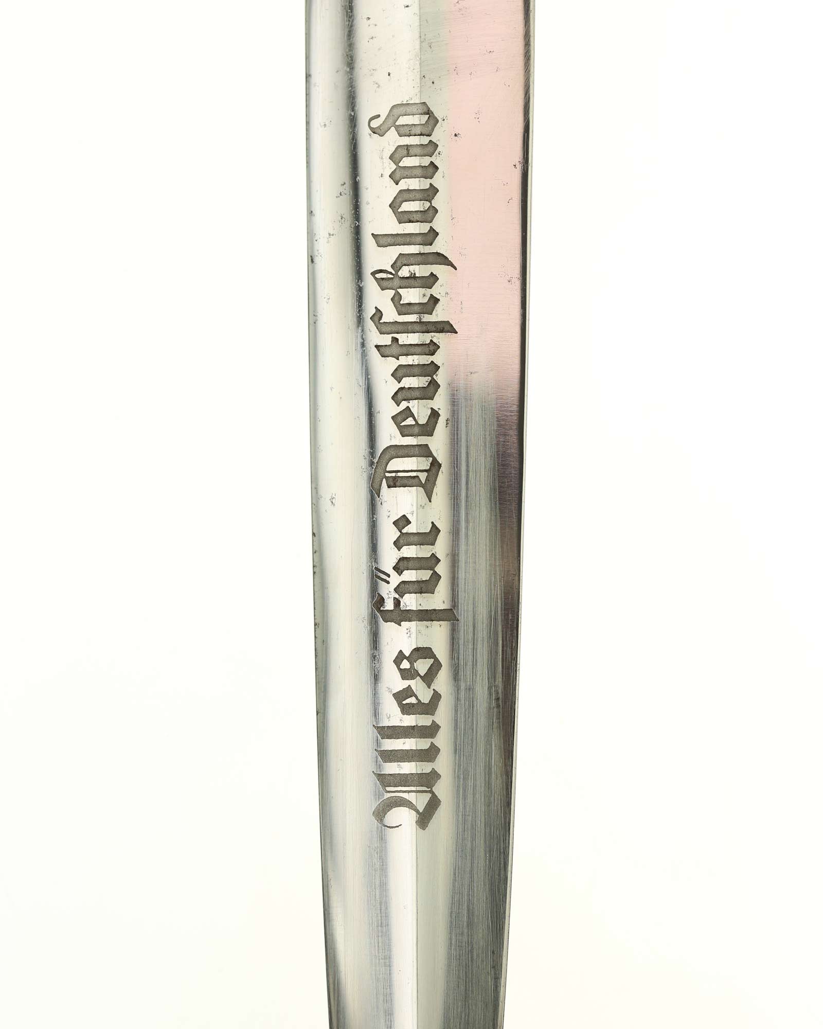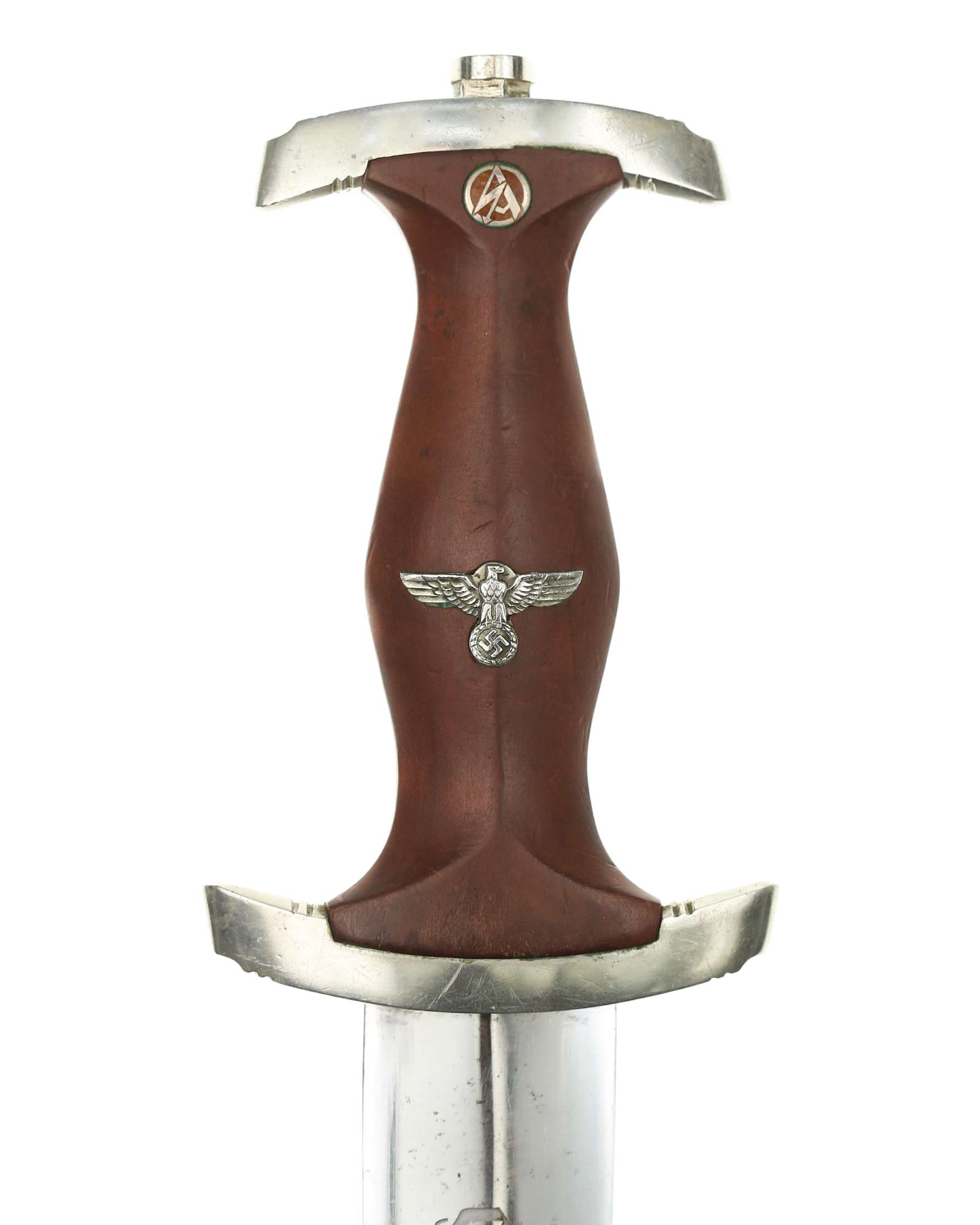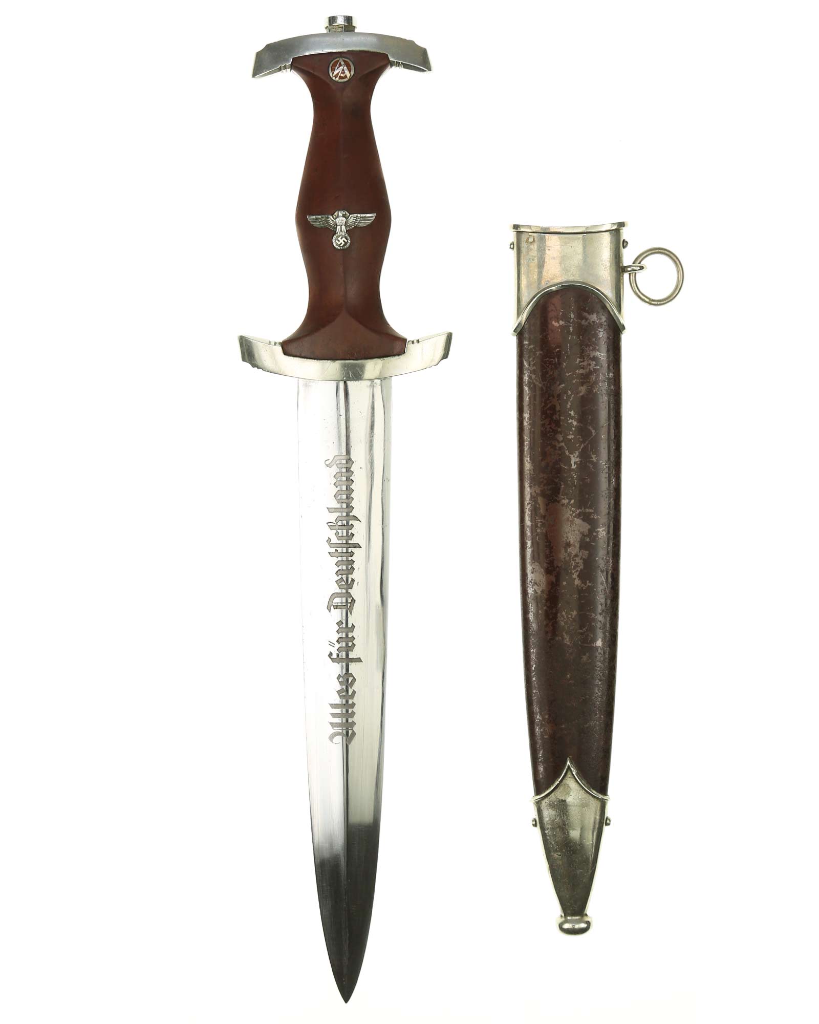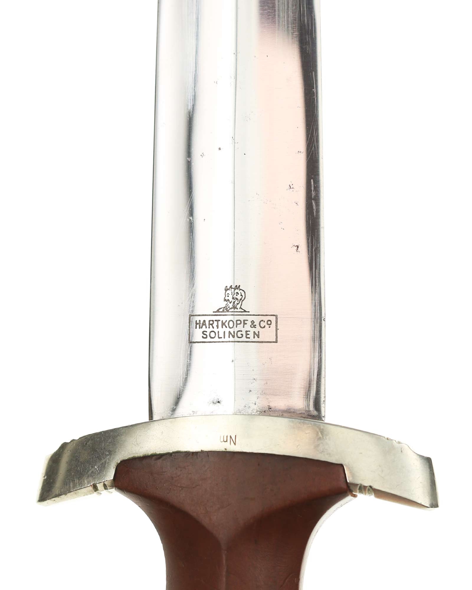 Клинок: Клинок кинжала прямой, стальной, двулезвийный, кинжального типа, с выраженным центральным ребром. На одной стороне клинка методом травления нанесен девиз СА «Всё для Германии» (Alles für Deutschland). Клинок на оборотной стороне у основания стоит клеймо производителя Харткопф и Ко. Золинген Hartkopf & Co. Solingen).