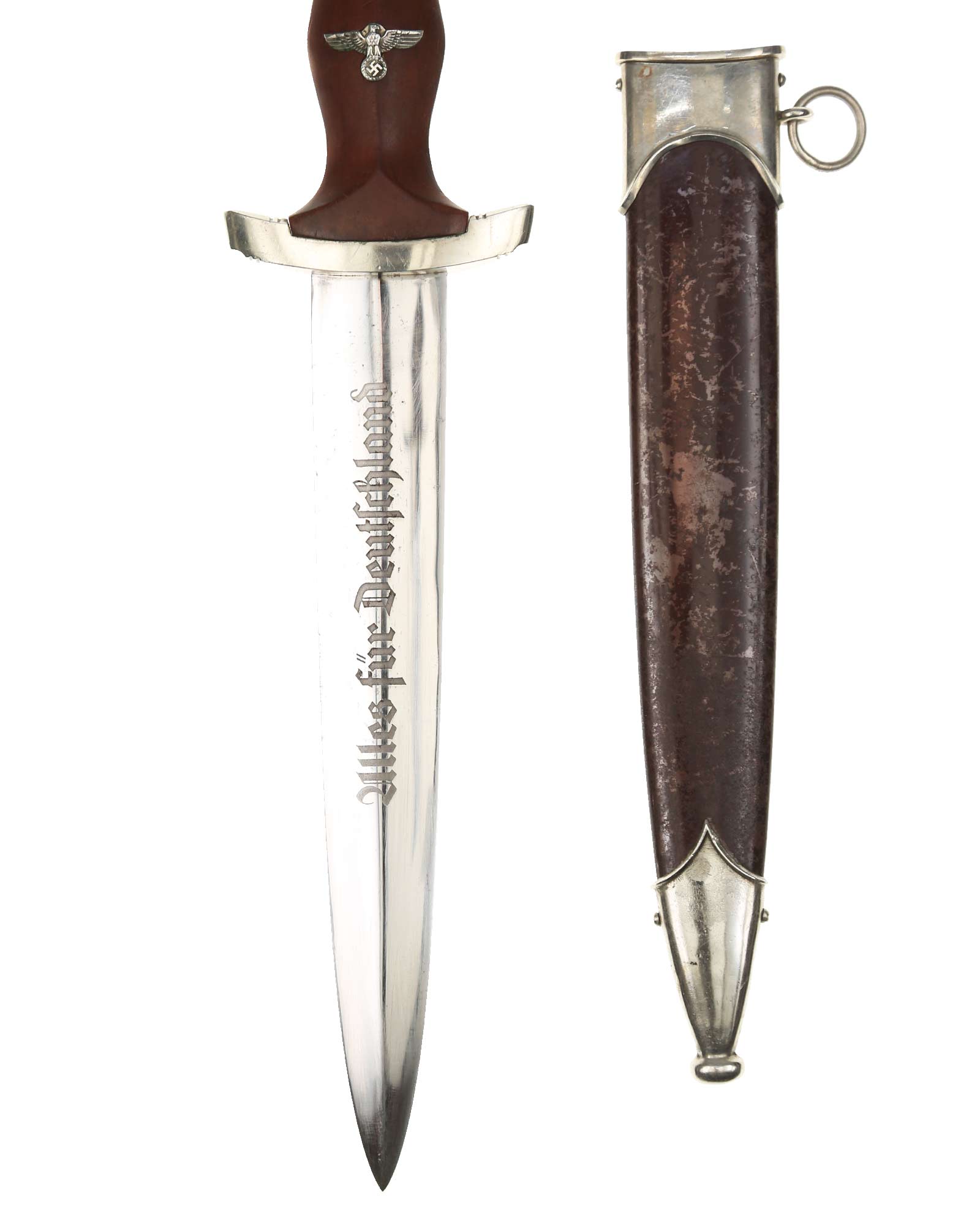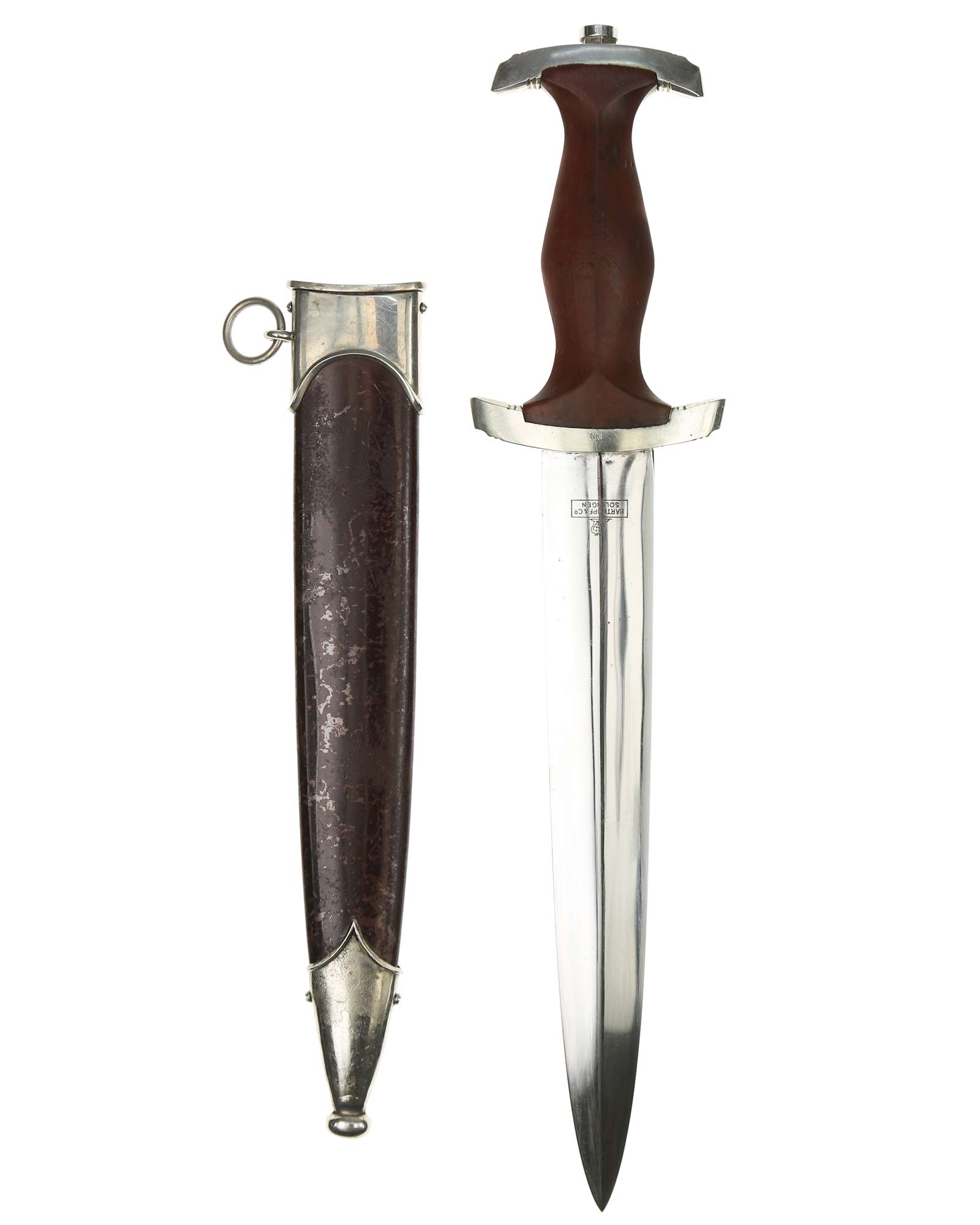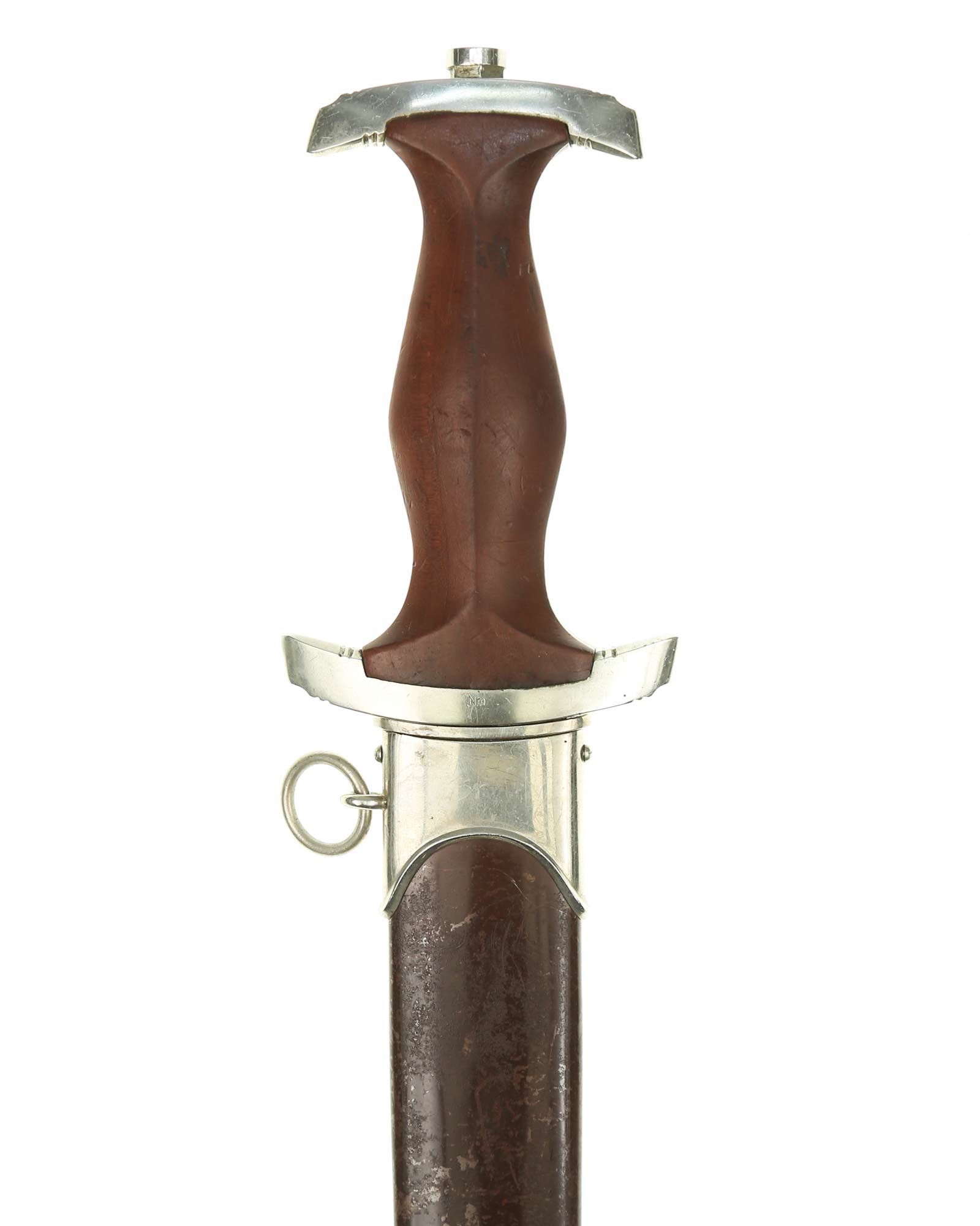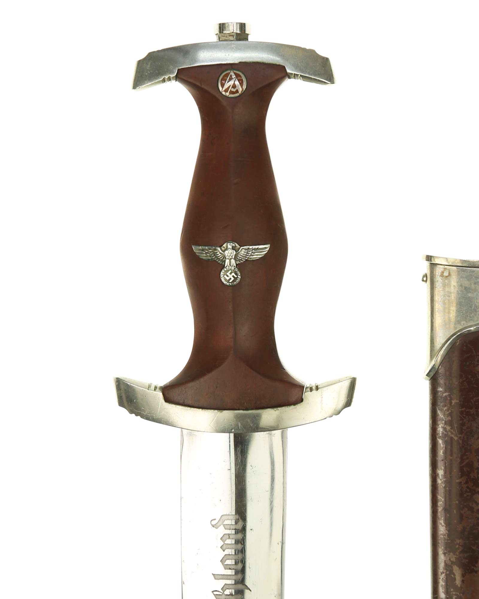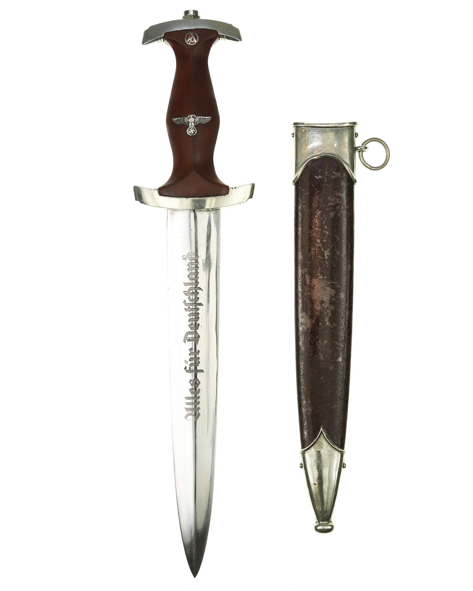 Клинок: Клинок кинжала прямой, стальной, двулезвийный, кинжального типа, с выраженным центральным ребром. На одной стороне клинка методом травления нанесен девиз СА «Всё для Германии» (Alles für Deutschland). Клинок на оборотной стороне у основания стоит клеймо производителя Харткопф и Ко. Золинген Hartkopf & Co. Solingen).