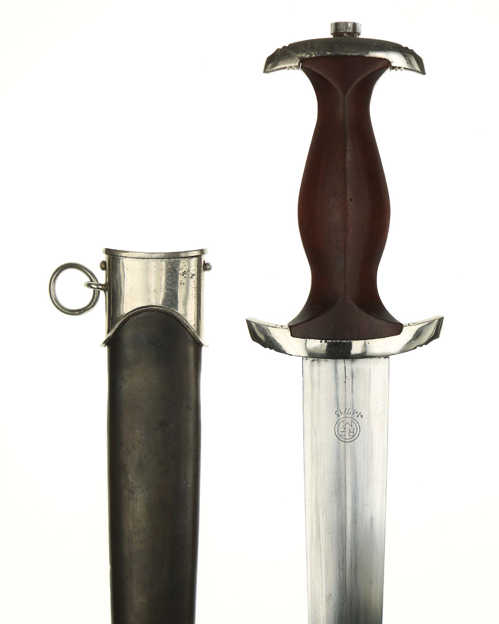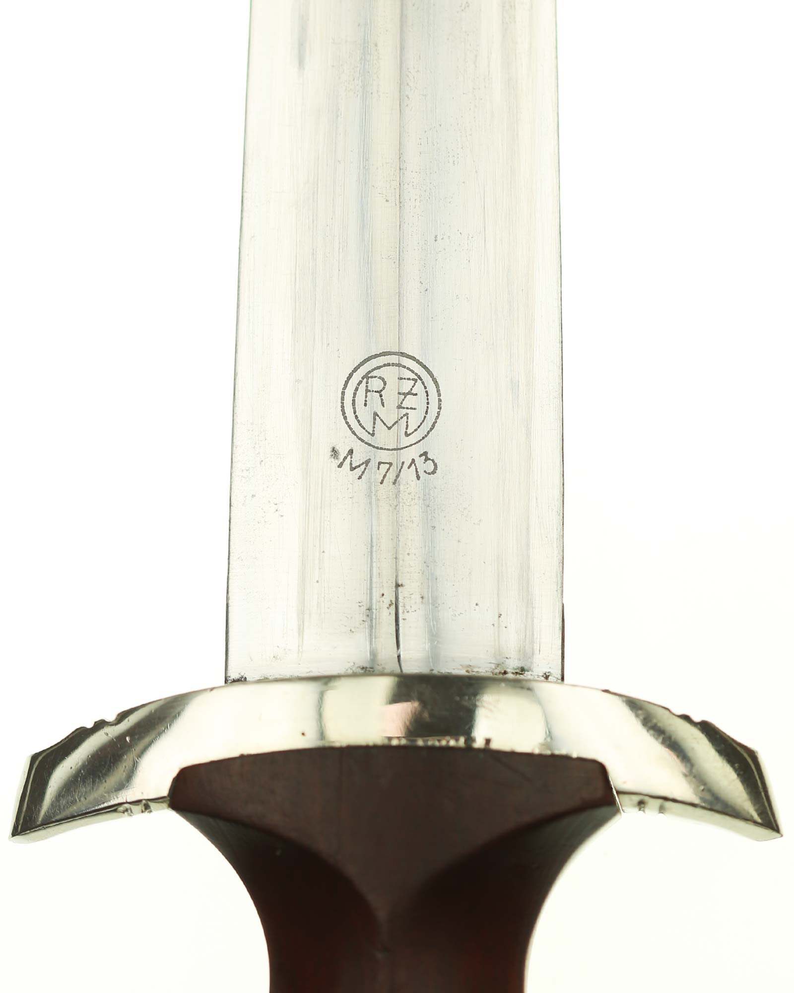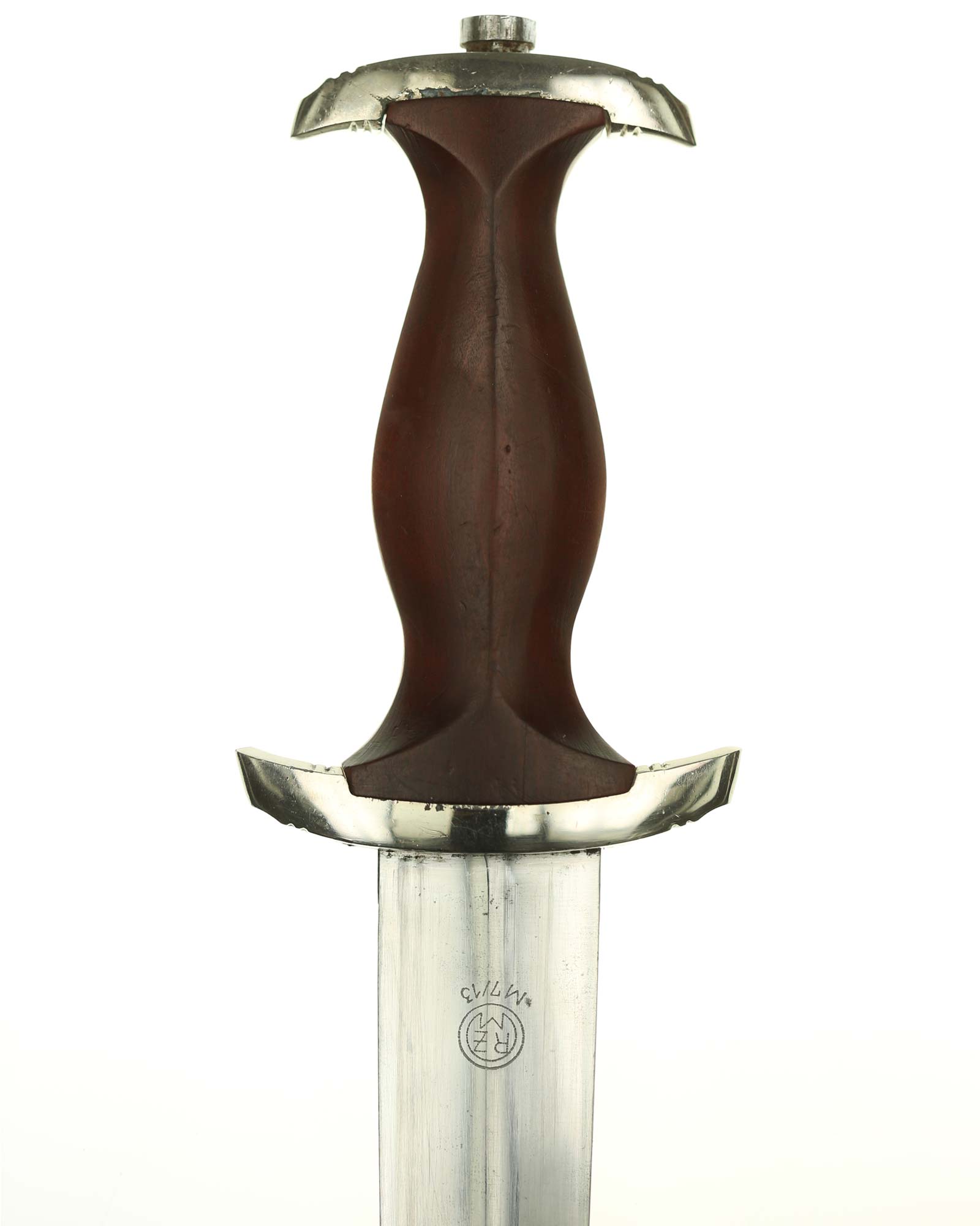 Клинок: Клинок классический кинжального типа, стальной, прямой, двулезвийный, с выраженным центральным ребром. На лицевой стороне нанесен травлением девиз SА «Alles für Deutschland» «Всё для Германии», на оборотной стороне у основания стоит совмещенное клеймо производителя Шюттельхофер Артур & Кo. (АССО), Золинген с кодом RZM M7/13 (Arthur Schüttelhöfer ASSO Solingen).
