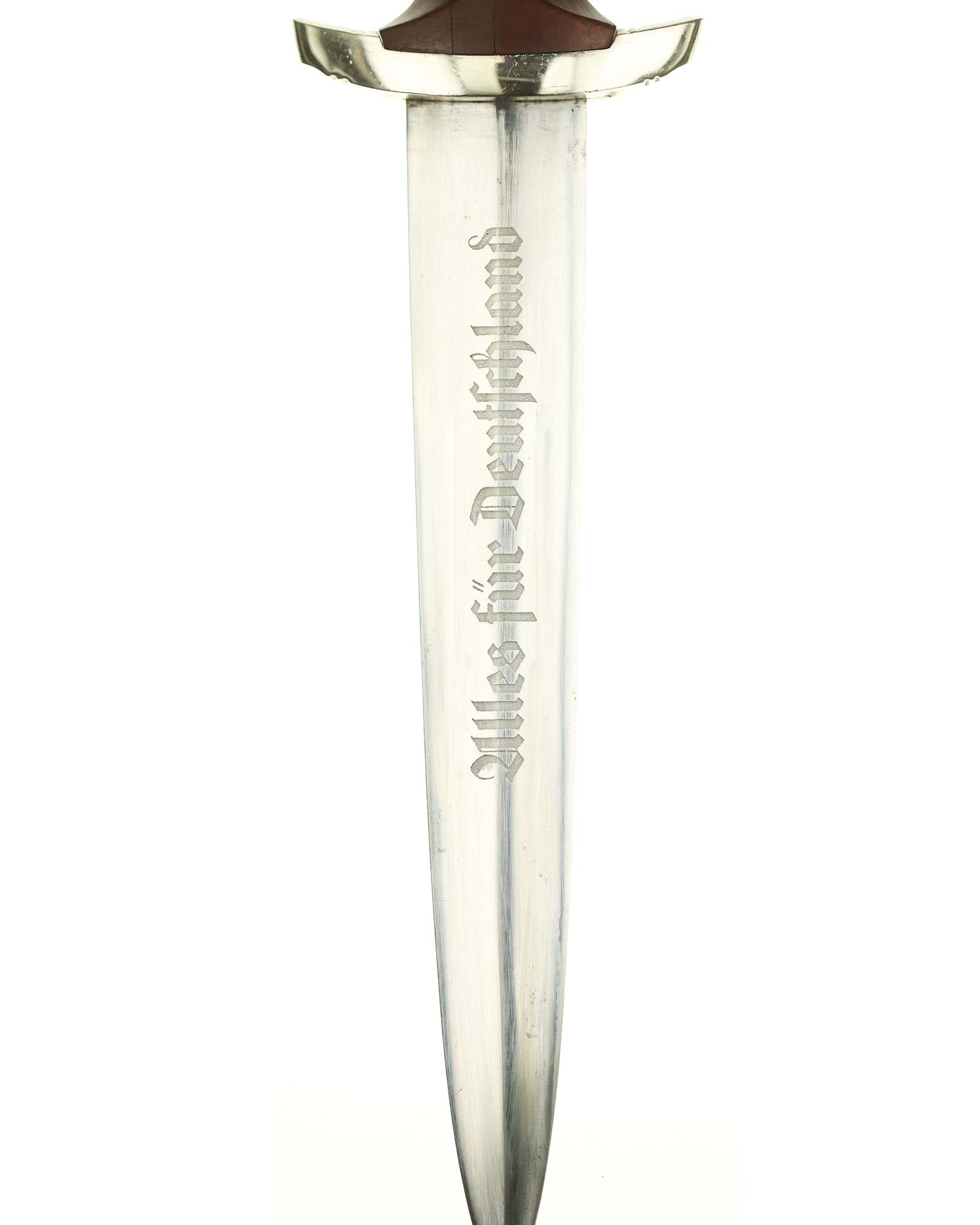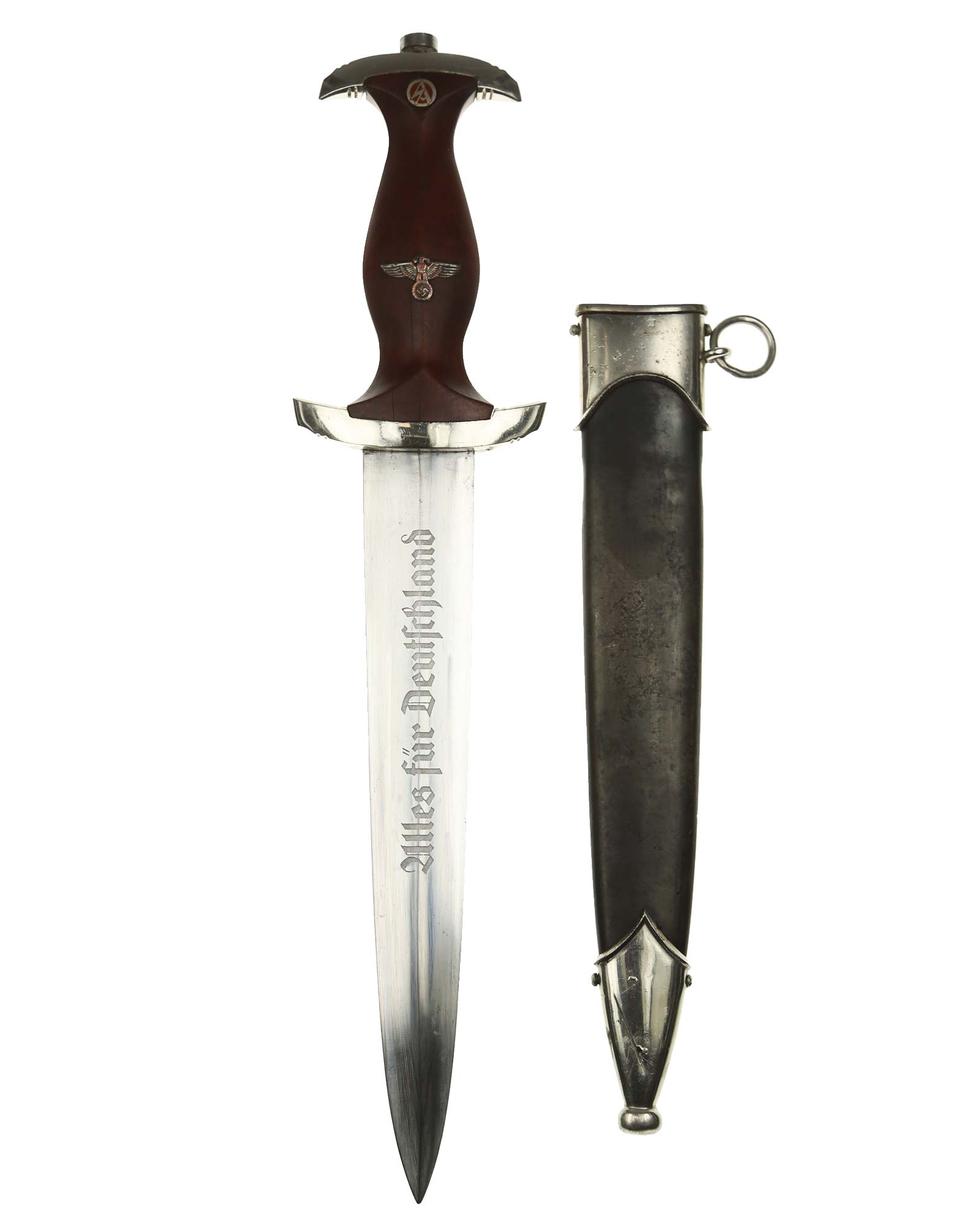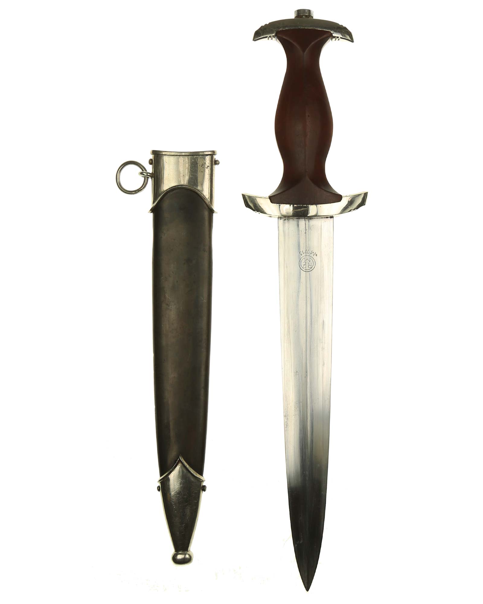 Клинок: Клинок классический кинжального типа, стальной, прямой, двулезвийный, с выраженным центральным ребром. На лицевой стороне нанесен травлением девиз SА «Alles für Deutschland» «Всё для Германии», на оборотной стороне у основания стоит совмещенное клеймо производителя Шюттельхофер Артур & Кo. (АССО), Золинген с кодом RZM M7/13 (Arthur Schüttelhöfer ASSO Solingen).