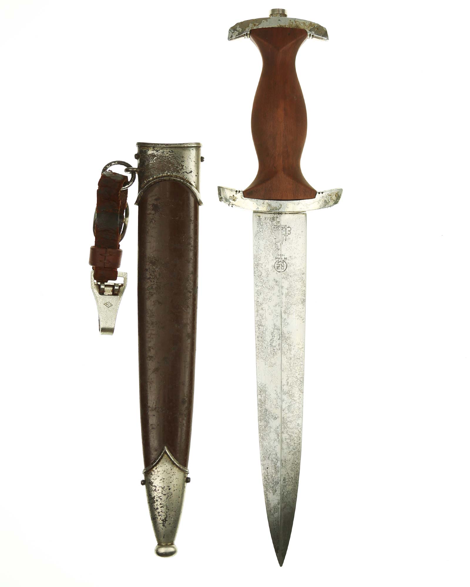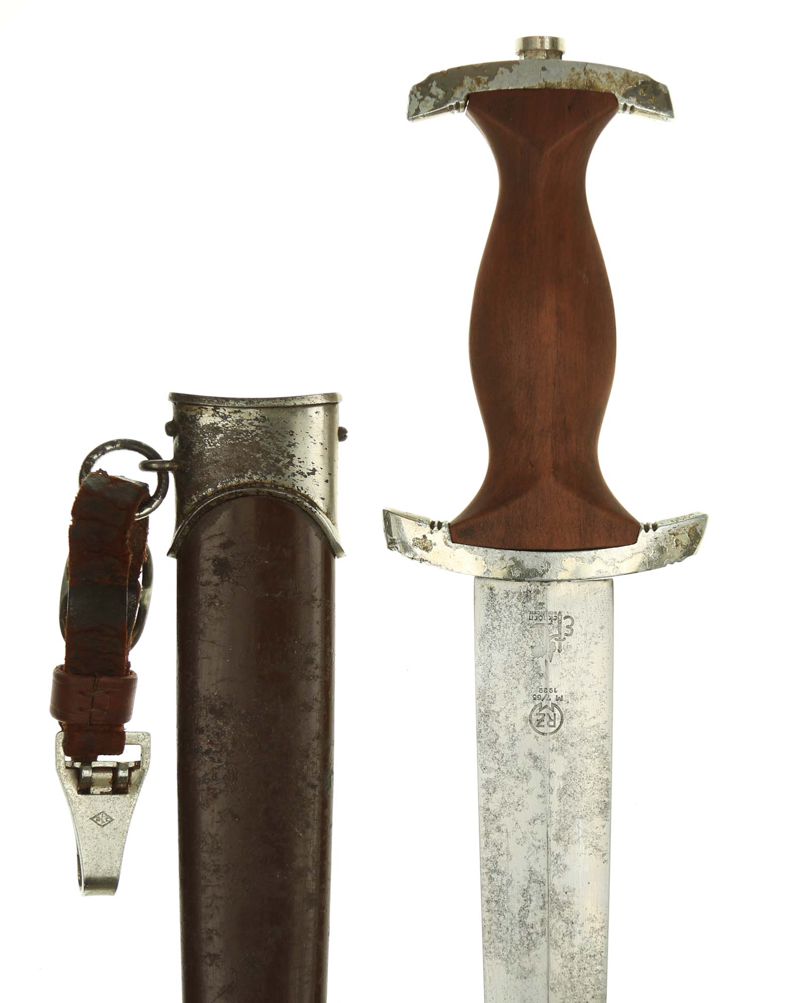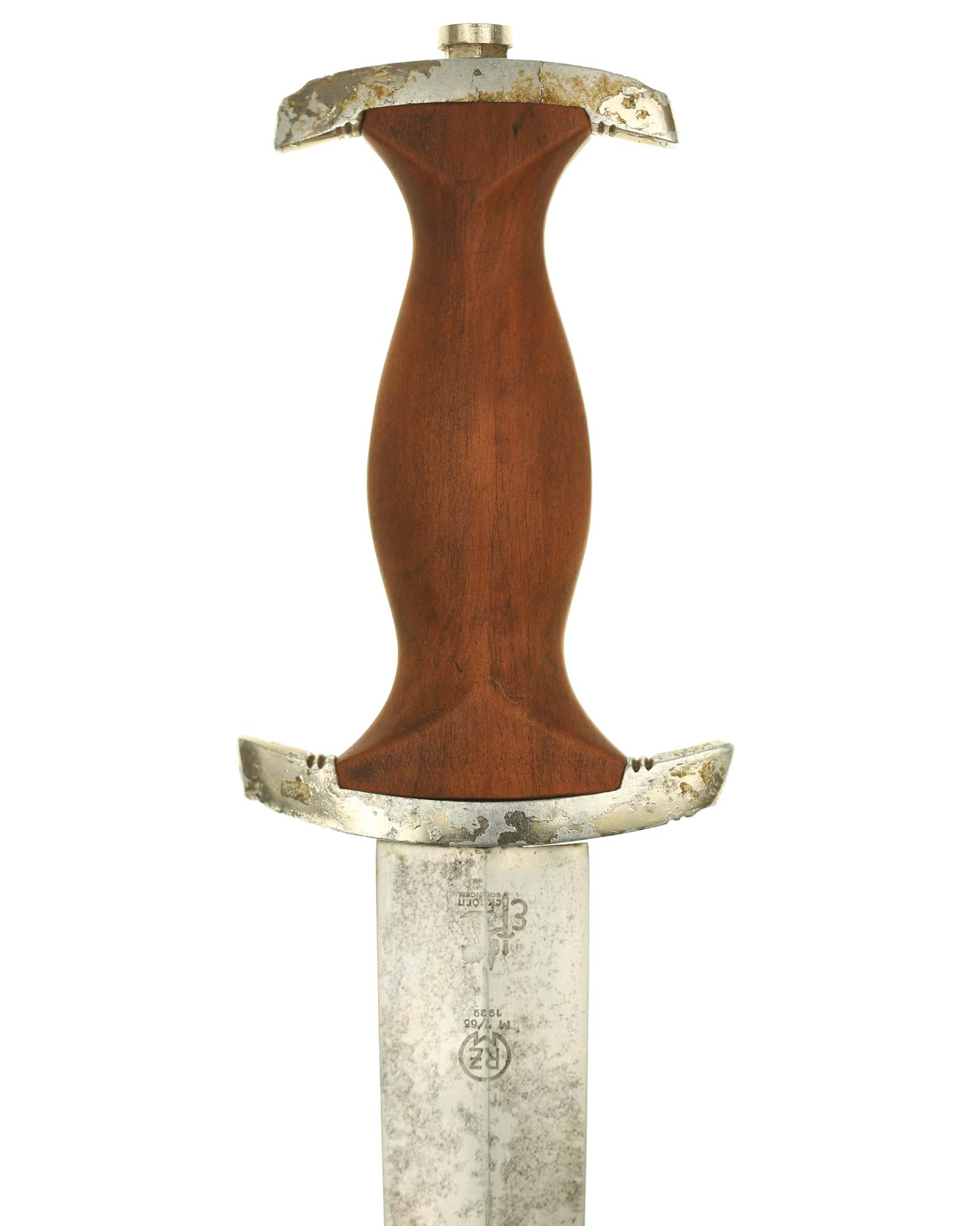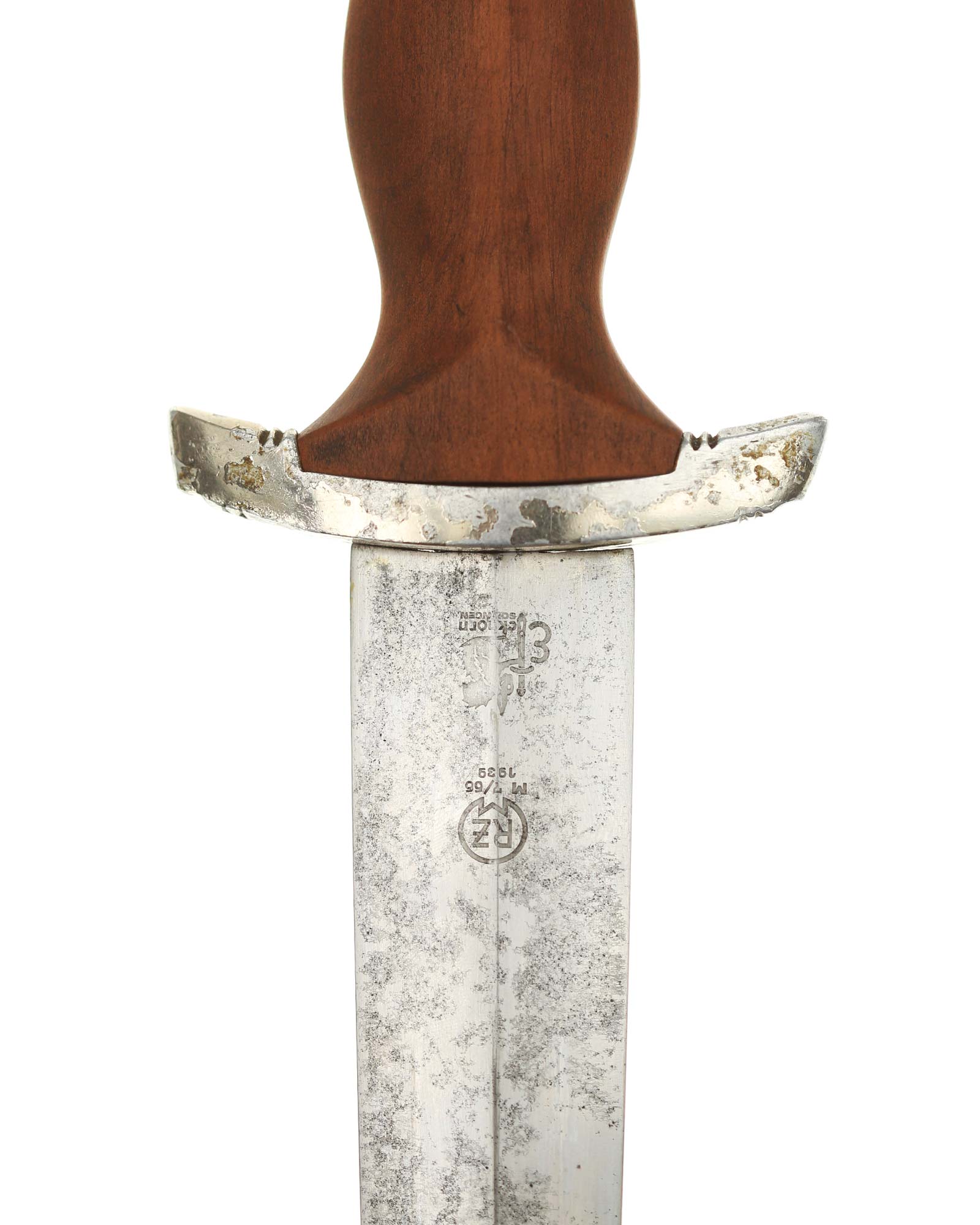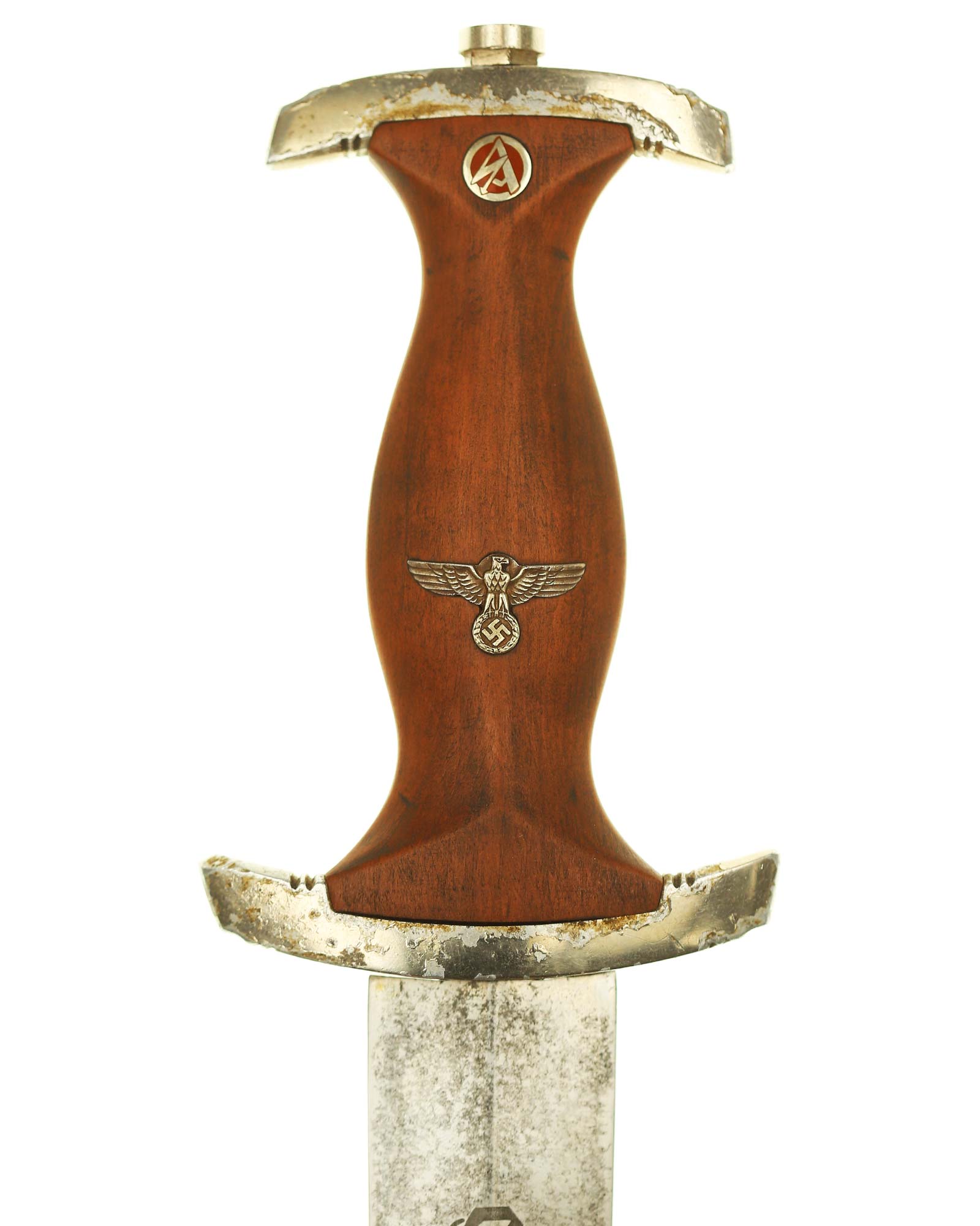 Клинок: Клинок классический кинжального типа, стальной, прямой, двулезвийный, с выраженным центральным ребром. На лицевой стороне нанесен травлением девиз SА «Alles für Deutschland» «Всё для Германии», на оборотной стороне у основания стоит совмещенное клеймо производителя Carl Eickhorn Solingen с кодом RZM M7/66.