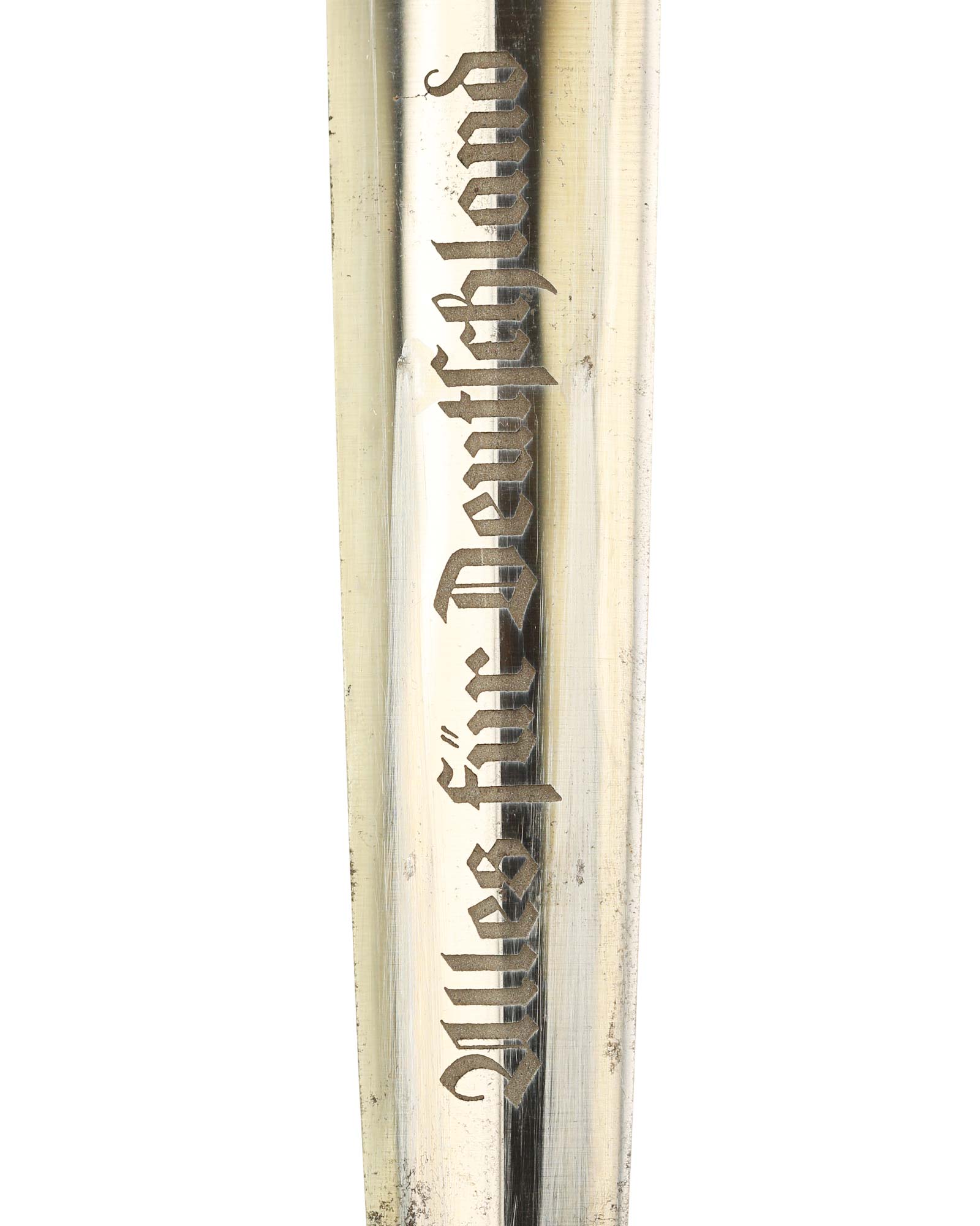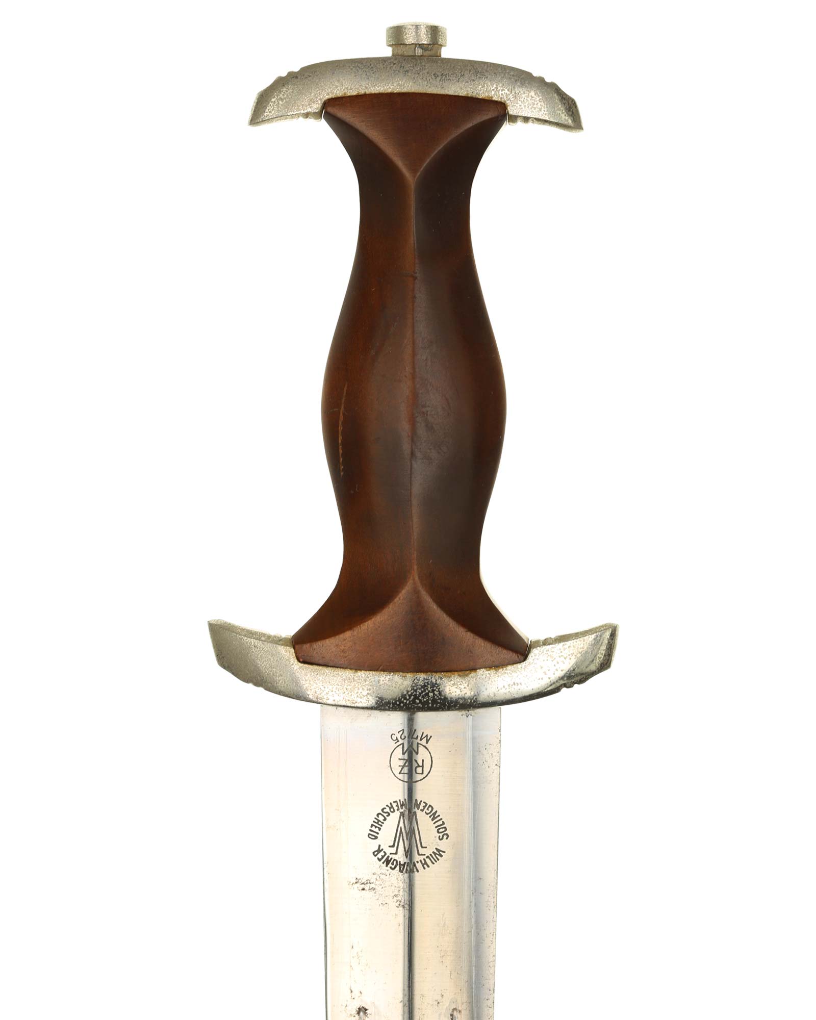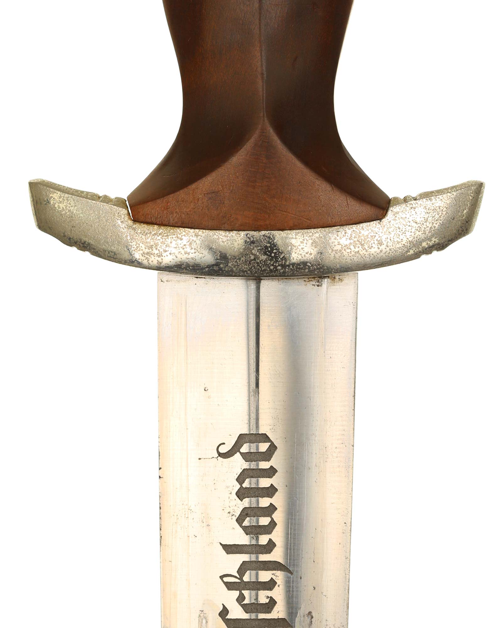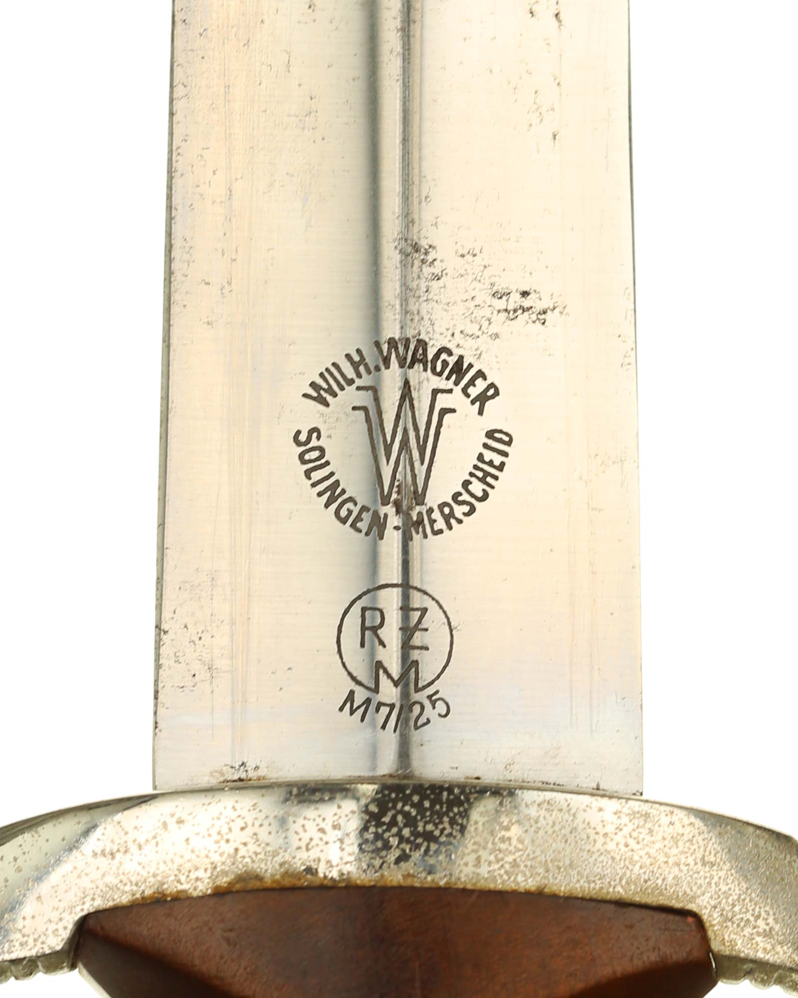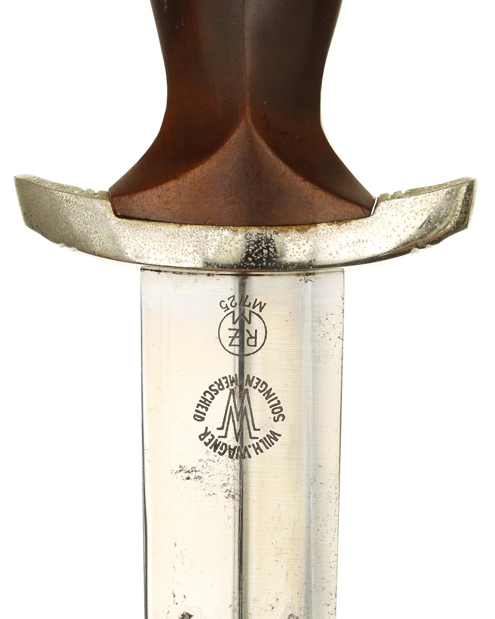 Клинок: Клинок классический кинжального типа, стальной, прямой, двулезвийный, с выраженным центральным ребром. На лицевой стороне нанесен травлением девиз SА «Alles für Deutschland» «Всё для Германии», на оборотной стороне у основания стоит совмещенное клеймо производителя Wilhelm Wagner Solingen с кодом RZM M7/25.