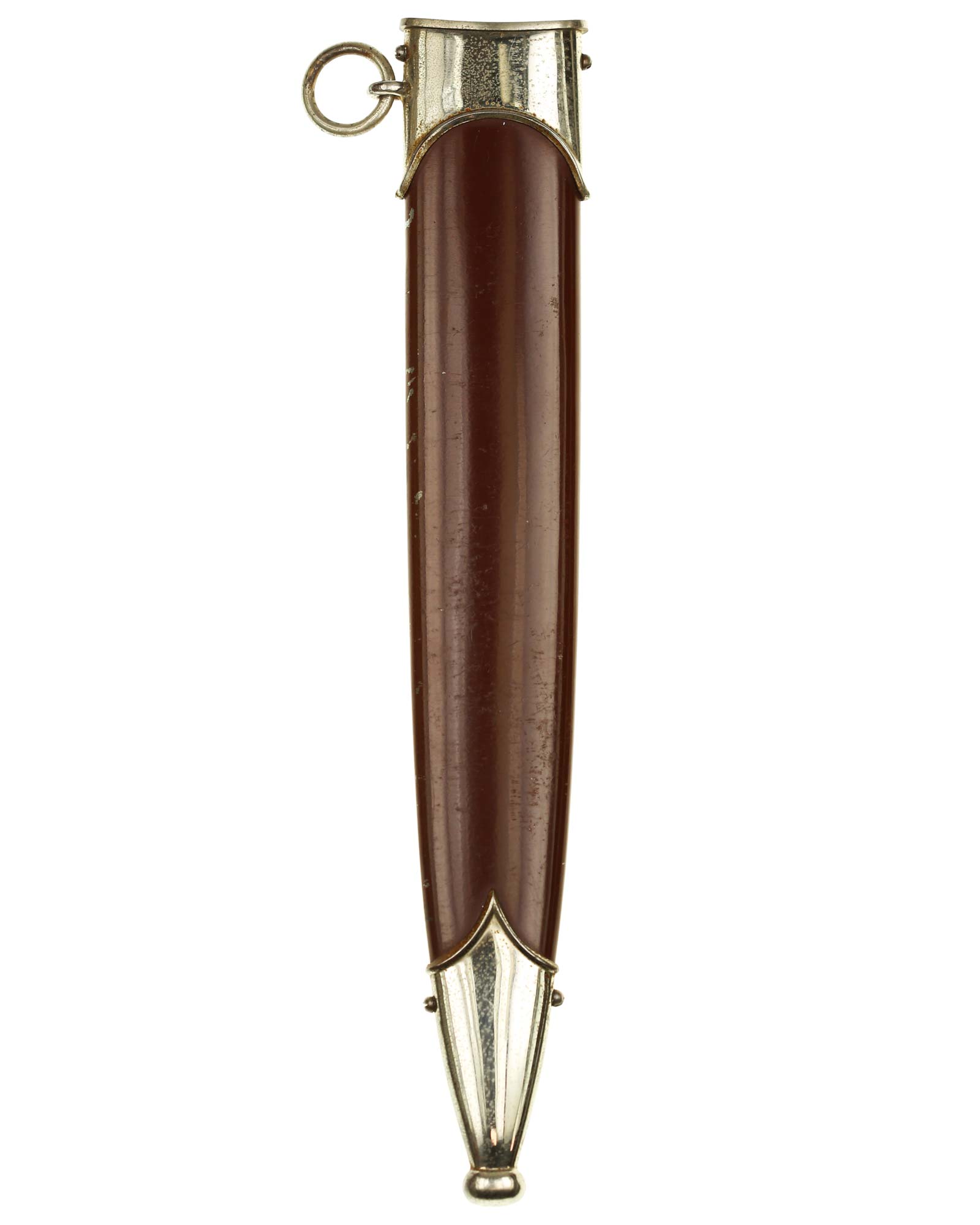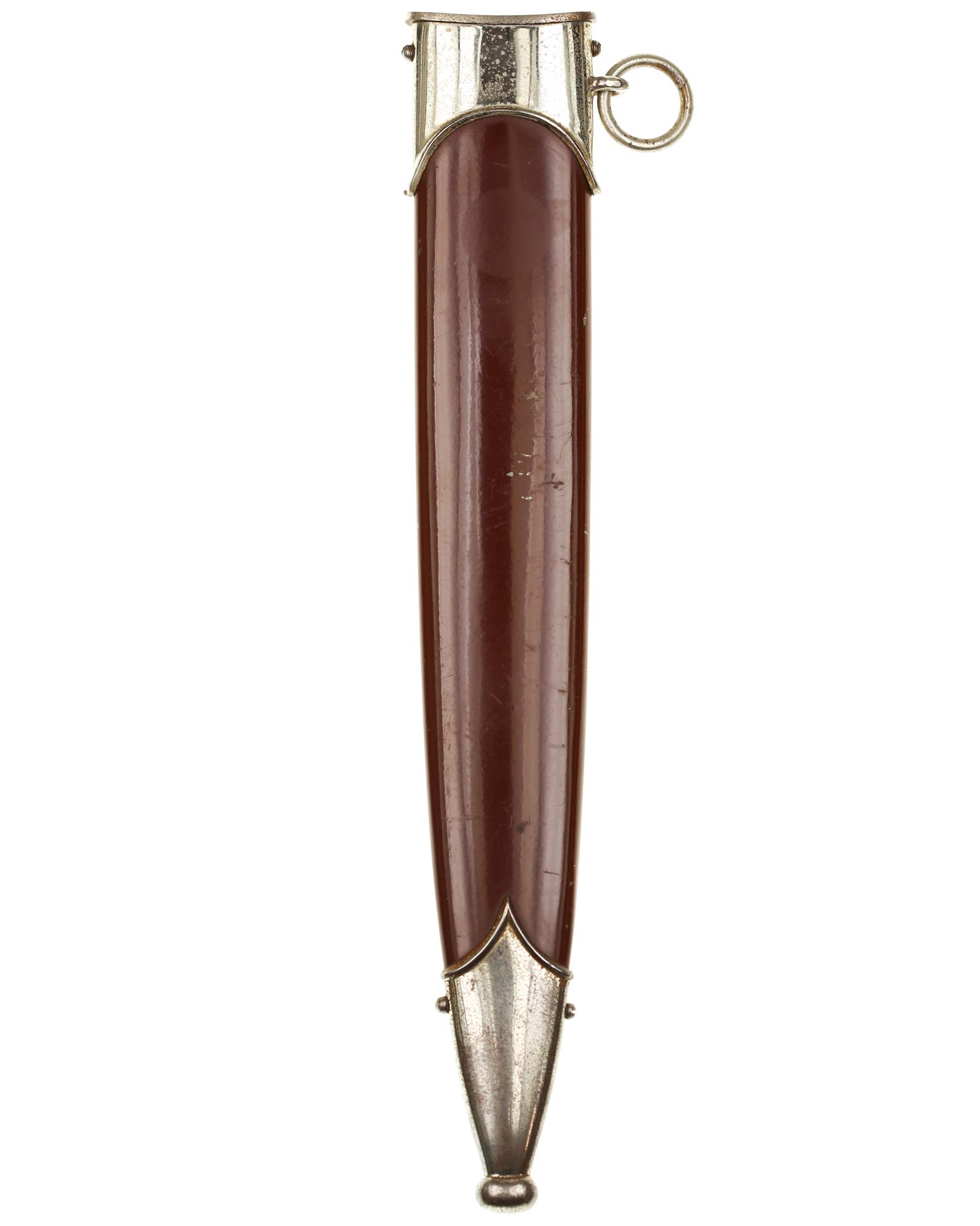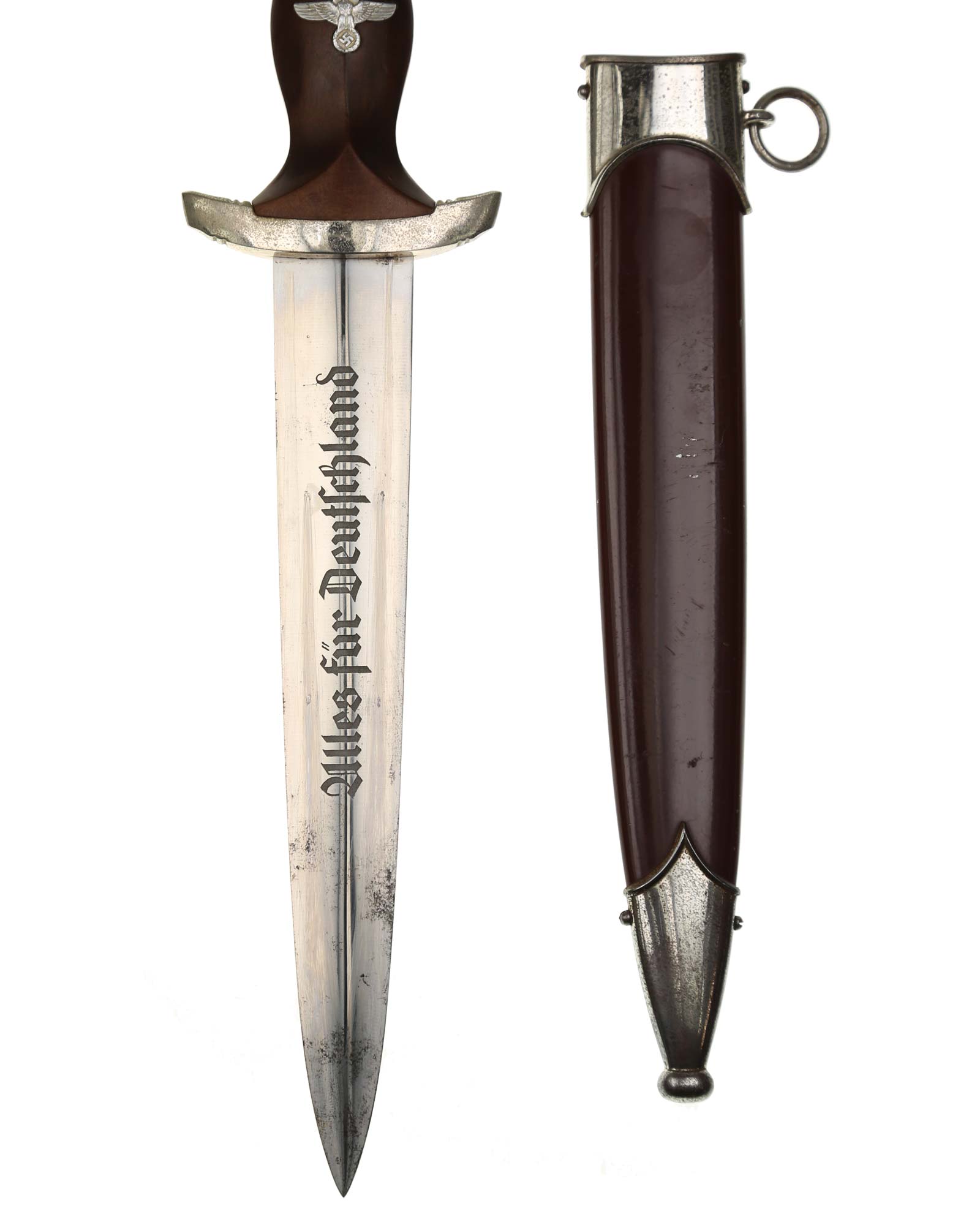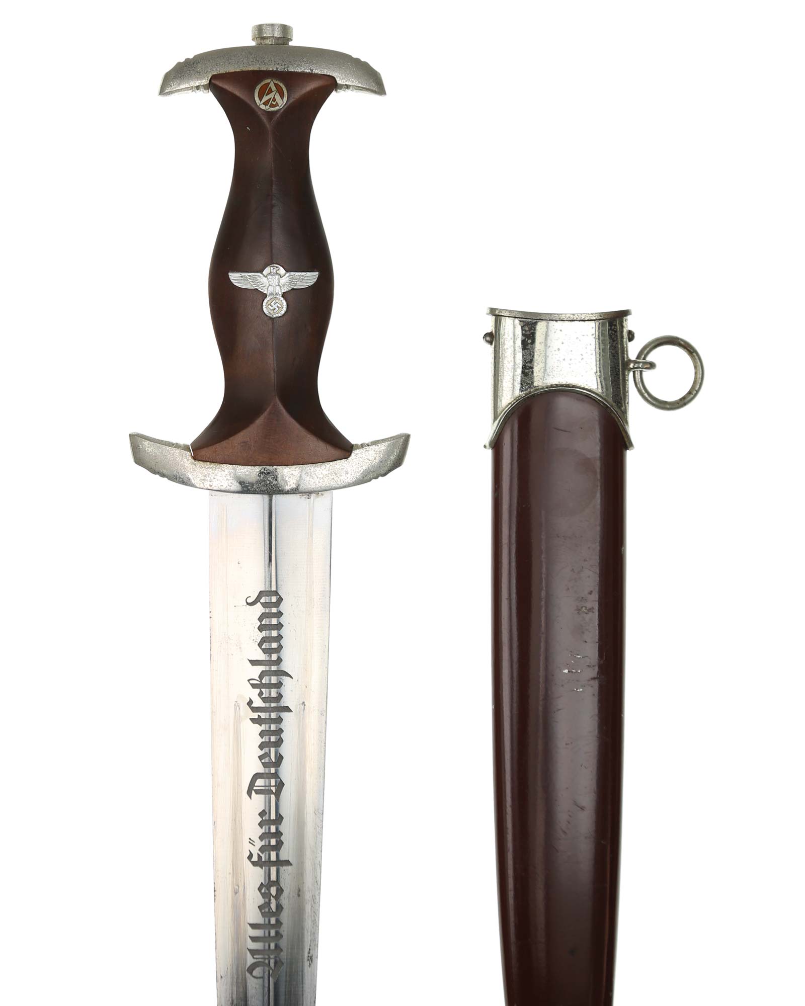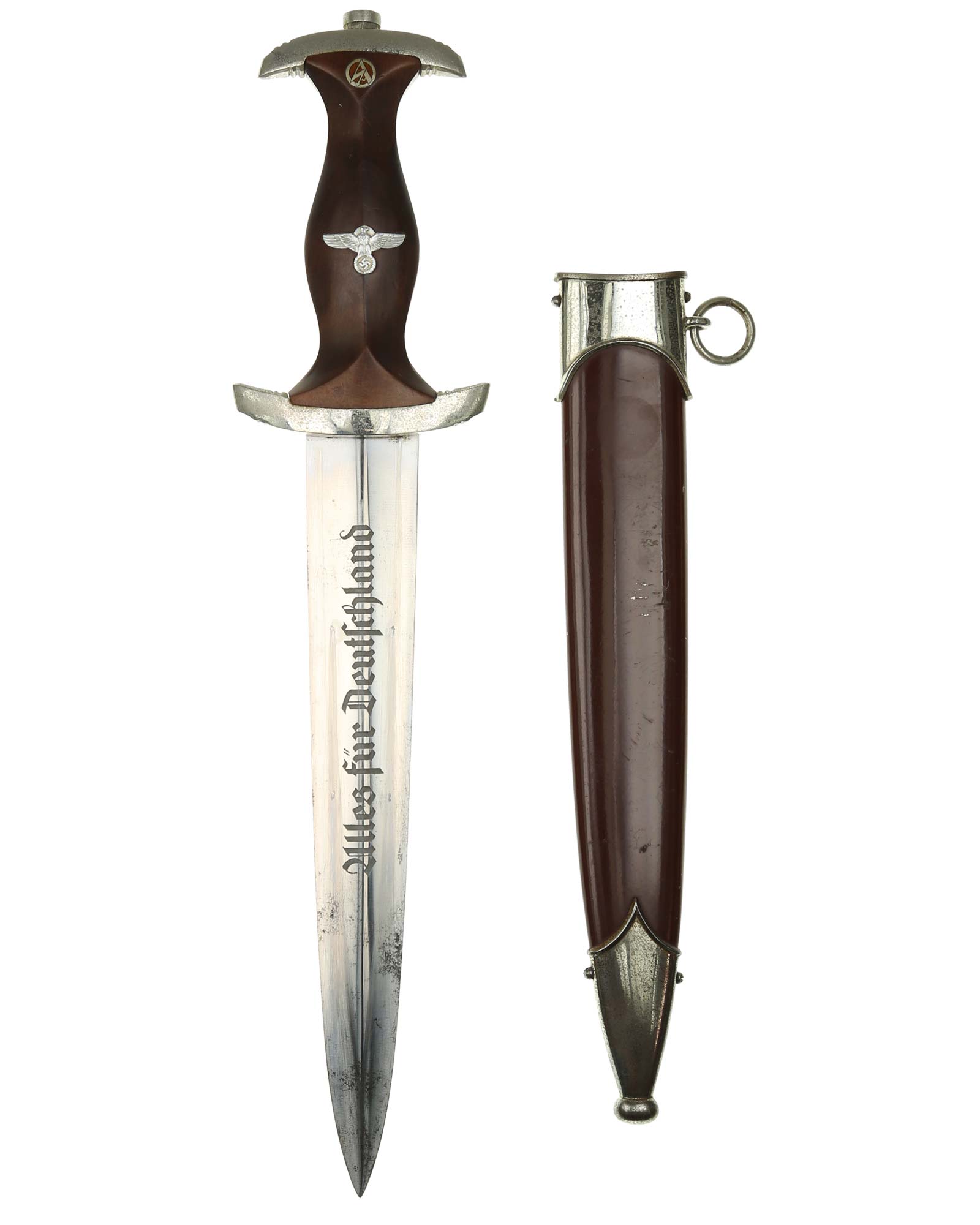 Средний кинжал штурмовых отрядов СА образца 1933 года. Средний период производства, 1936-1938 годы. Производитель фирма RZM RZM M7/25 (Вильгельм Вагнер Золинген-Мершайд). Длина в ножнах 38,0 см.