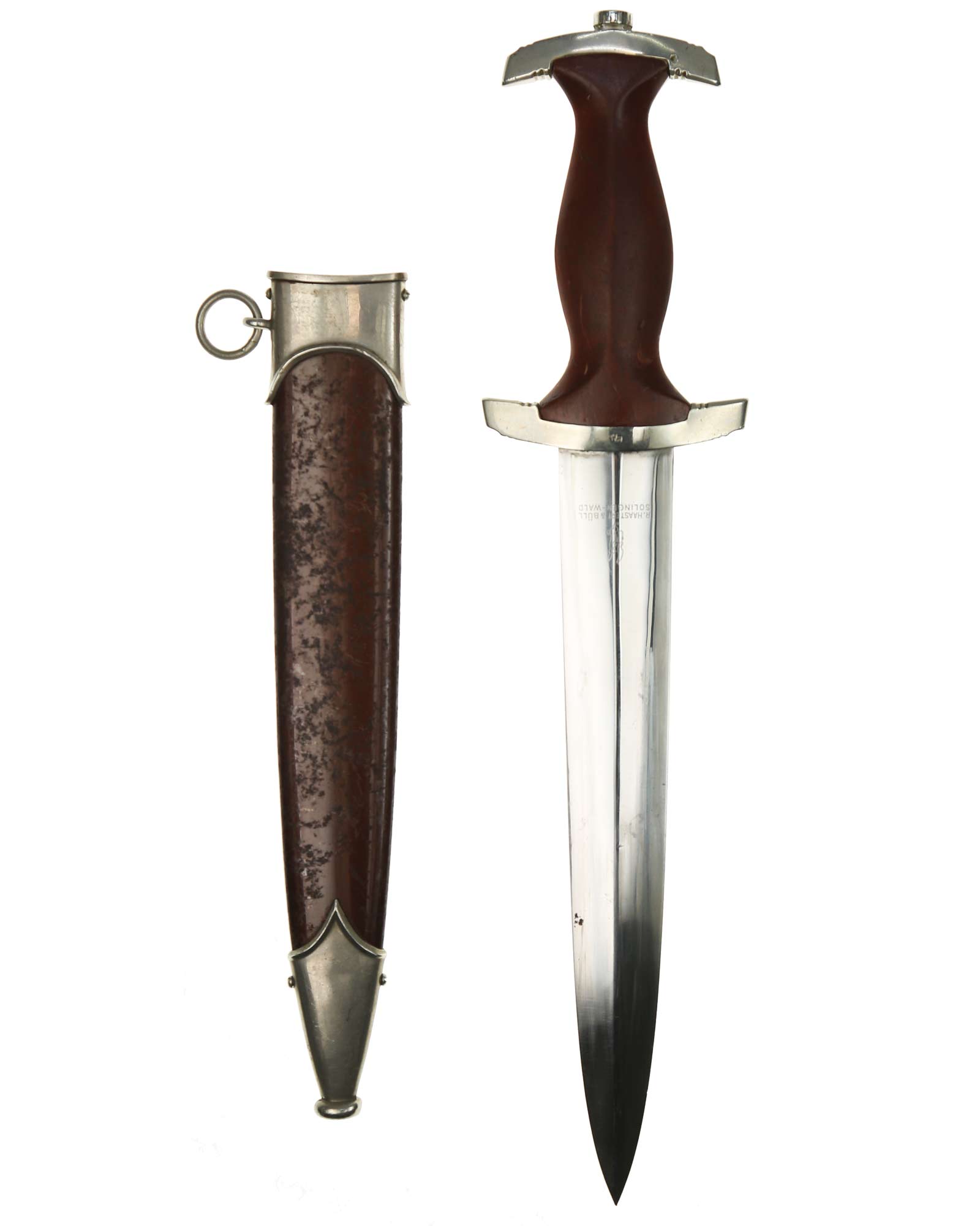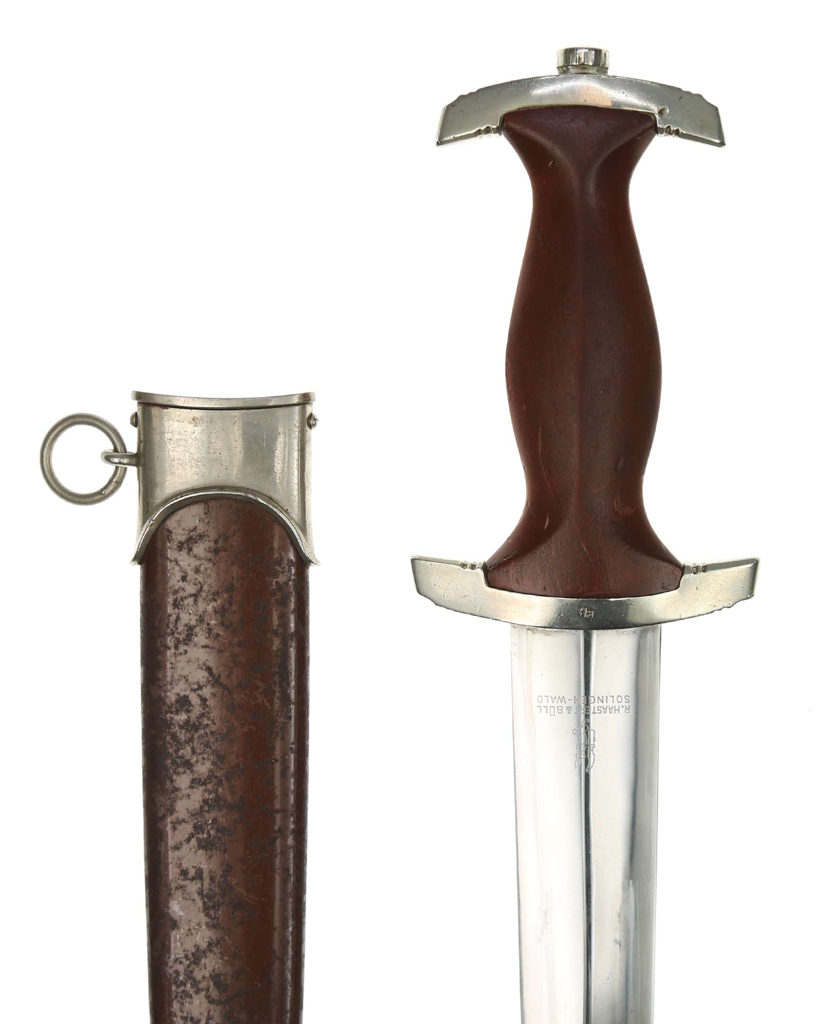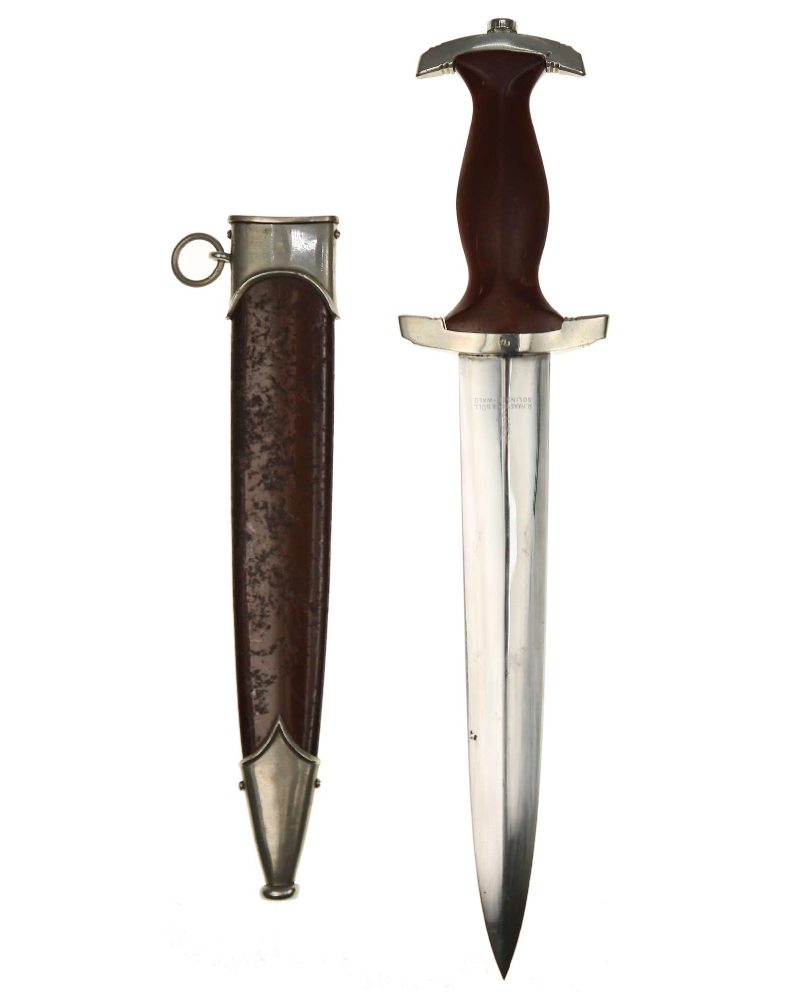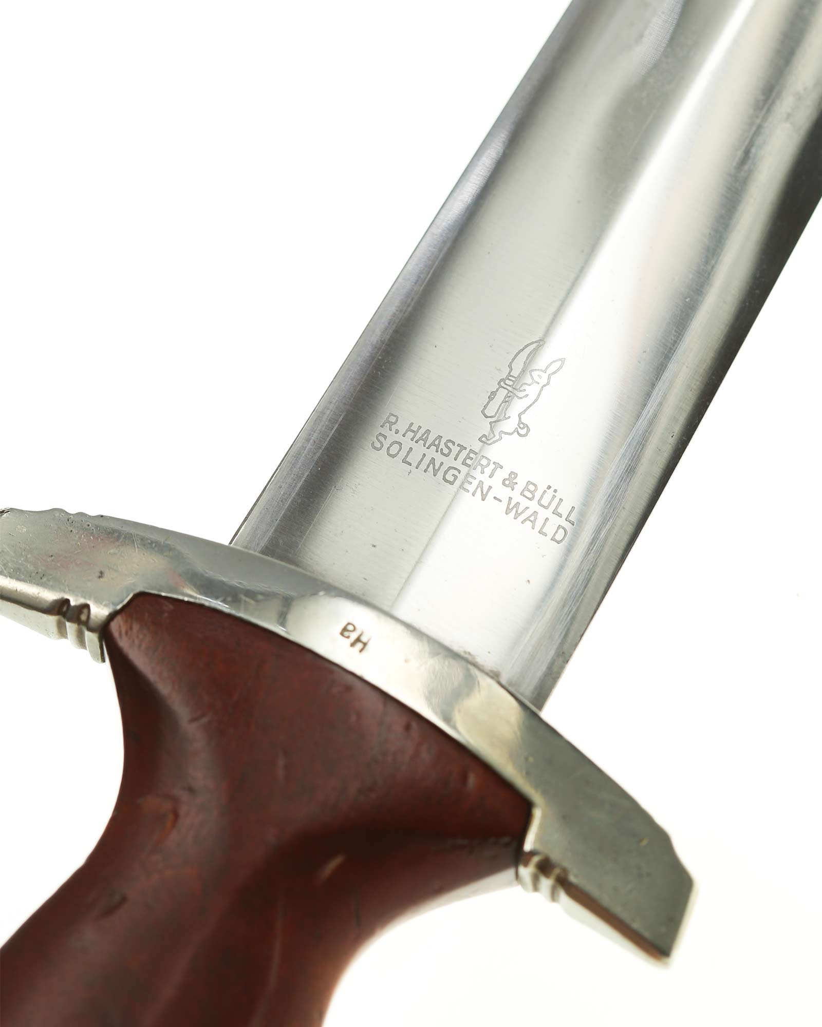 Клинок: Клинок кинжала прямой, стальной, двулезвийный, кинжального типа, с выраженным центральным ребром. На одной стороне клинка методом травления нанесен девиз СА «Всё для Германии» (Alles für Deutschland). Клинок на оборотной стороне у основания стоит клеймо производителя Рихард Хааштерт и Бюль Золинген (R. Haastert & Büll Solingen).
