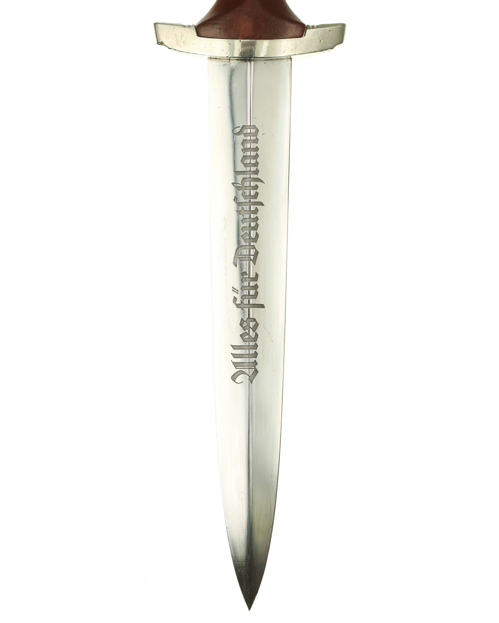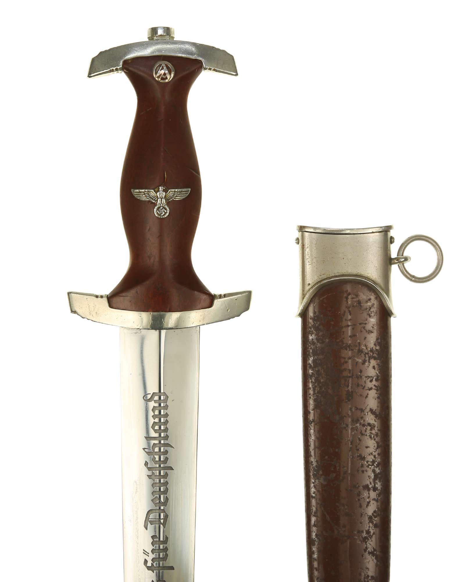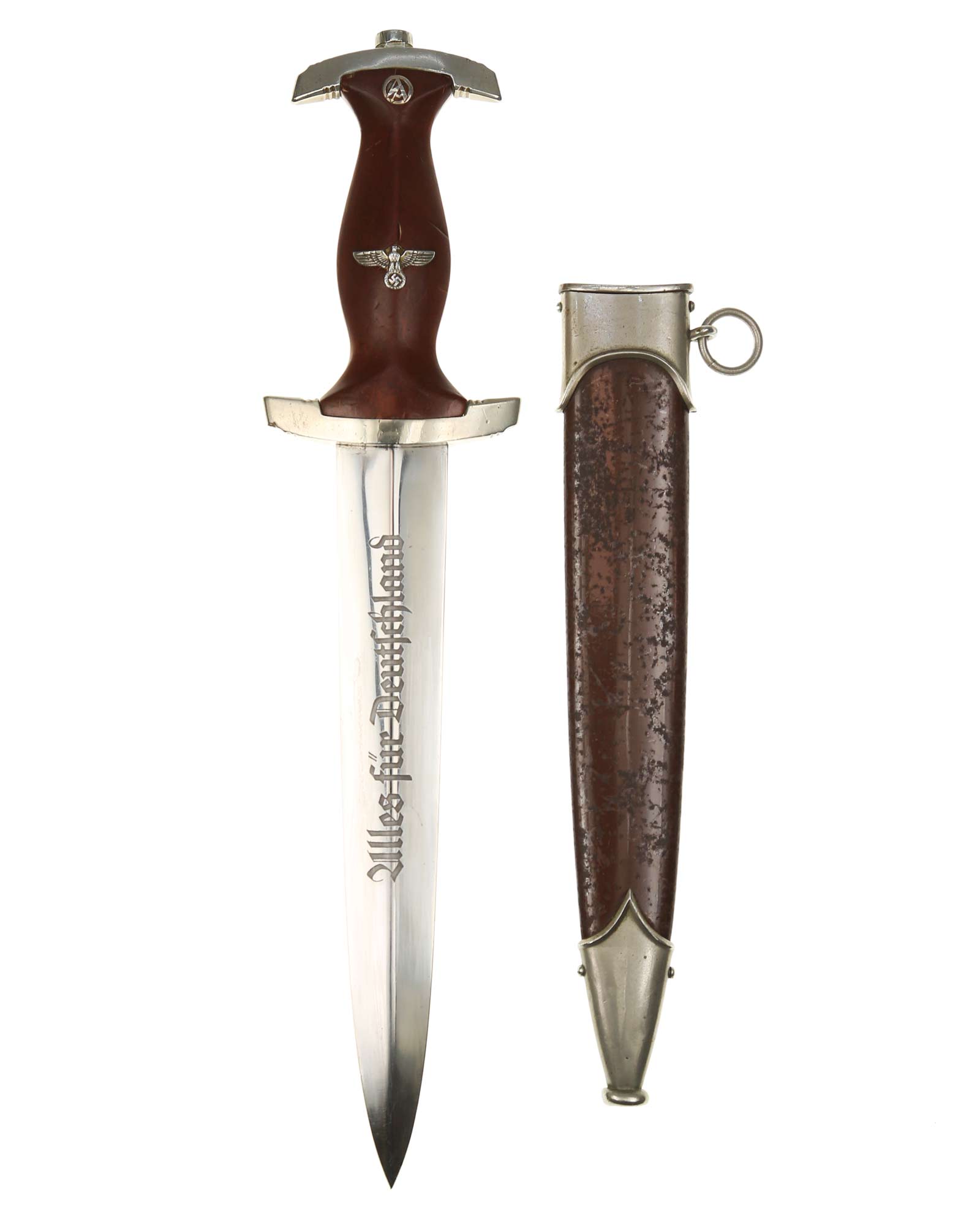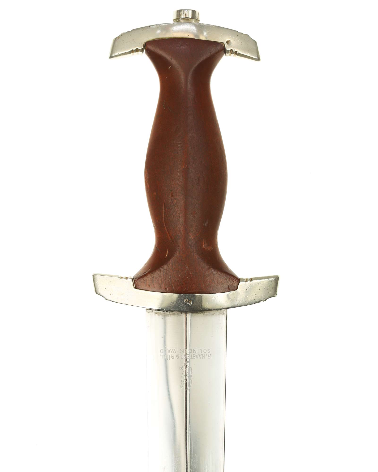 Клинок: Клинок кинжала прямой, стальной, двулезвийный, кинжального типа, с выраженным центральным ребром. На одной стороне клинка методом травления нанесен девиз СА «Всё для Германии» (Alles für Deutschland). Клинок на оборотной стороне у основания стоит клеймо производителя Рихард Хааштерт и Бюль Золинген (R. Haastert & Büll Solingen).