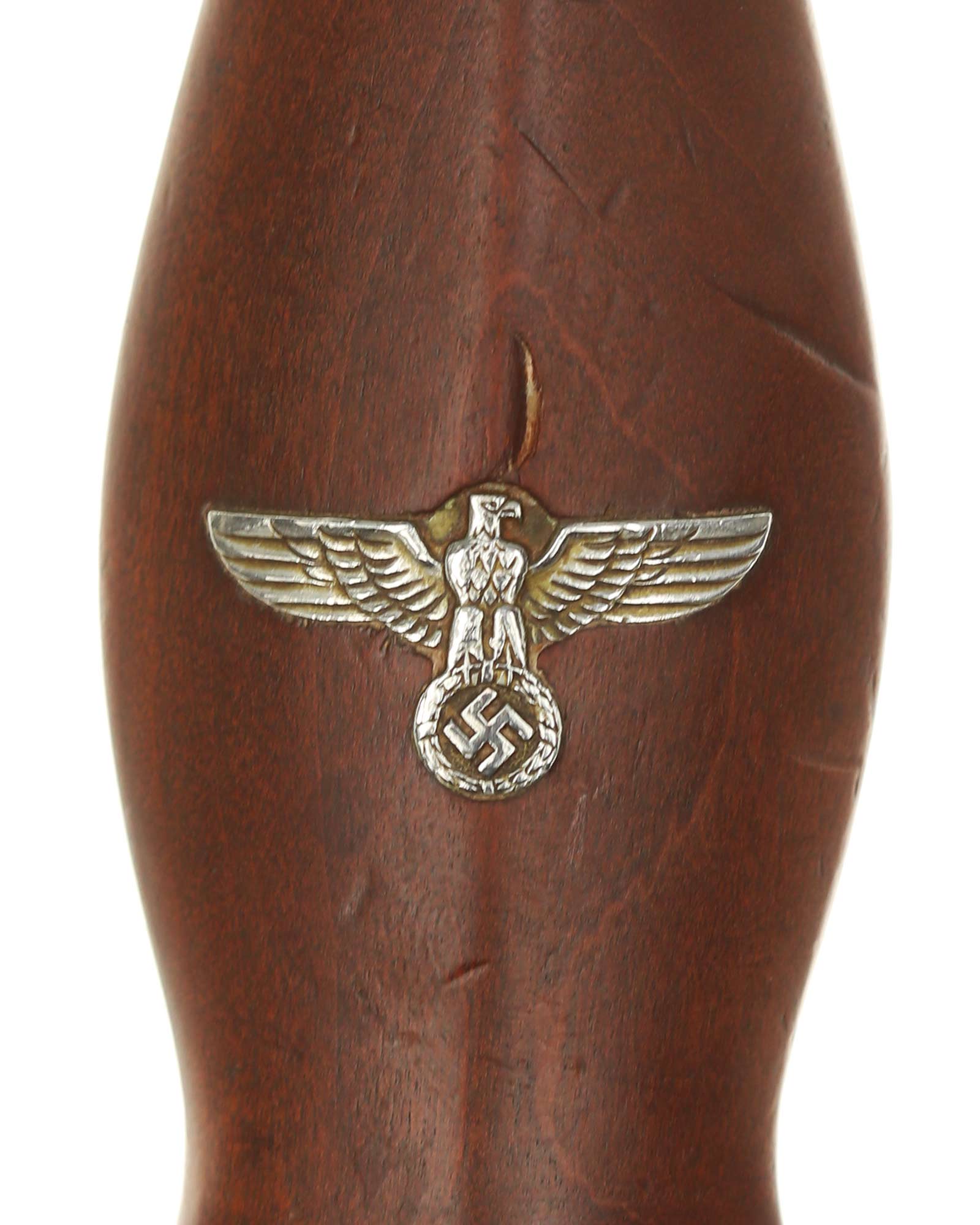 Рукоять: Рукоять из мореного в коричневый цвет дерева. Рукоять в верхней части имеет вставку в виде эмалевого глазка, в средней части – вставка в виде орла. Металлические элементы гарды изготовлены из мельхиора. Хвостовик клинка укреплен на верхней крестовине при помощи винта.
