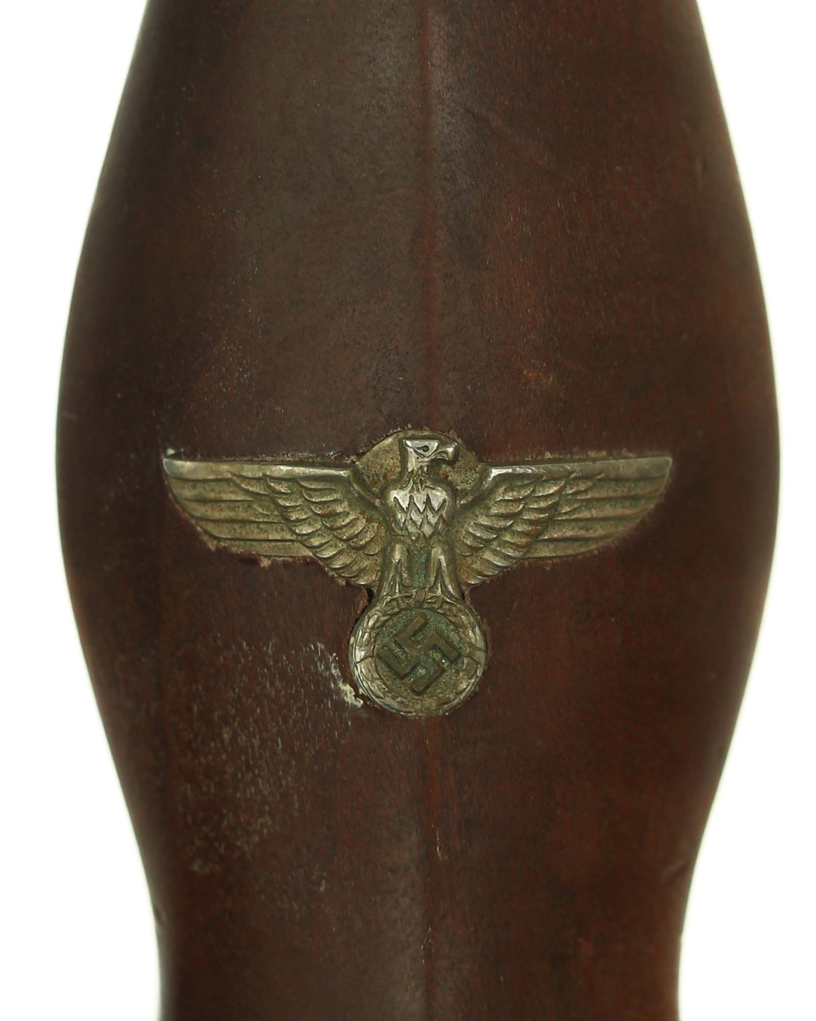Рукоять: Рукоять из мореного в коричневый цвет дерева. Рукоять в верхней части имеет вставку в виде эмалевого глазка, в средней части – вставка в виде орла. Металлические элементы гарды изготовлены из мельхиора. Хвостовик клинка укреплен на верхней крестовине при помощи винта.