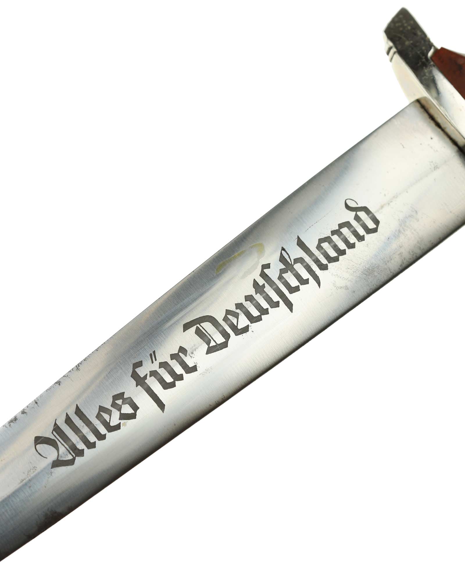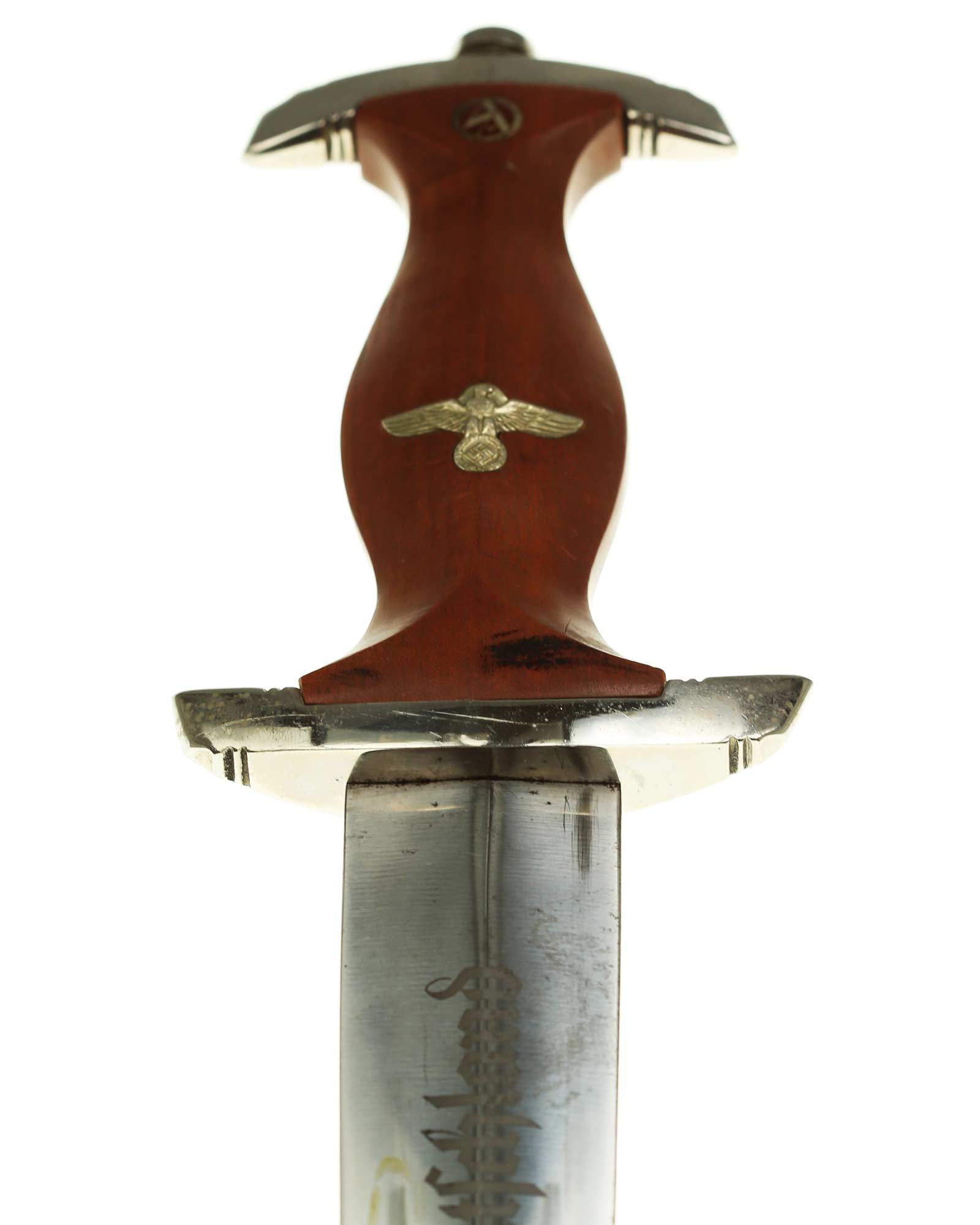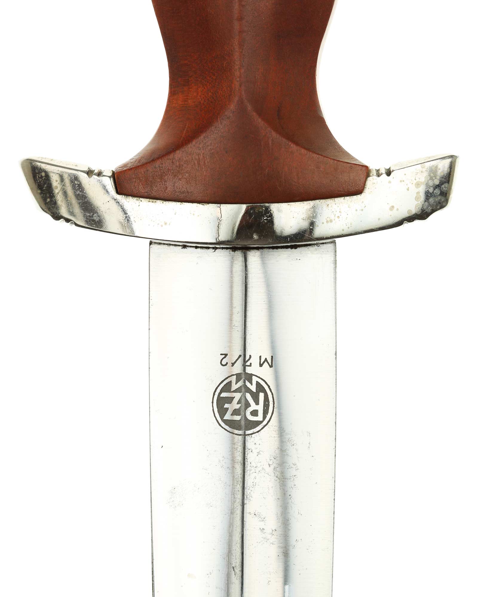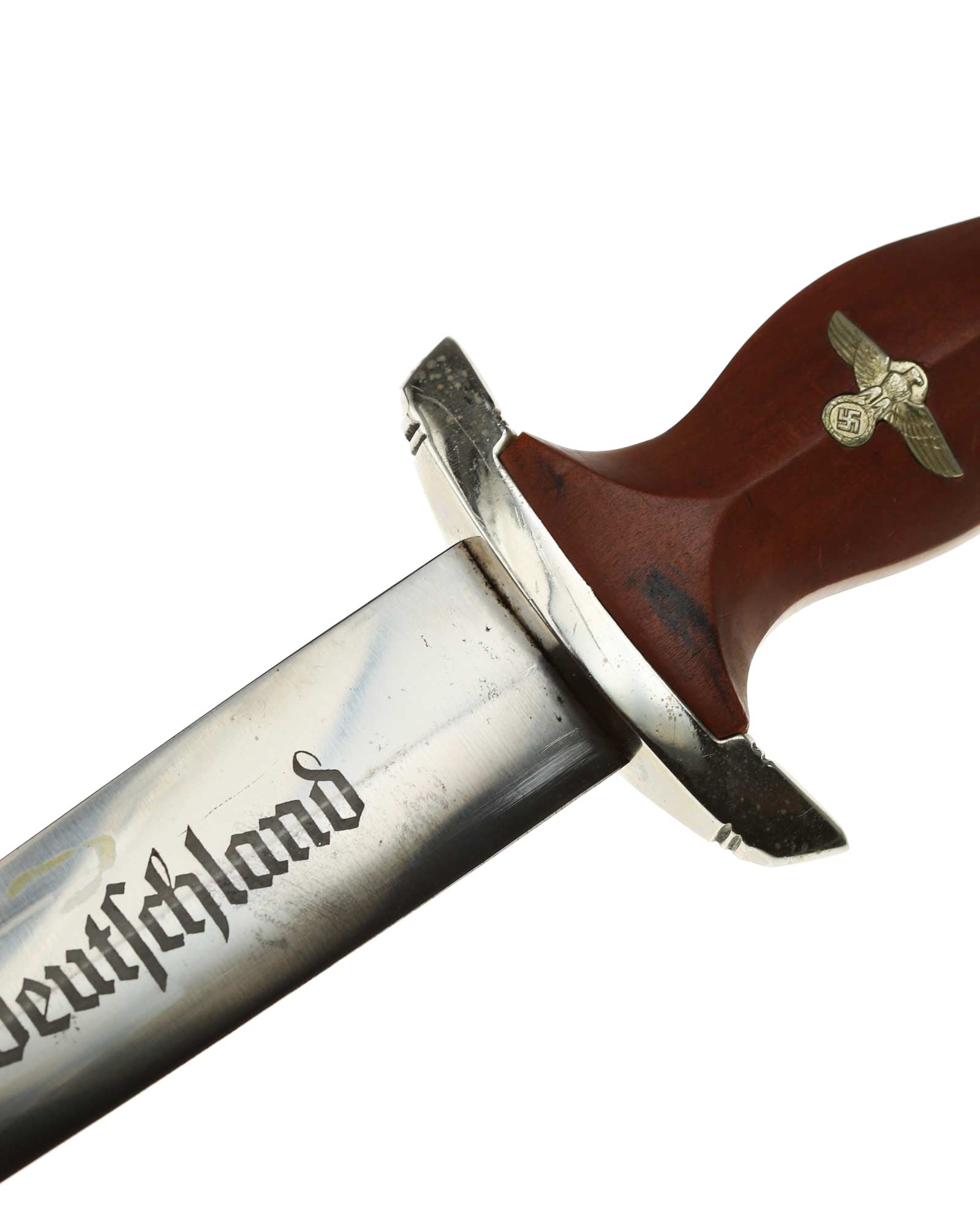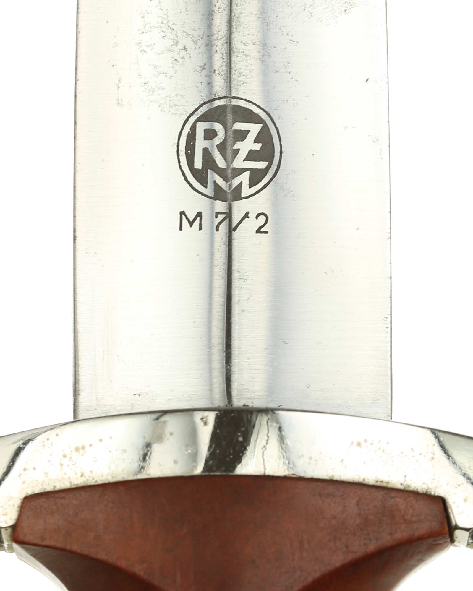 Клинок: Клинок классический кинжального типа, стальной, прямой, двулезвийный, с выраженным центральным ребром. На лицевой стороне нанесен травлением девиз SА «Alles für Deutschland» «Всё для Германии», на оборотной стороне у основания стоит совмещенное клеймо производителя Эмиль Фоос Золинген с кодом RZM M7/2 (Emil Voos Solingen).