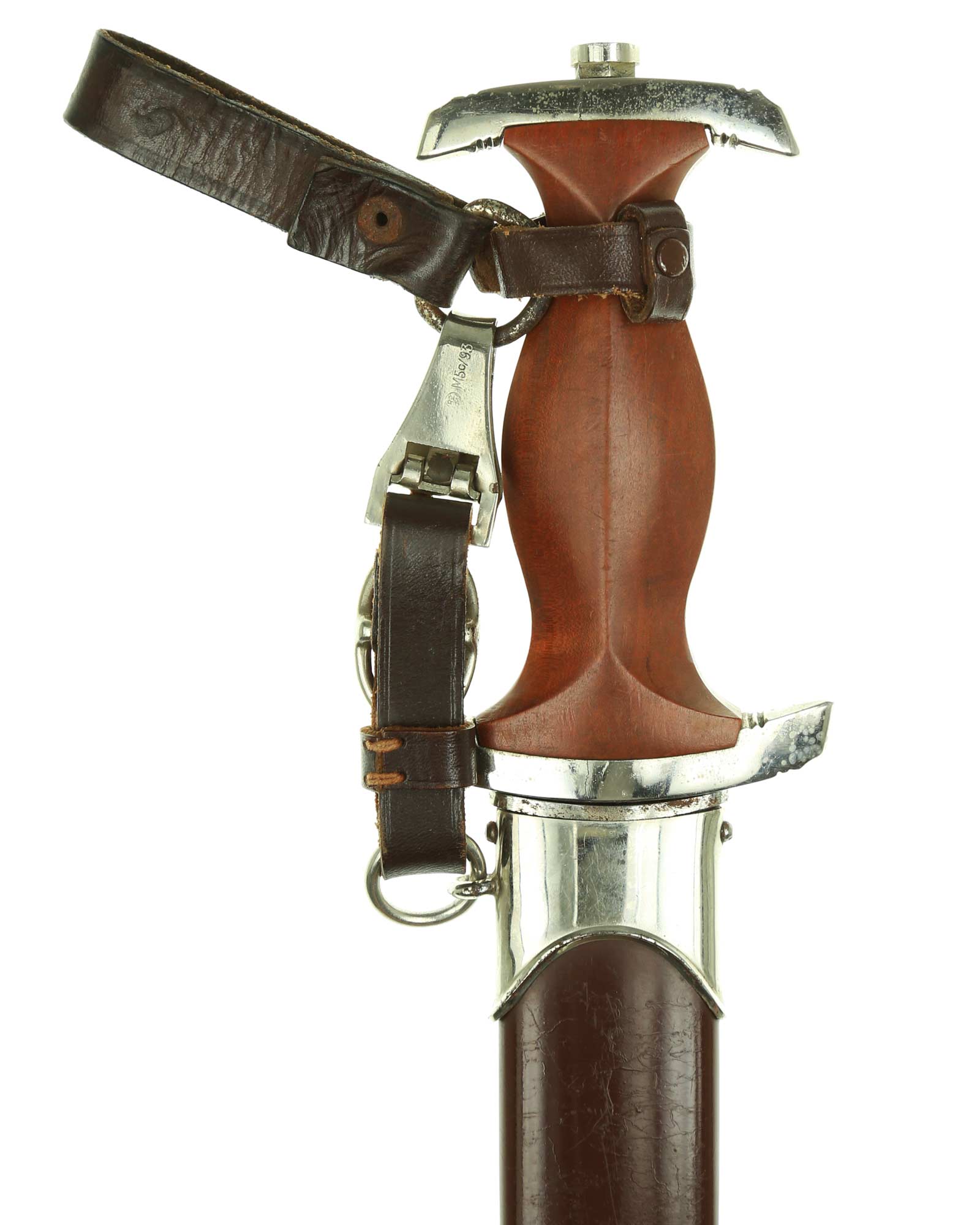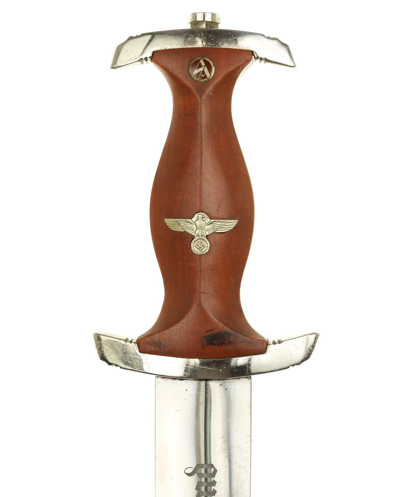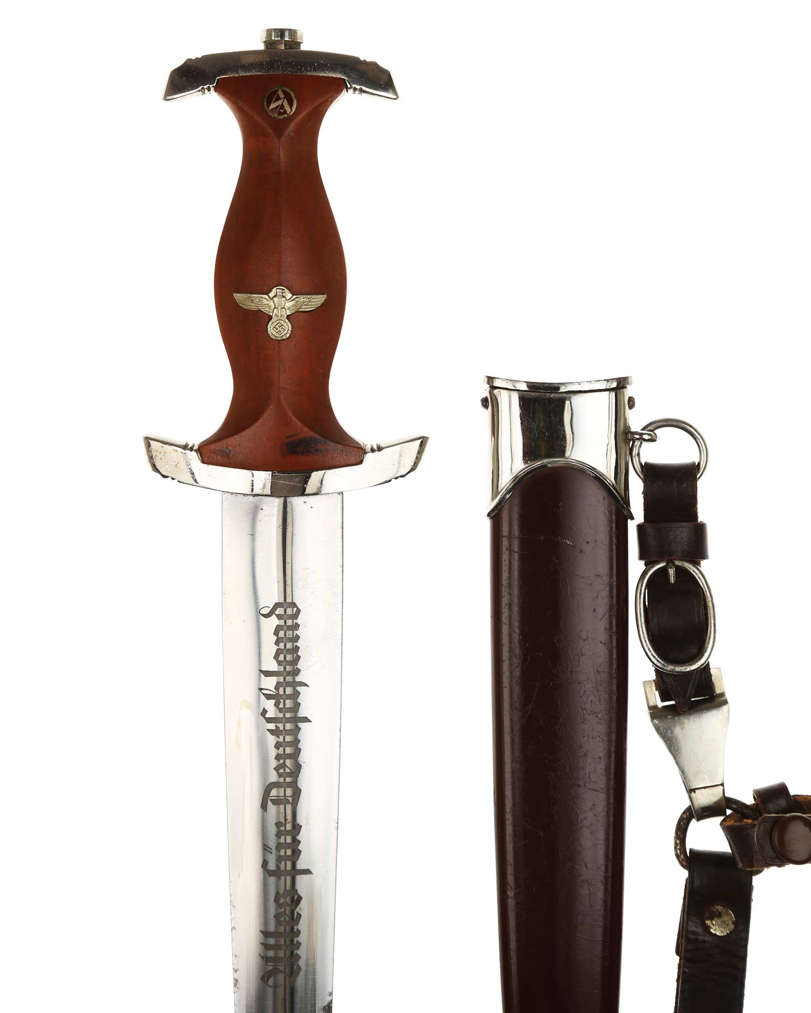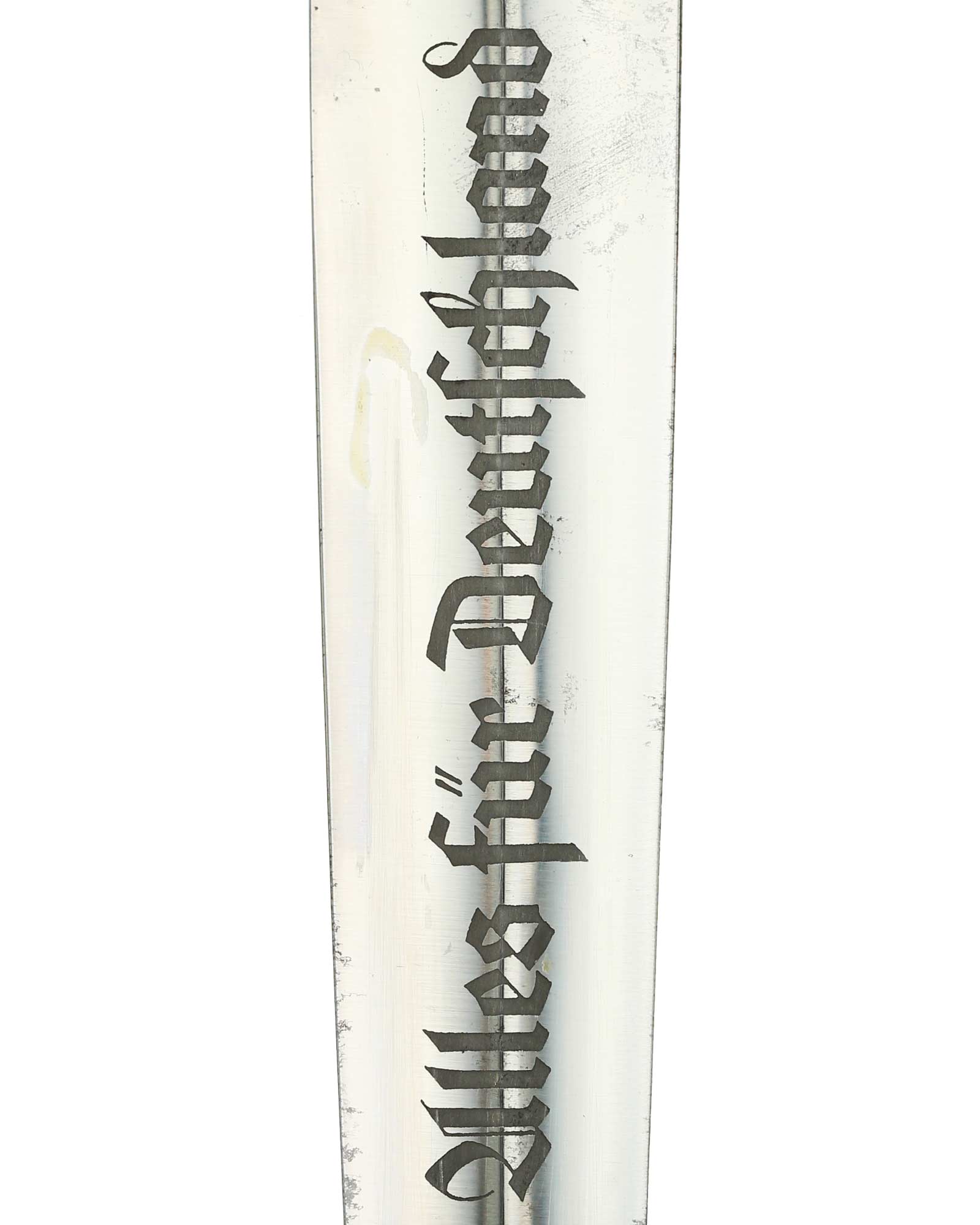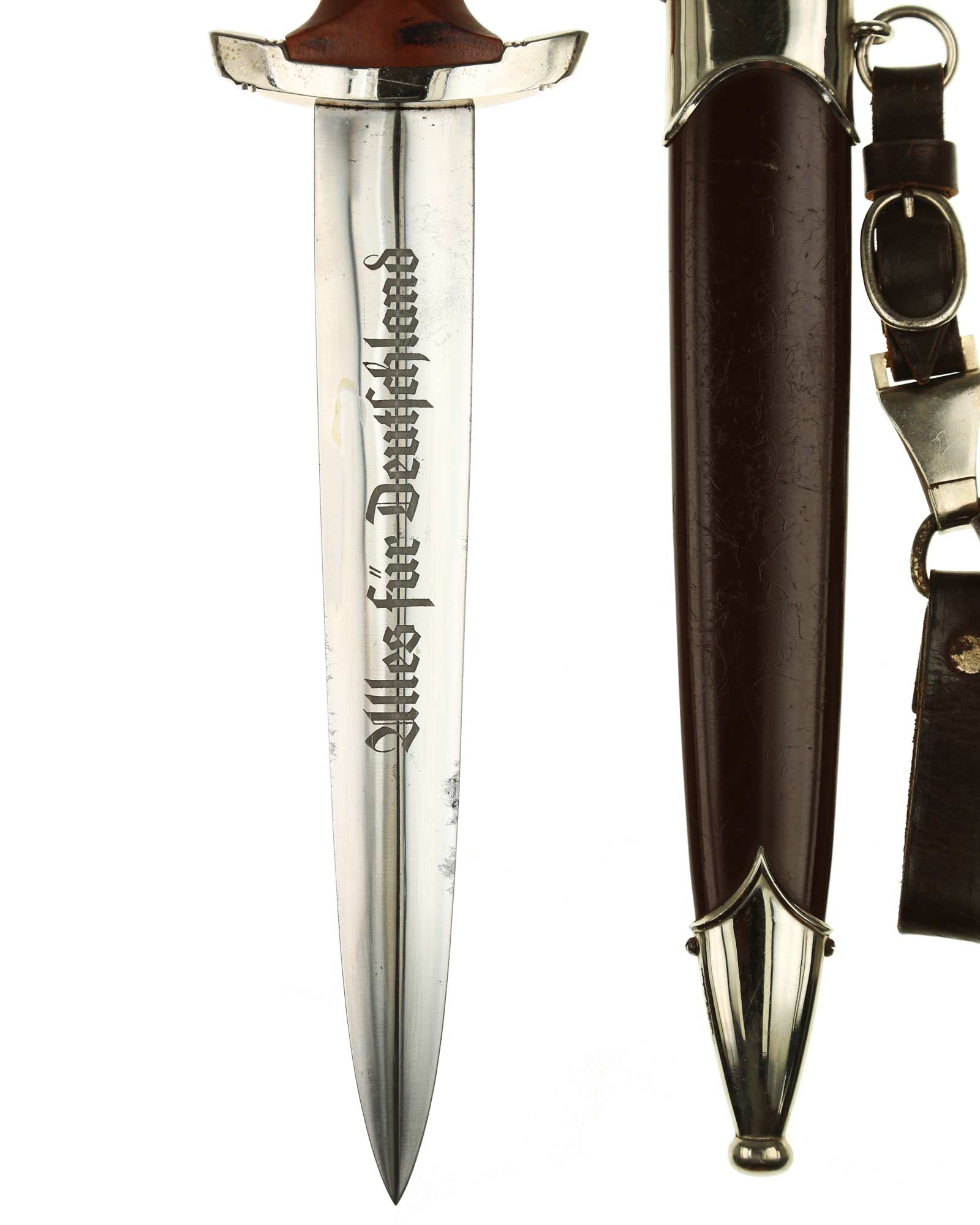 Клинок: Клинок классический кинжального типа, стальной, прямой, двулезвийный, с выраженным центральным ребром. На лицевой стороне нанесен травлением девиз SА «Alles für Deutschland» «Всё для Германии», на оборотной стороне у основания стоит совмещенное клеймо производителя Эмиль Фоос Золинген с кодом RZM M7/2 (Emil Voos Solingen).