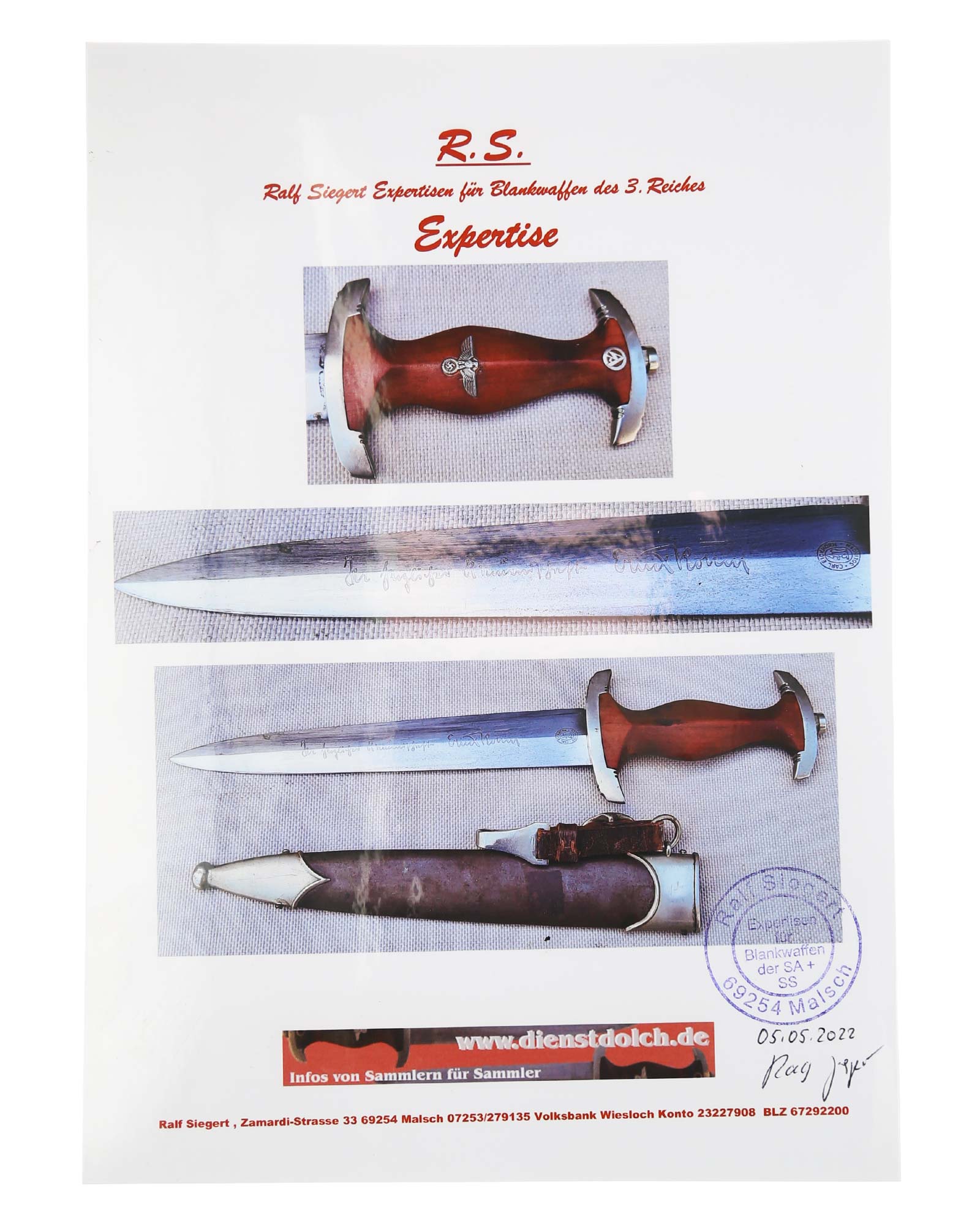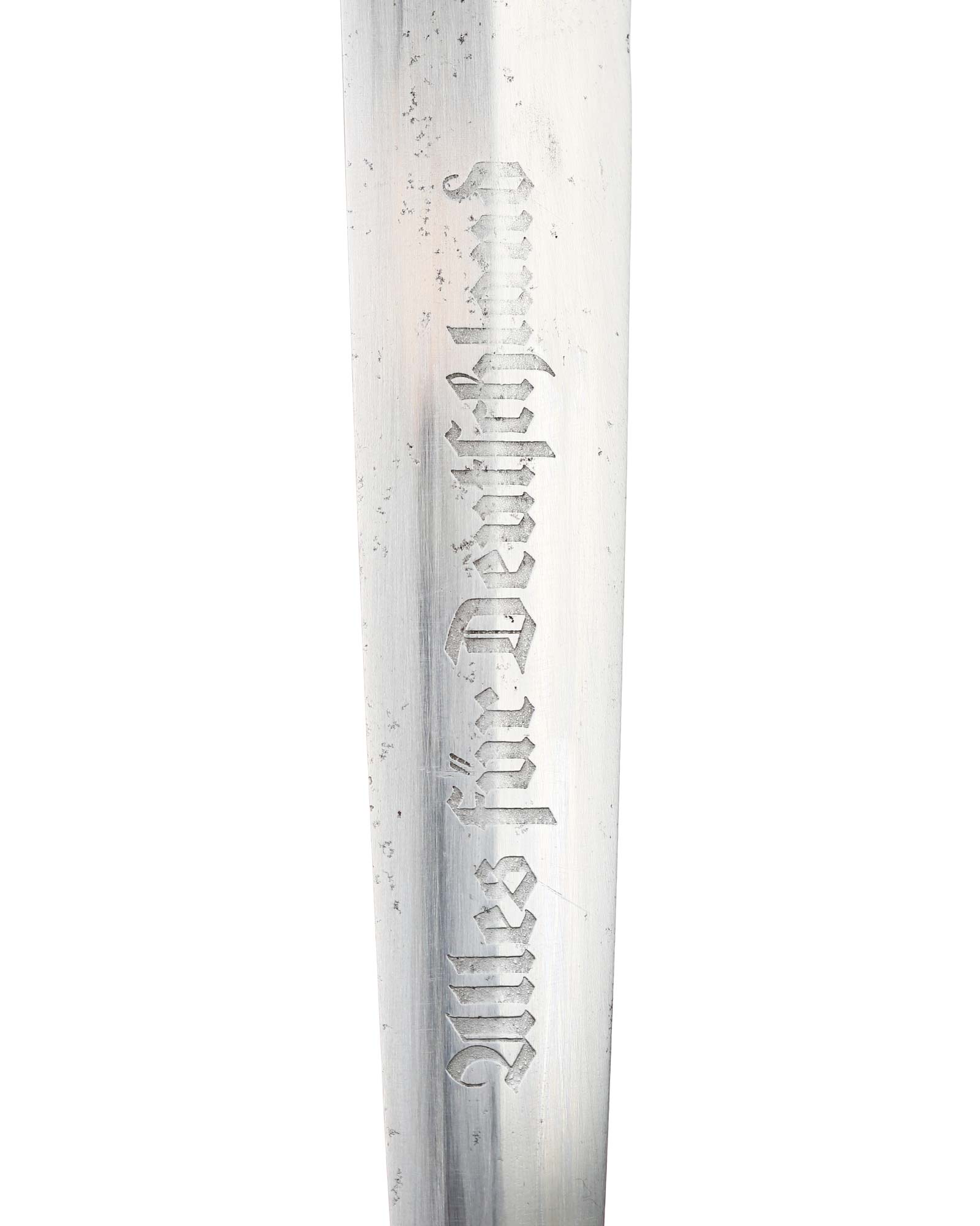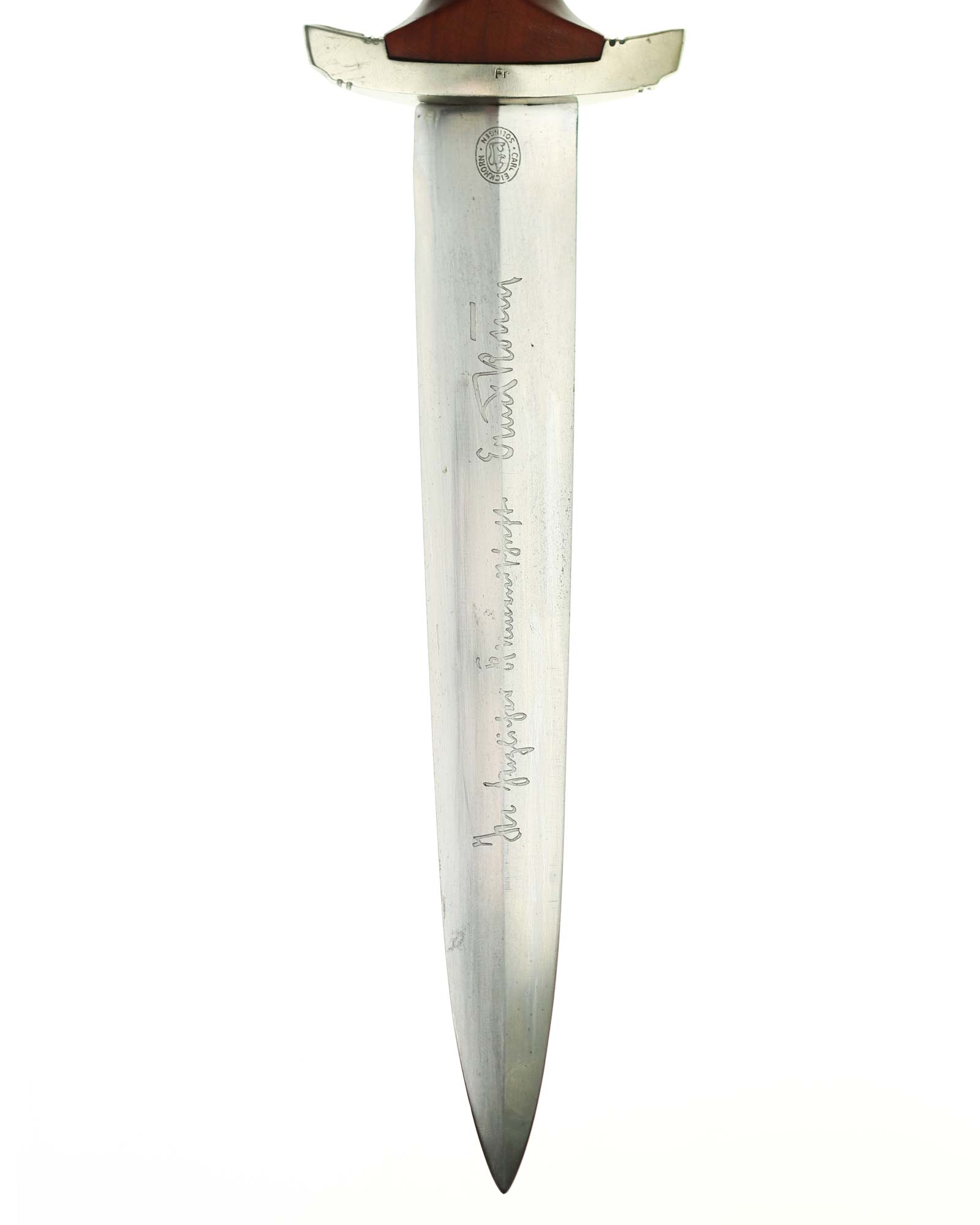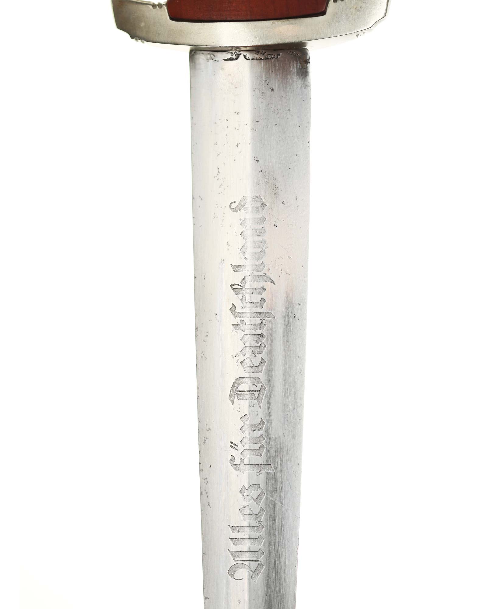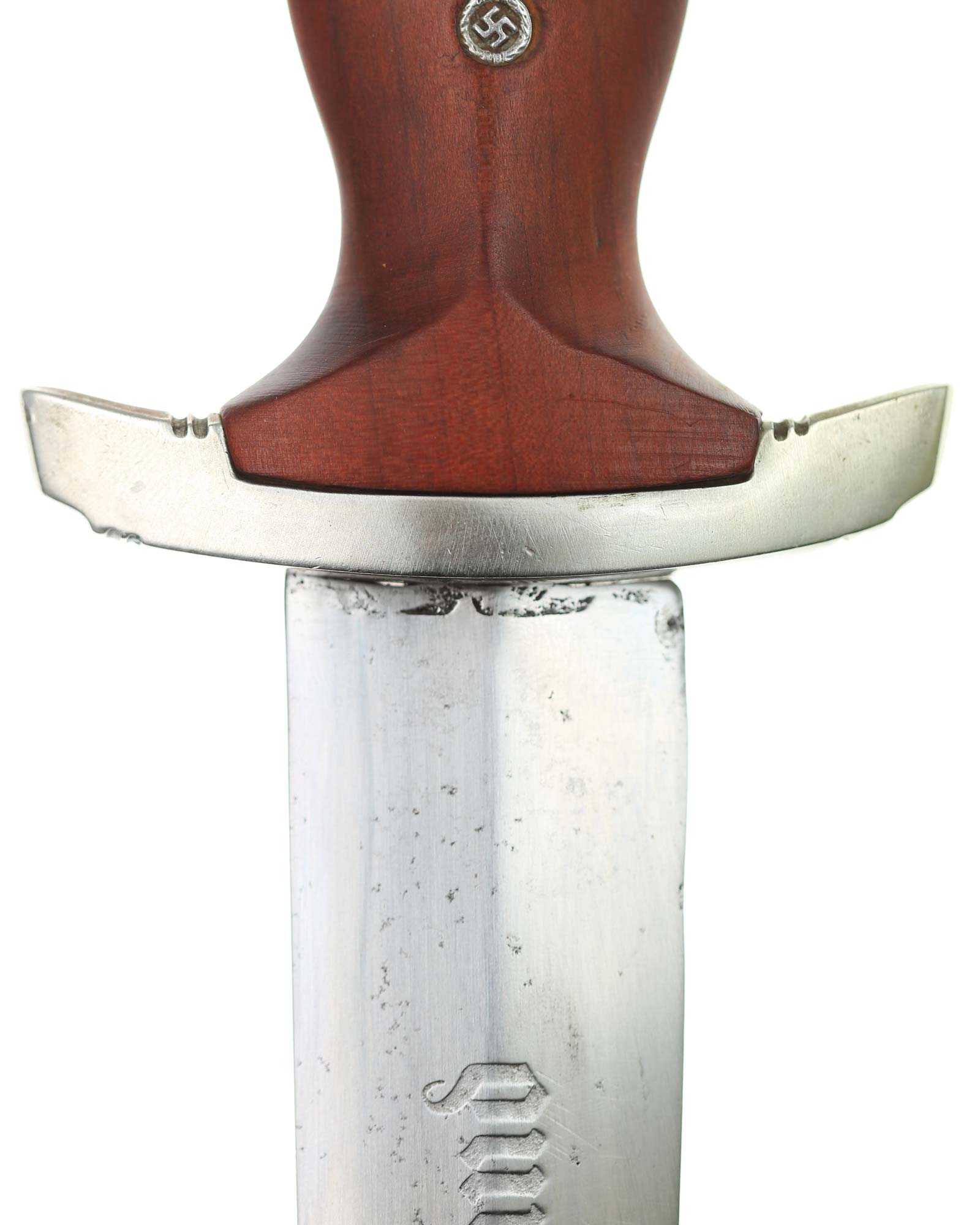 Клинок: Клинок стальной, прямой, двулезвийный, 4-гранный в сечении, без долов. На клинке готическим шрифтом нанесена надпись «Alles für Deutchland» ( «Всё для Германии»). На другой стороне нанесена надпись «ln herzlicher Kameradschaft Ernst Röhm» (В знак сердечной дружбы Эрнст Рём). Надписи и клейма: возле пяты клинка с тыльной стороны – травлёное клеймо «Carl Eickhorn Solingen» — клеймо немецкой фирмы «Карл Айкхорн Золинген».