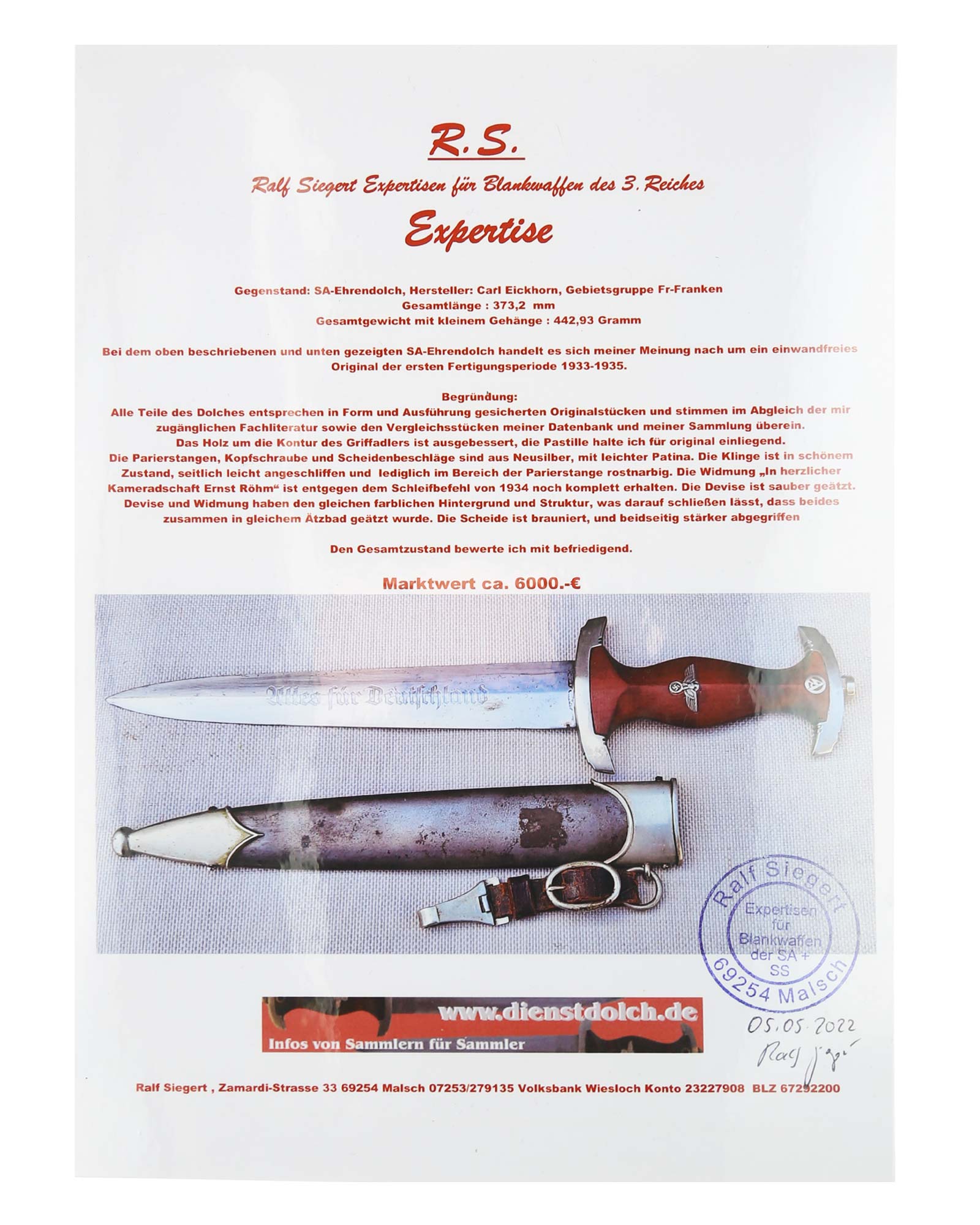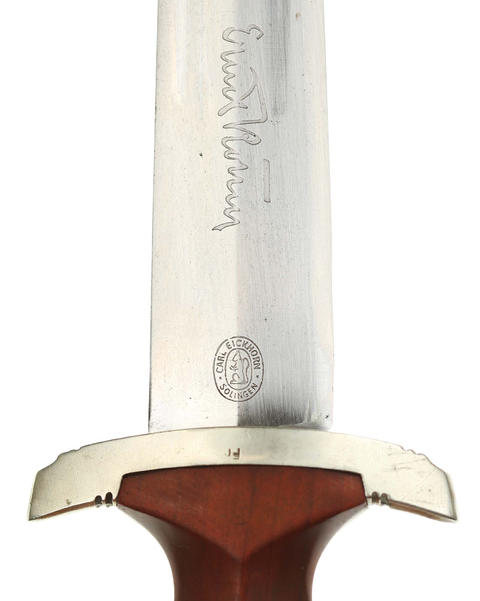 Наградной кинжал штурмовых отрядов СА образца 1933 года. Ранний период производства, 1933-1935 годы c подписью Эрнста Рема: ln herzlicher Kameradschaft Ernst Röhm. Производитель фирма Carl Eickhorn Solingen (Карл Айкхорн Золинген).