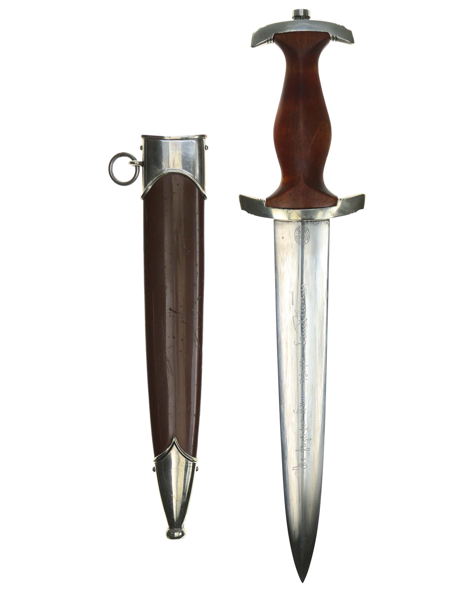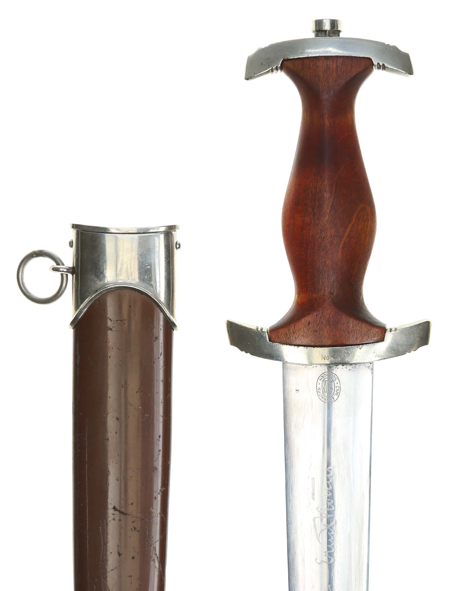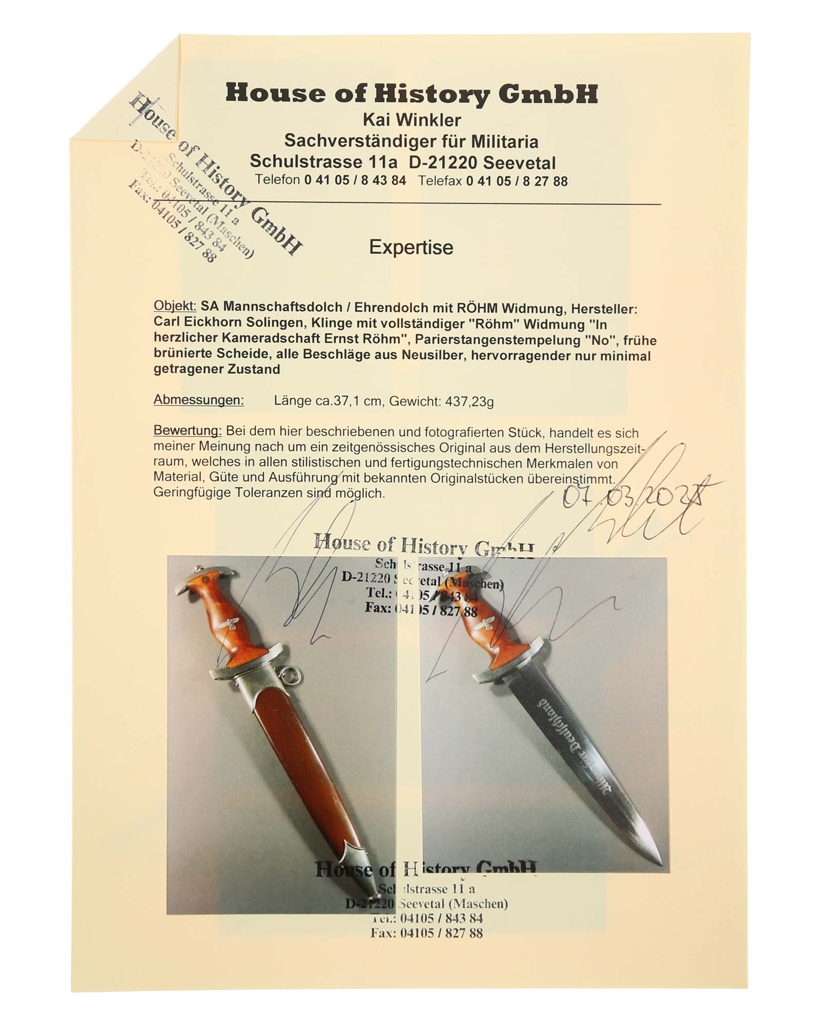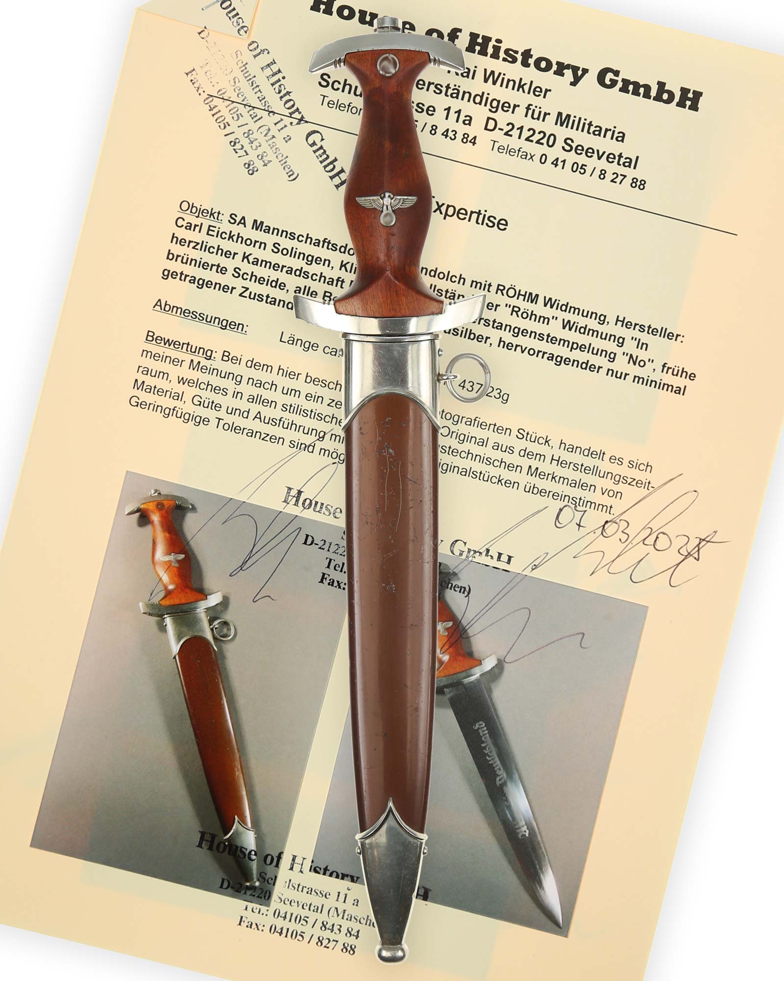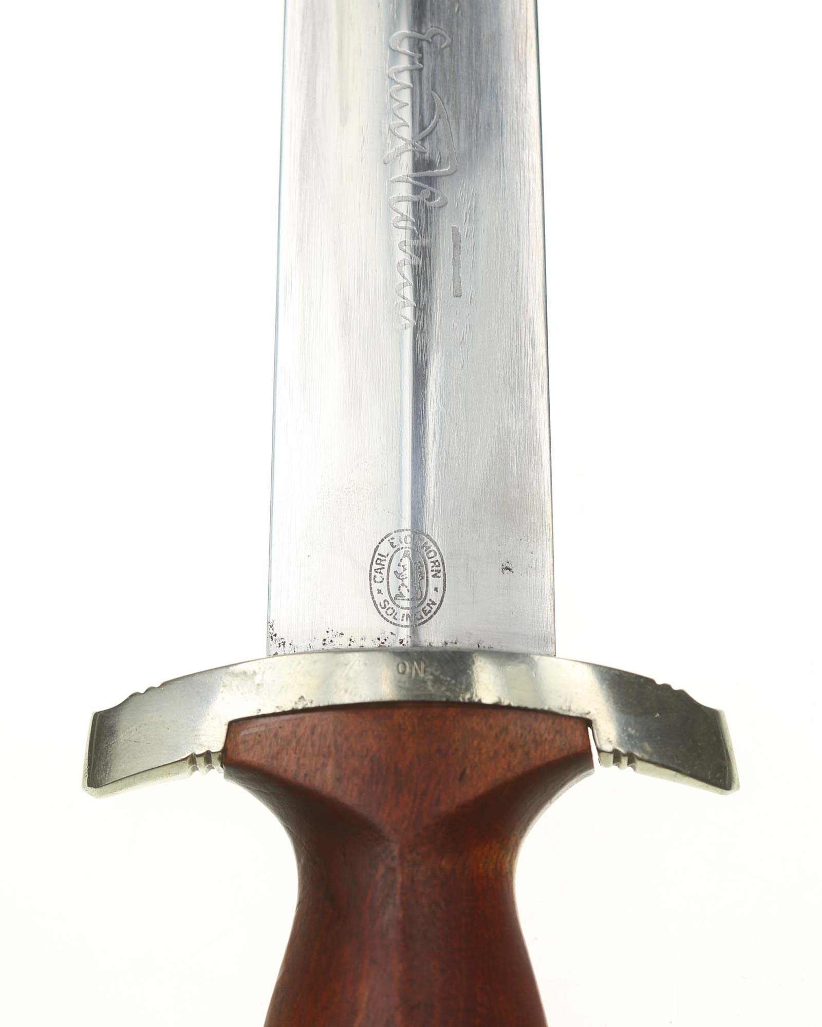 Наградной кинжал штурмовых отрядов СА образца 1933 года. Ранний период производства, 1933-1935 годы c подписью Эрнста Рема: ln herzlicher Kameradschaft Ernst Röhm. Производитель фирма Carl Eickhorn Solingen (Карл Айкхорн Золинген).