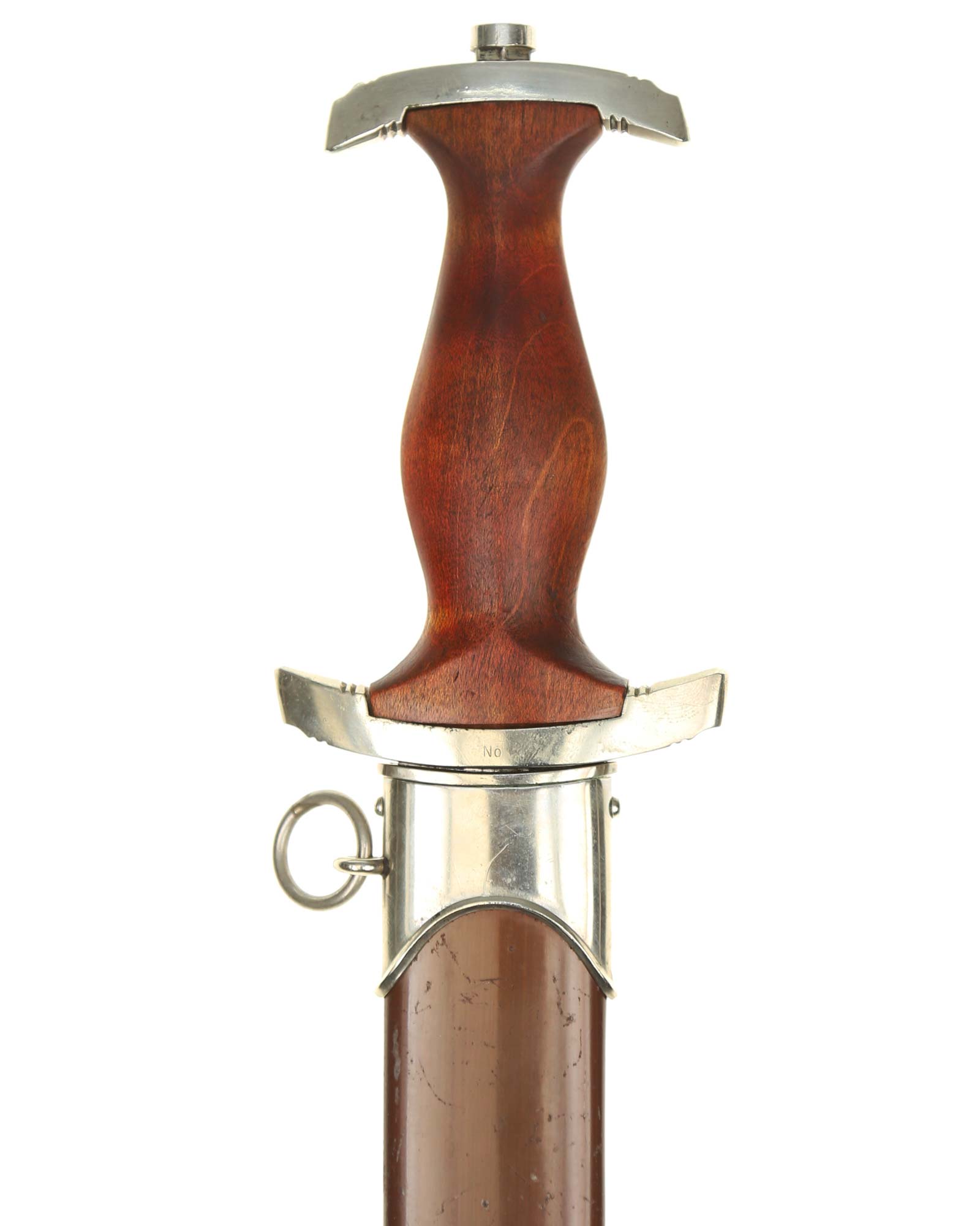 Рукоять: Эфес состоит из рукояти и крестовины. Рукоять, крепящаяся на полосу всадным способом, – фигурная, деревянная, тонированная в светло-коричневый цвет, с расширениями по срезам и в средней части, с выраженной центральной гранью. На лицевой стороне рукояти вверху в дерево врезана круглая эмблема СА, покрытая эмалью; в средней части рукояти – металлический знак в виде стилизованного изображения раскинувшего крылья орла, держащего в когтях венок со свастикой. Навершие рукояти С-образное, белого металла, с концами, чуть загнутыми вниз; на навершии сверху расположена круглая гайка, навинчивающаяся на хвостовик клинка. Крестовина С-образная, белого металла, с концами, чуть загнутыми вверх, в несколько увеличенном и перевернутом виде копирует навершие рукояти. На гарде с тыльной стороны – буква «No» Северное море.