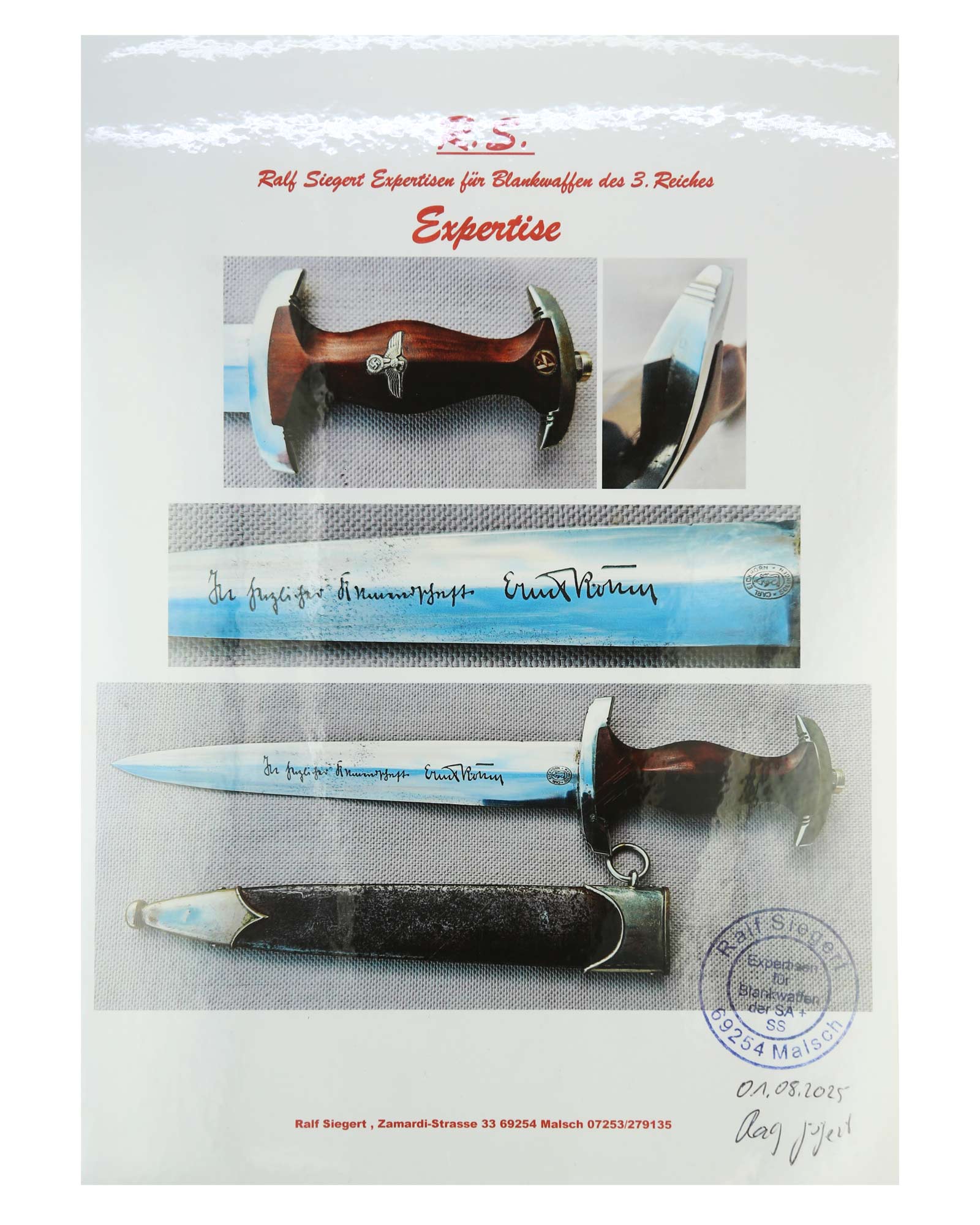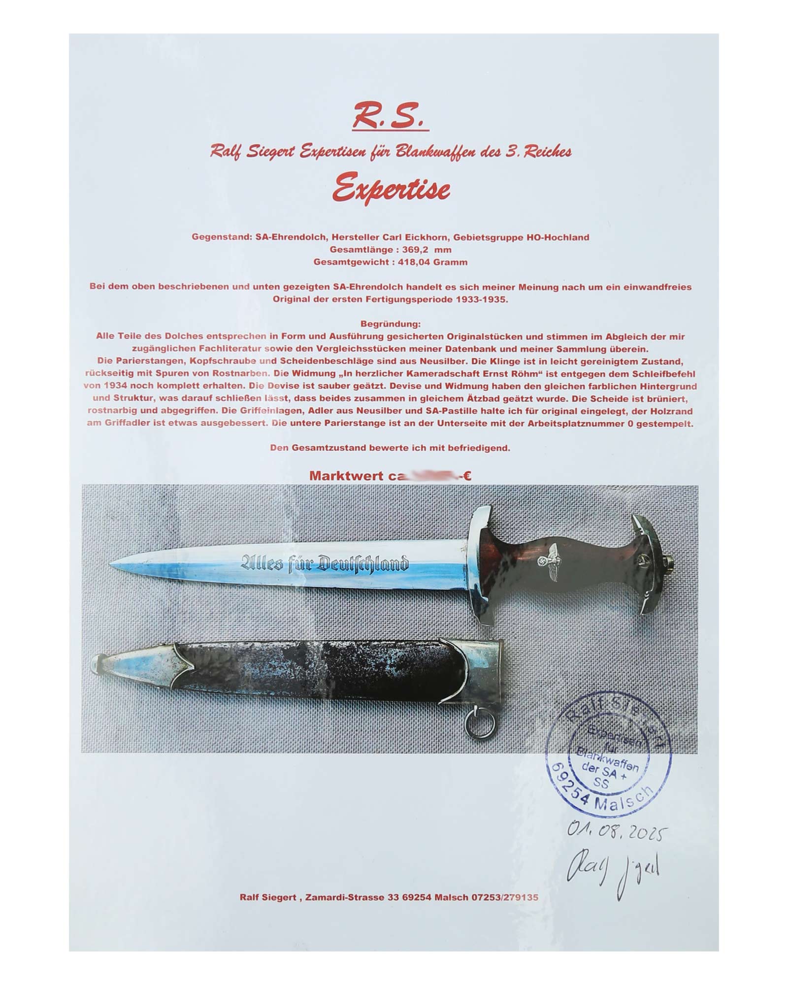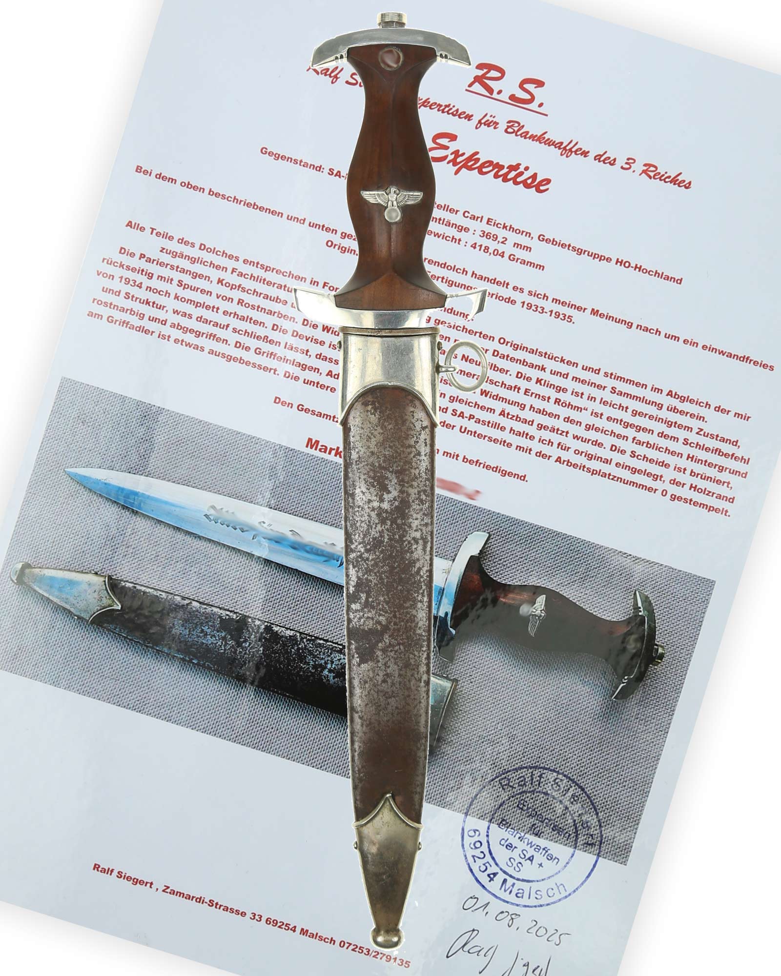 Наградной кинжал штурмовых отрядов СА образца 1933 г.. Ранний период производства, 1933-1935 годы c подписью Эрнста Рема: ln herzlicher Kameradschaft Ernst Röhm. Производитель фирма Carl Eickhorn Solingen (Карл Айкхорн Золинген). Длина в ножнах 36,9 см