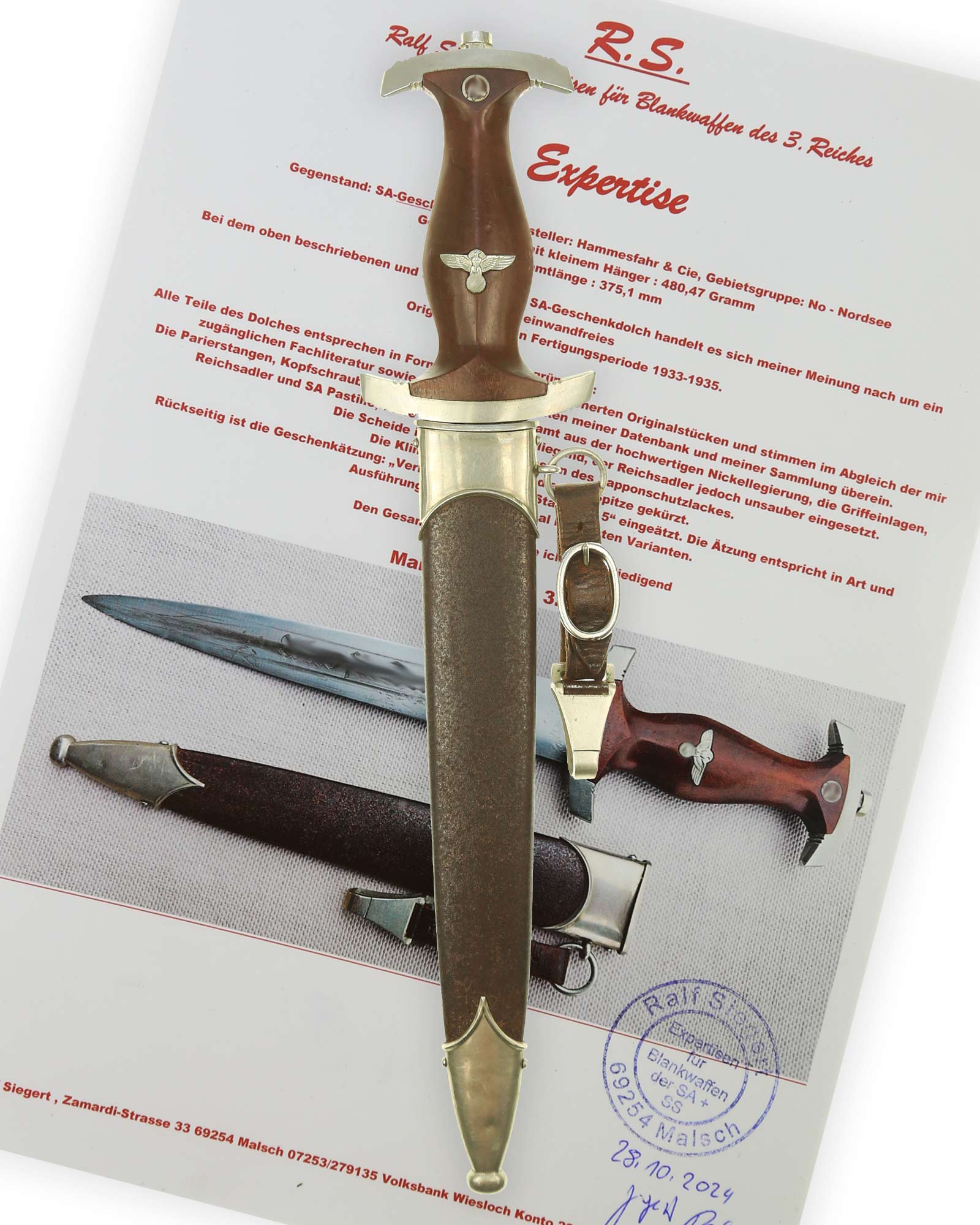 Наградной кинжал членов штурмовых отрядов СА образца 1933 года. Ранний период производства, 1933-1935 годы. Производитель фирма Hammesfahr & Cie. Solingen (Хаммесфар и Ко., Золинген). Длина в ножнах 37,5 см.