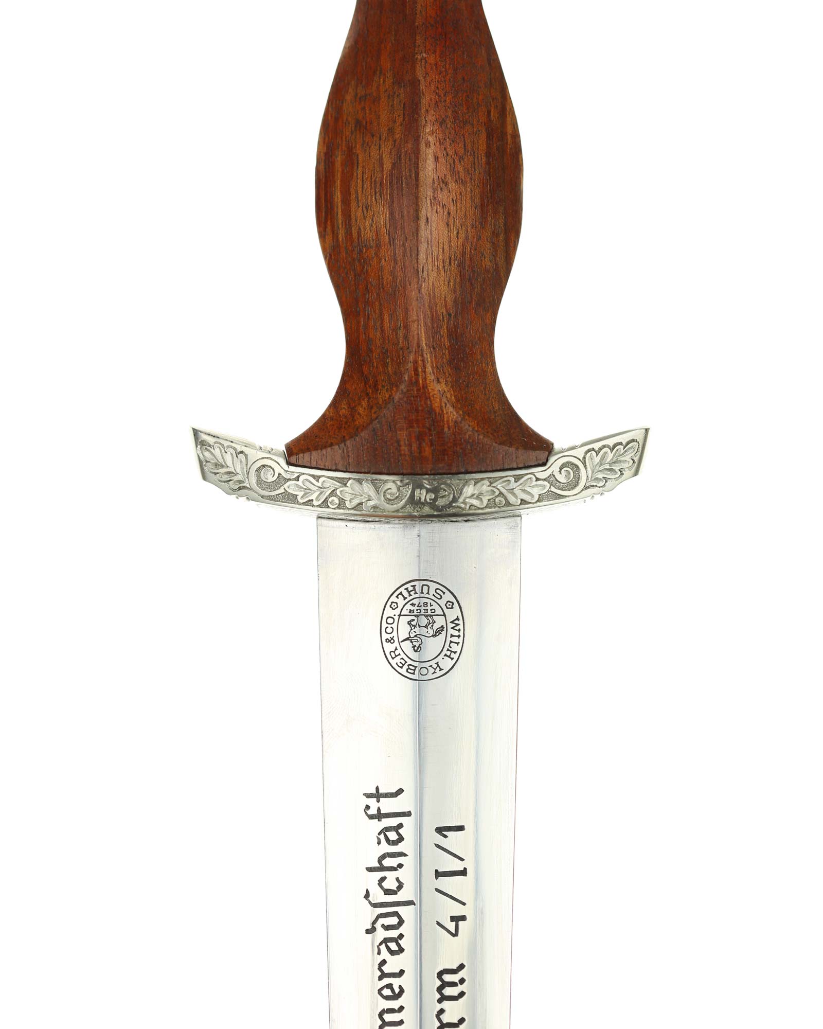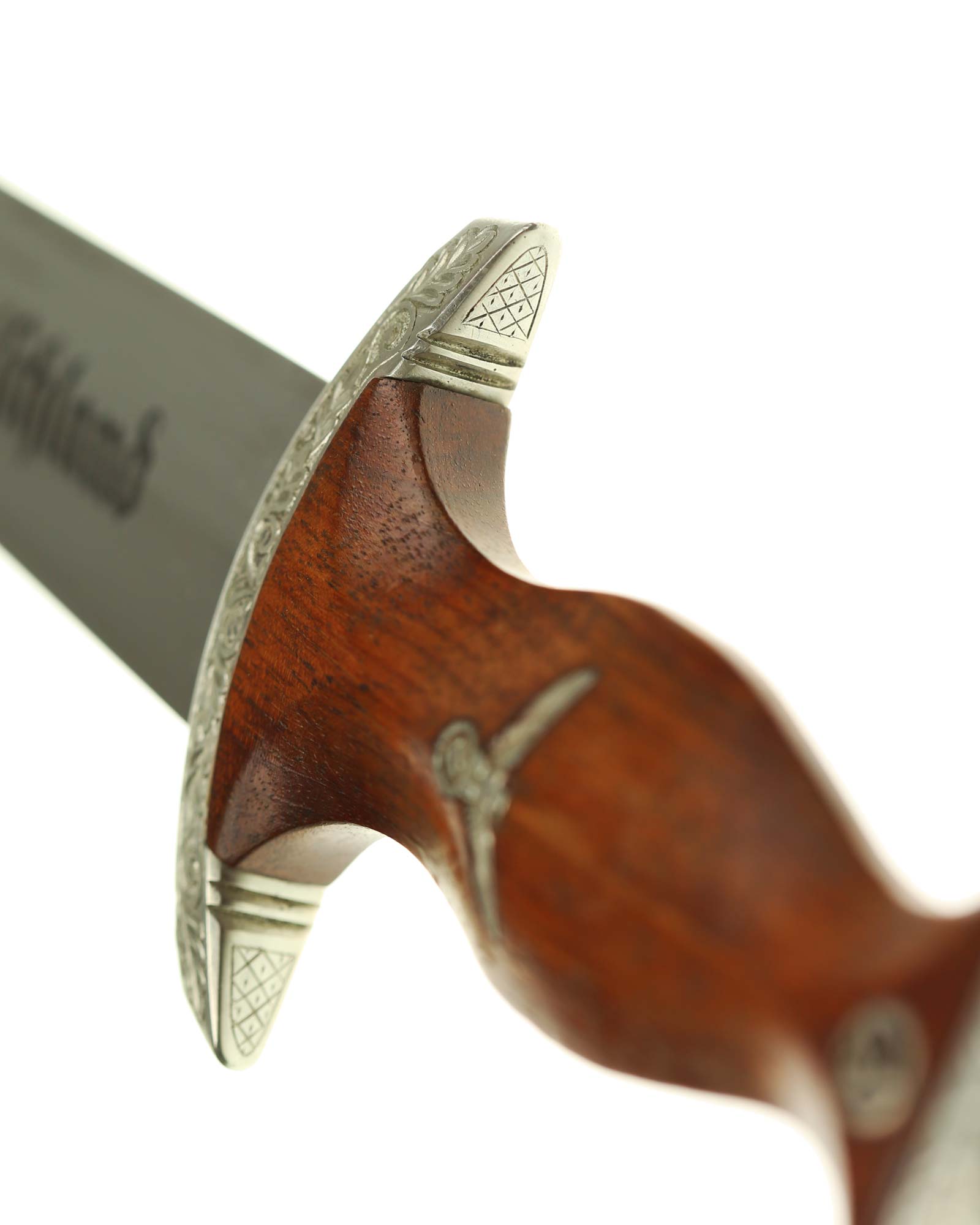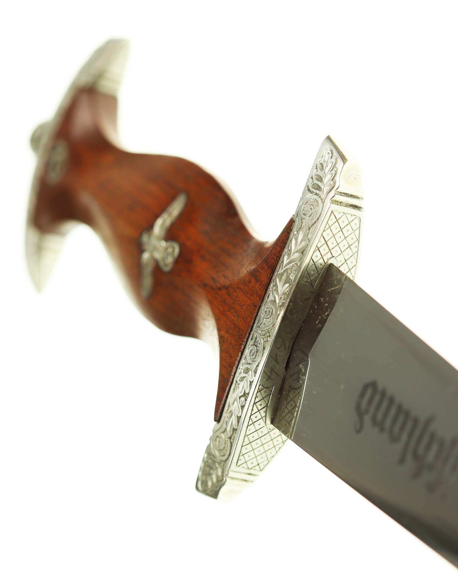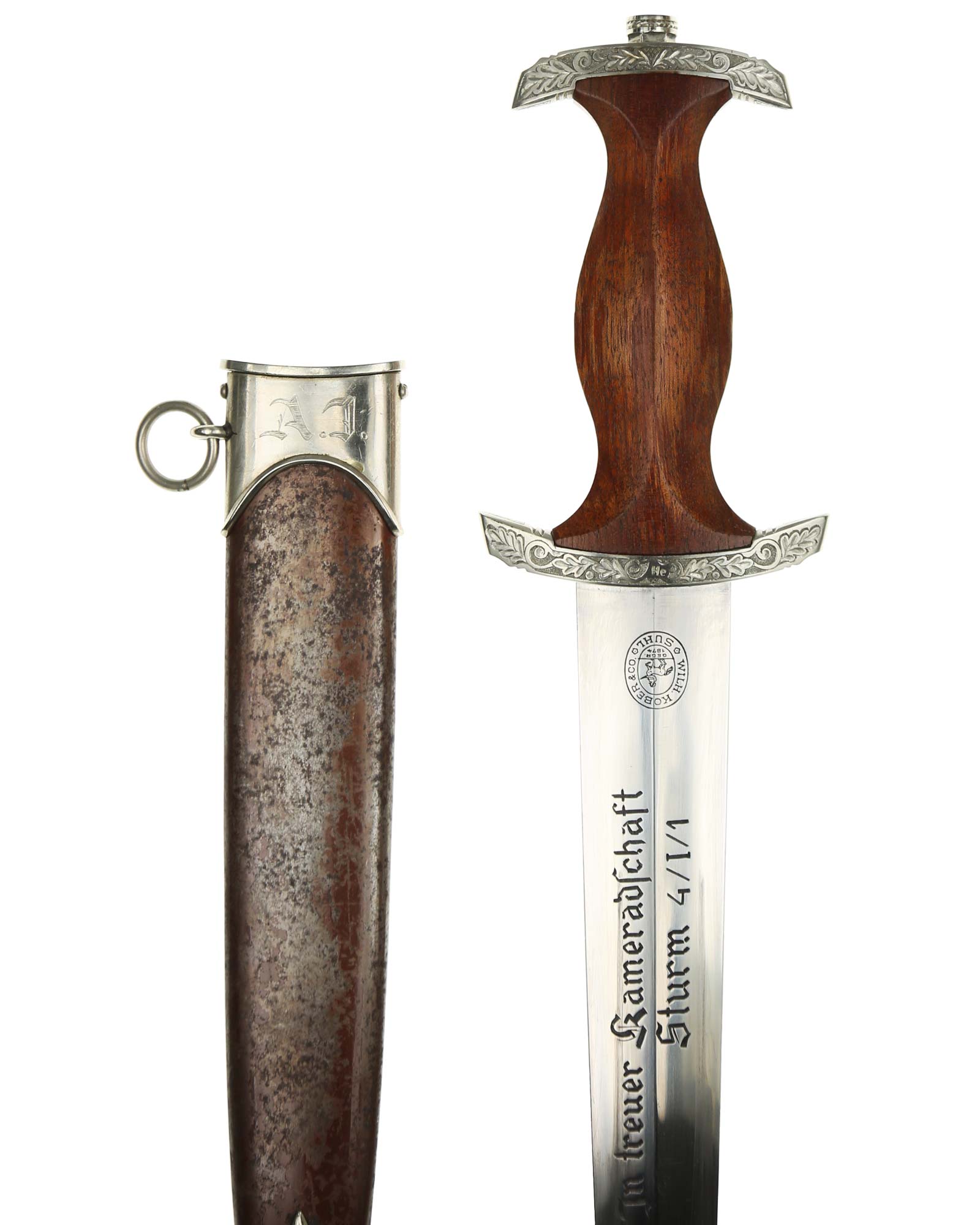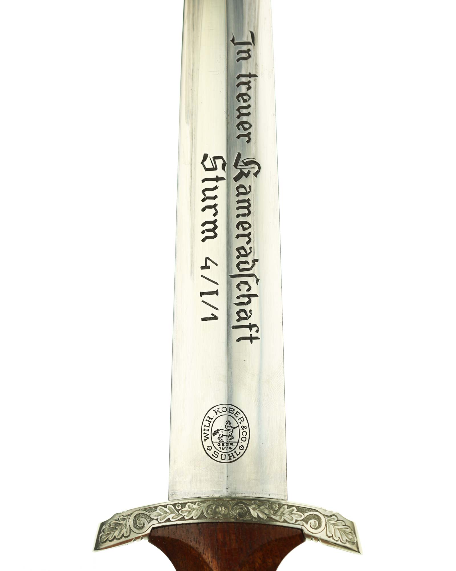Клинок: Клинок стальной, прямой, двулезвийный, 4-гранный в сечении, без долов. На клинке готическим шрифтом нанесена надпись «Alles für Deutchland» ( «Всё для Германии»). На другой стороне нанесена надпись «In treuer Kameradschaft Sturm | 4/I/1» (В верном товариществе Штурм). Надписи и клейма: возле пяты клинка с тыльной стороны – «Willhelm Kober & Co Suhl» — клеймо немецкой фирмы «Вильгельм Кобер Зуль».