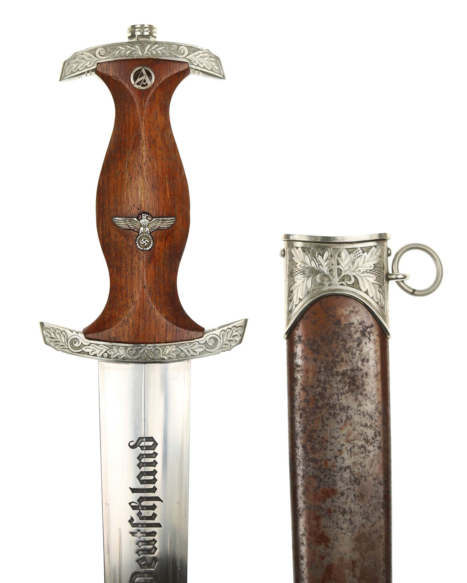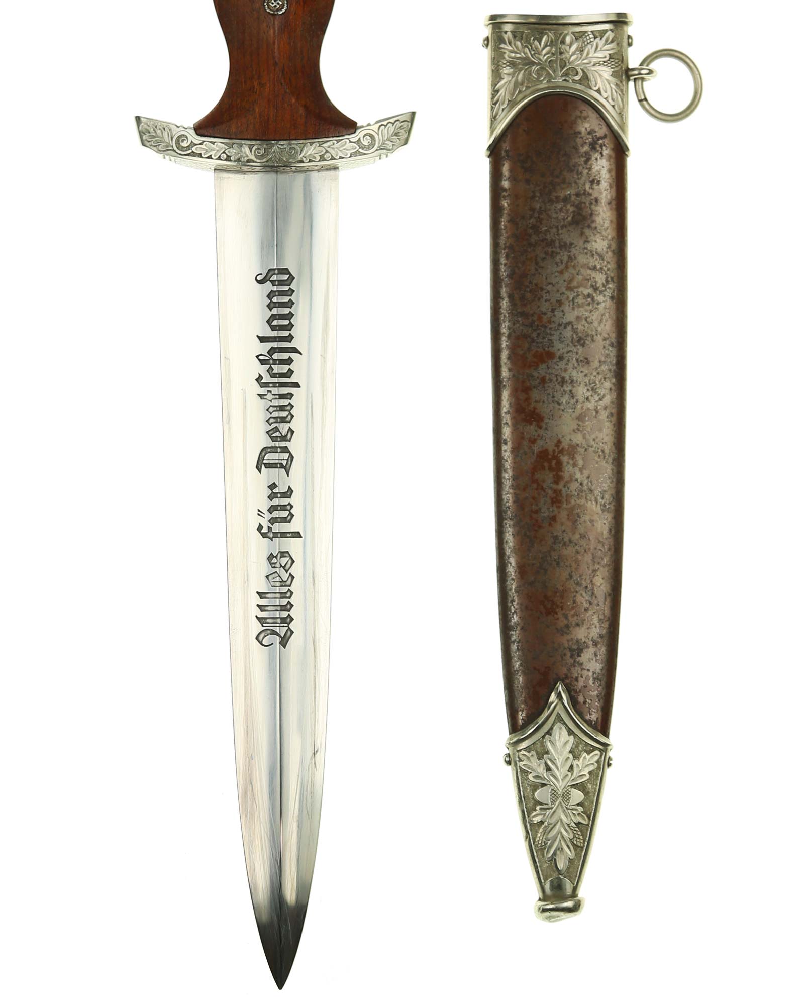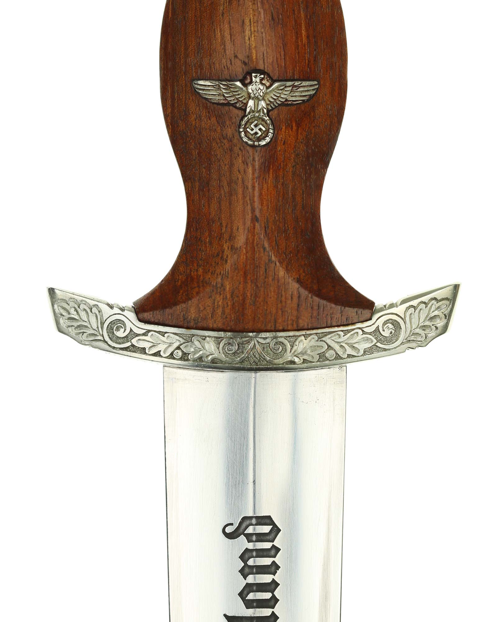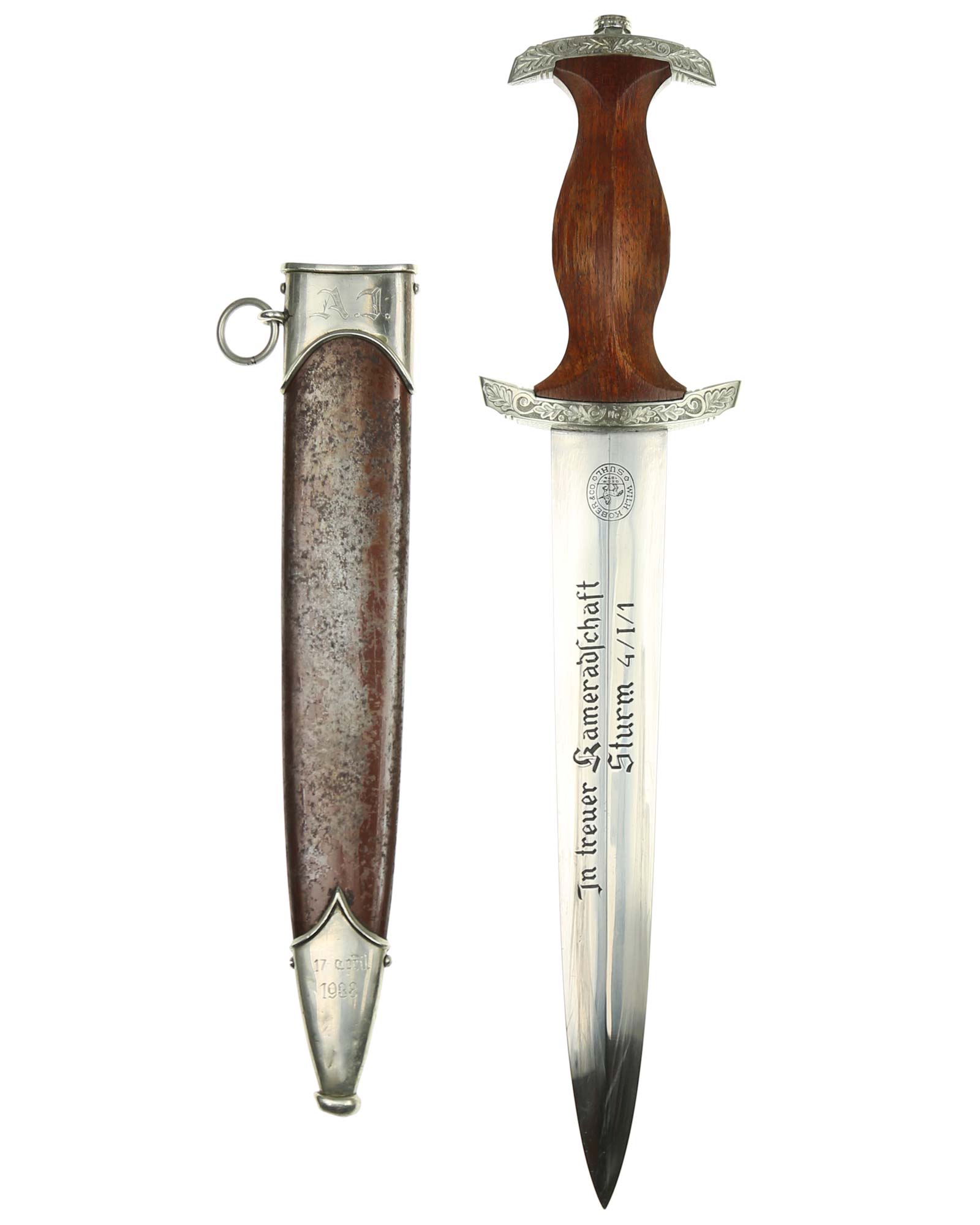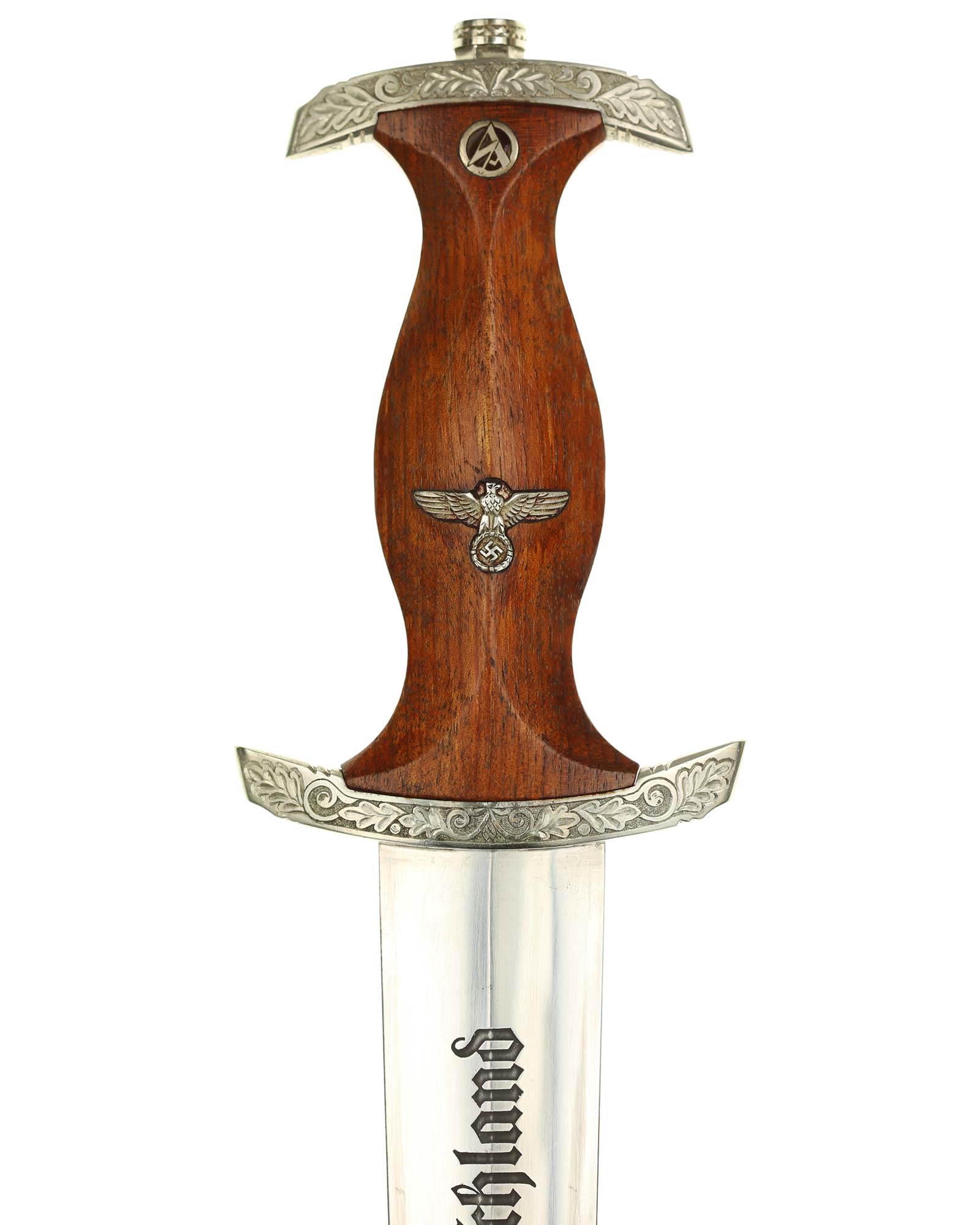 Клинок: Клинок стальной, прямой, двулезвийный, 4-гранный в сечении, без долов. На клинке готическим шрифтом нанесена надпись «Alles für Deutchland» ( «Всё для Германии»). На другой стороне нанесена надпись «In treuer Kameradschaft Sturm | 4/I/1» (В верном товариществе Штурм). Надписи и клейма: возле пяты клинка с тыльной стороны – «Willhelm Kober & Co Suhl» — клеймо немецкой фирмы «Вильгельм Кобер Зуль».
