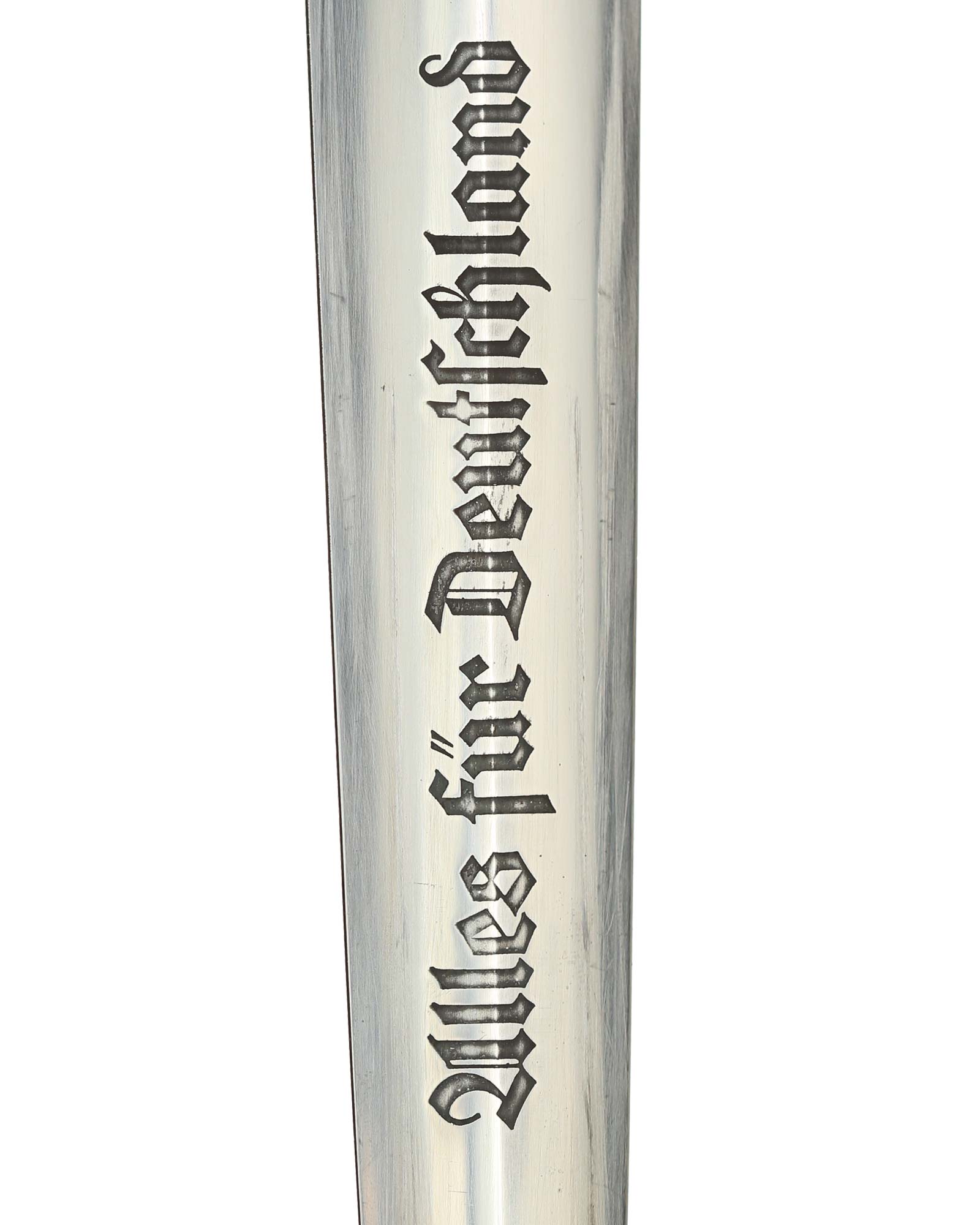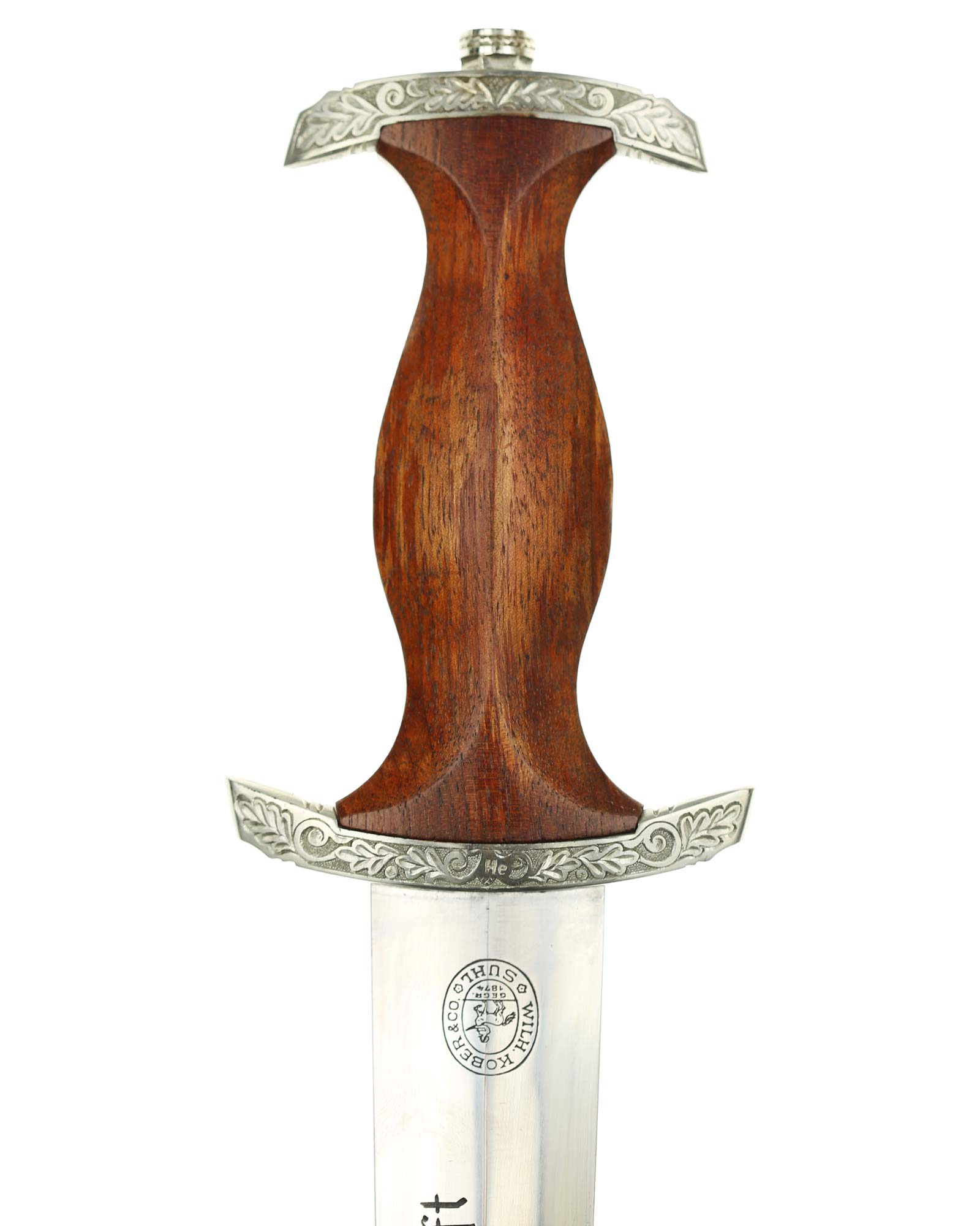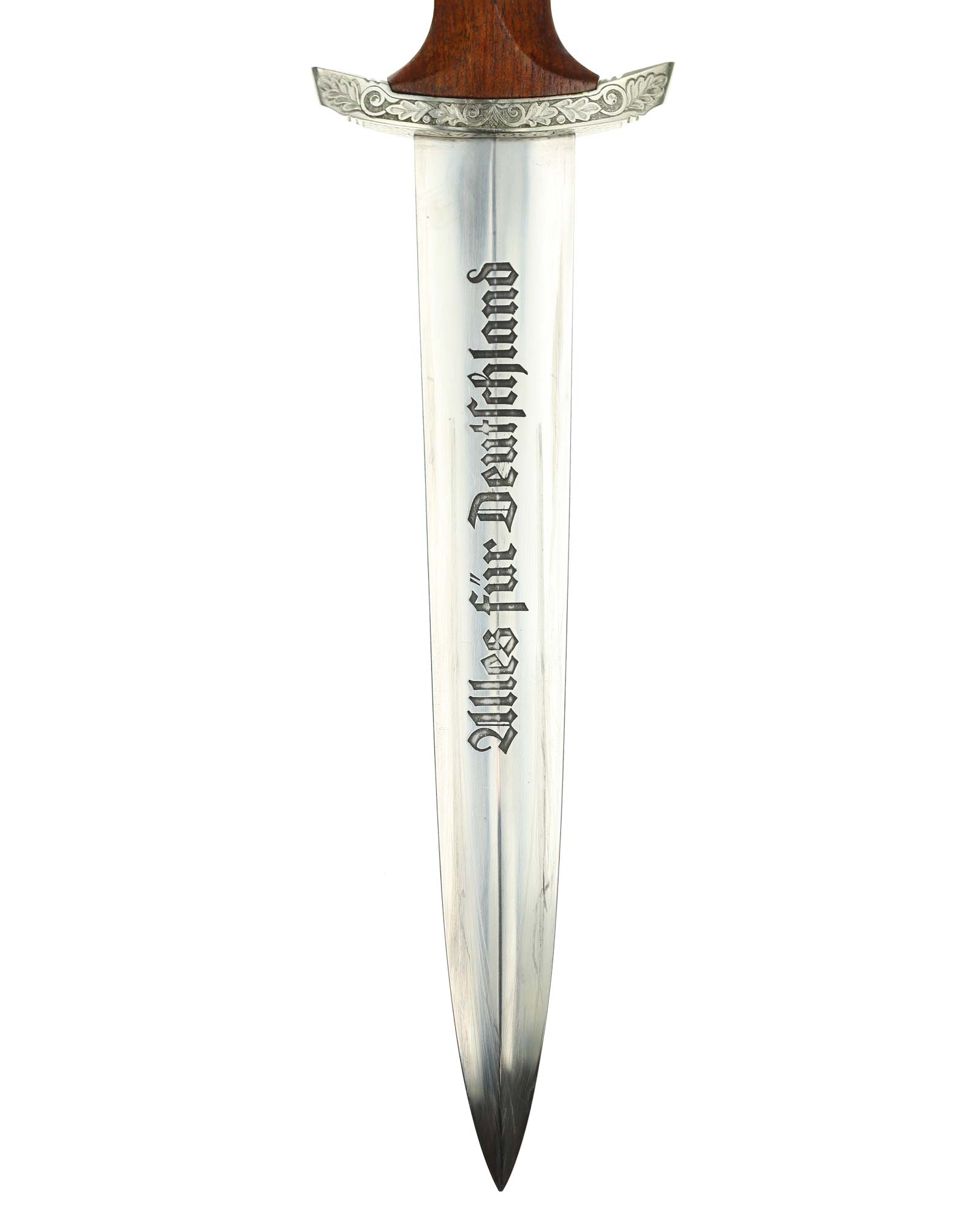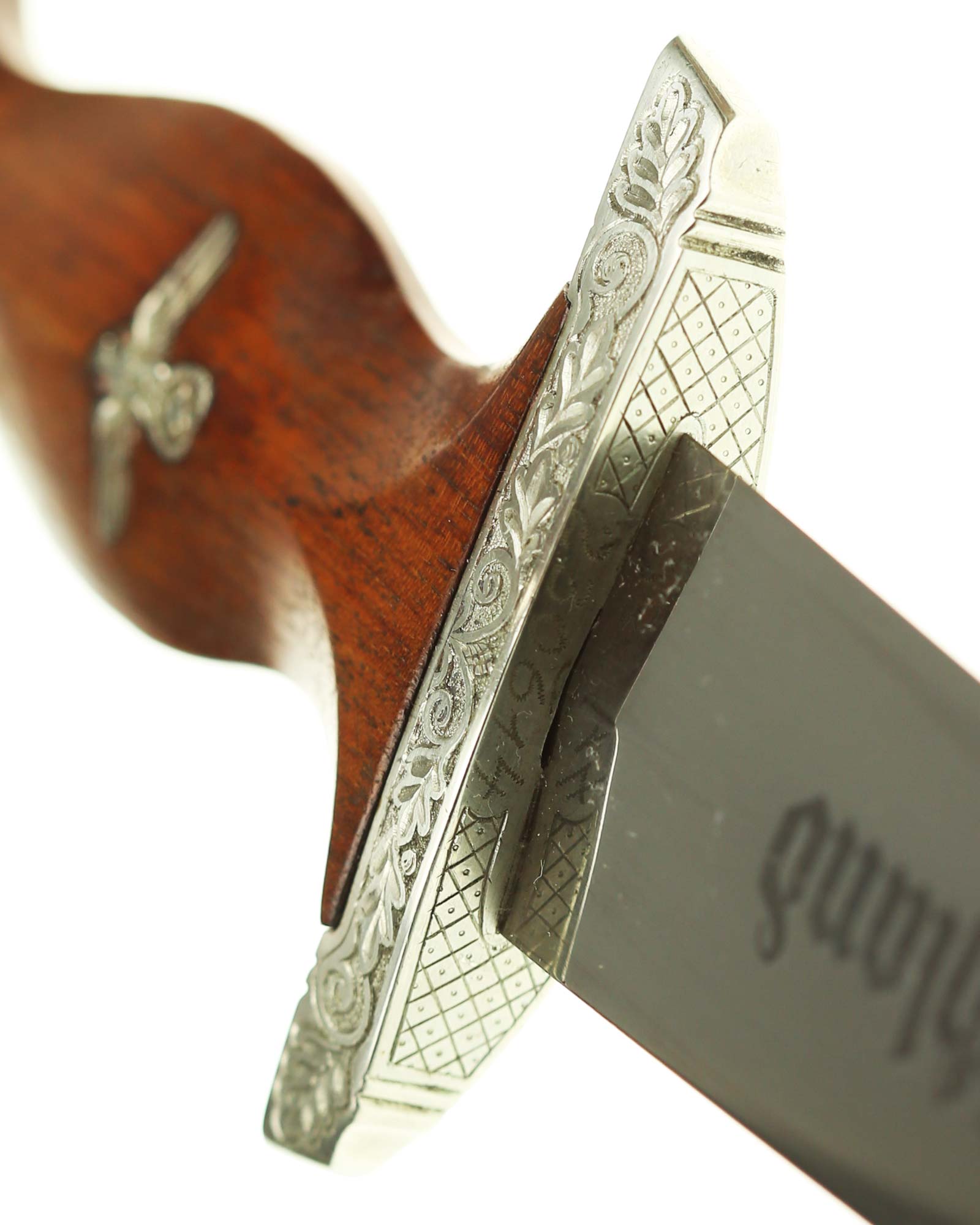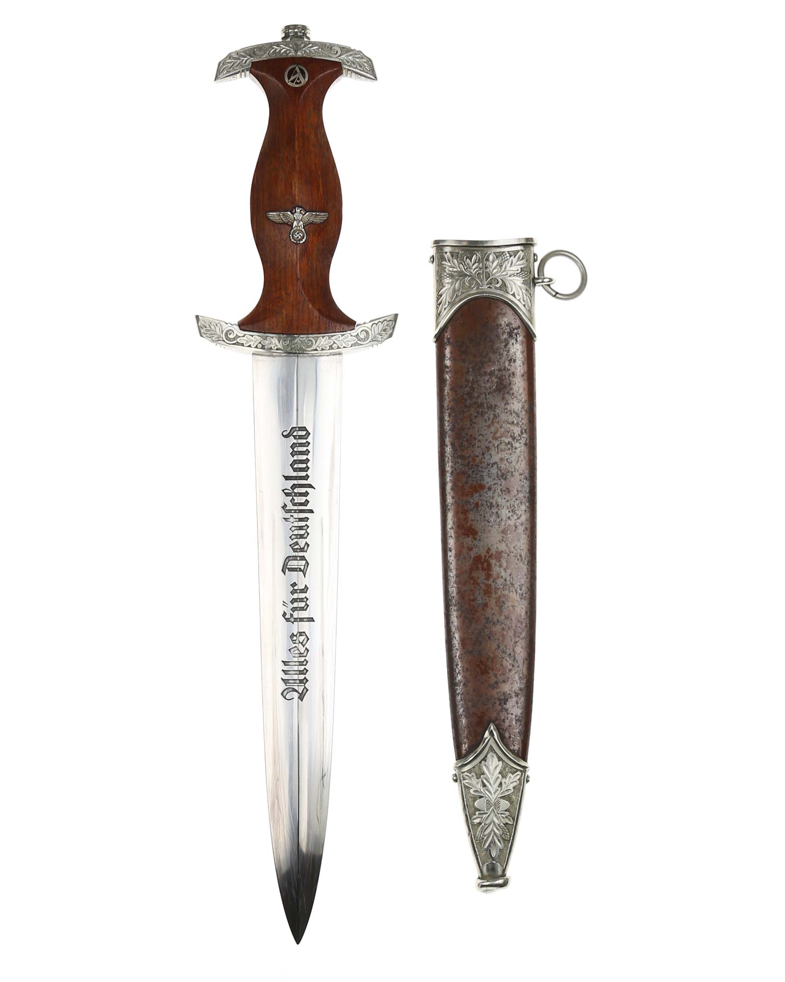 Клинок: Клинок стальной, прямой, двулезвийный, 4-гранный в сечении, без долов. На клинке готическим шрифтом нанесена надпись «Alles für Deutchland» ( «Всё для Германии»). На другой стороне нанесена надпись «In treuer Kameradschaft Sturm | 4/I/1» (В верном товариществе Штурм). Надписи и клейма: возле пяты клинка с тыльной стороны – «Willhelm Kober & Co Suhl» — клеймо немецкой фирмы «Вильгельм Кобер Зуль».